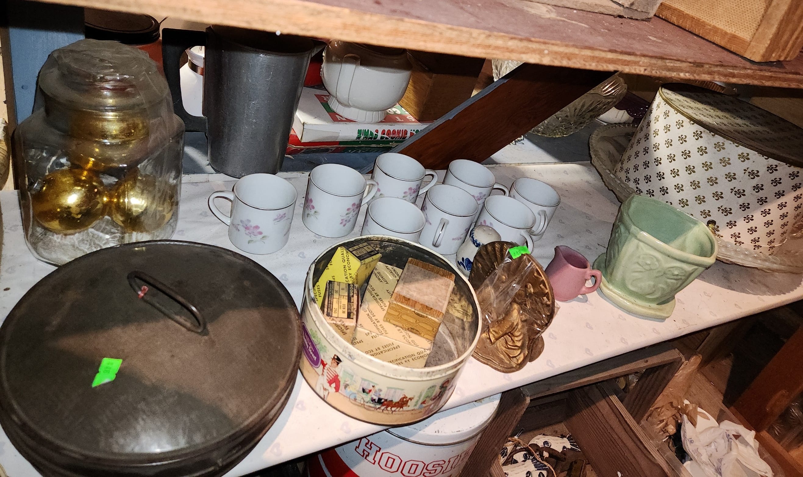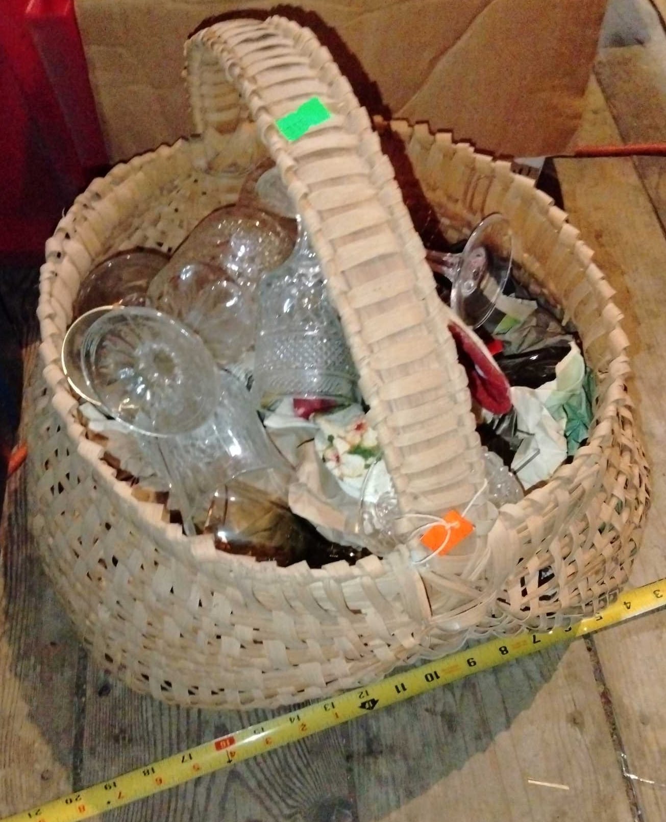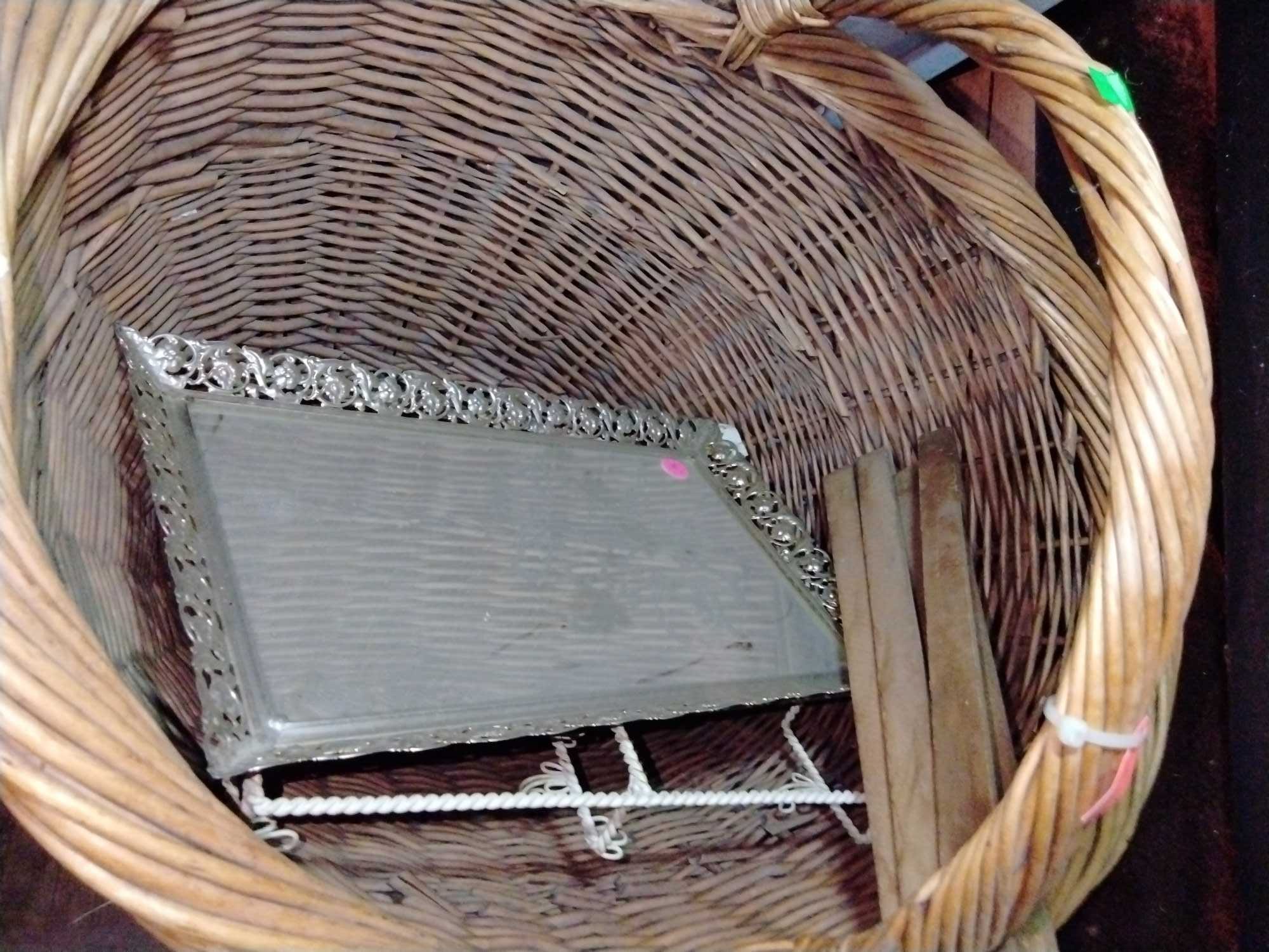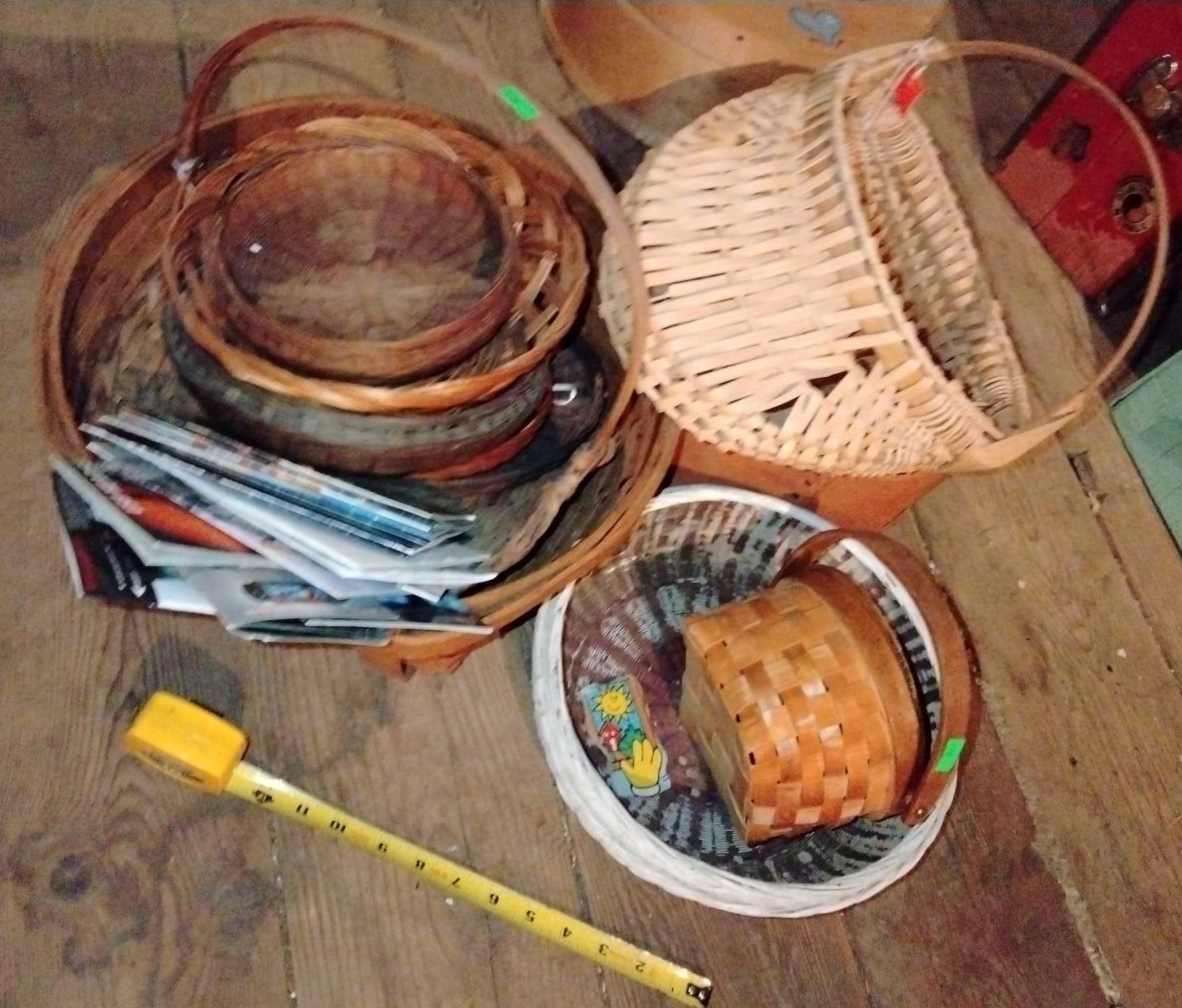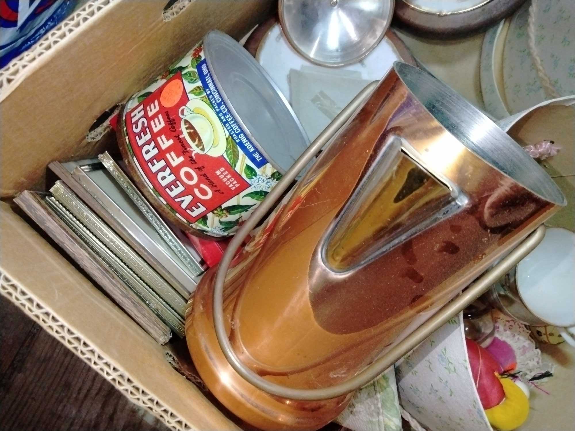 459 Basket, copper teapot - no lid, mugs, miscellaneous