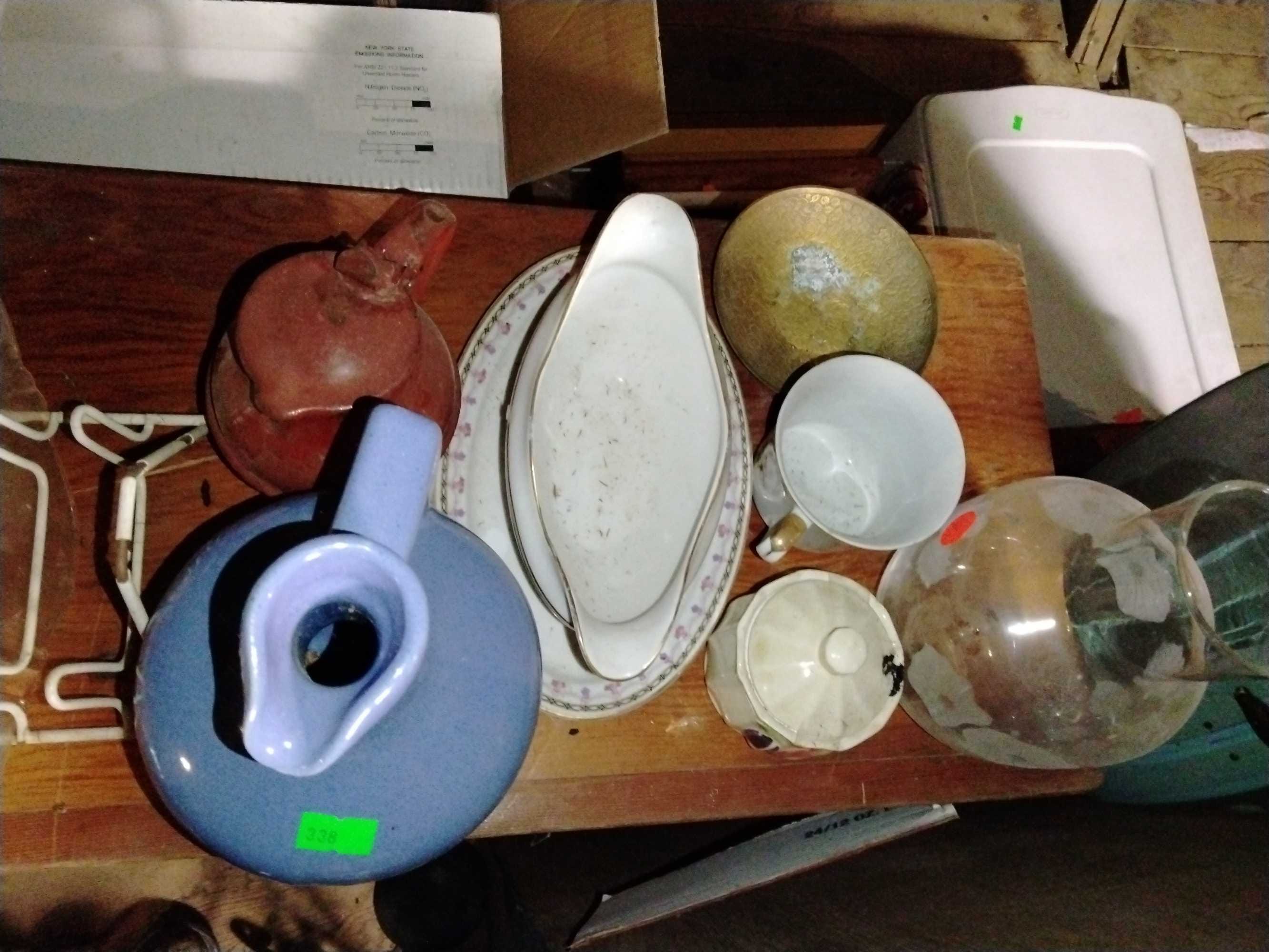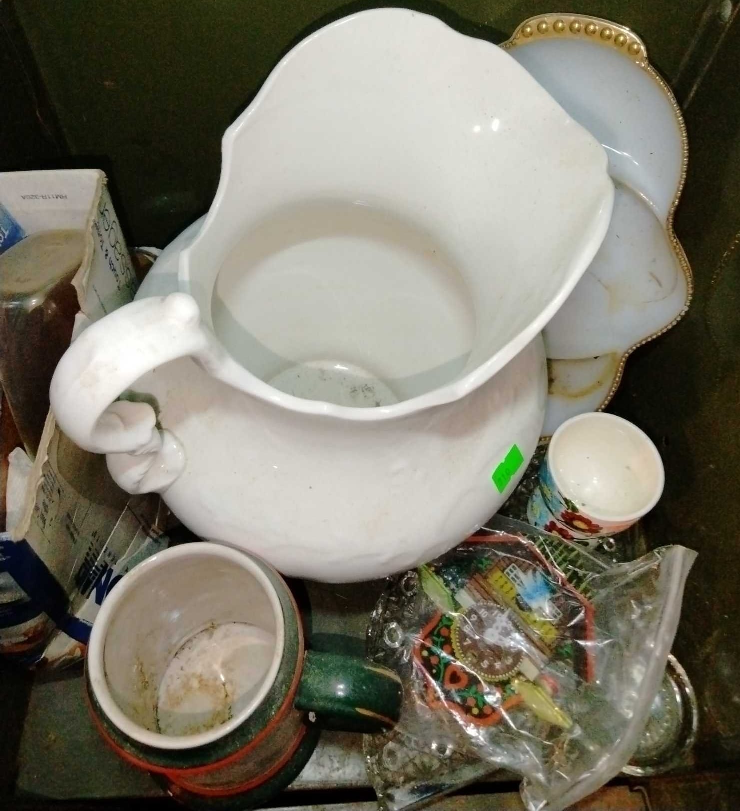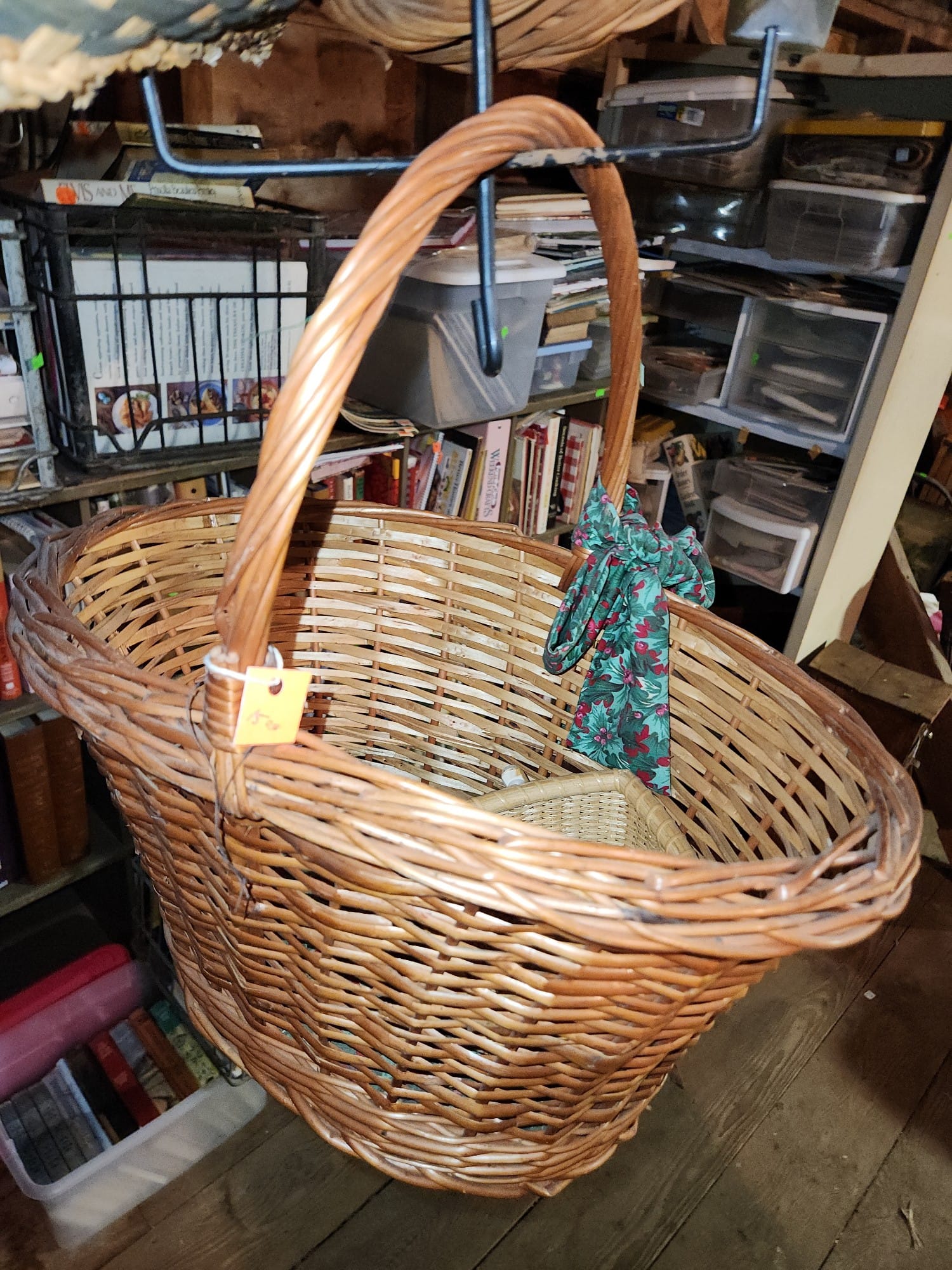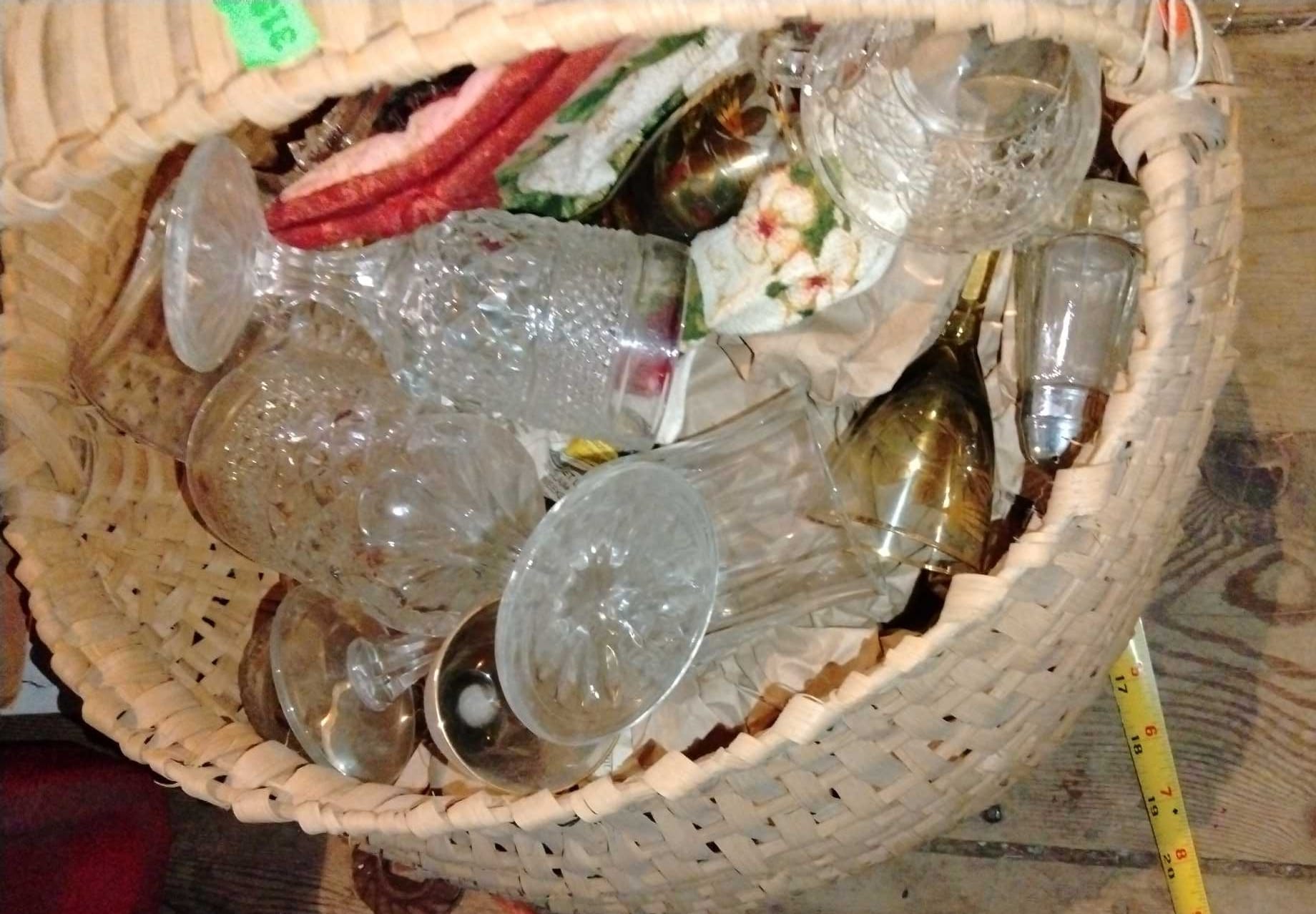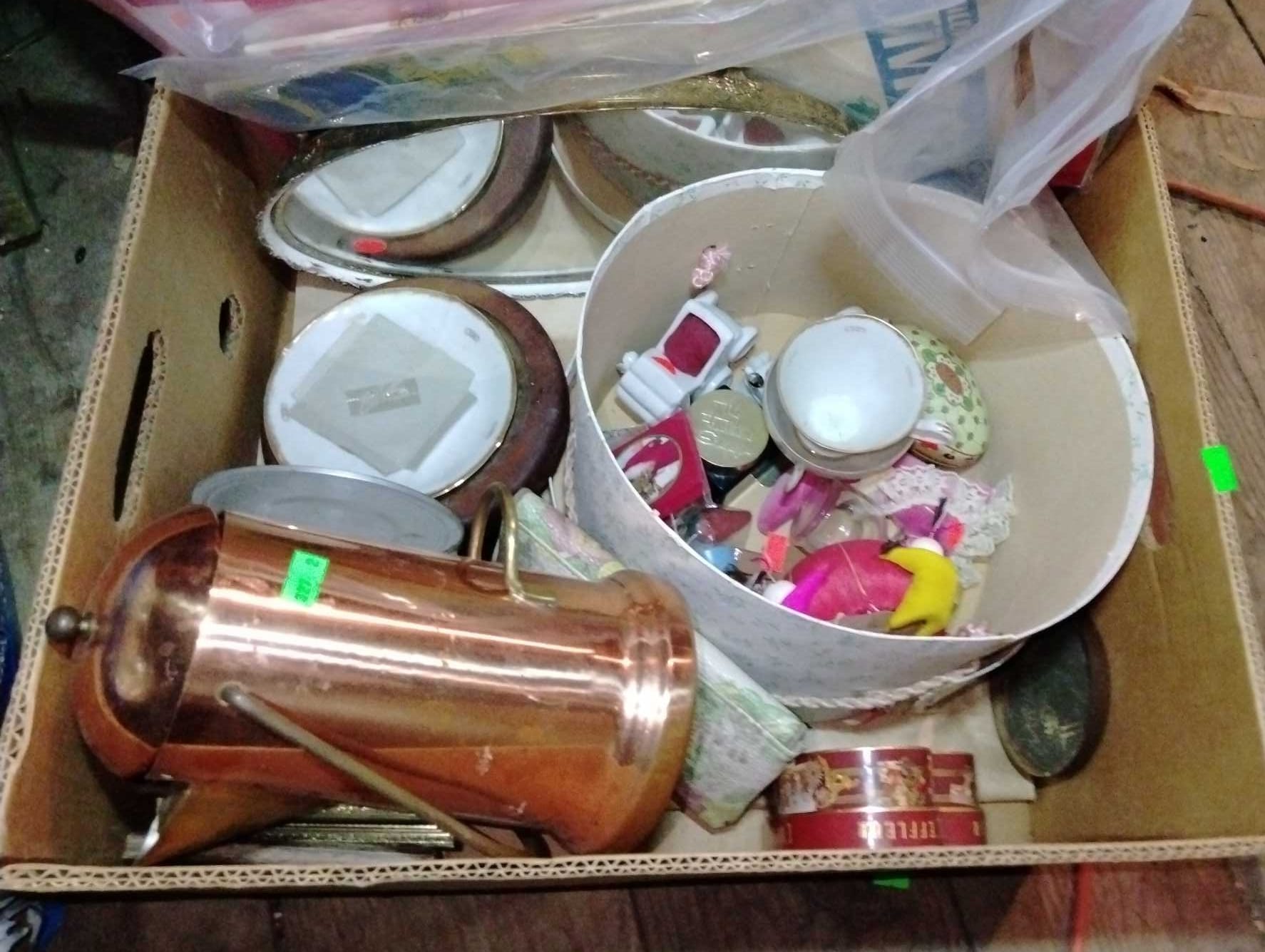 459 Basket, copper teapot - no lid, mugs, miscellaneous