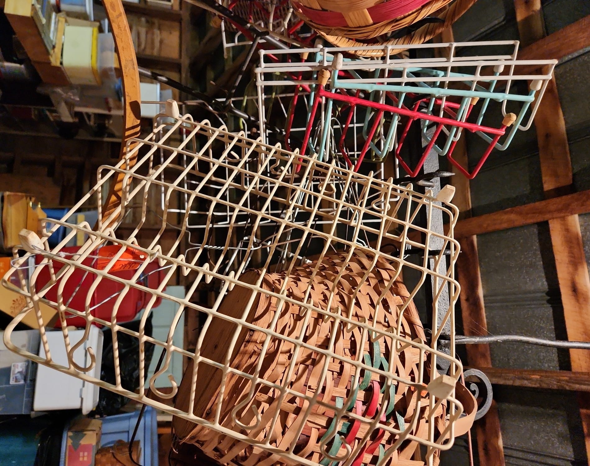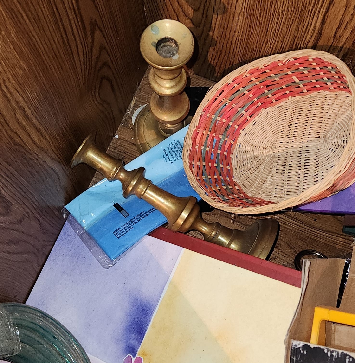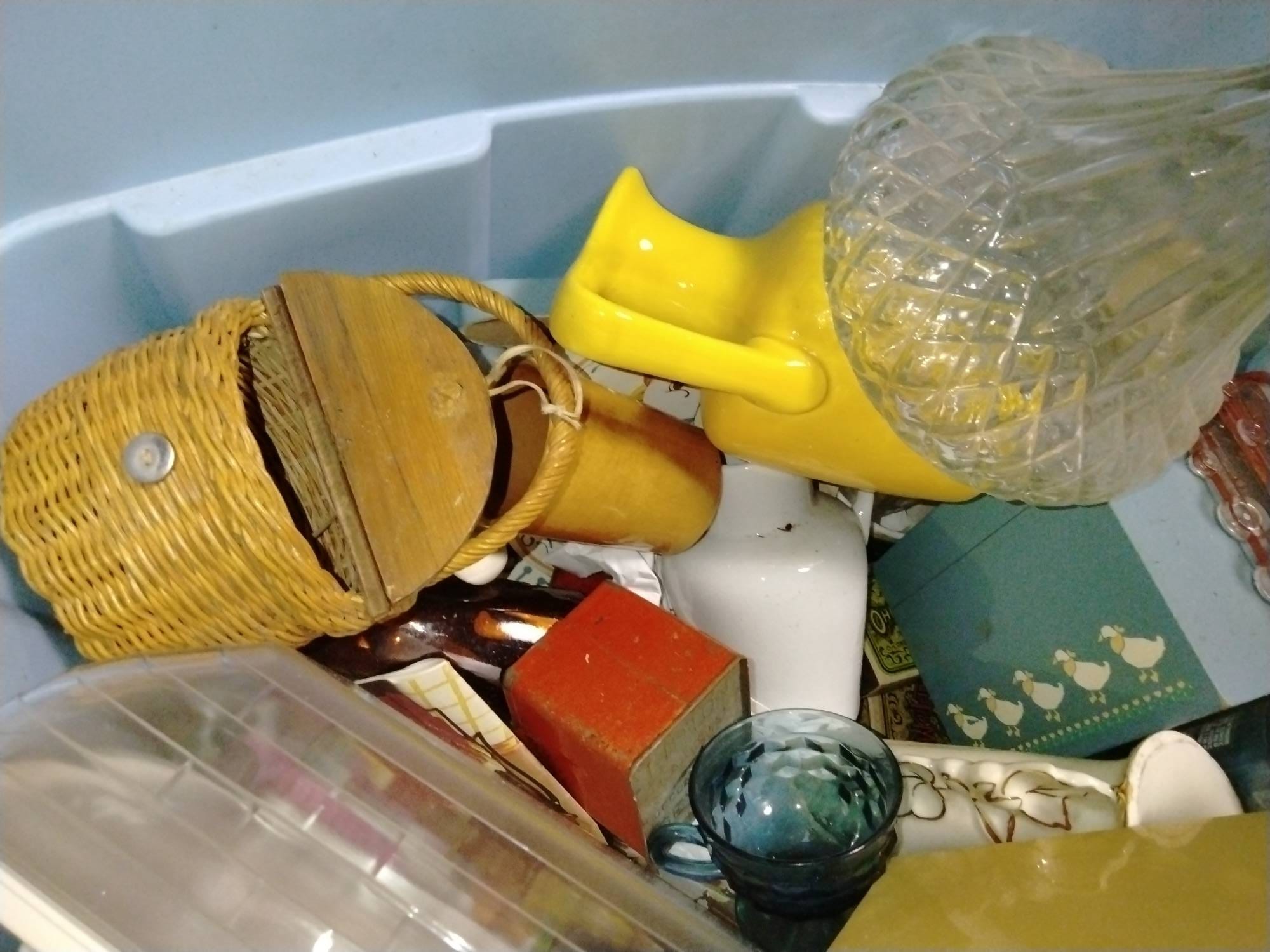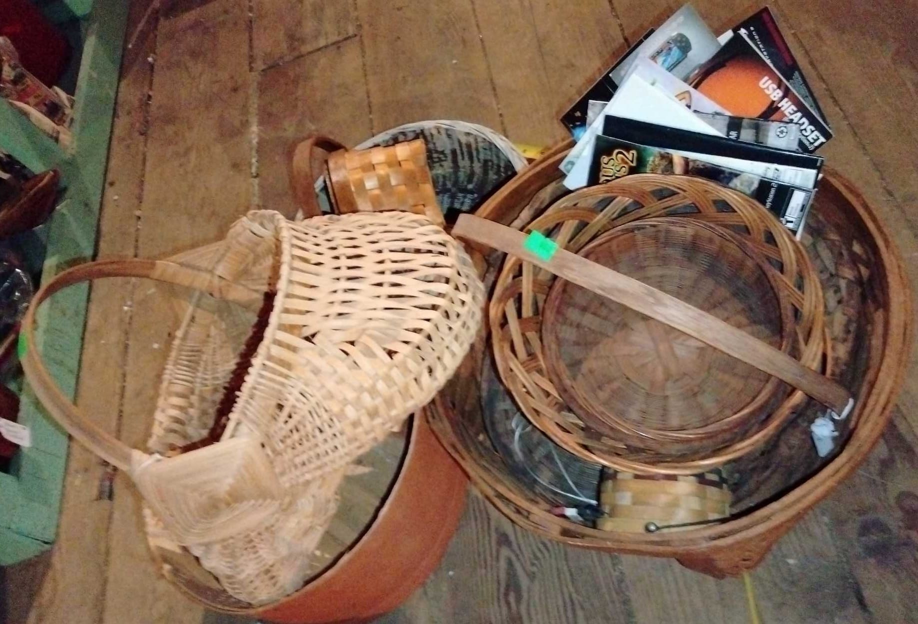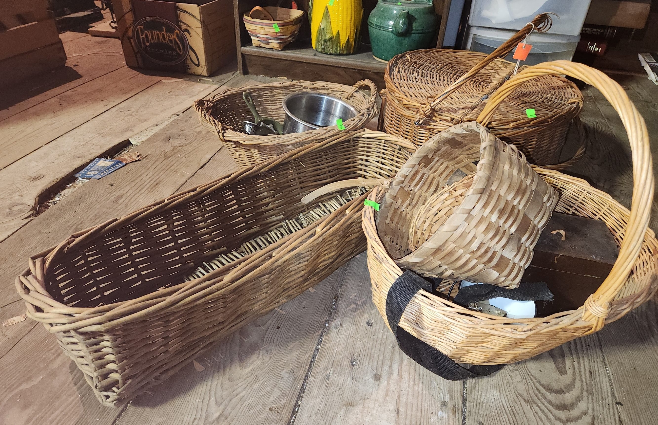 459 Basket, copper teapot - no lid, mugs, miscellaneous