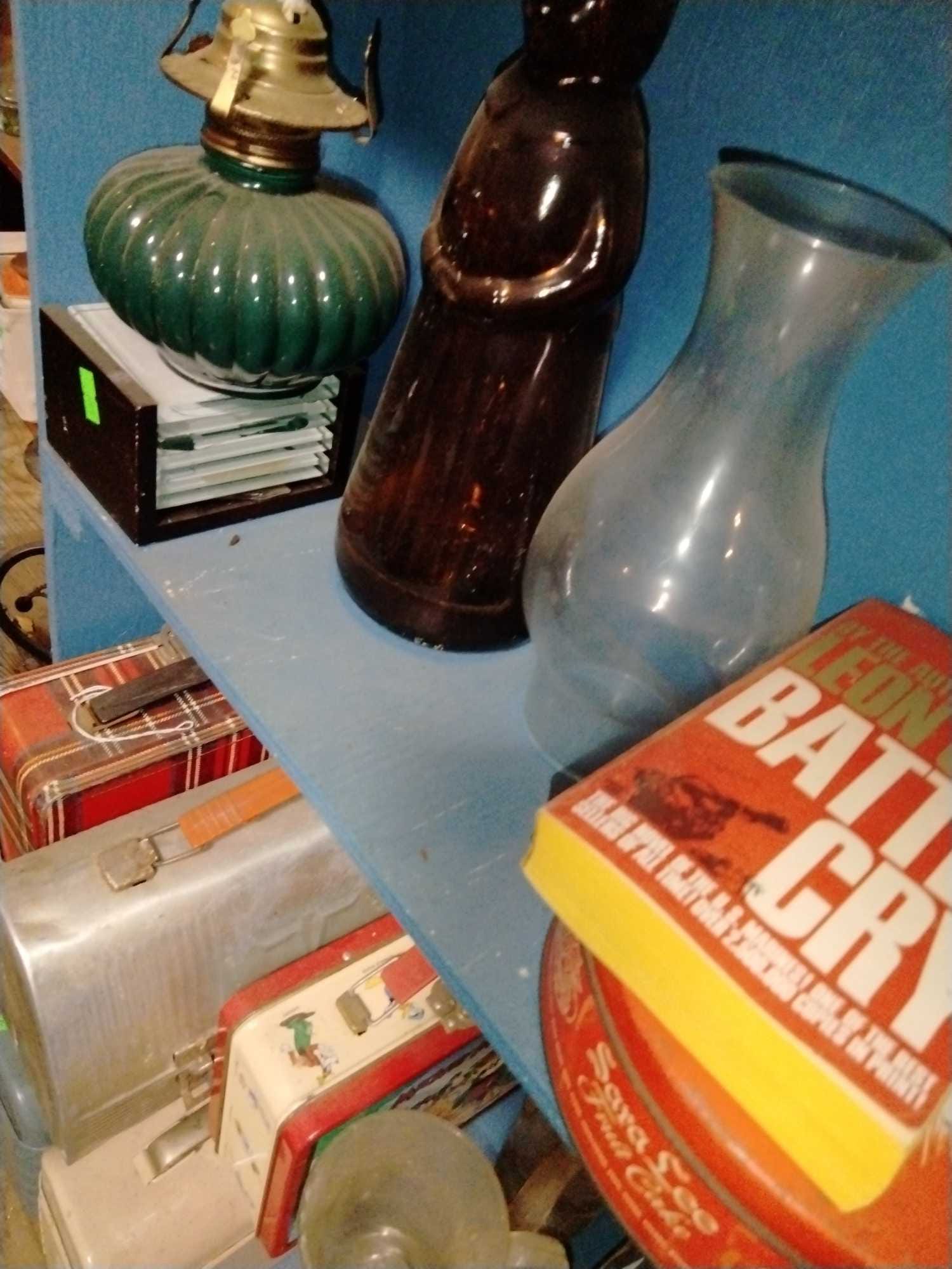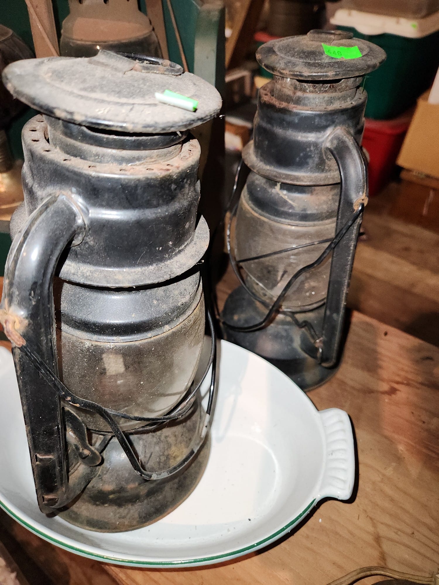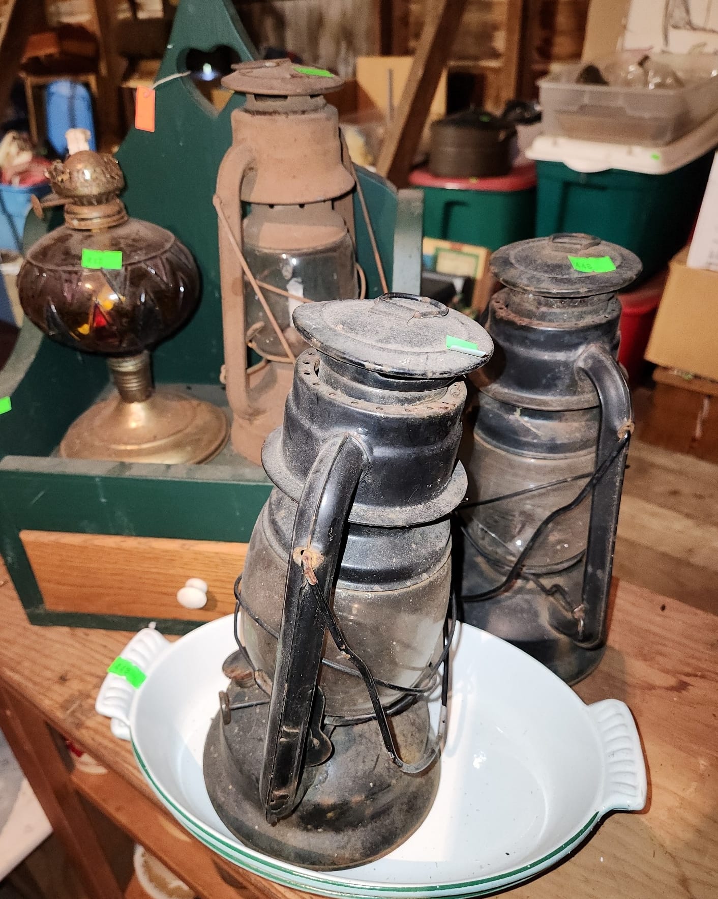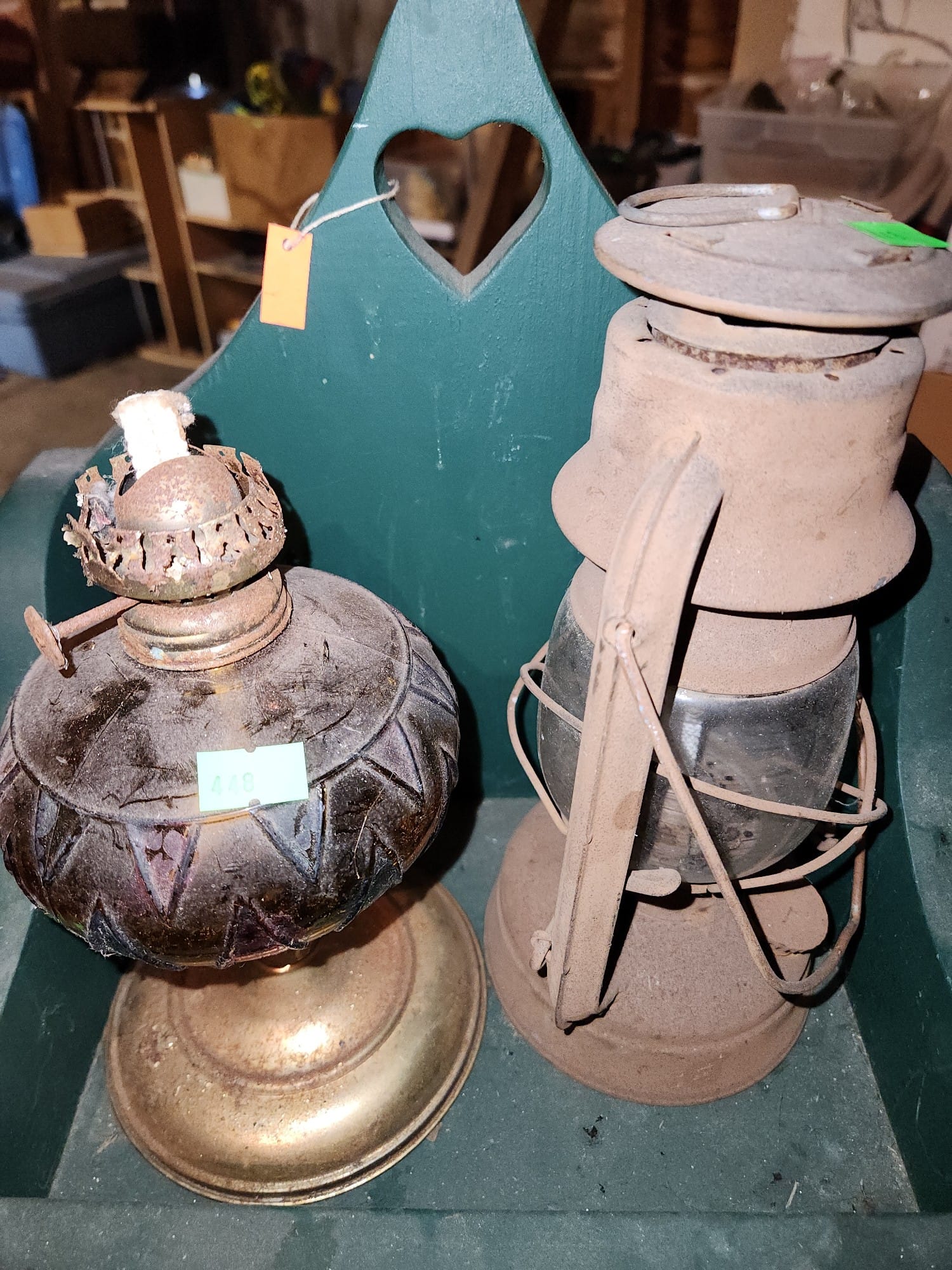 448 Oil lamp base, lanterns - 1 broken globe, shelf