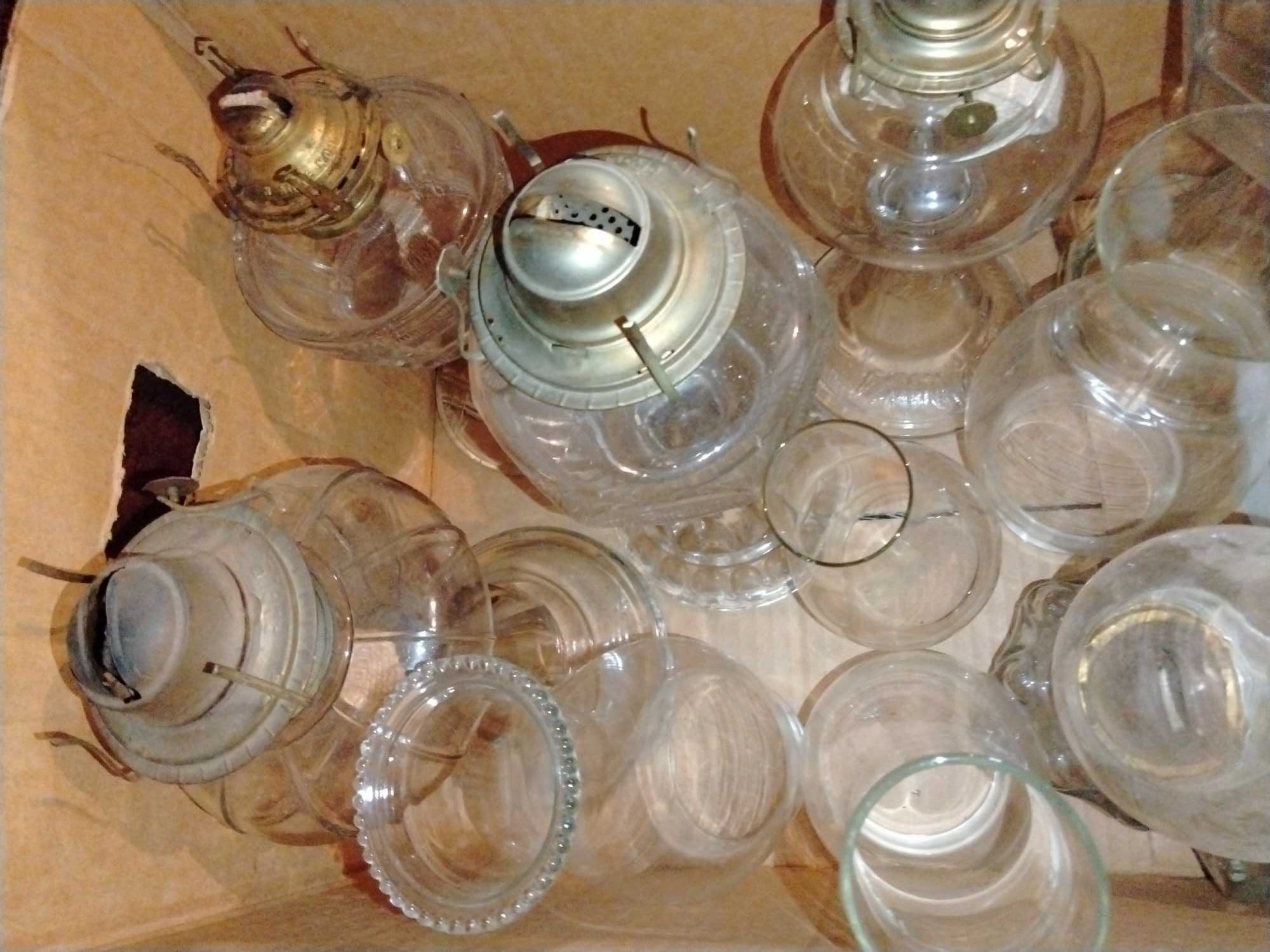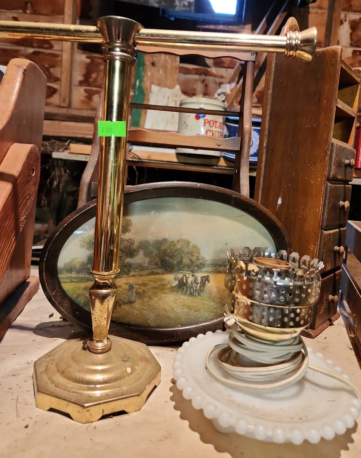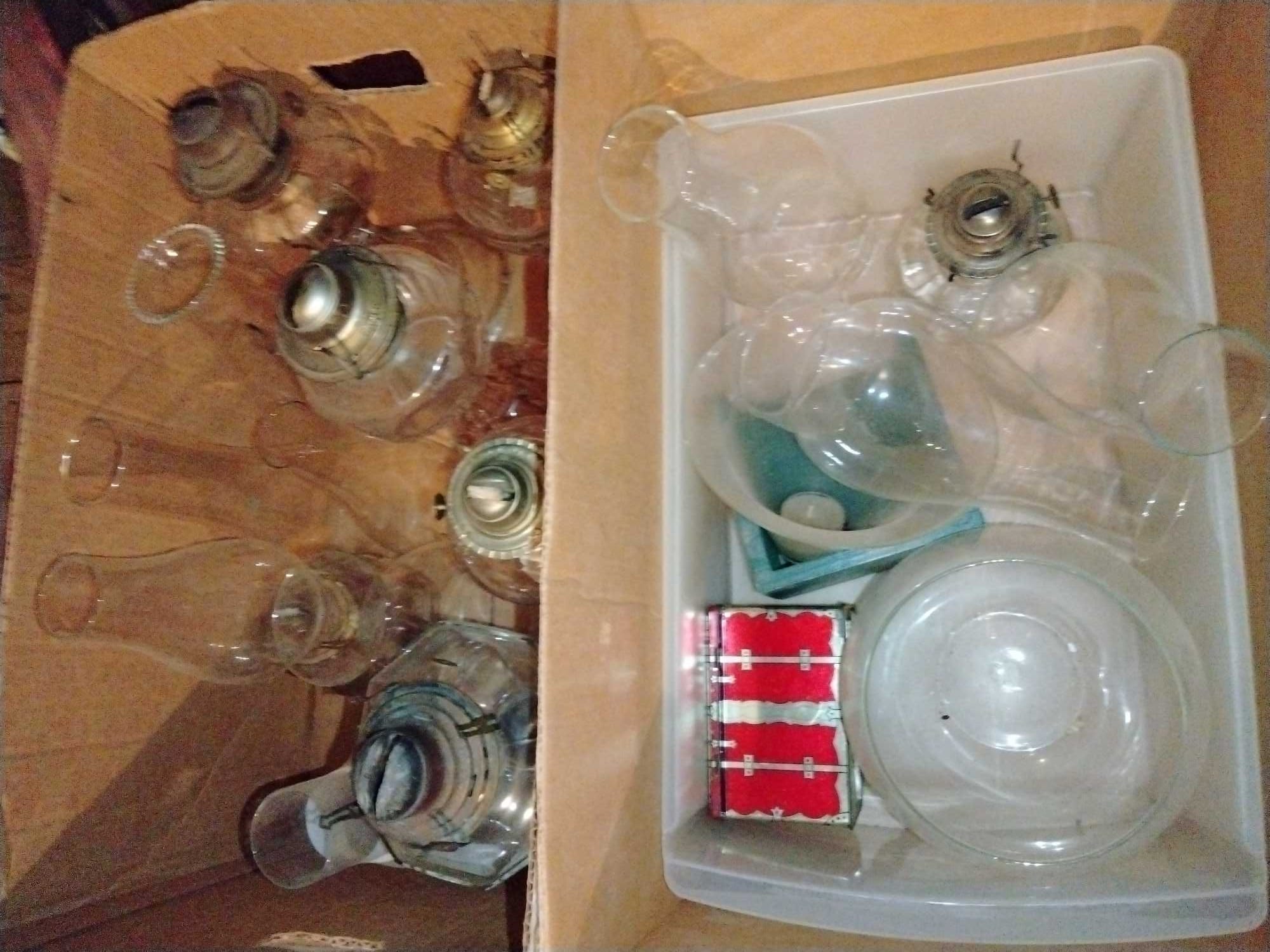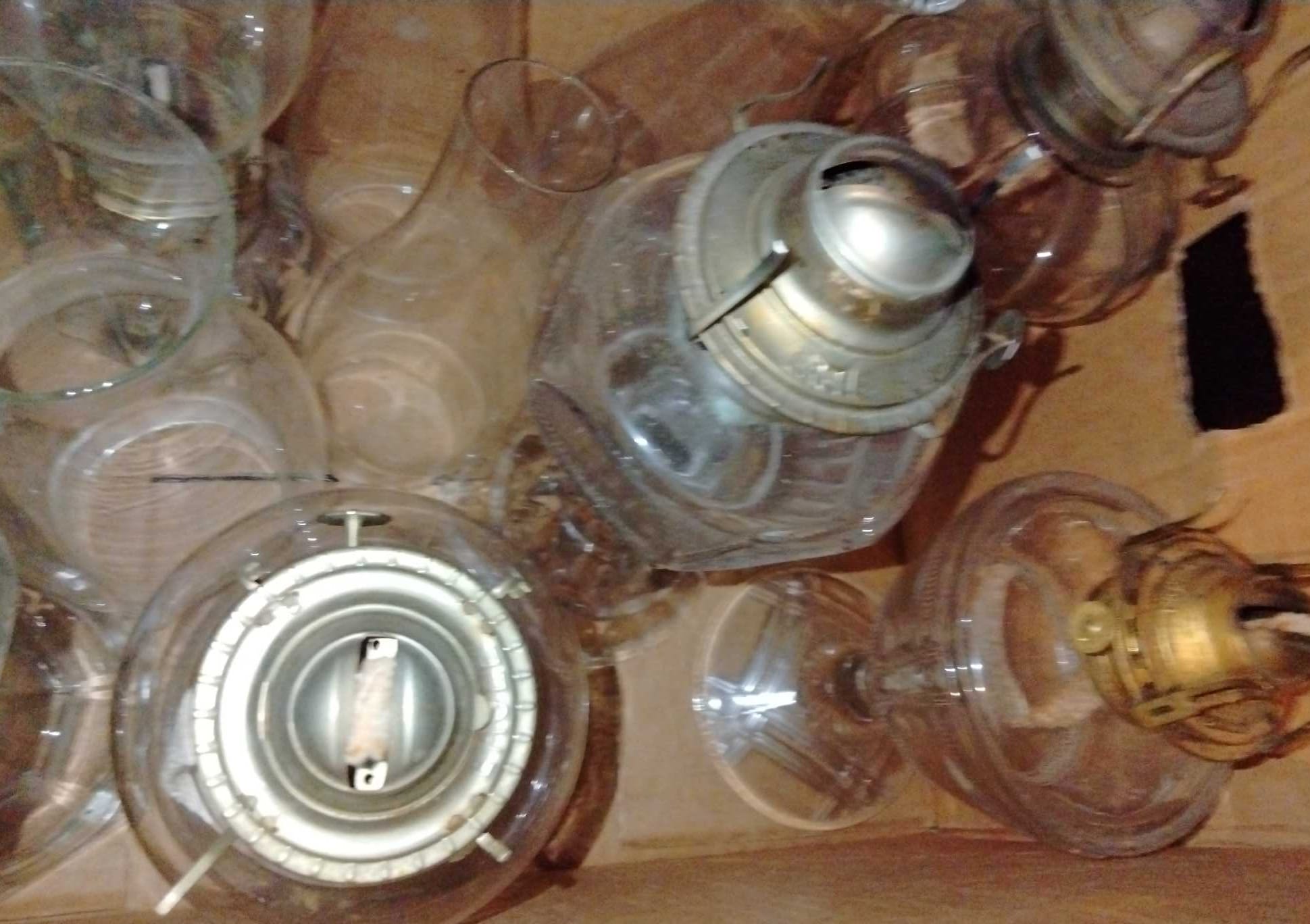 448 Oil lamp base, lanterns - 1 broken globe, shelf