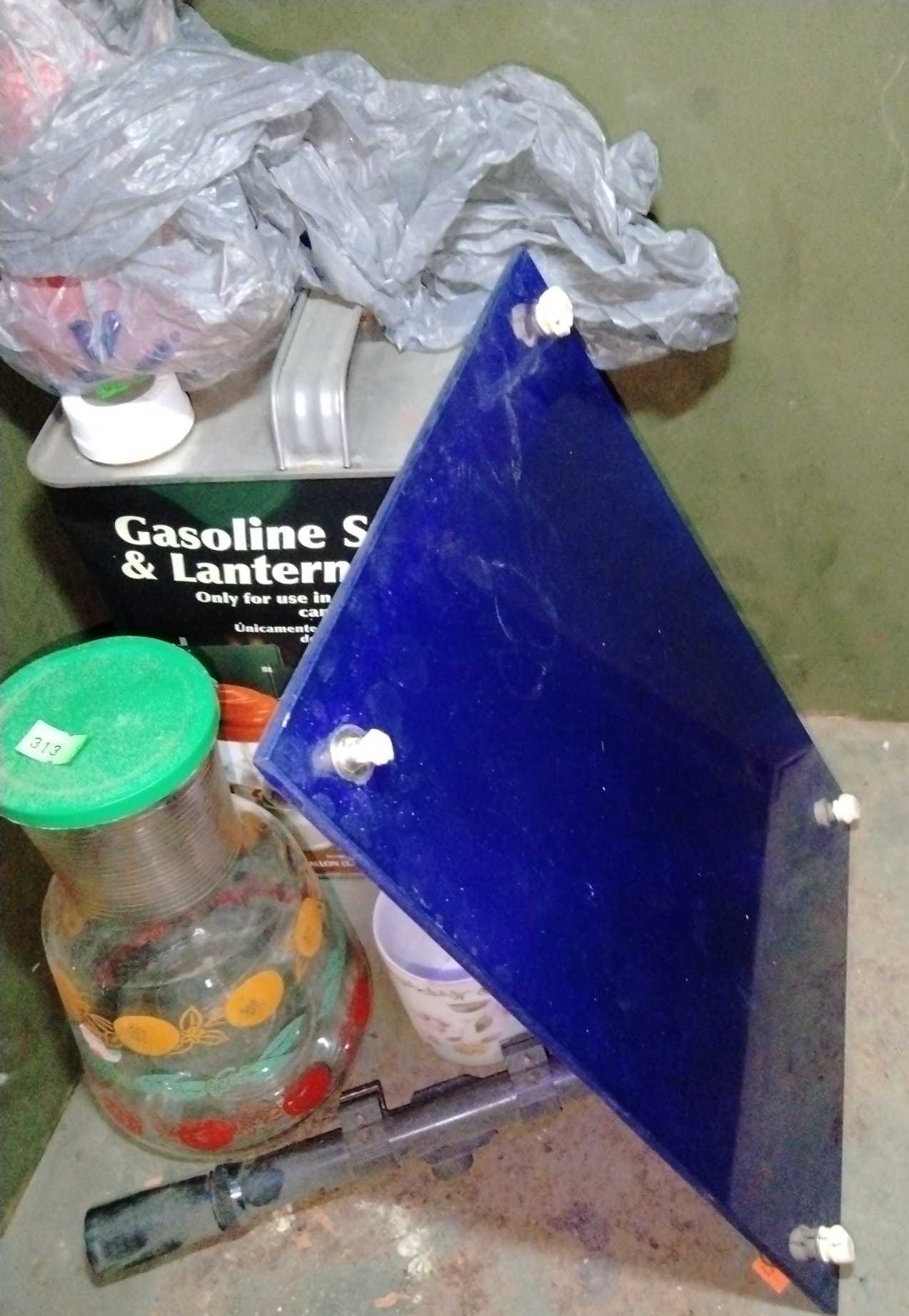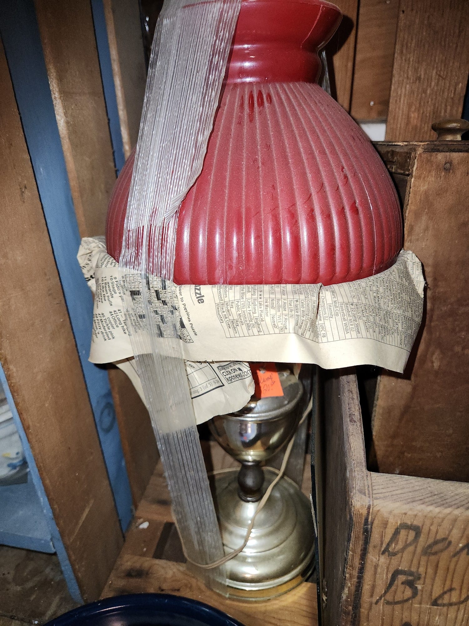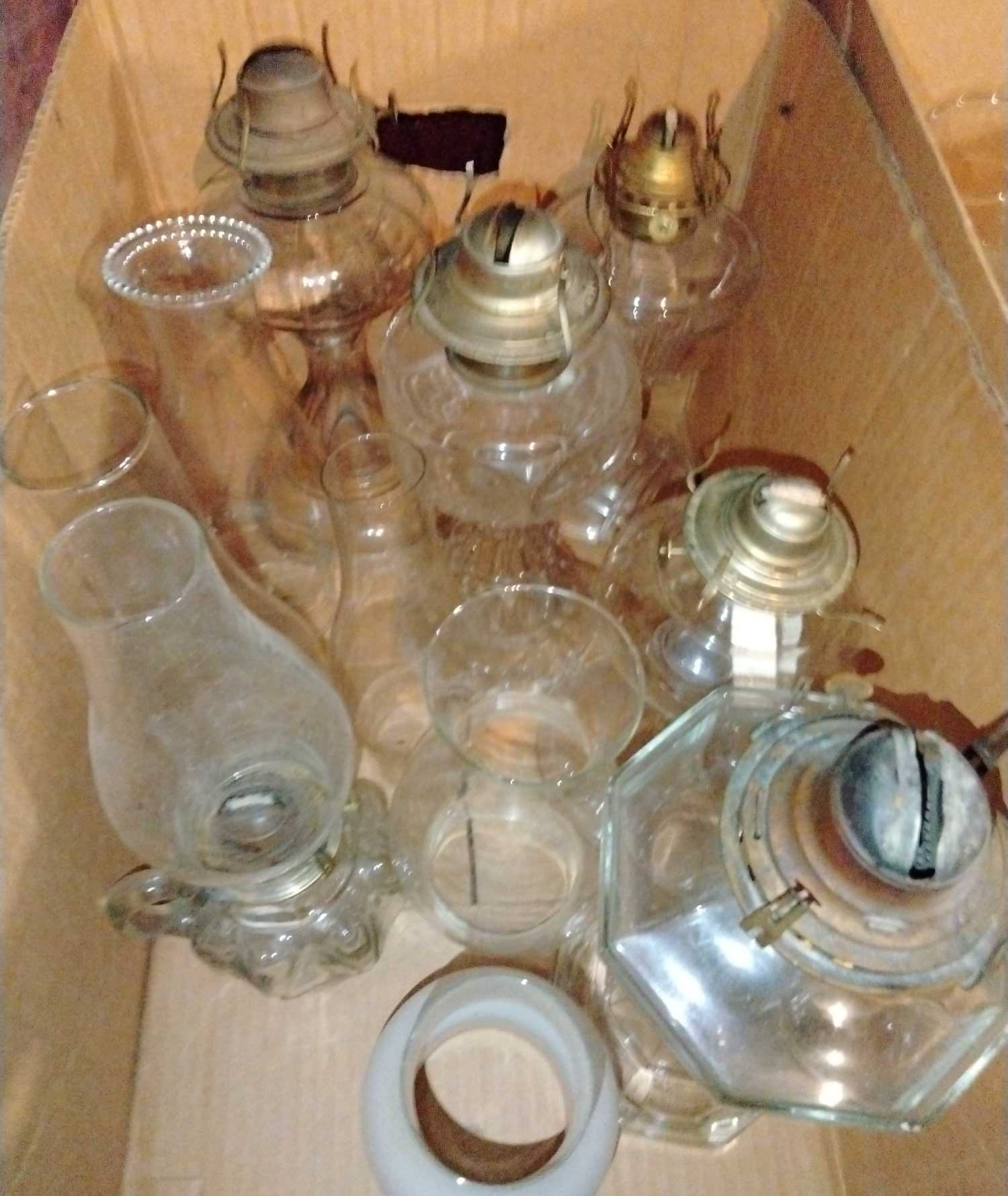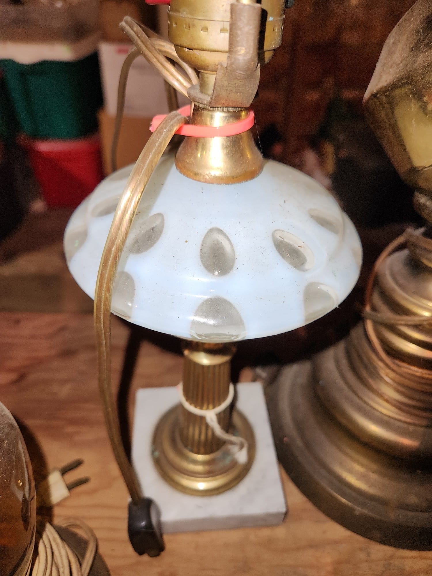 448 Oil lamp base, lanterns - 1 broken globe, shelf