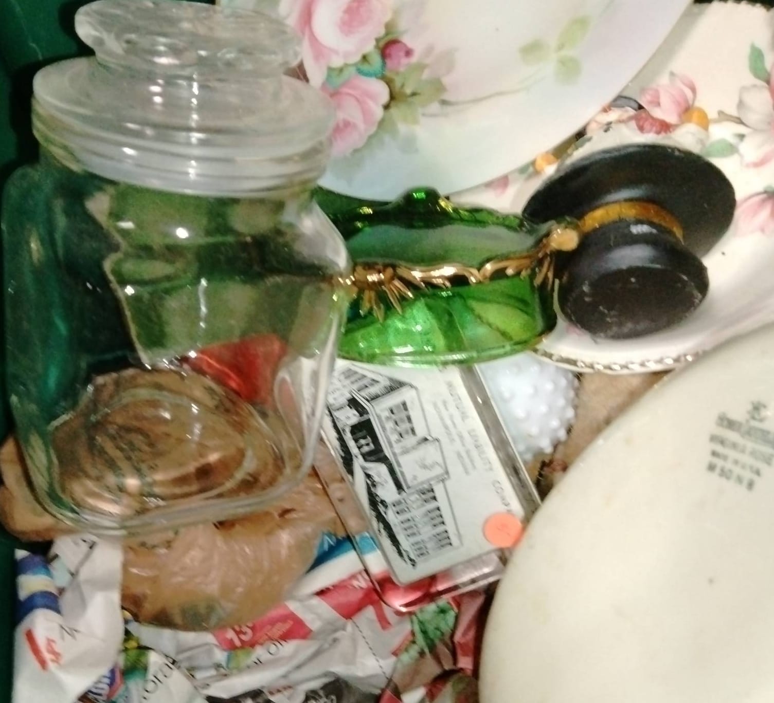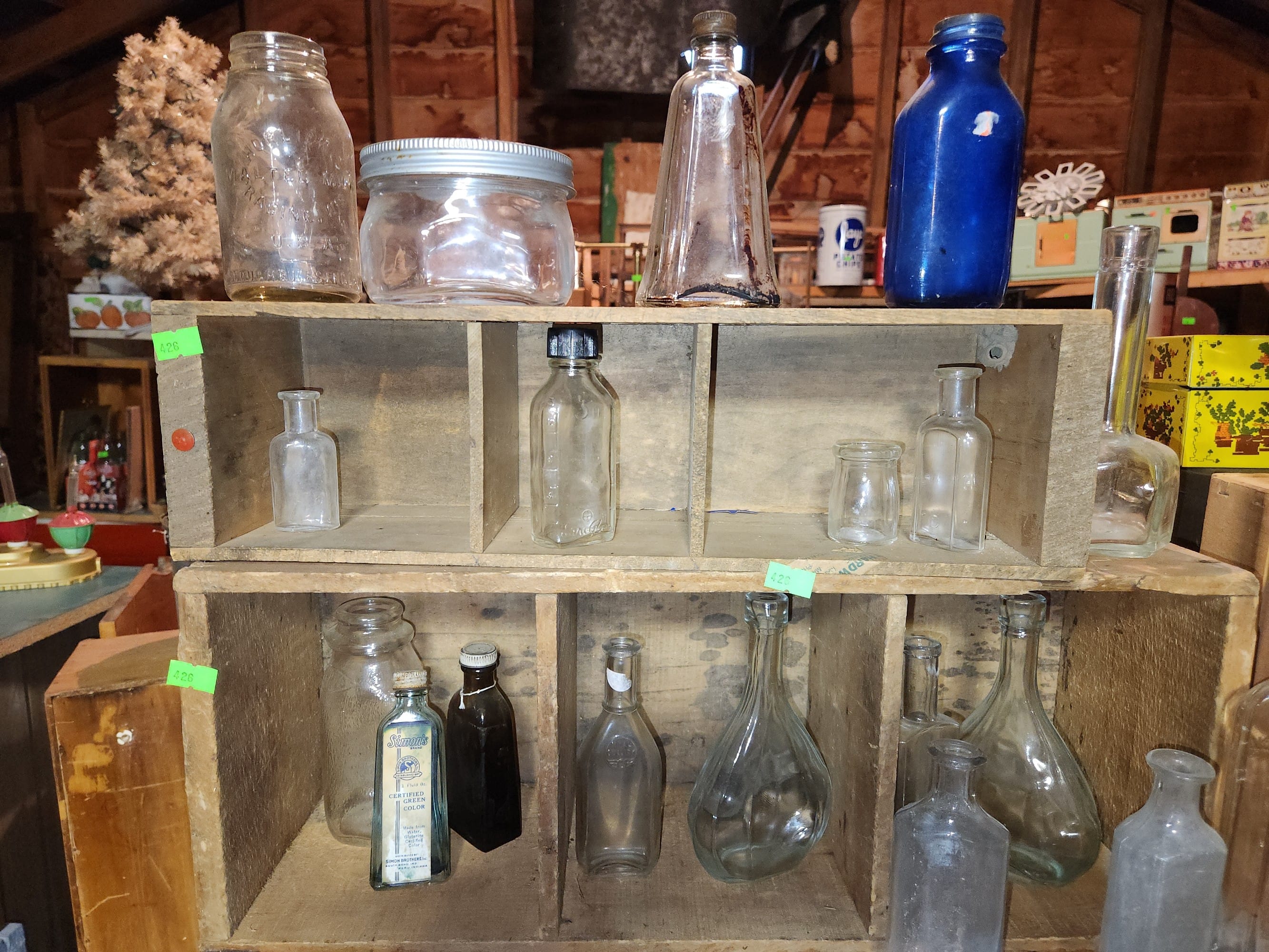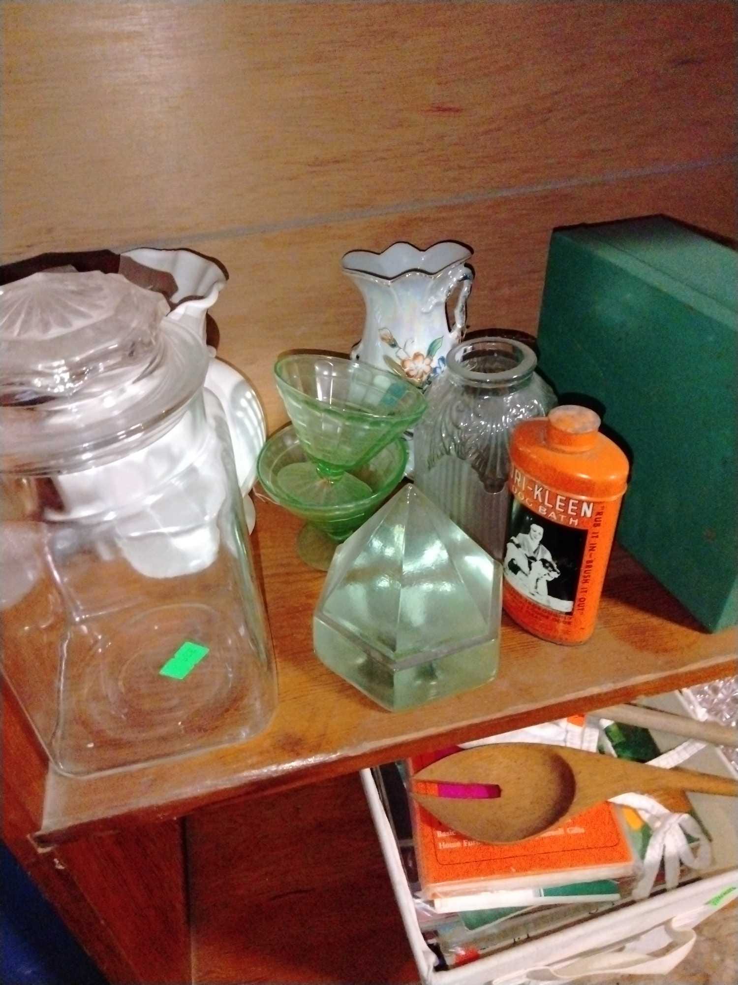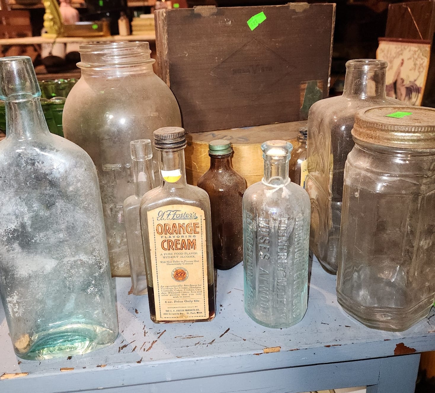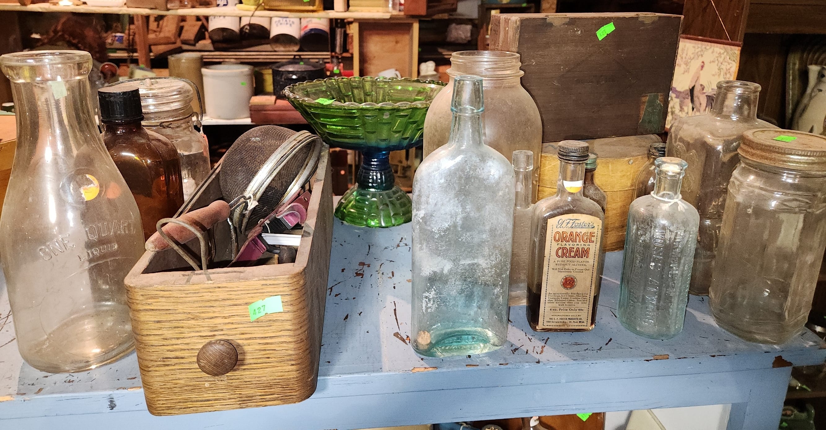 427 Atlas, Atwood, Foster’s, miscellaneous bottles and jars, green pedestal bowl, cheese box, cigar box