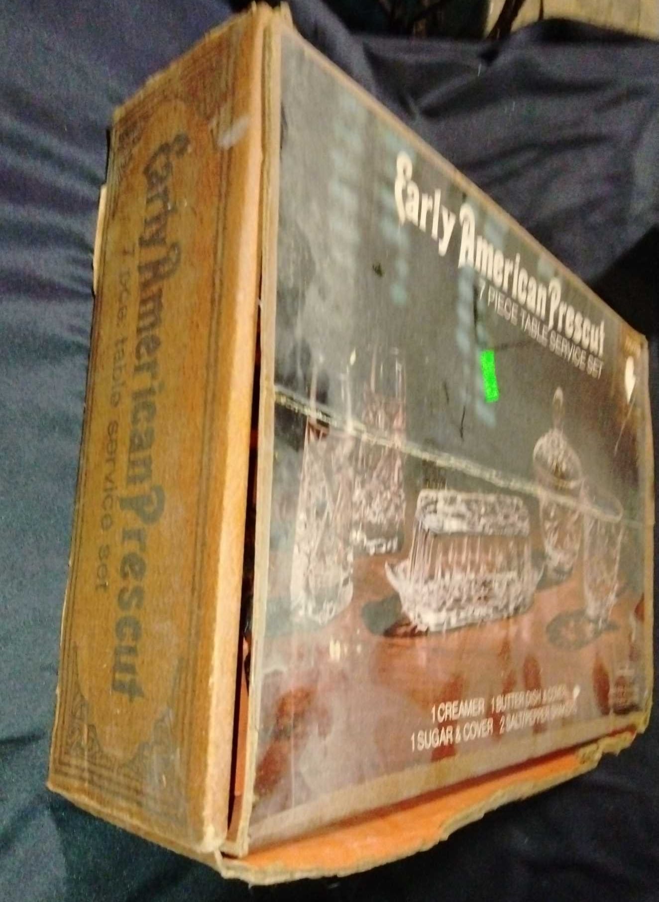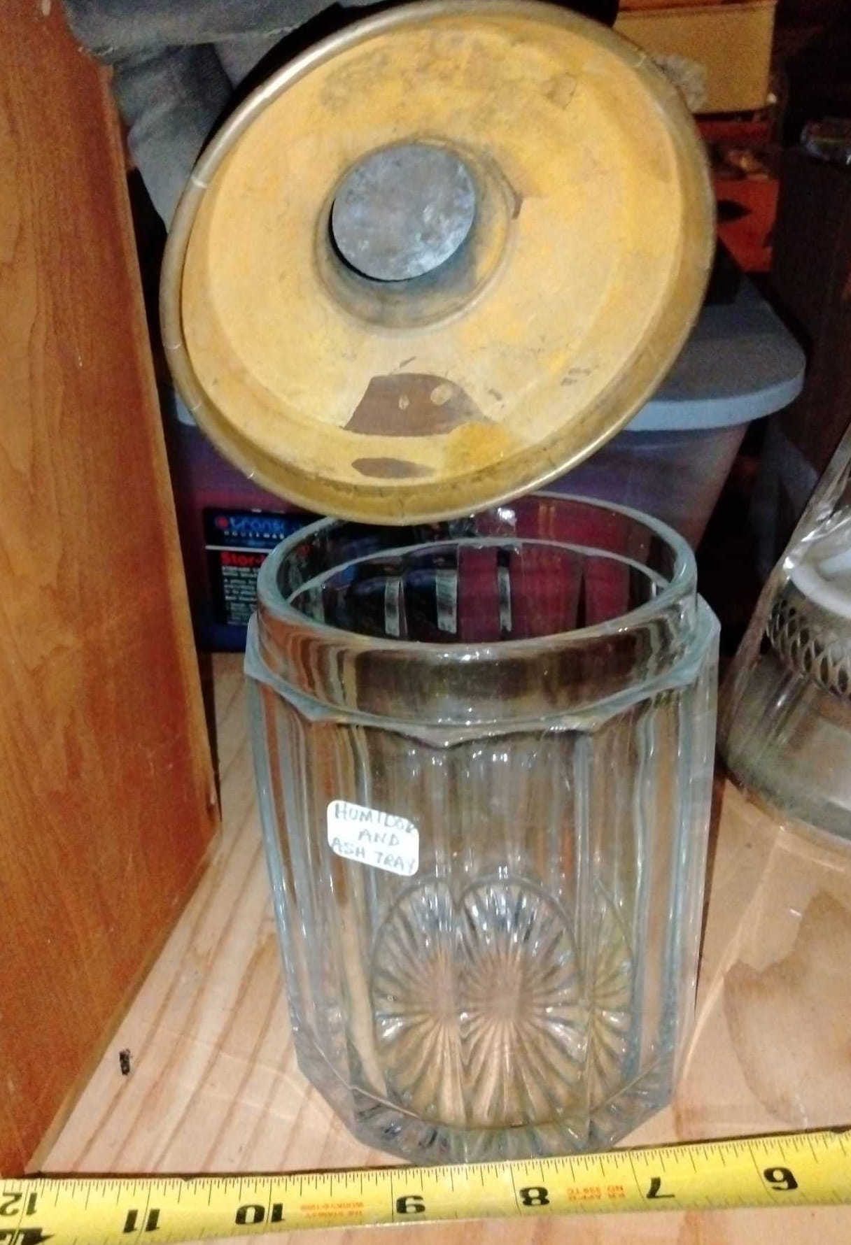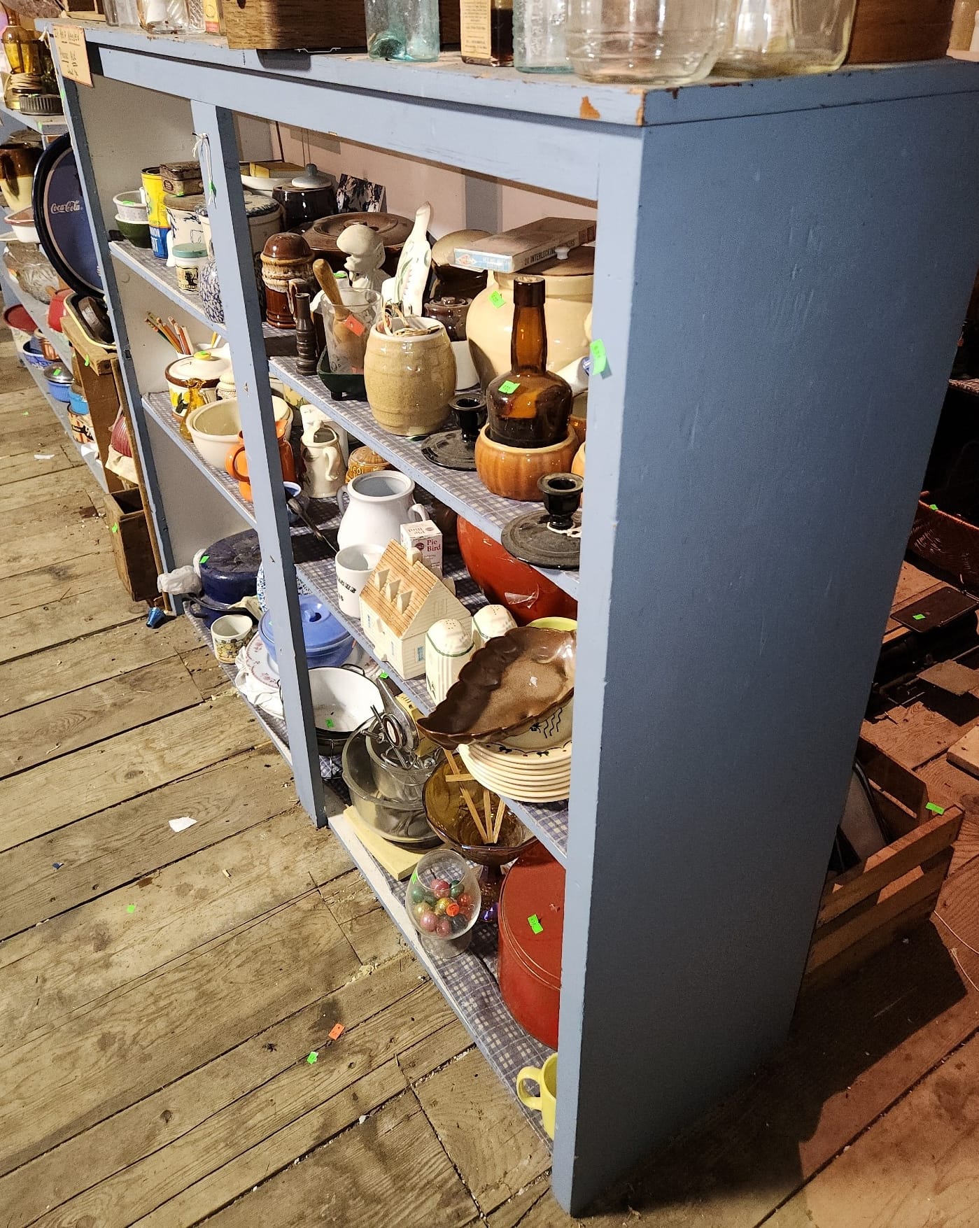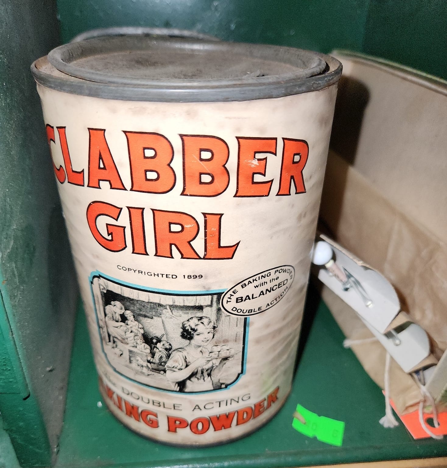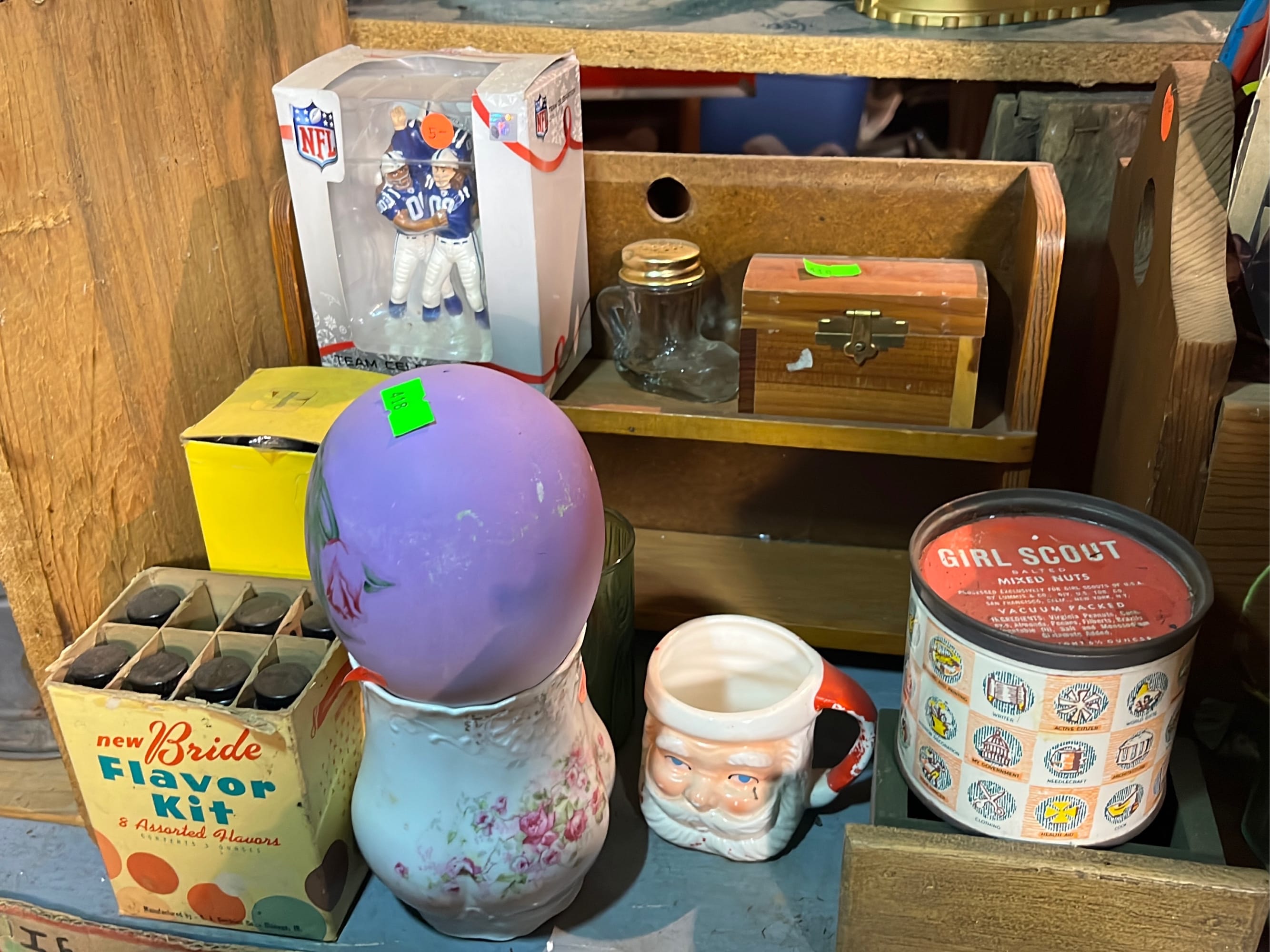 427 Atlas, Atwood, Foster’s, miscellaneous bottles and jars, green pedestal bowl, cheese box, cigar box