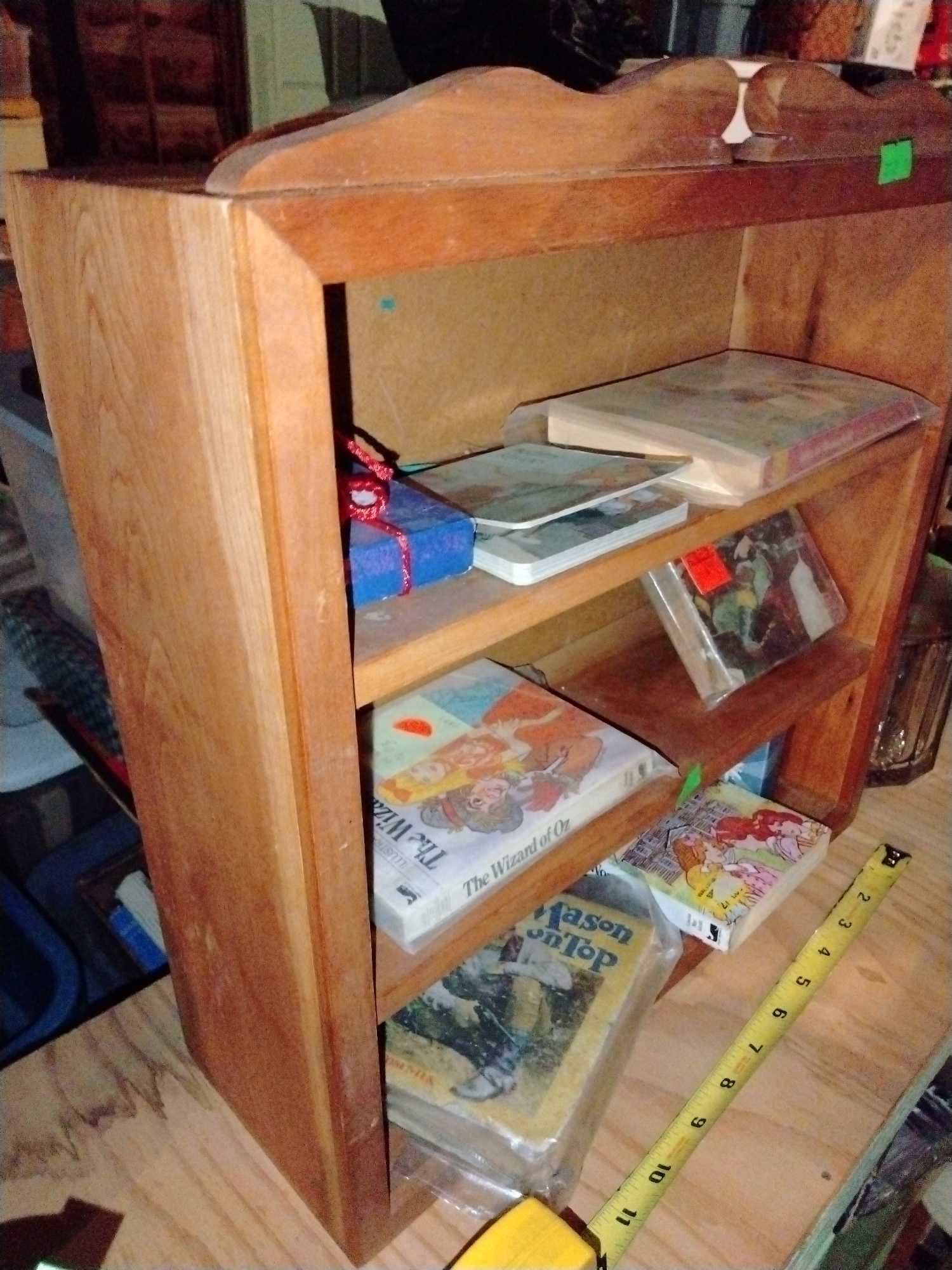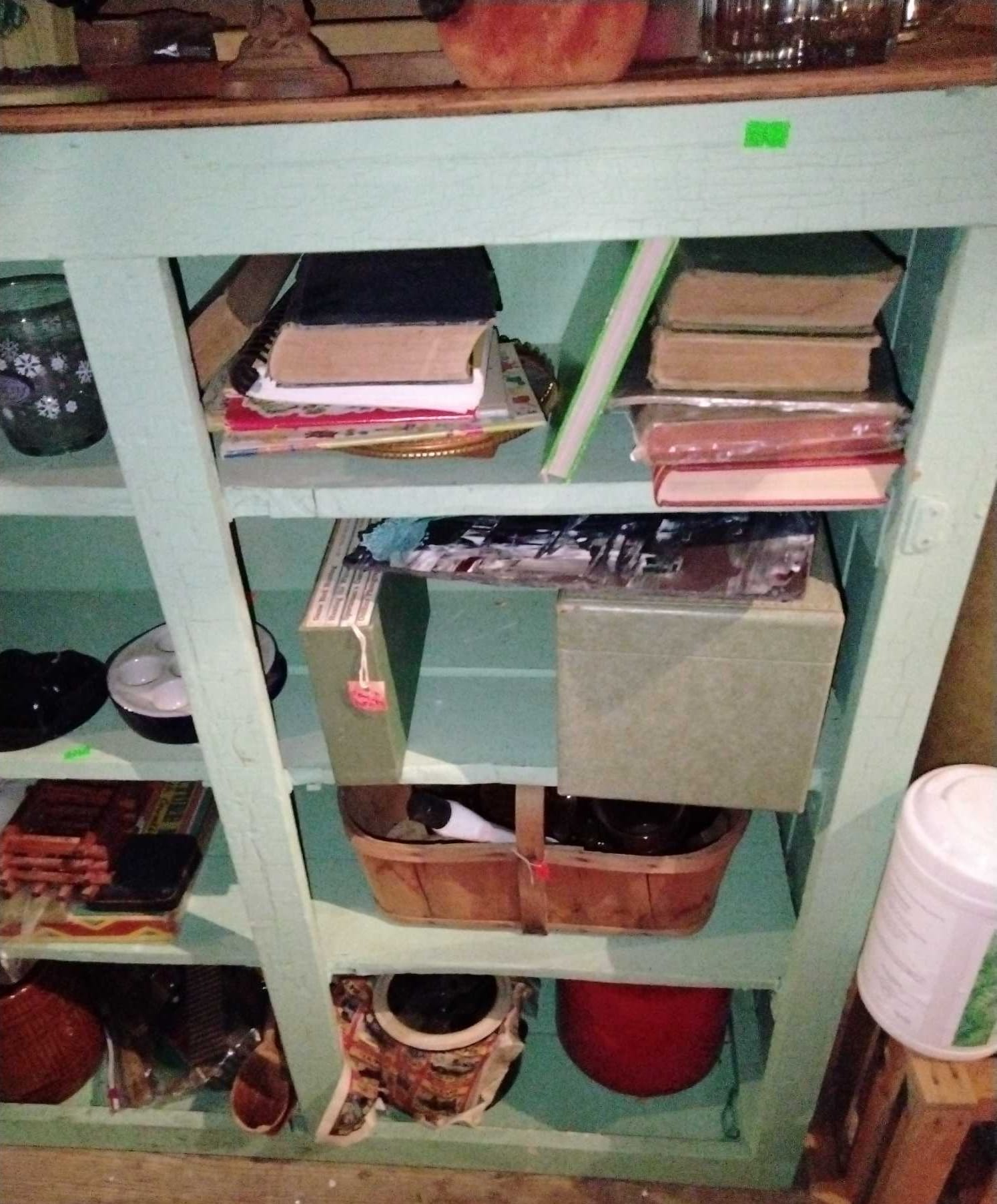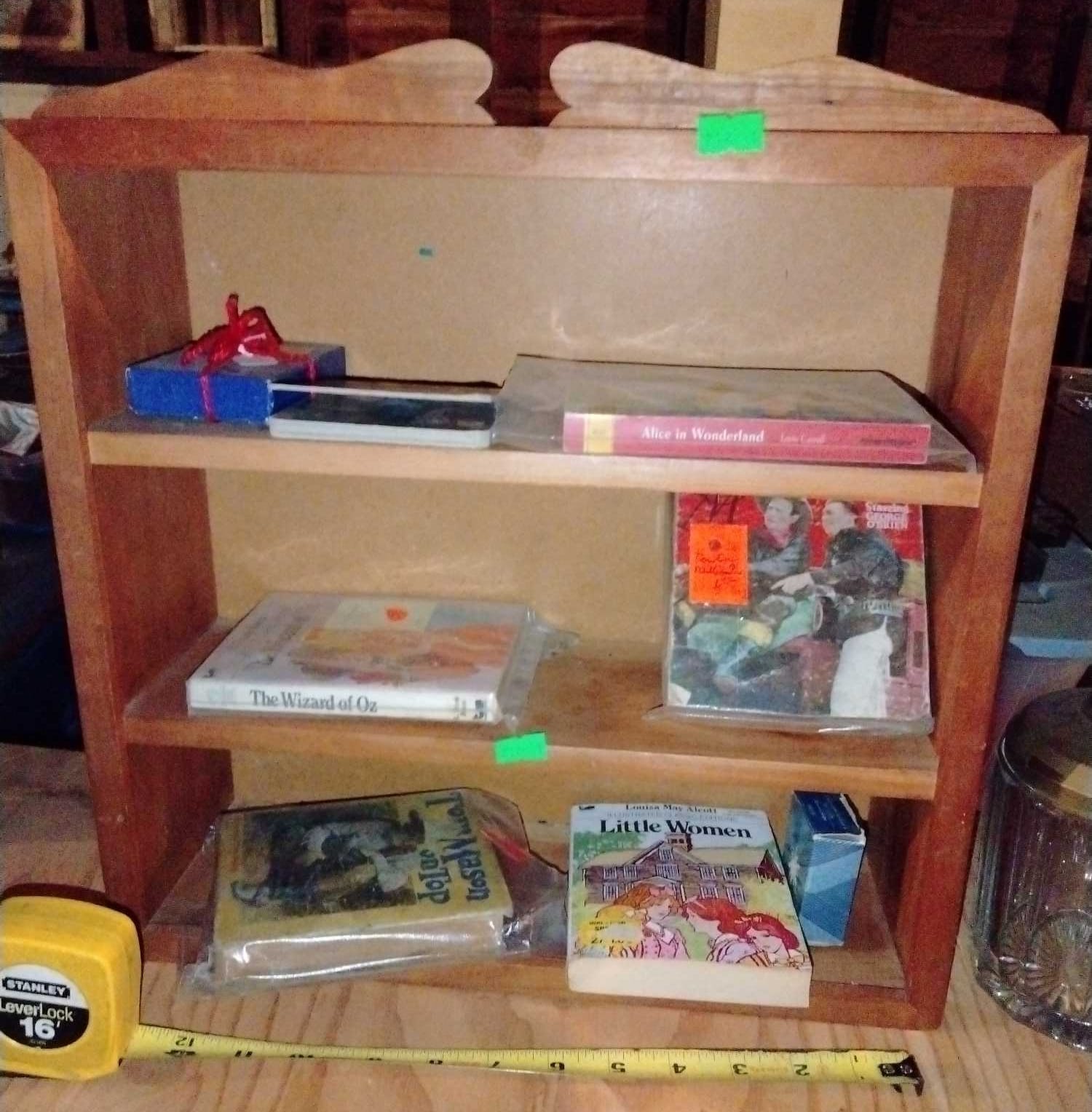 216 Bookcase 41x11x42, books, pitcher, matchbox holders, contents