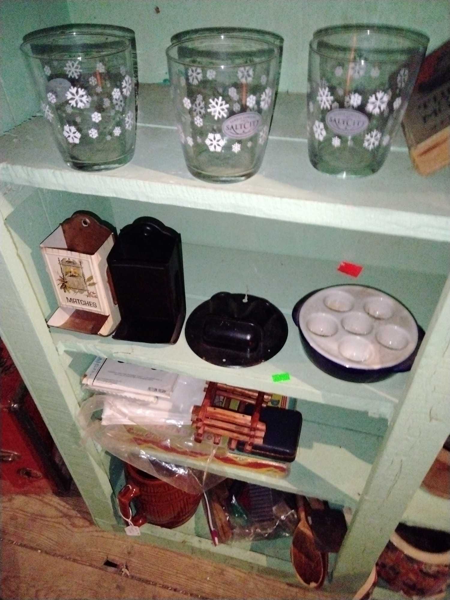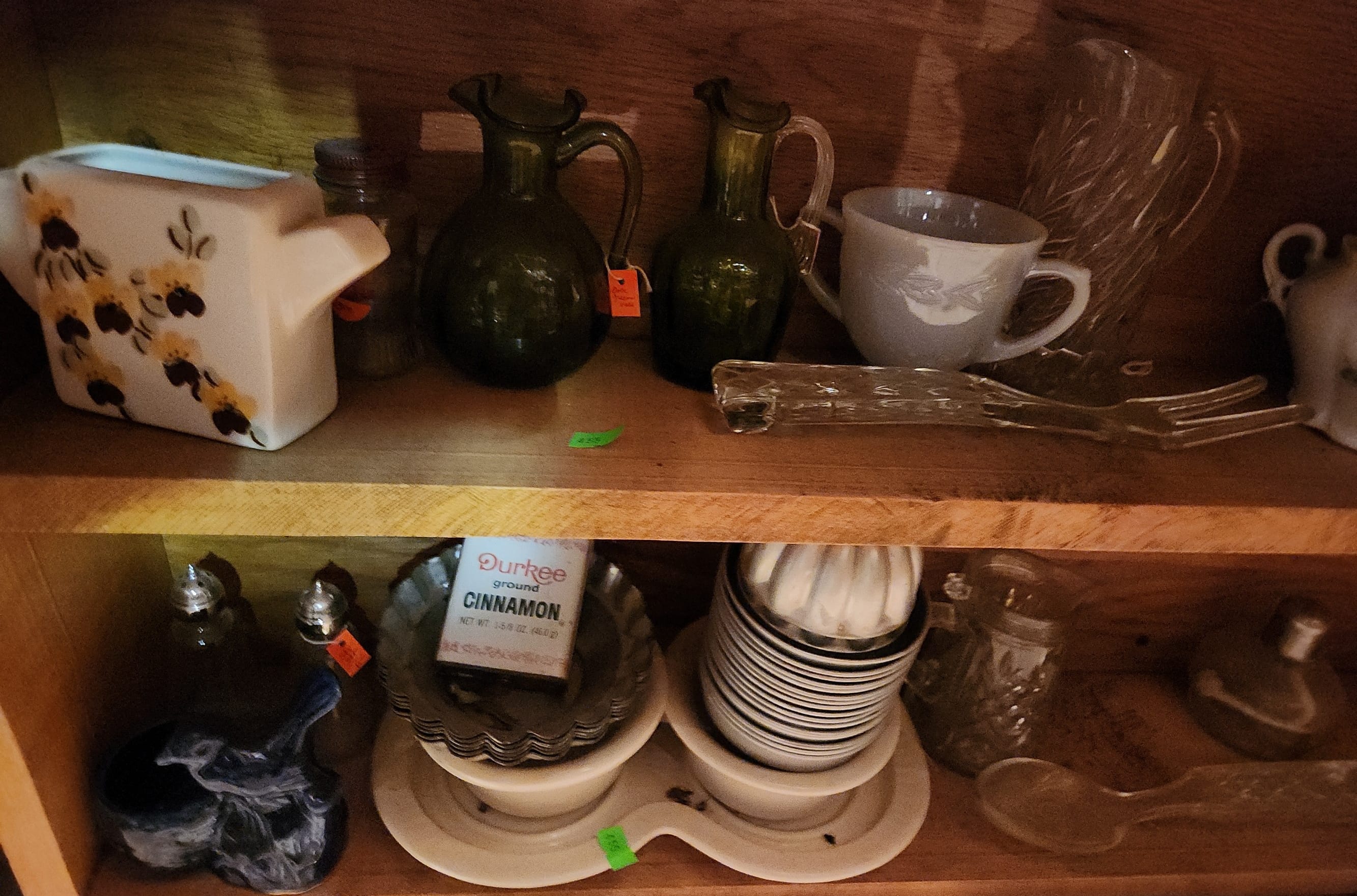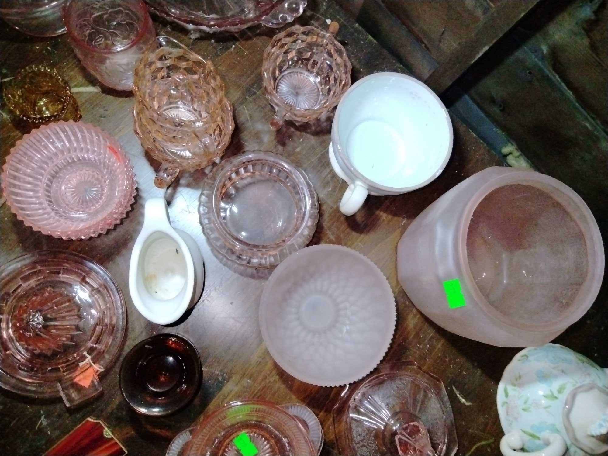 455 Juice glasses, stocking, canning rack, glass creamers, spoon and fork, molds, porcelain sugar bowl, miscellaneous