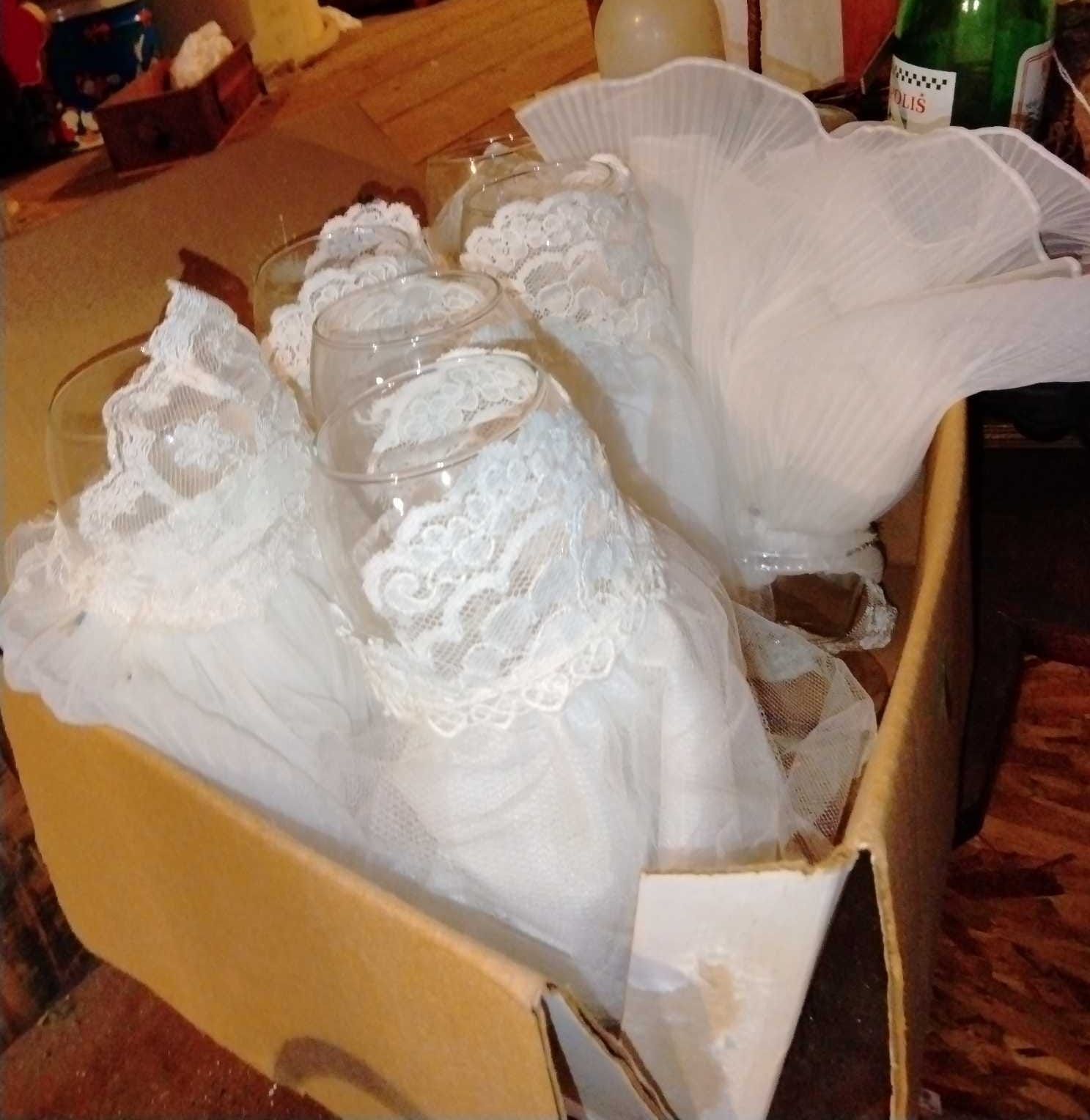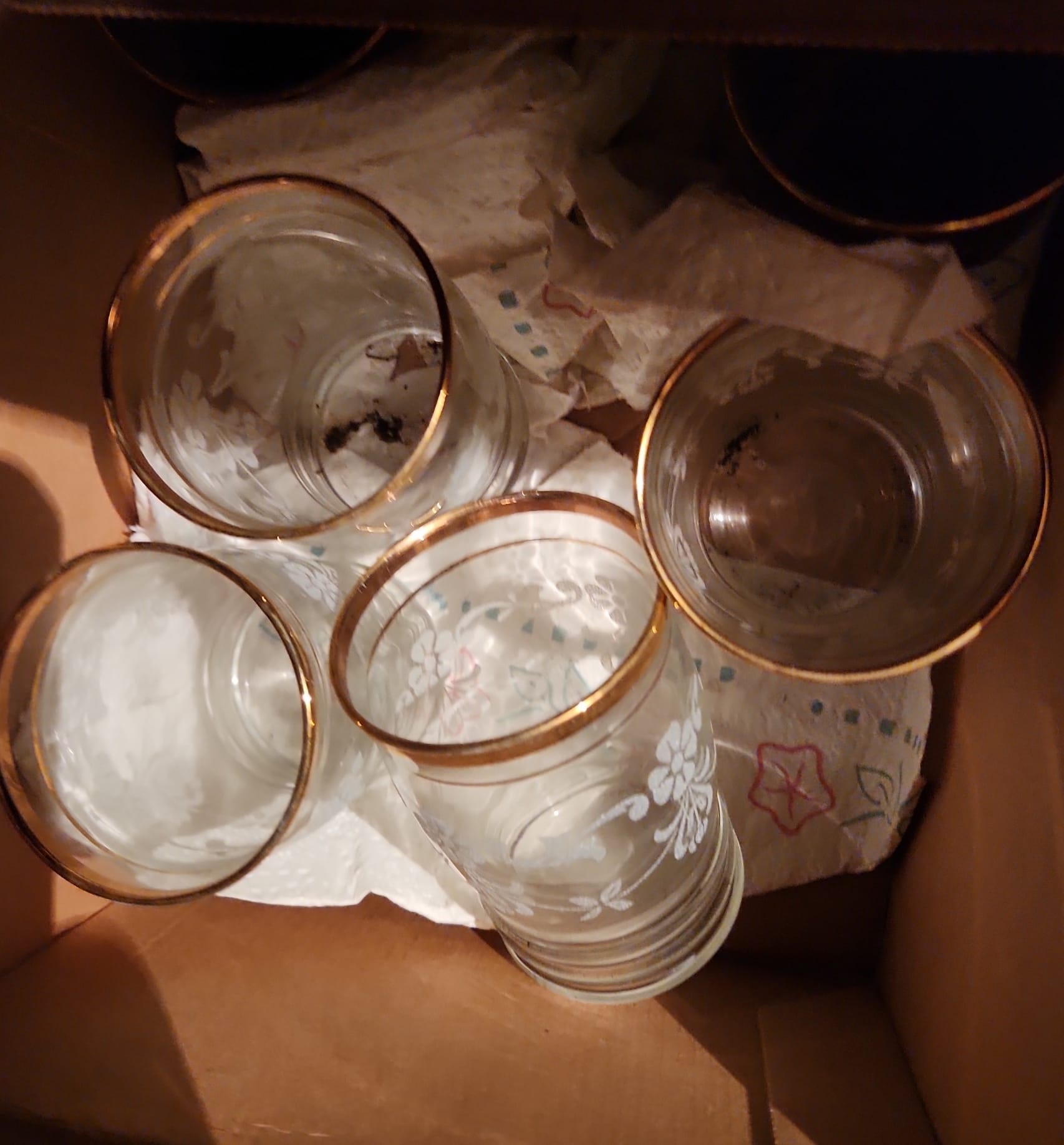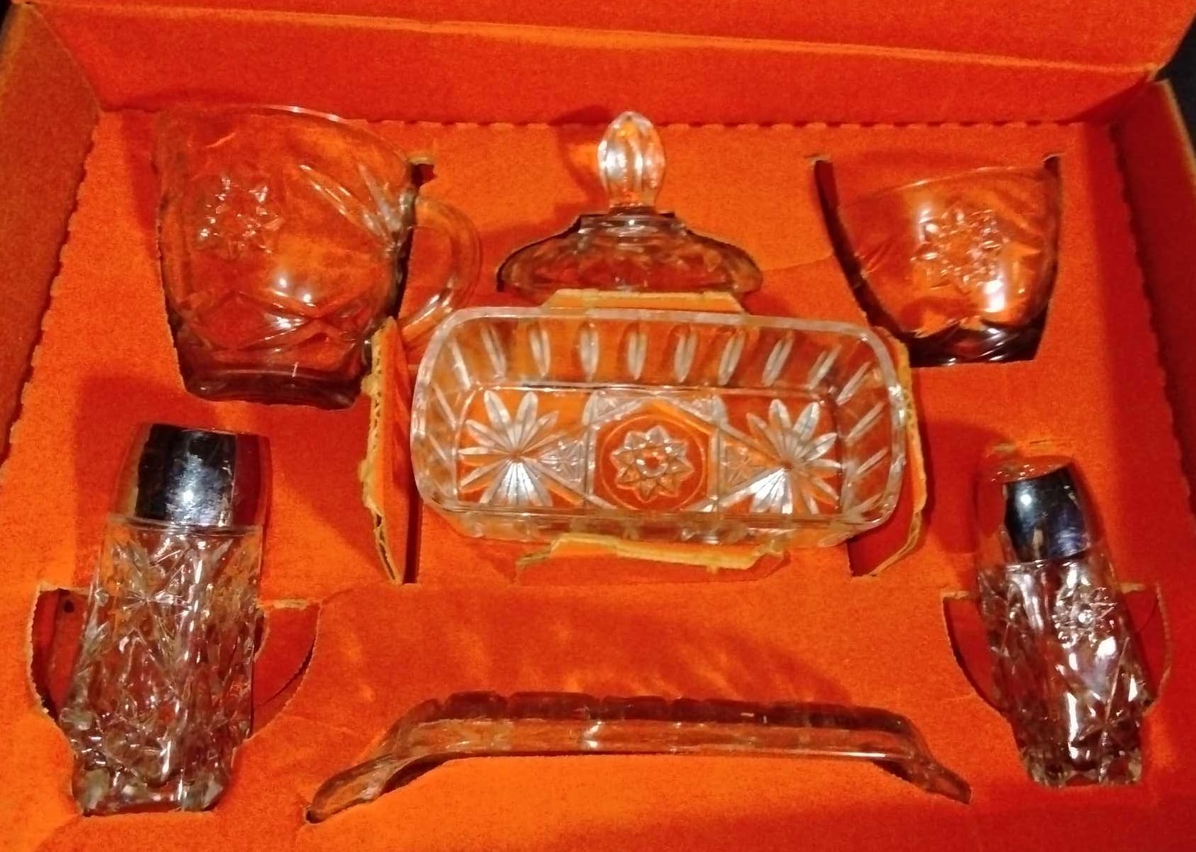 455 Juice glasses, stocking, canning rack, glass creamers, spoon and fork, molds, porcelain sugar bowl, miscellaneous