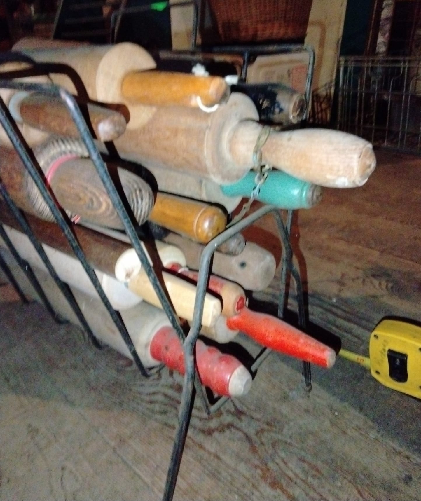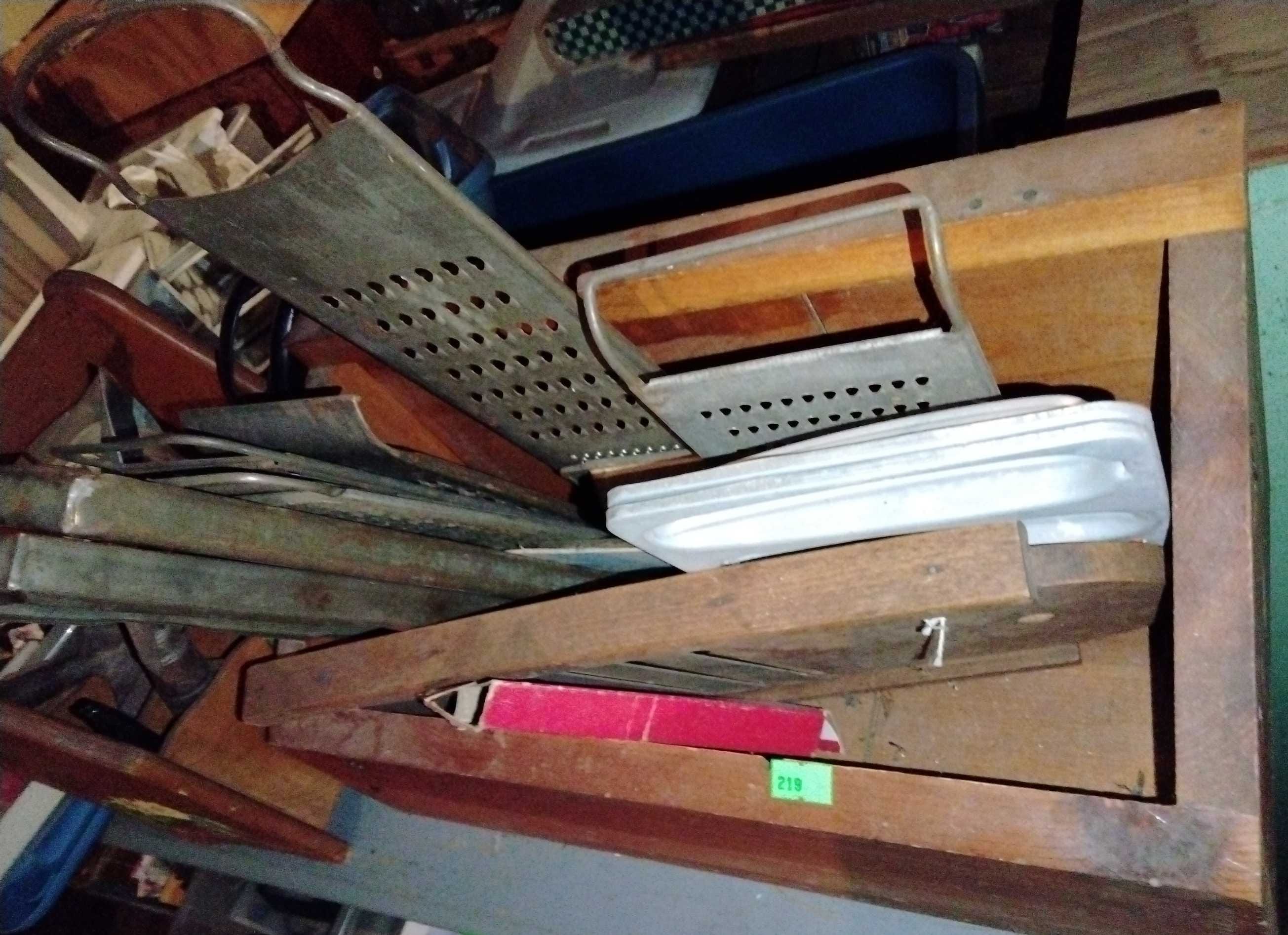 219 Pie rack, pie pans, wood tote, garden tools, graters, slaw cutter, miscellaneous