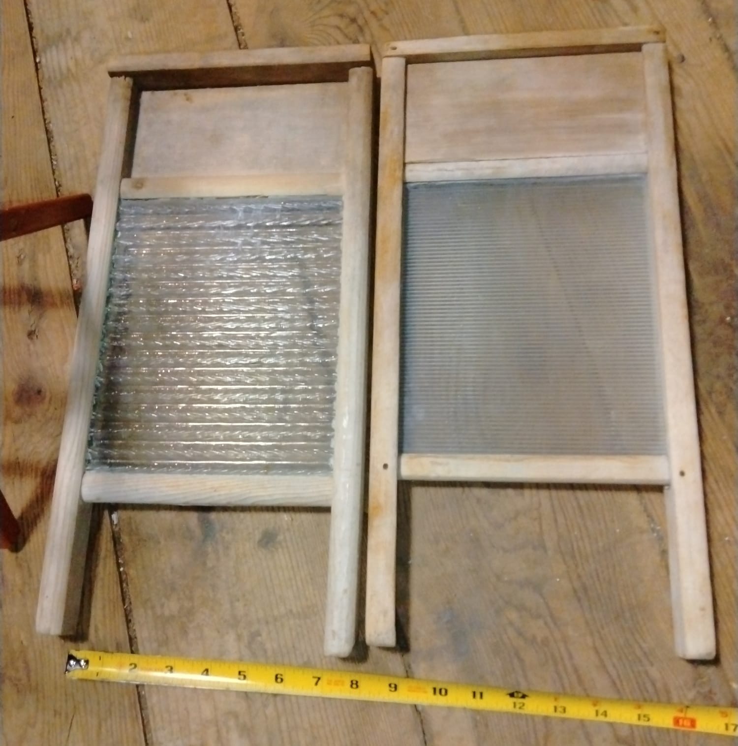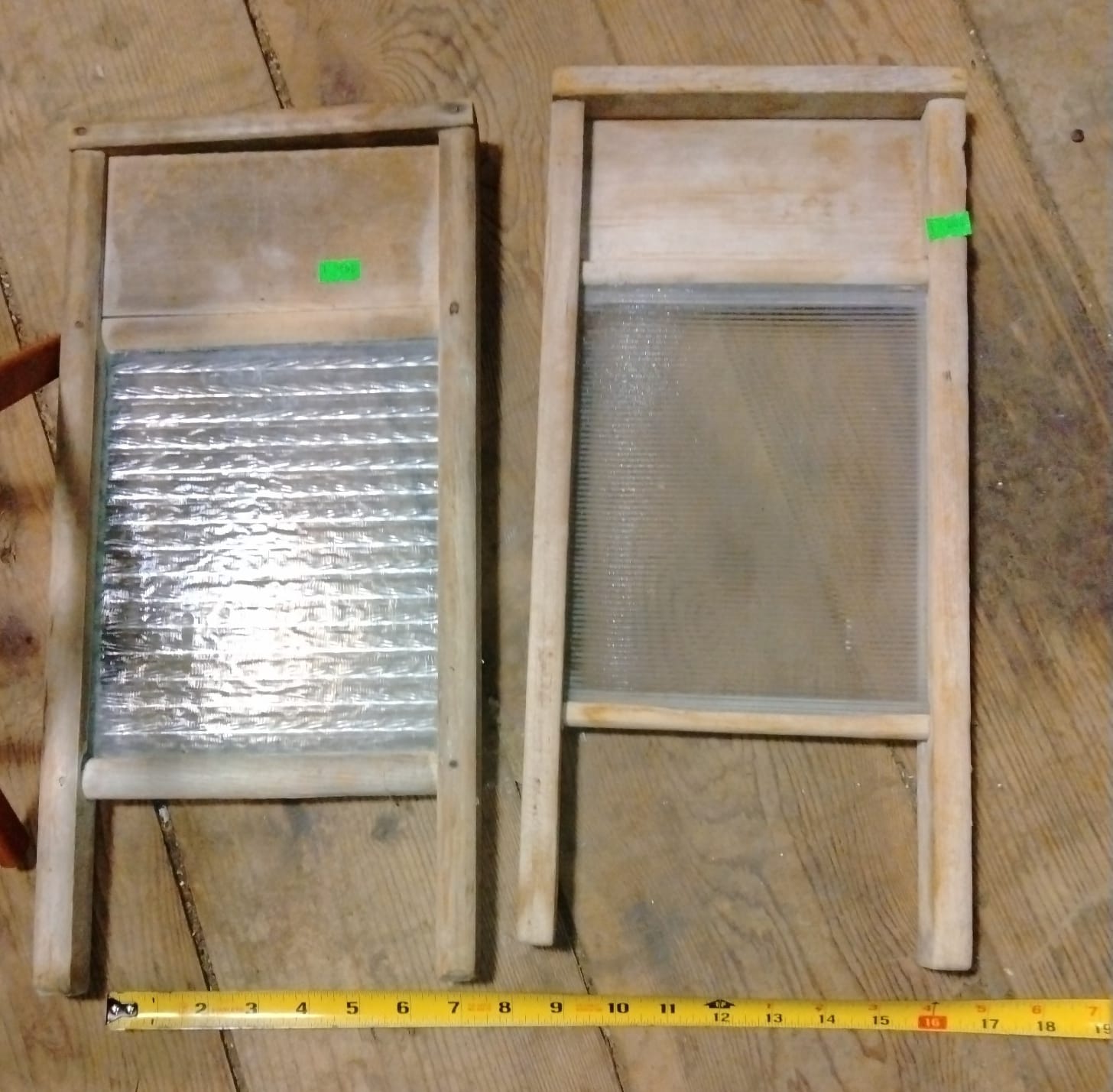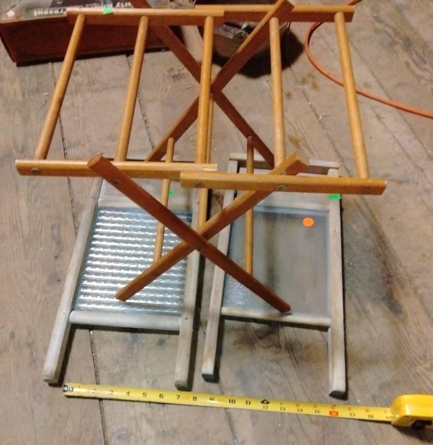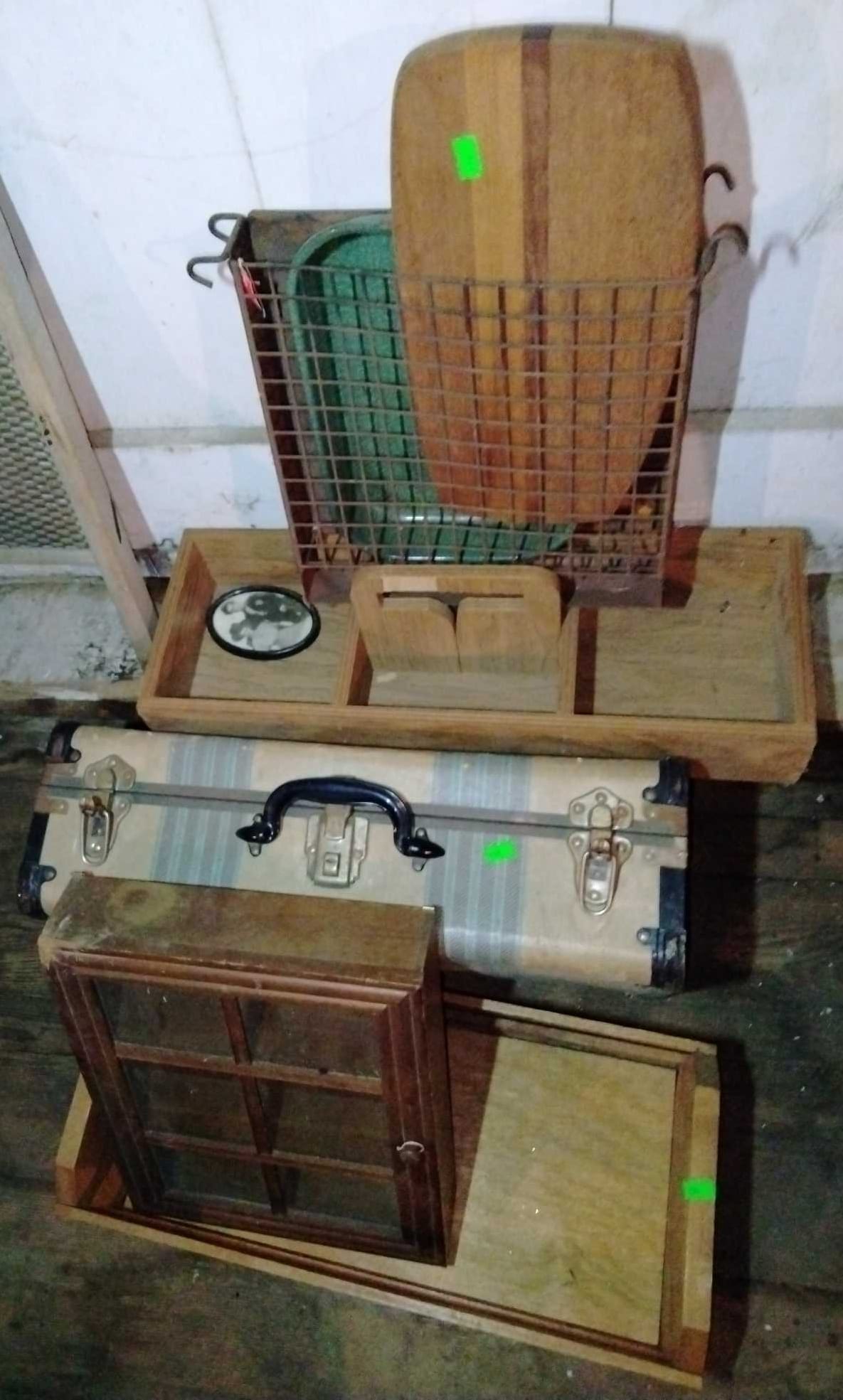 224 Suitcase, washboard, wood totes, enamel pan, wood cutting board, display box