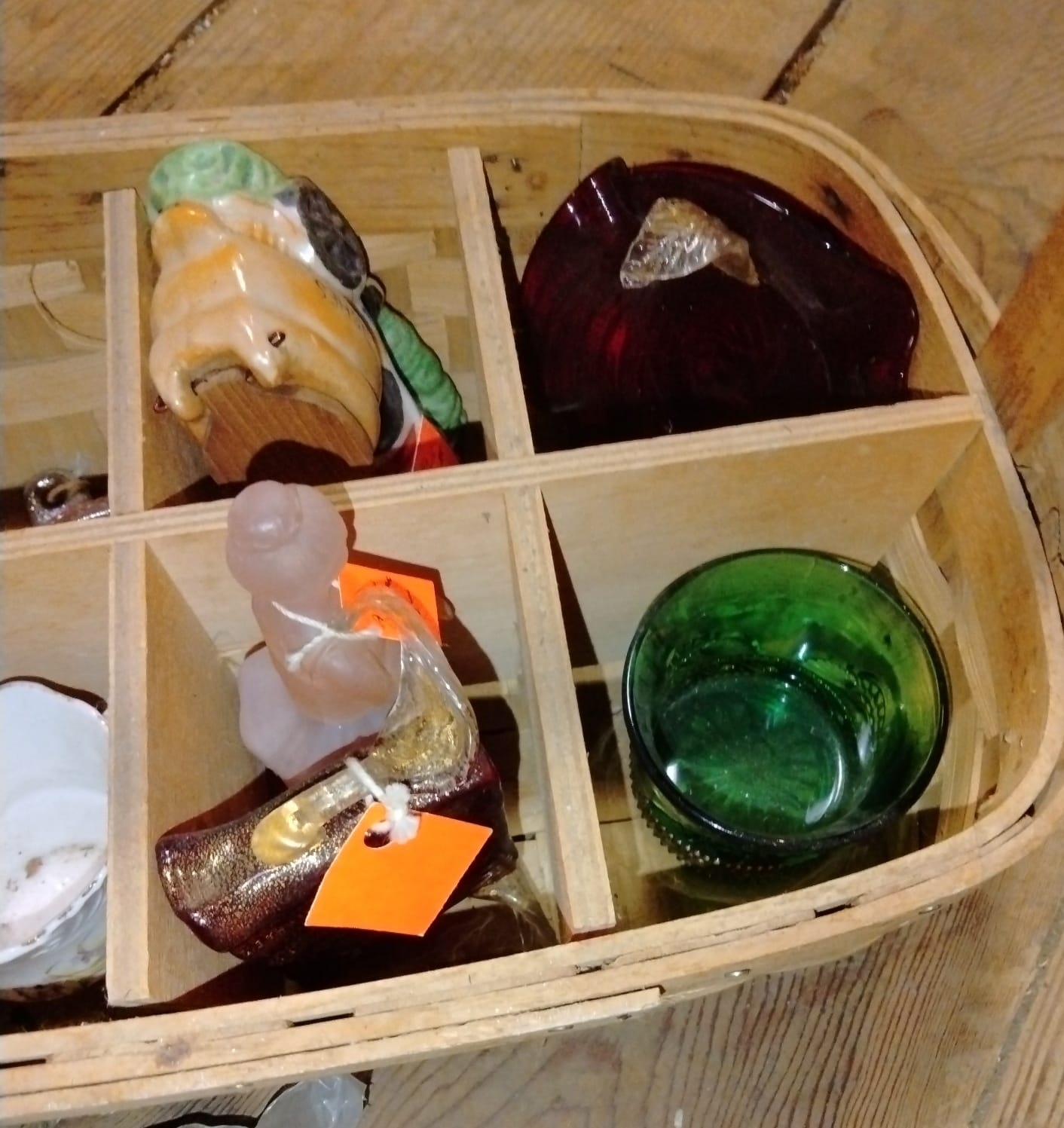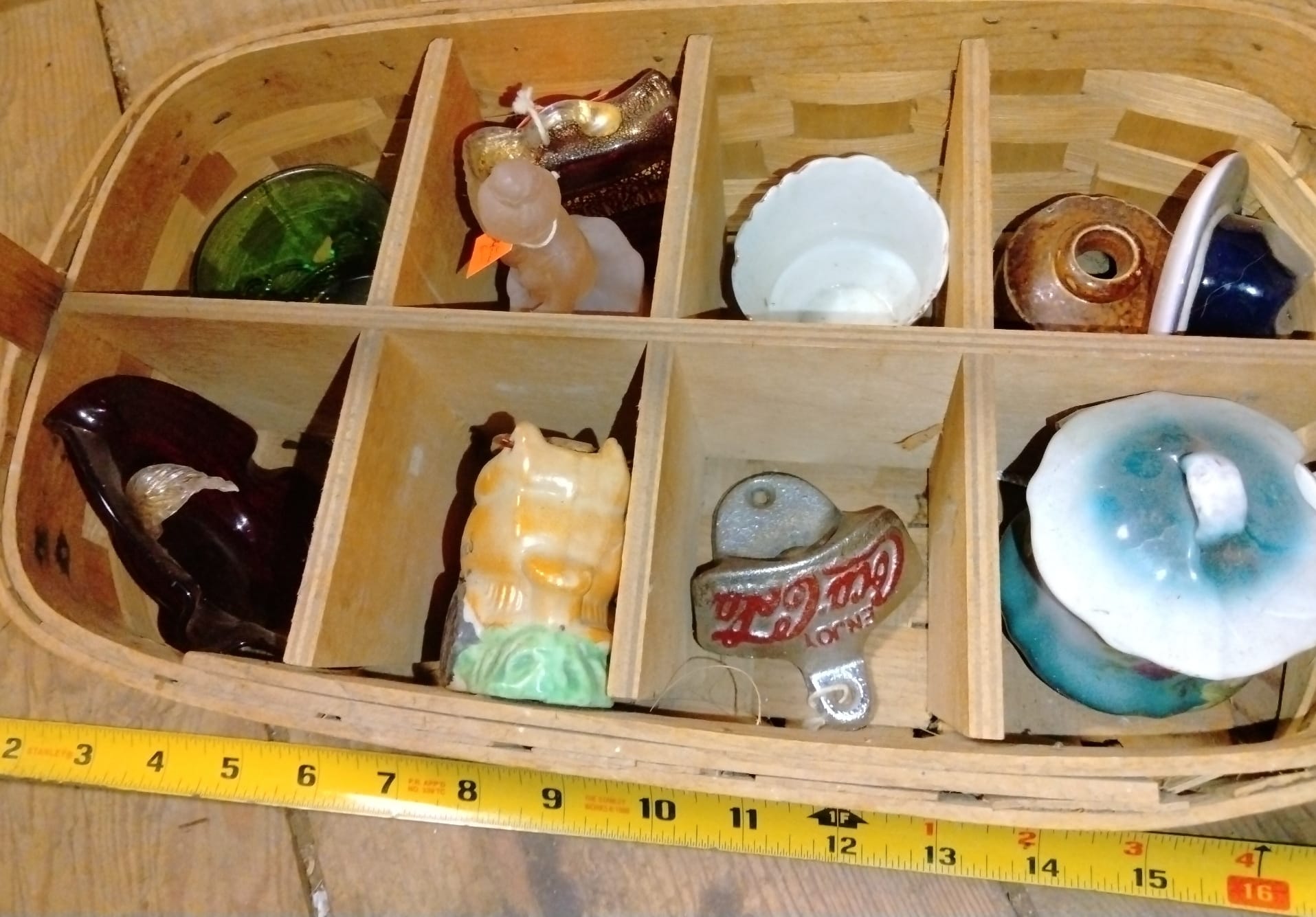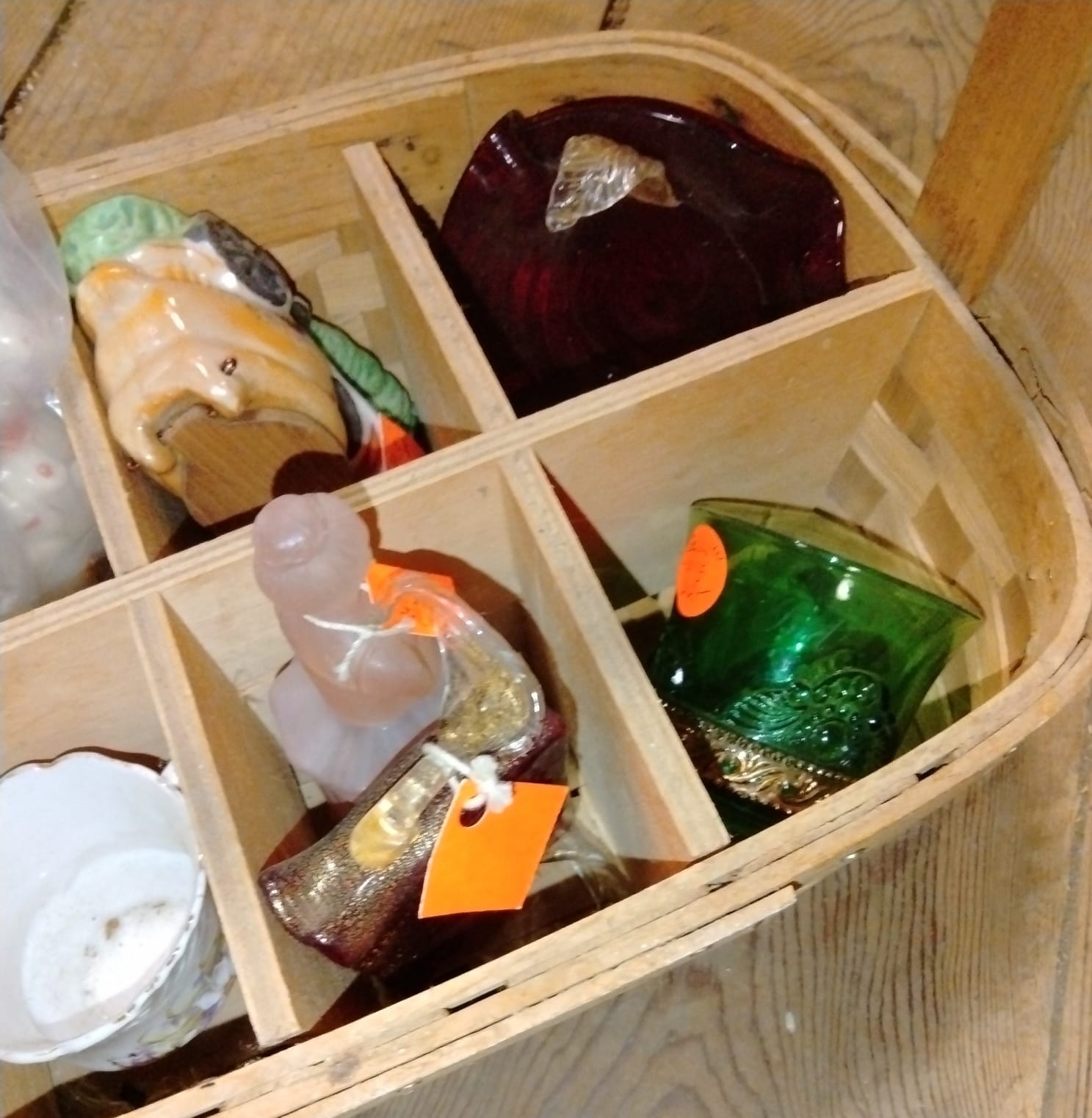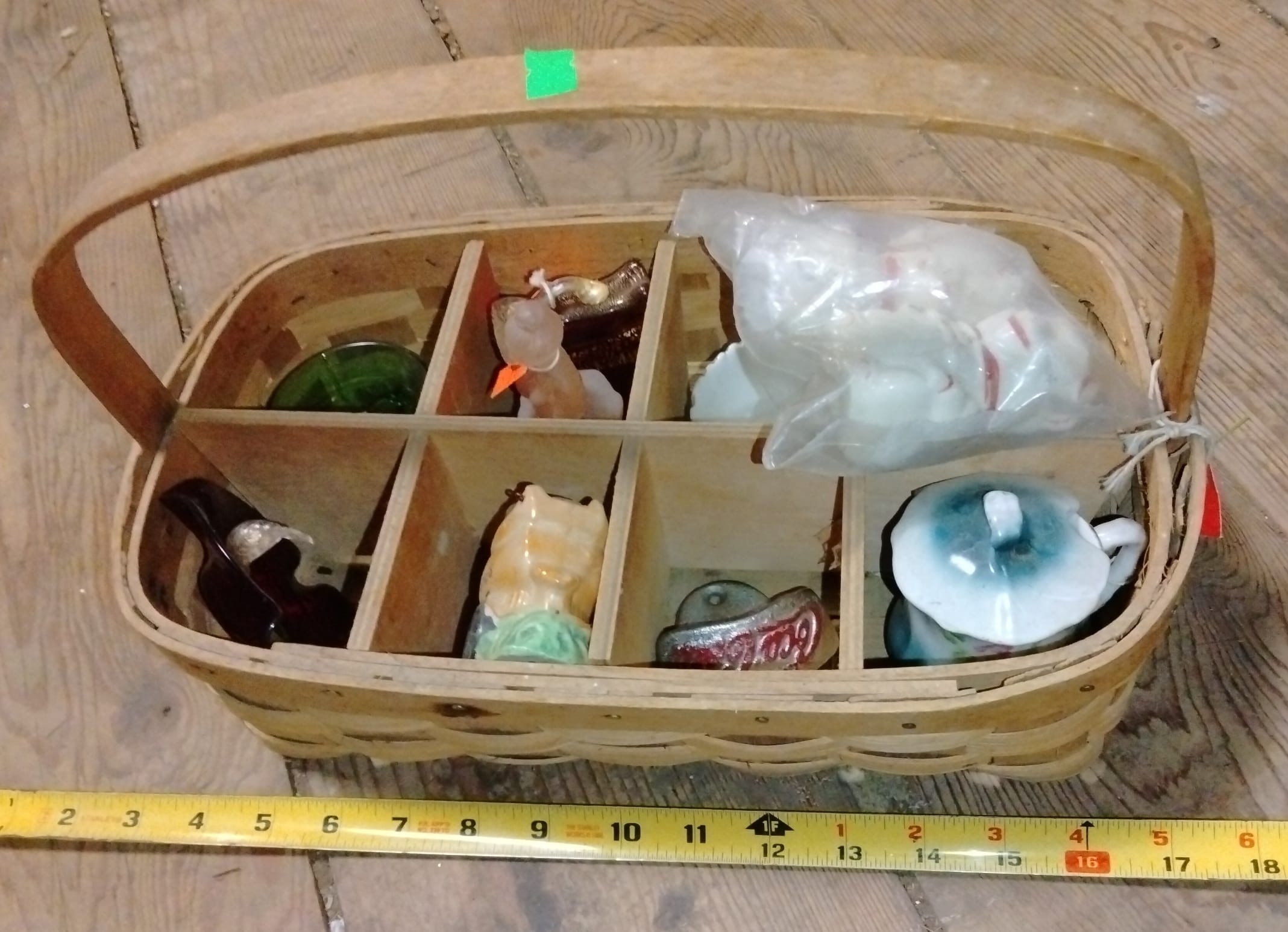 261 Divided basket, Shawnee salt and pepper shakers, Delaware glass, porcelain, Coca-Cola bottle opener, Ruby cigarette holder and ashtray