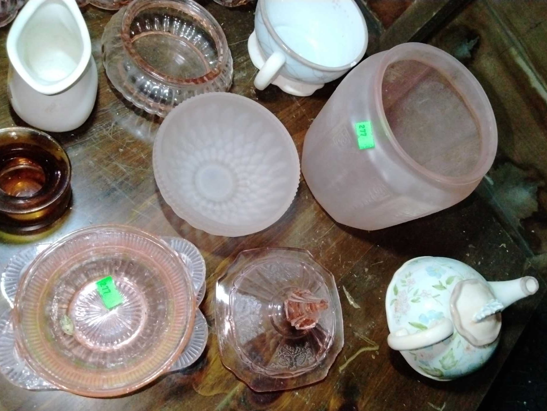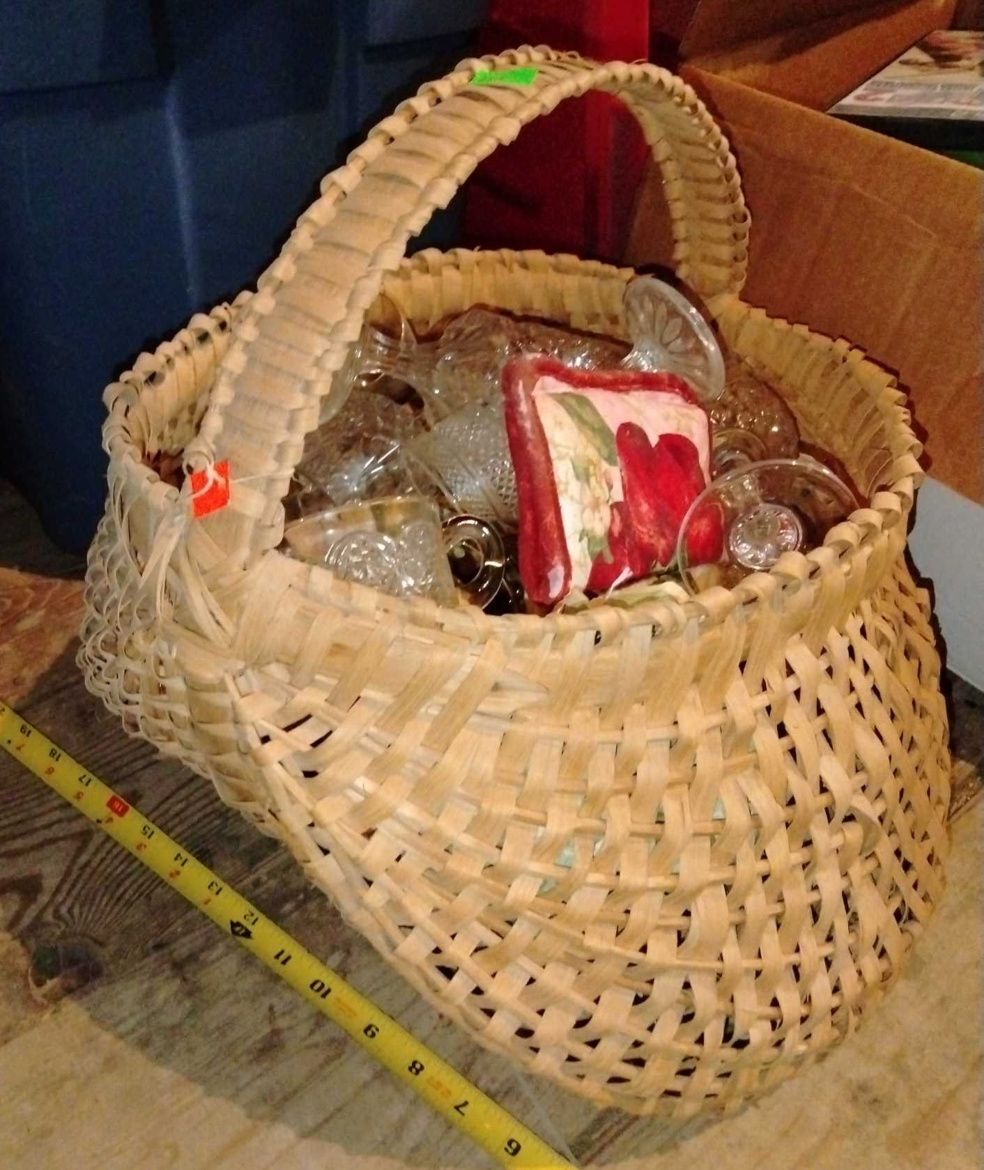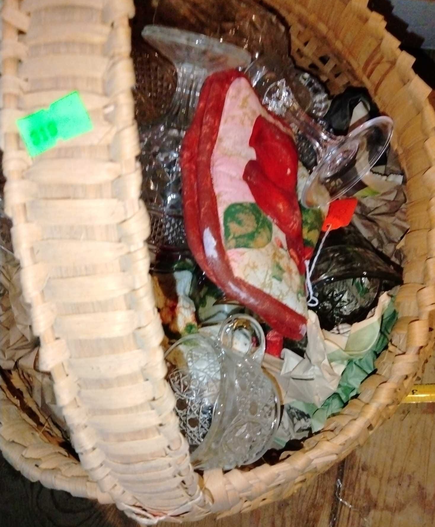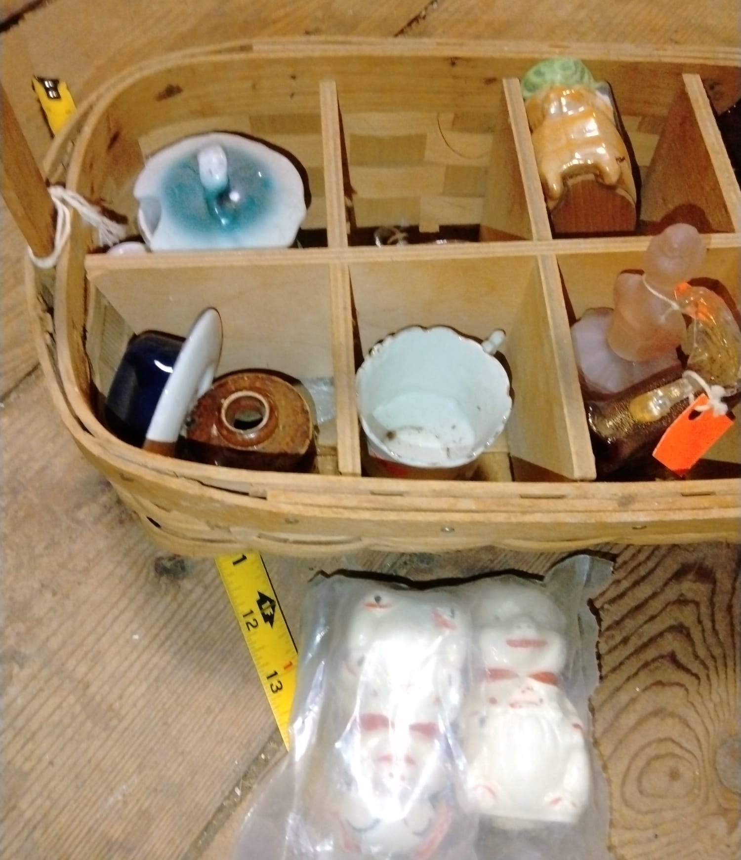 261 Divided basket, Shawnee salt and pepper shakers, Delaware glass, porcelain, Coca-Cola bottle opener, Ruby cigarette holder and ashtray