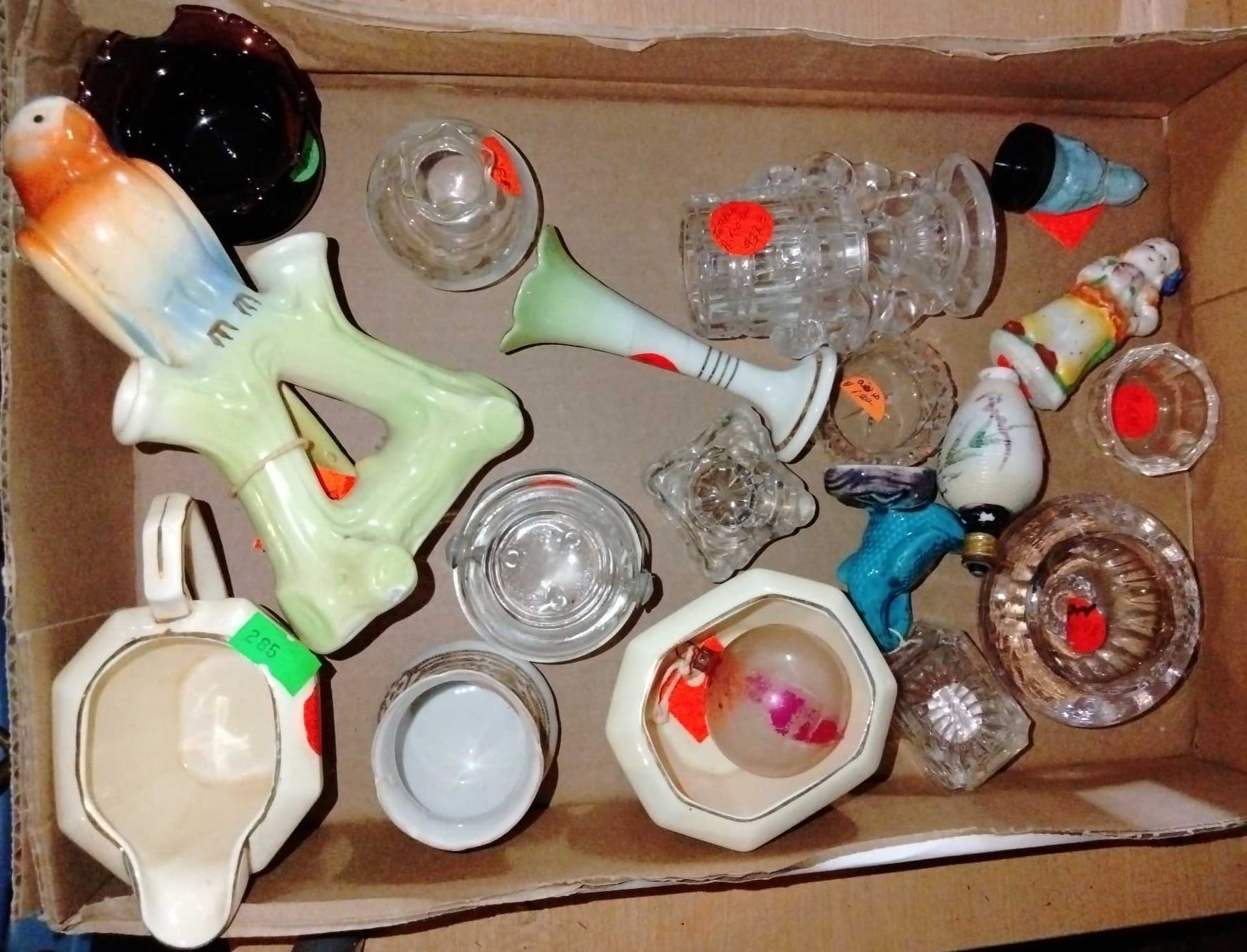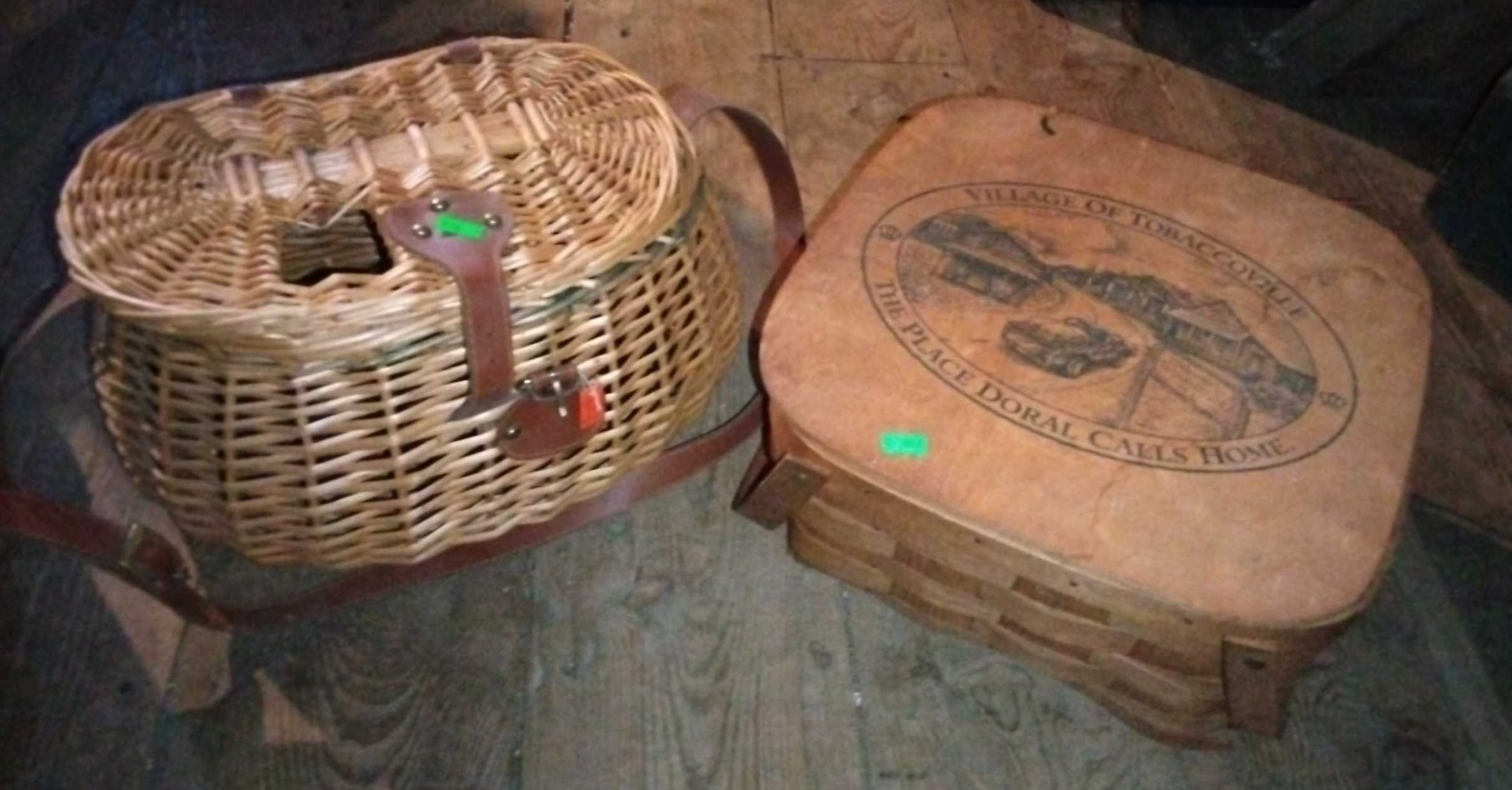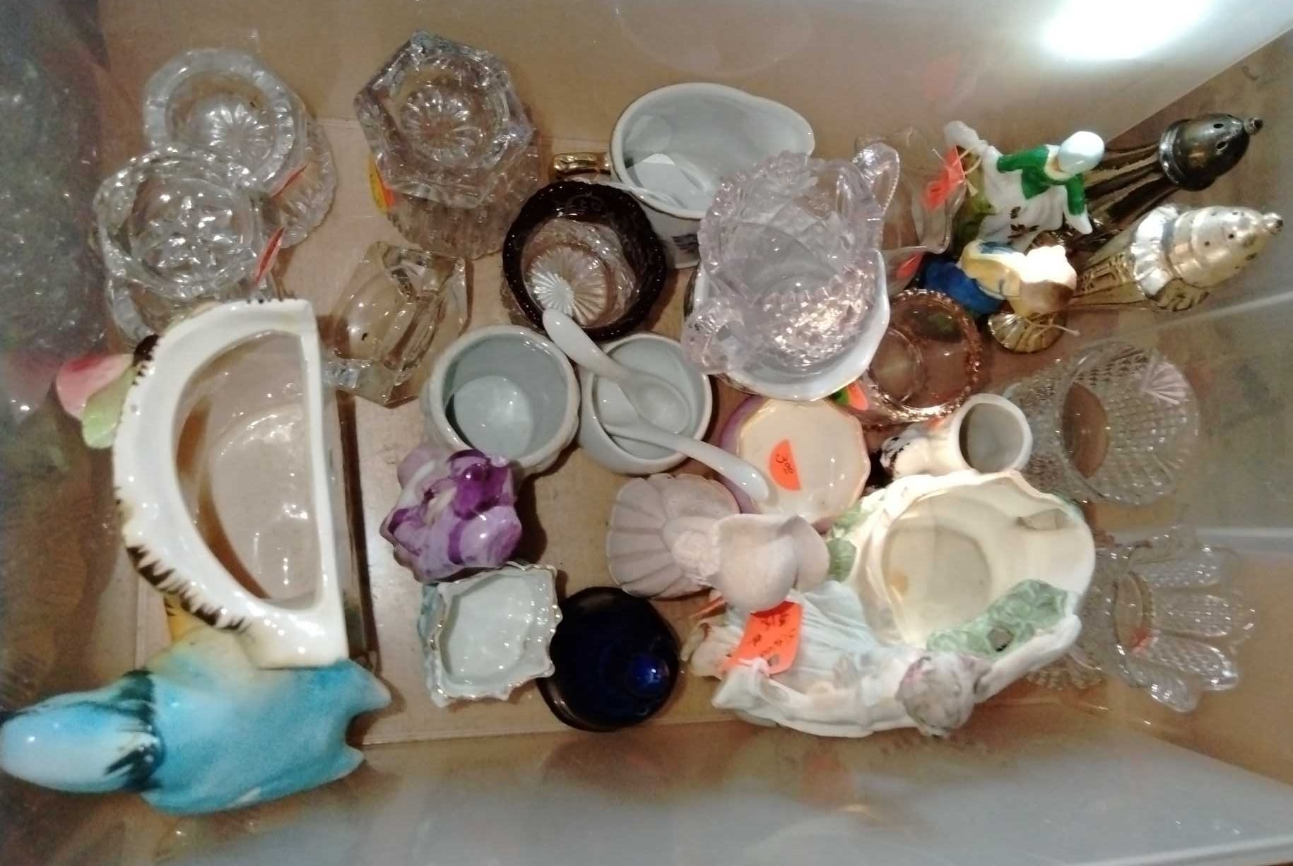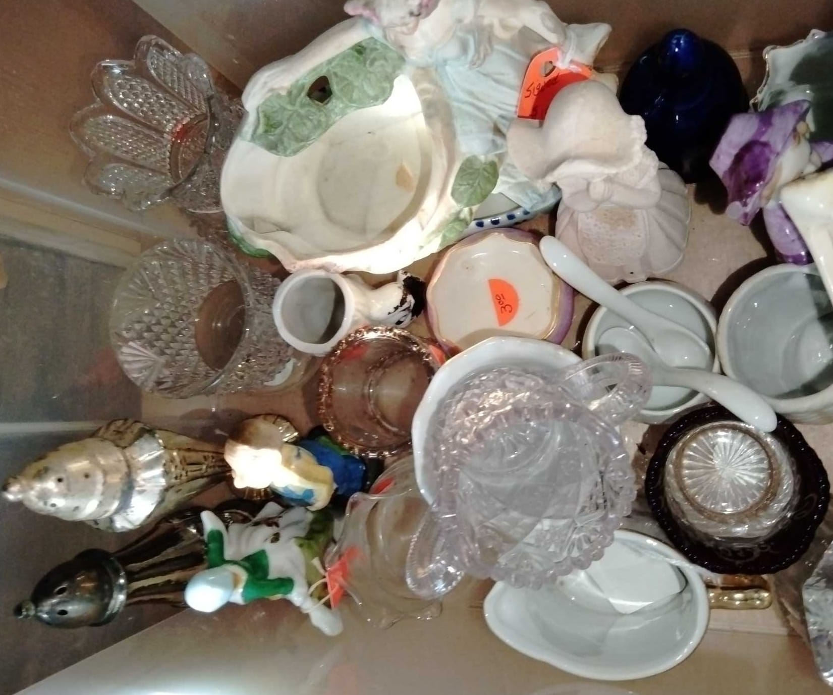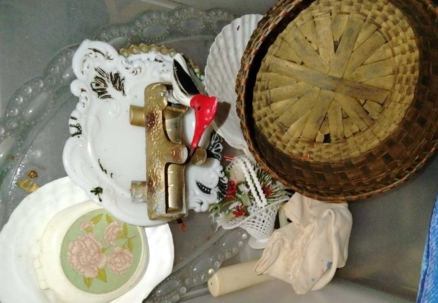 261 Divided basket, Shawnee salt and pepper shakers, Delaware glass, porcelain, Coca-Cola bottle opener, Ruby cigarette holder and ashtray