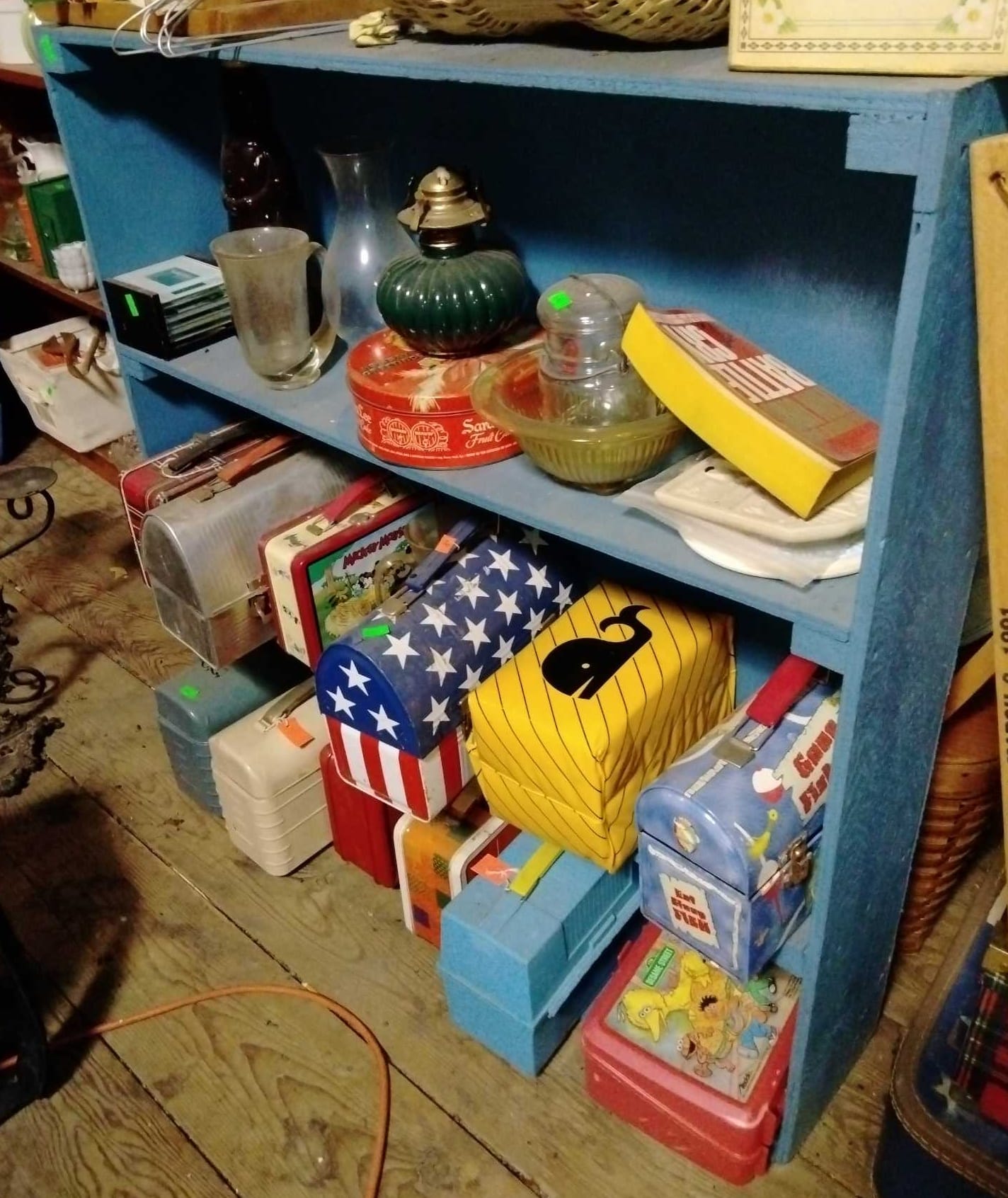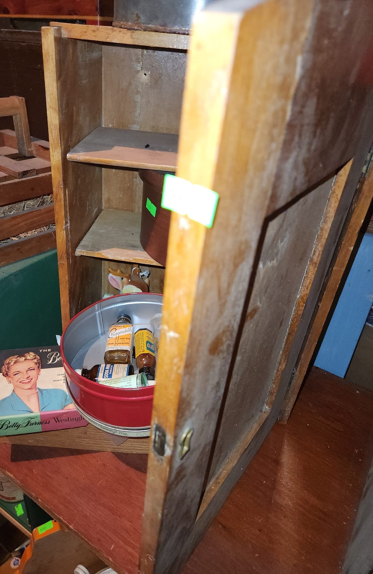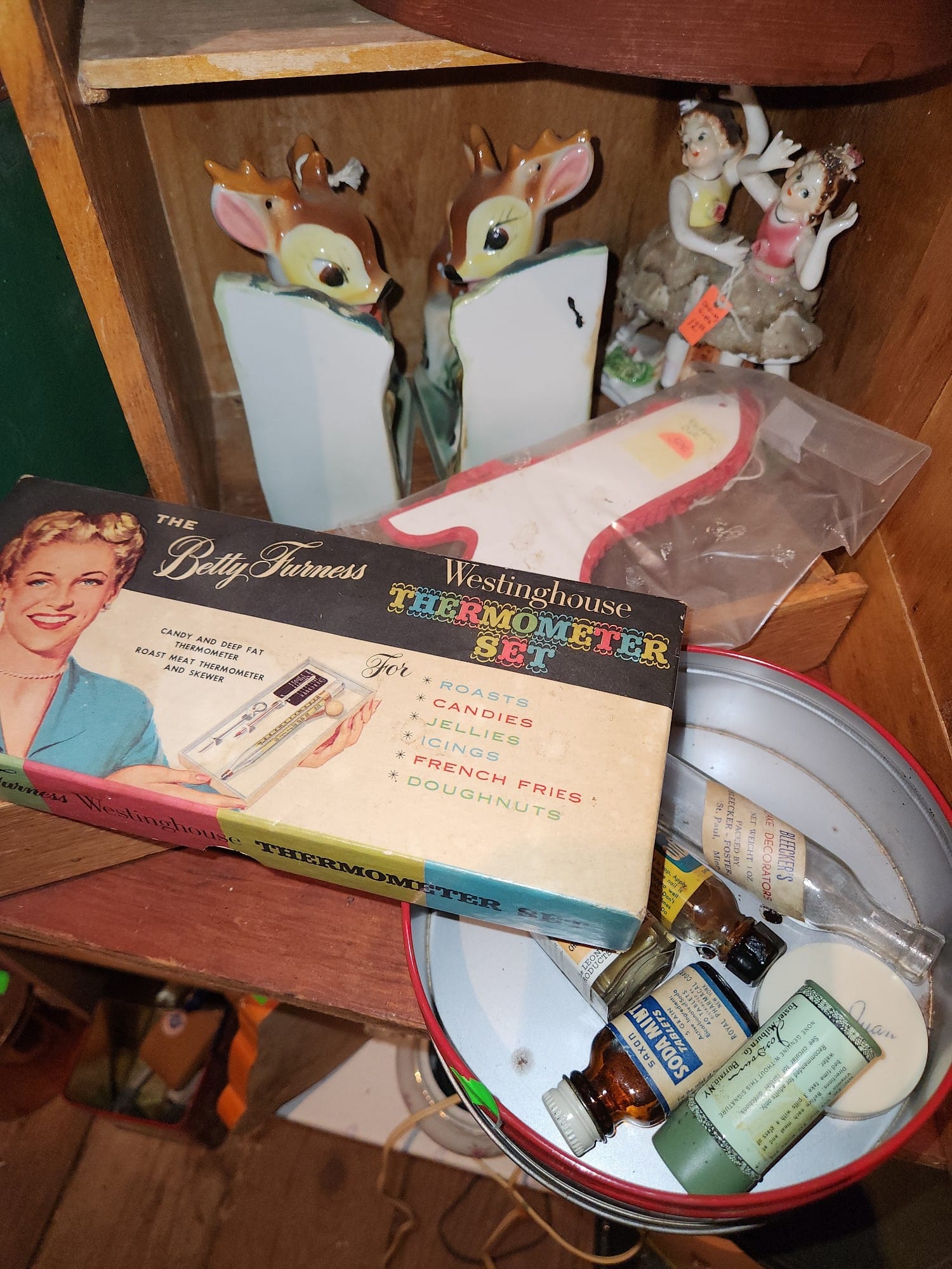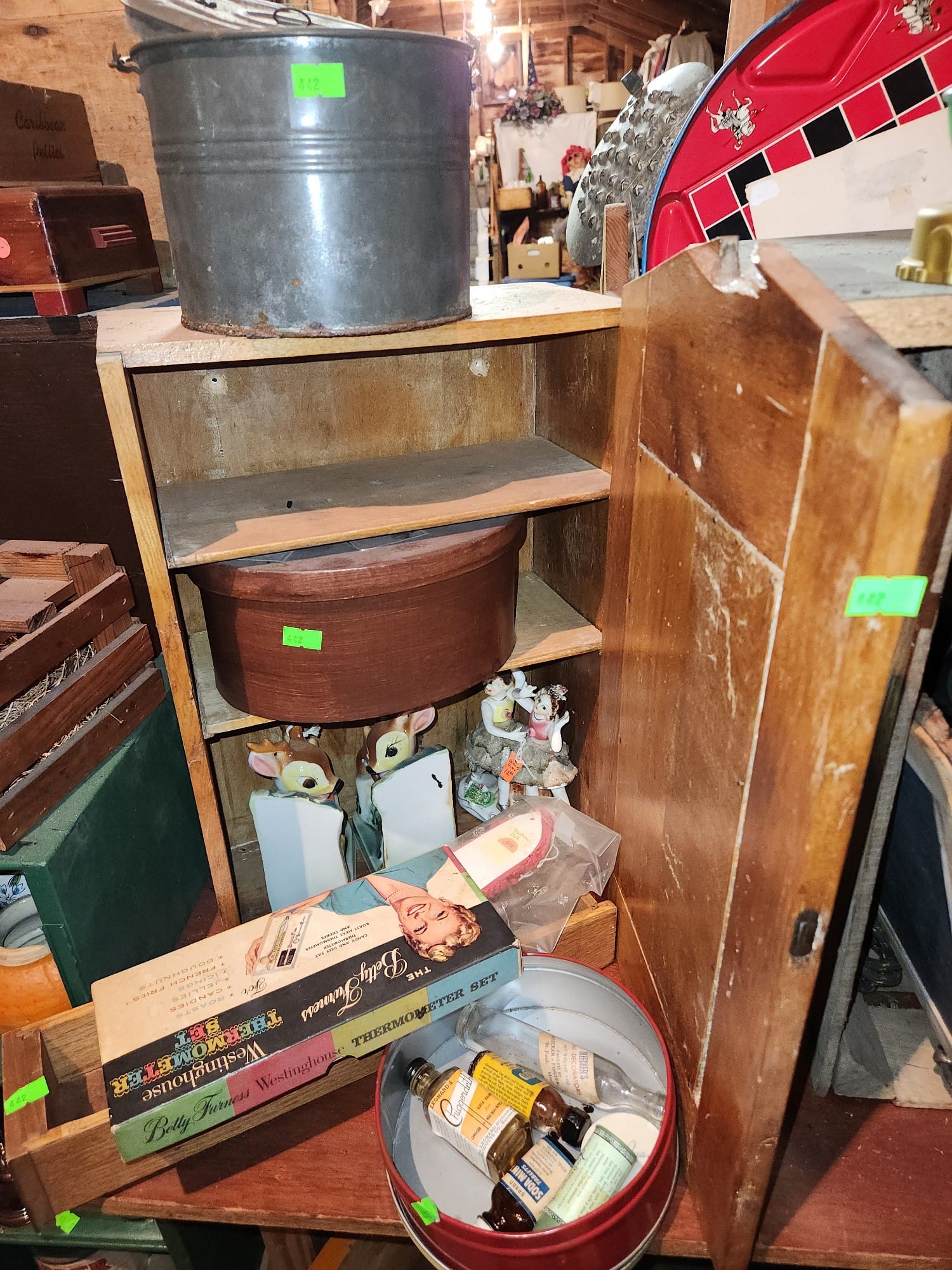 442 Lunch pail, box with cookie cutters, cooking thermometer set, bottles, deer bookends, wood cabinet 7x12x19