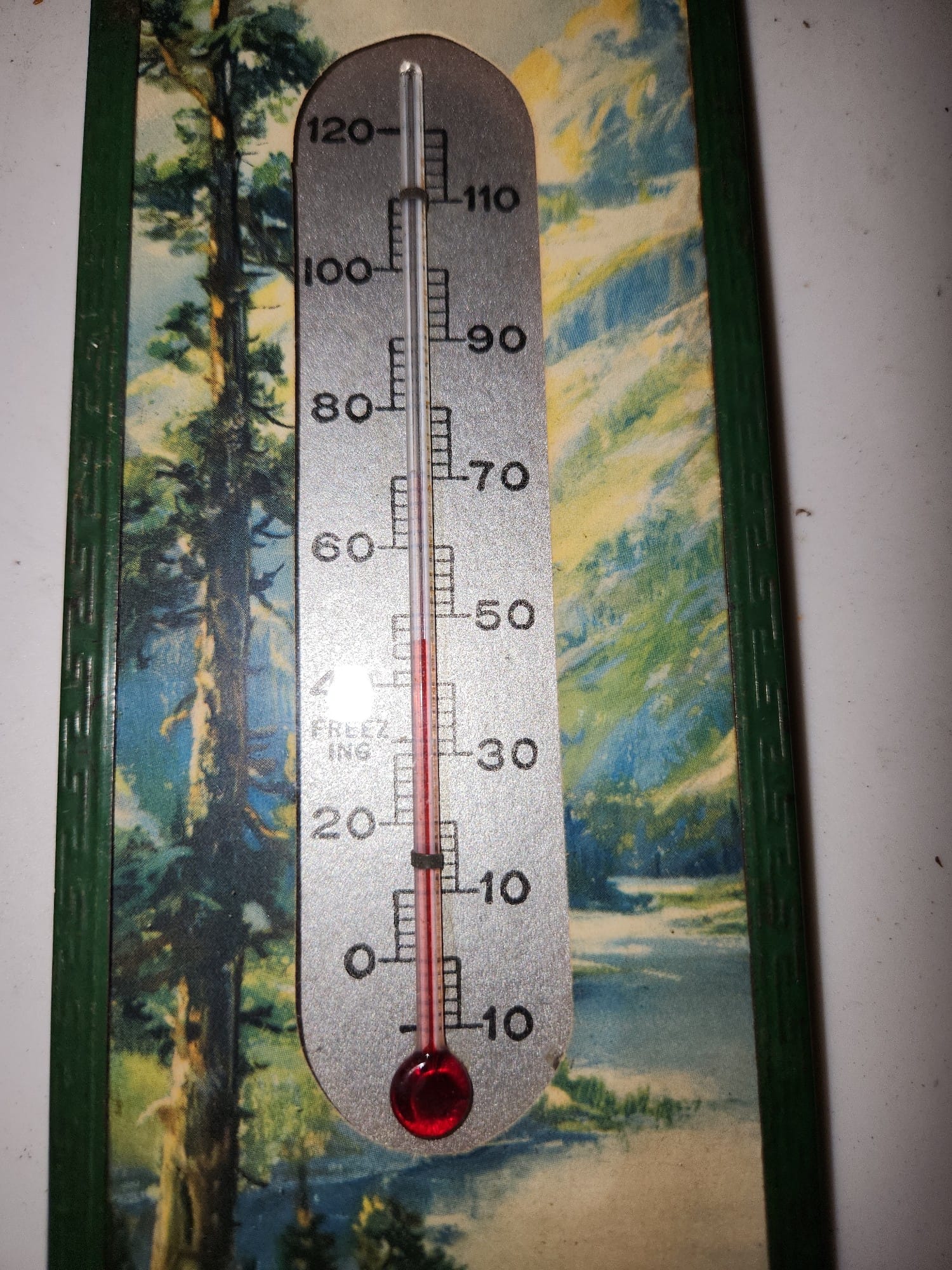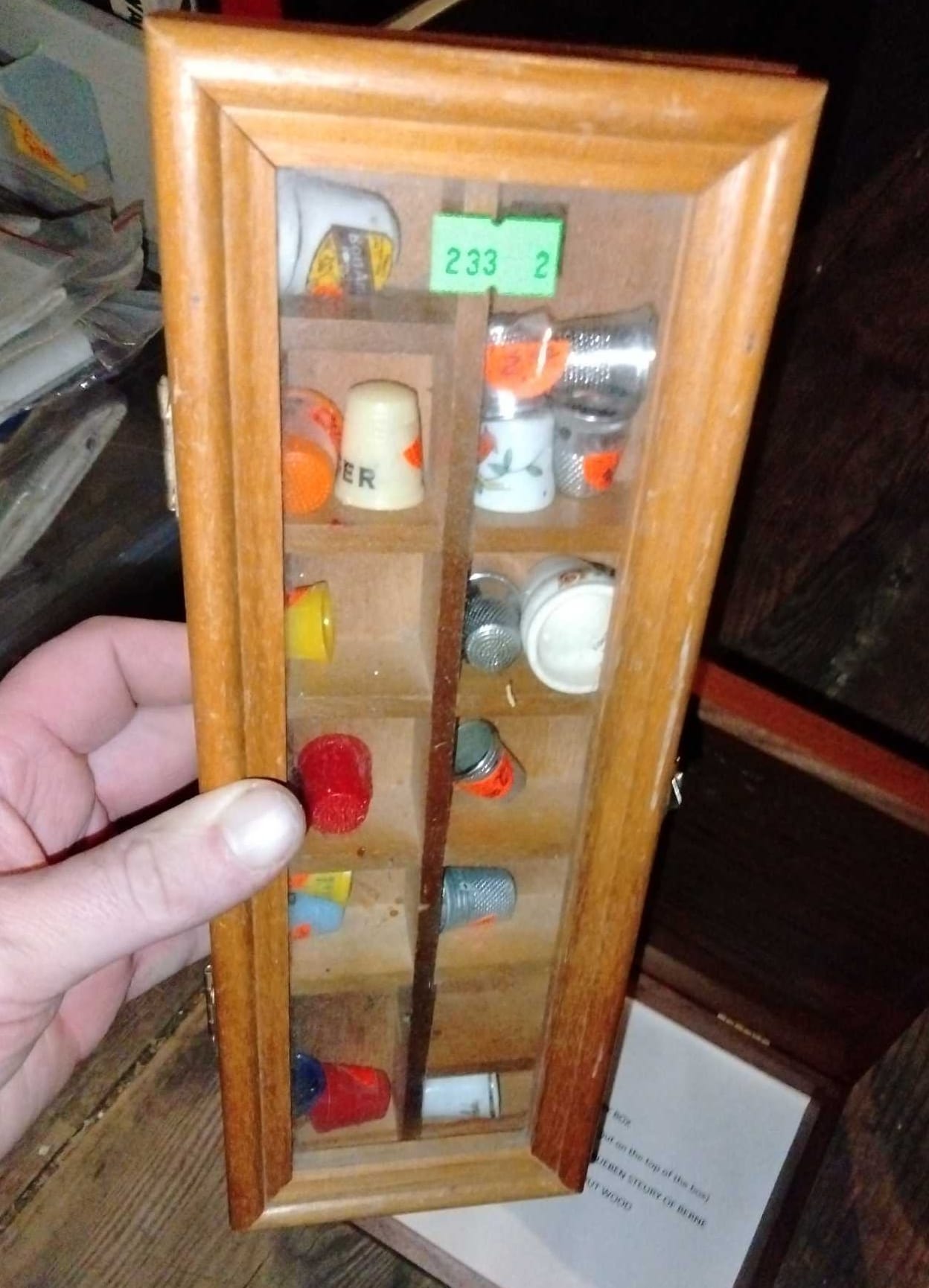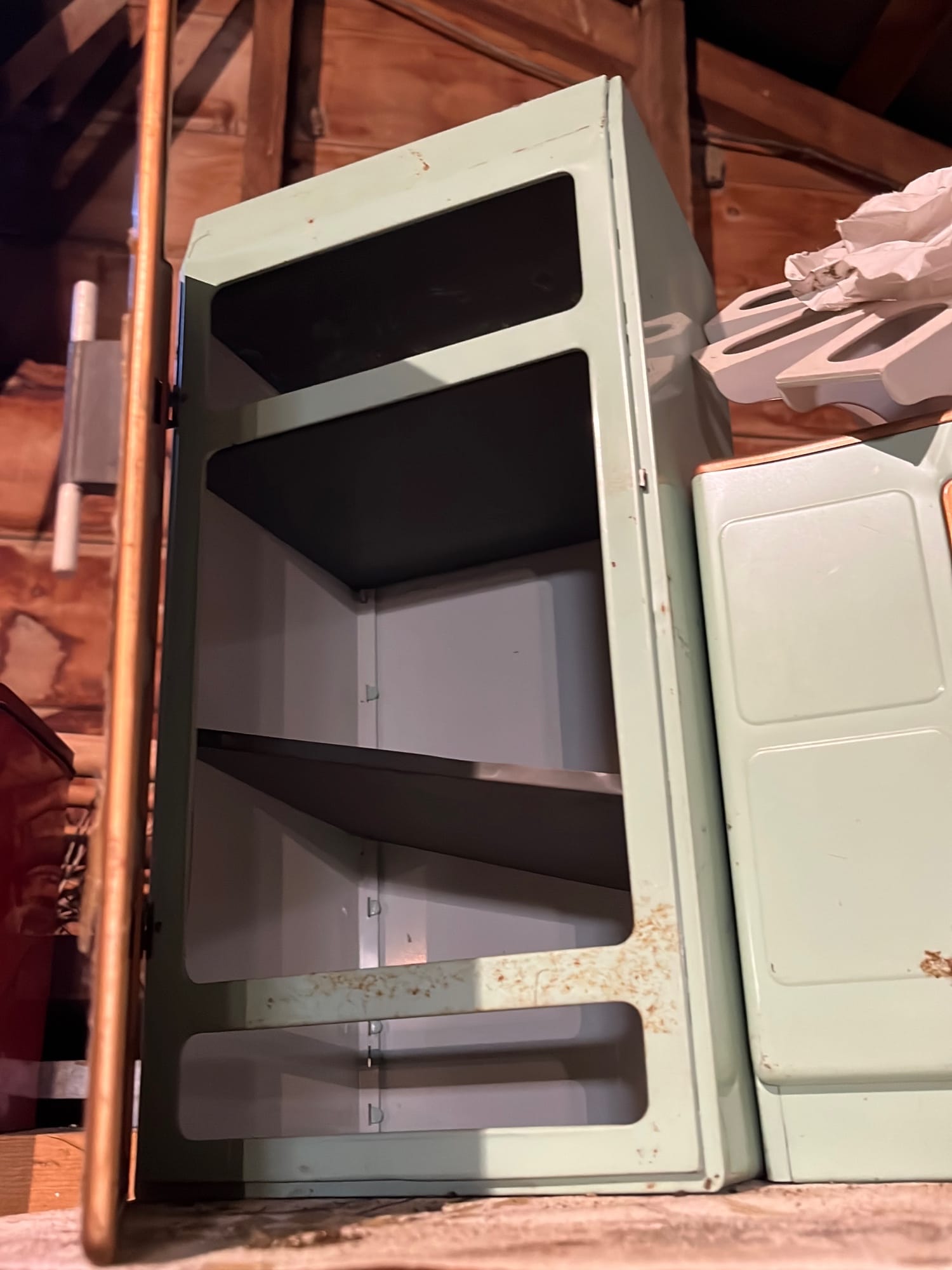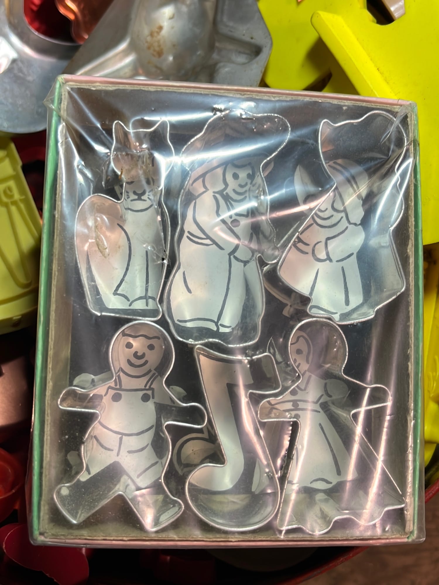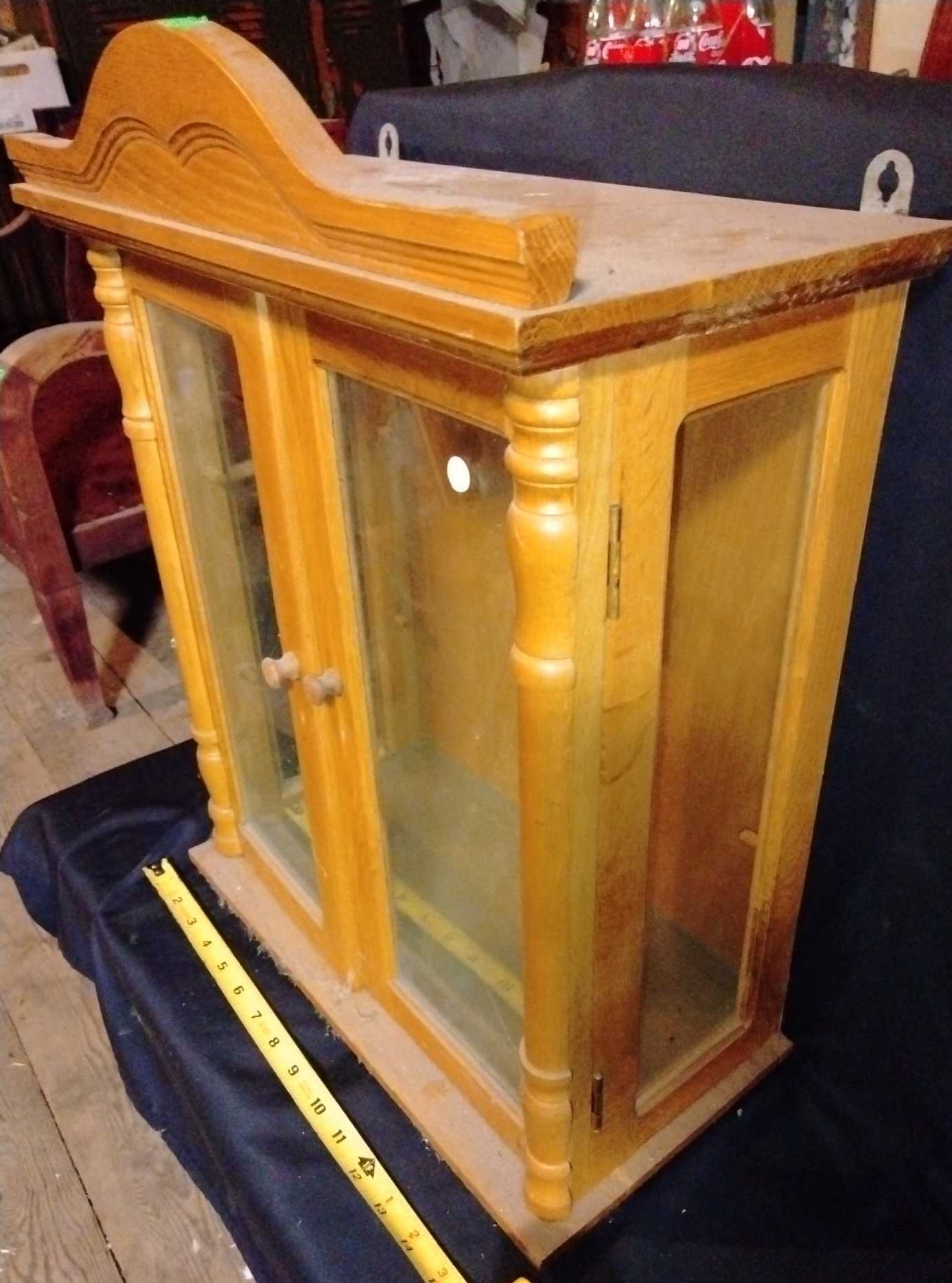 442 Lunch pail, box with cookie cutters, cooking thermometer set, bottles, deer bookends, wood cabinet 7x12x19