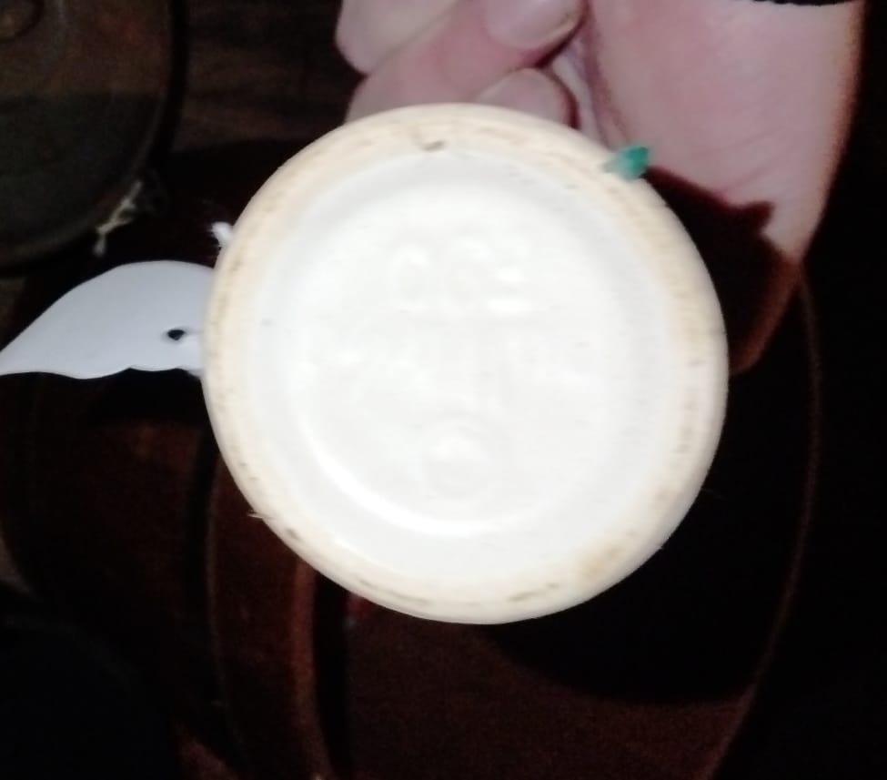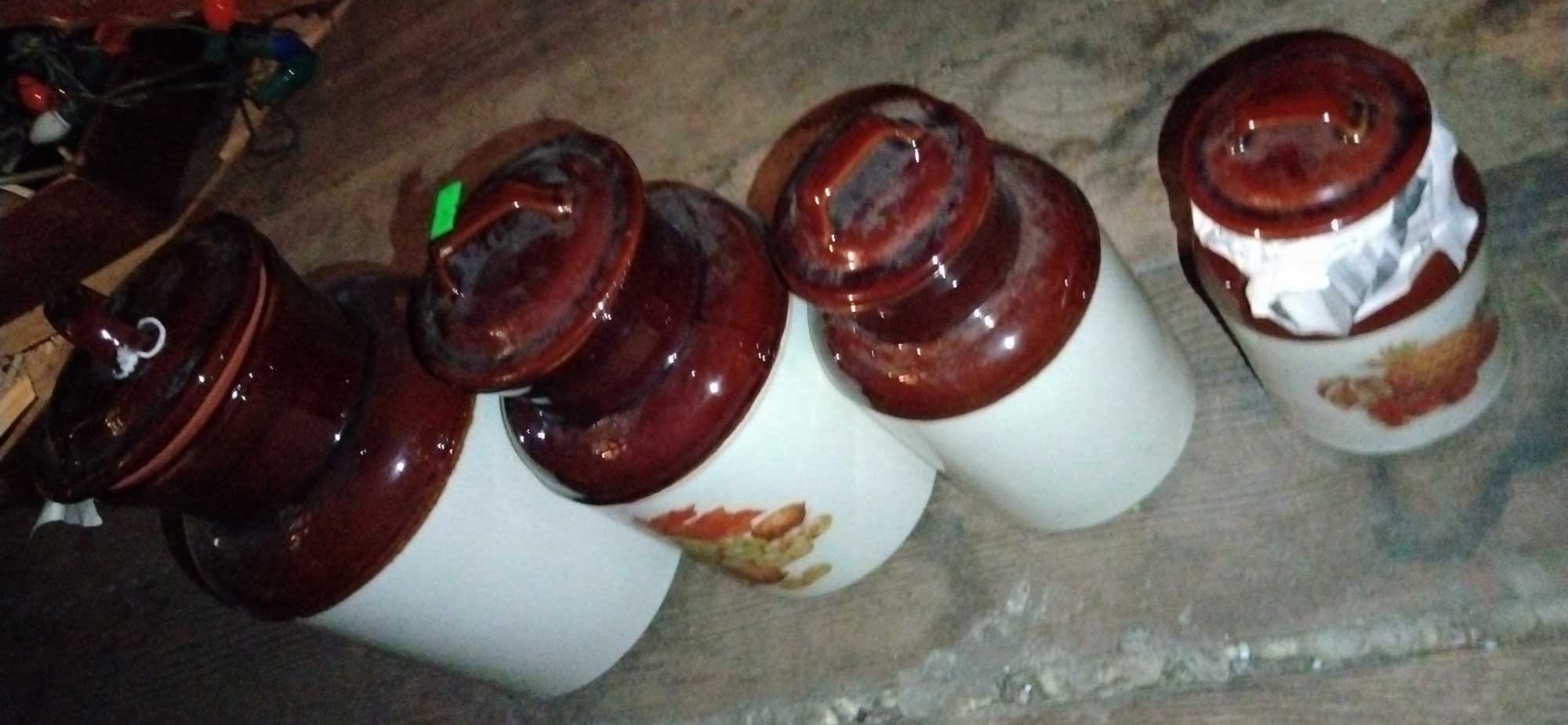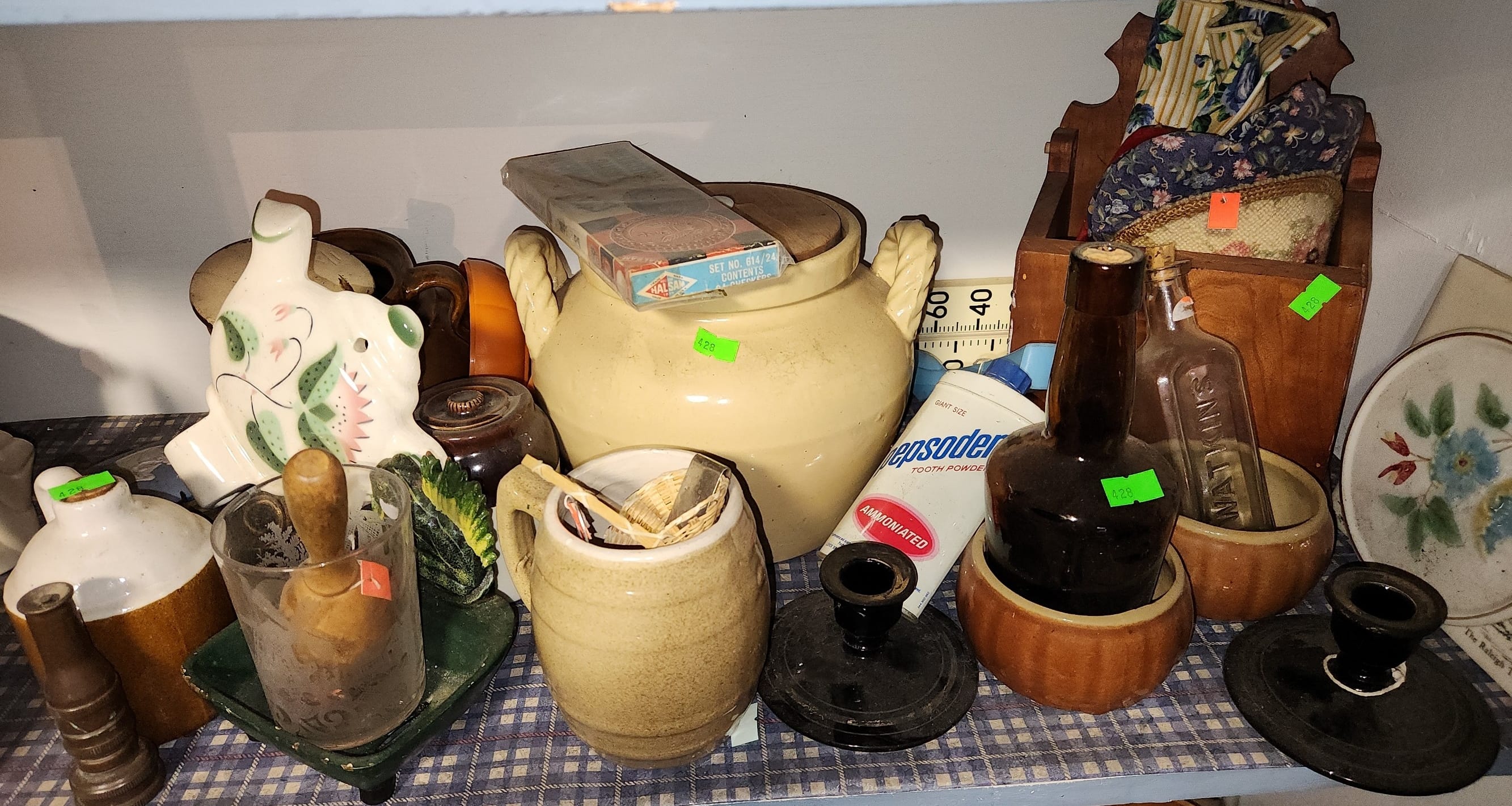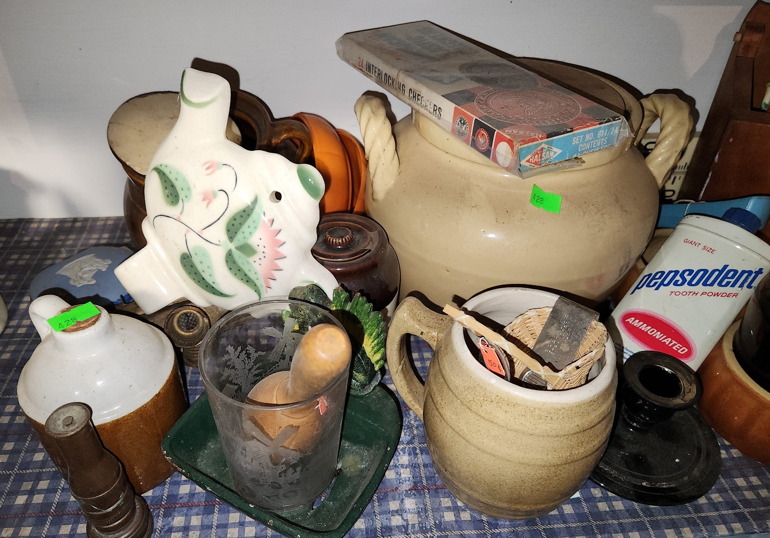 428 Crock jars and mug, bottles, trivets, candle holders, porcelain string holder, miscellaneous
