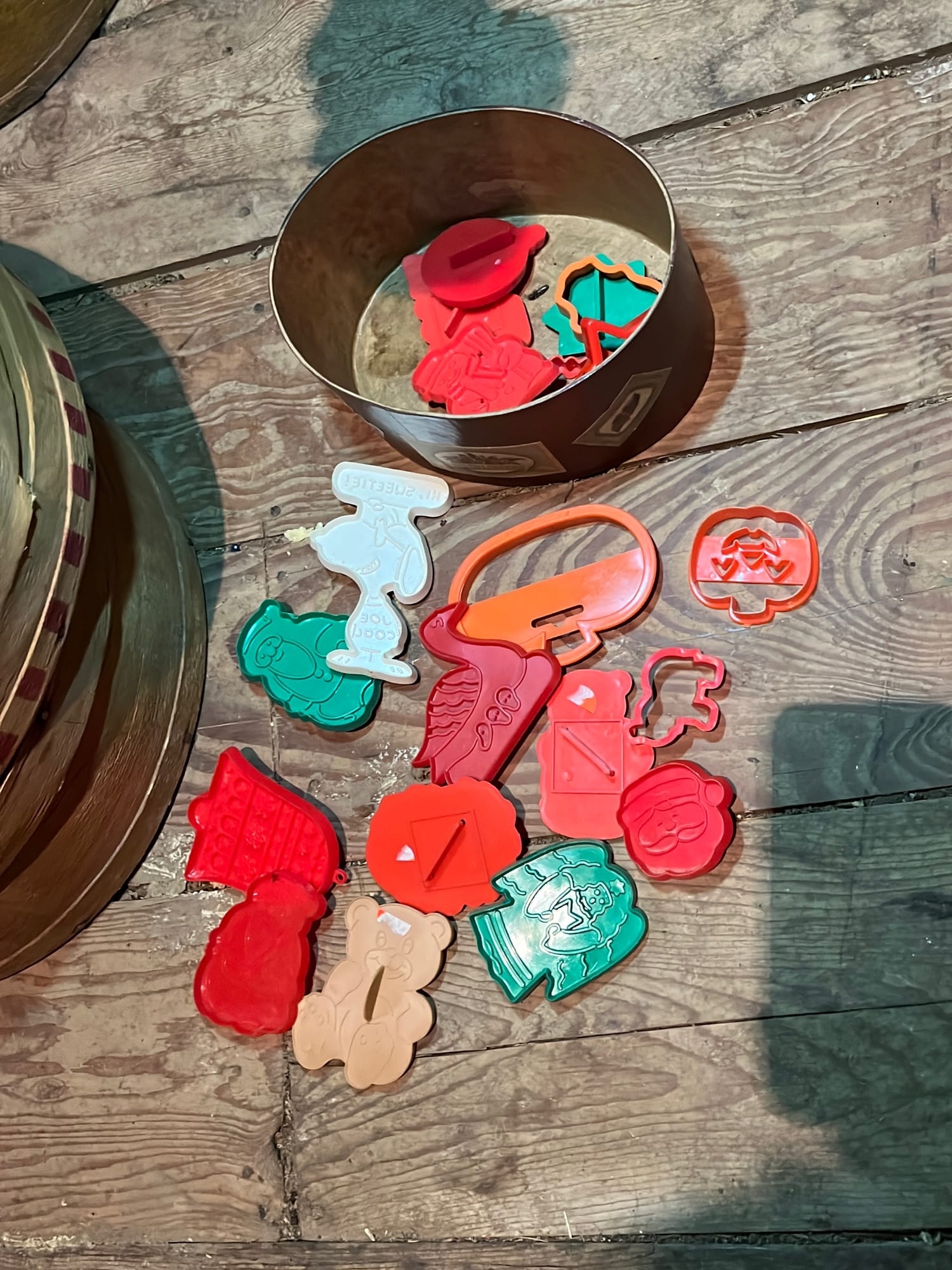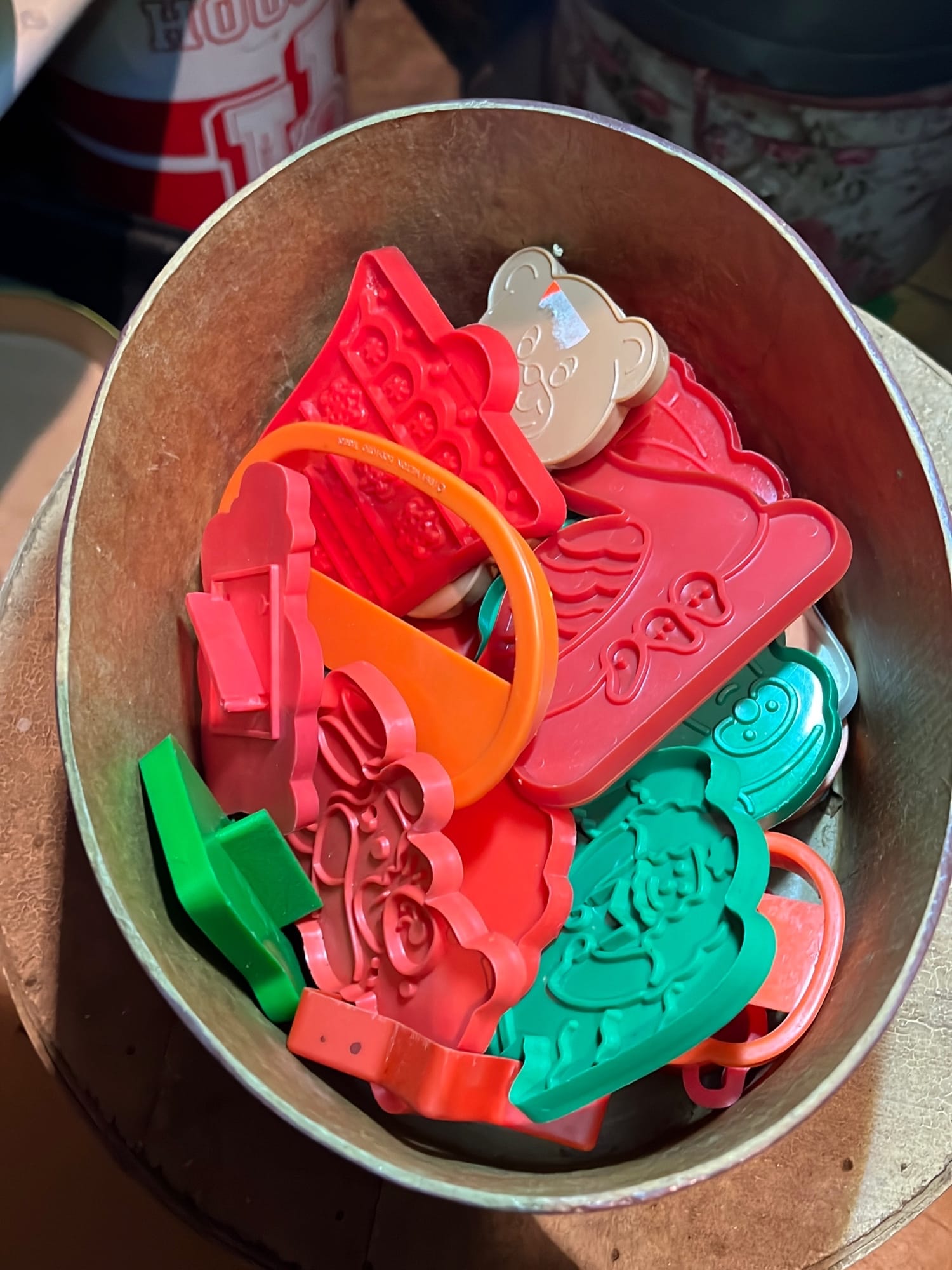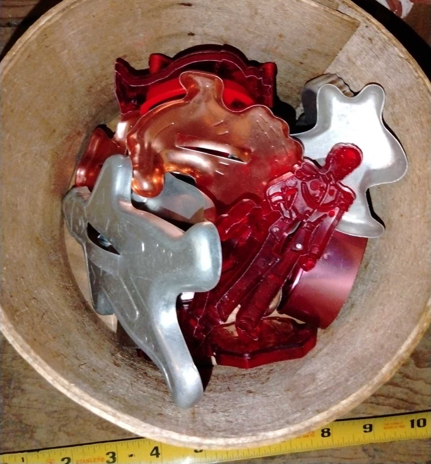 443 Christmas decor, hand saw, cookie stamp, pie pans, tree