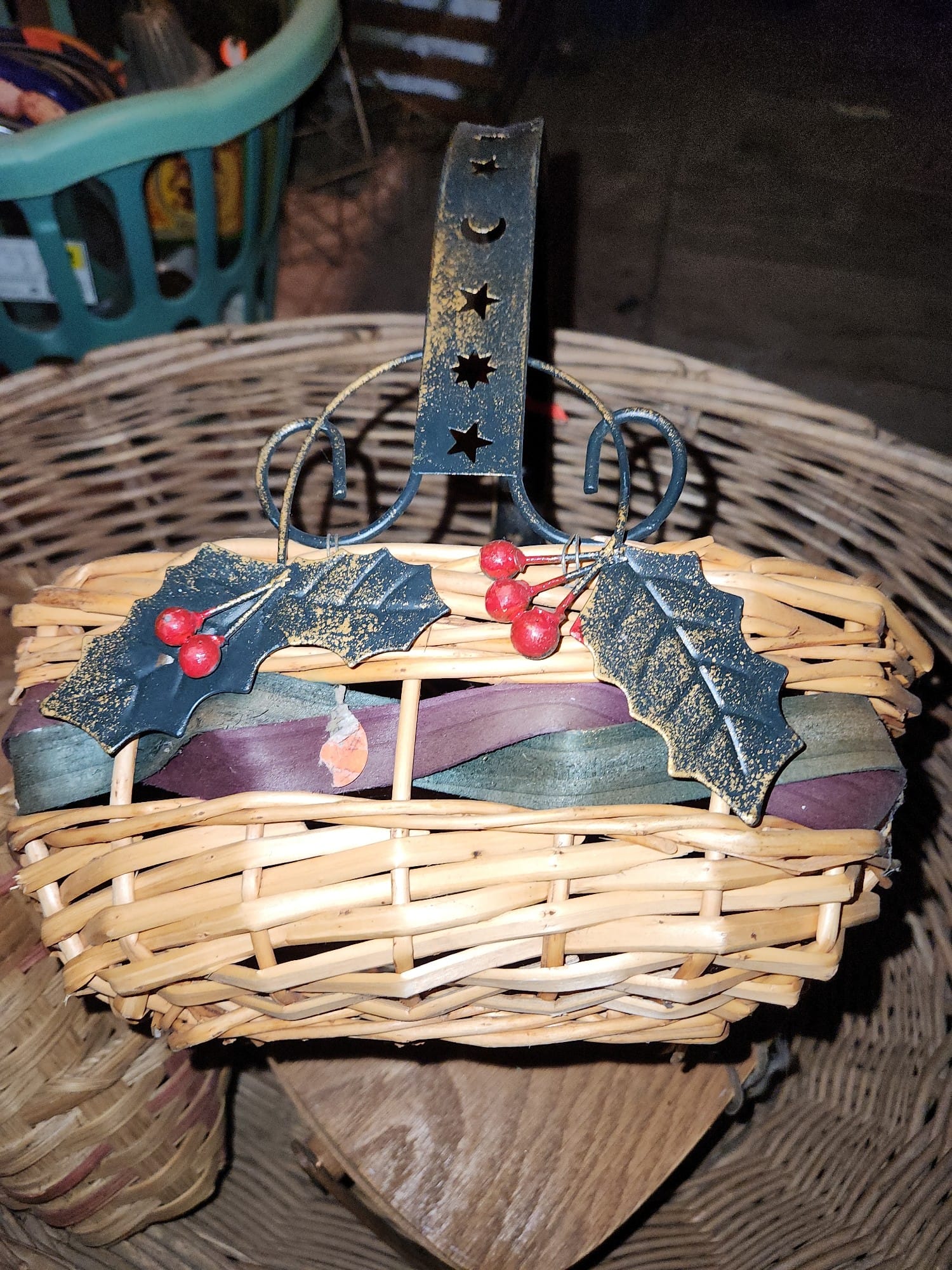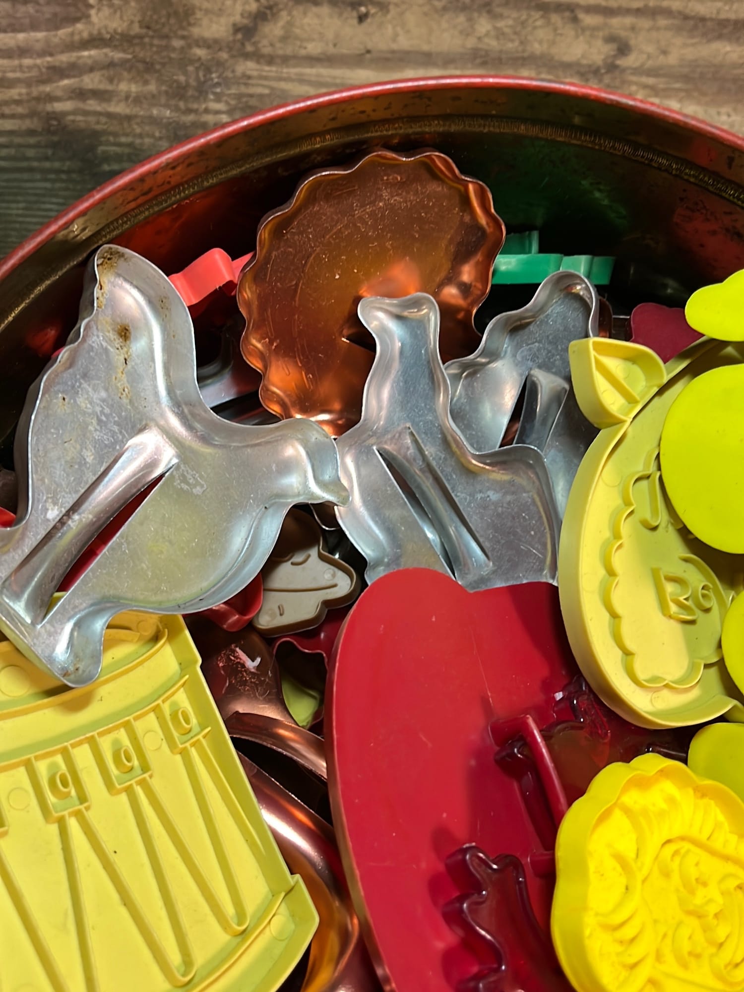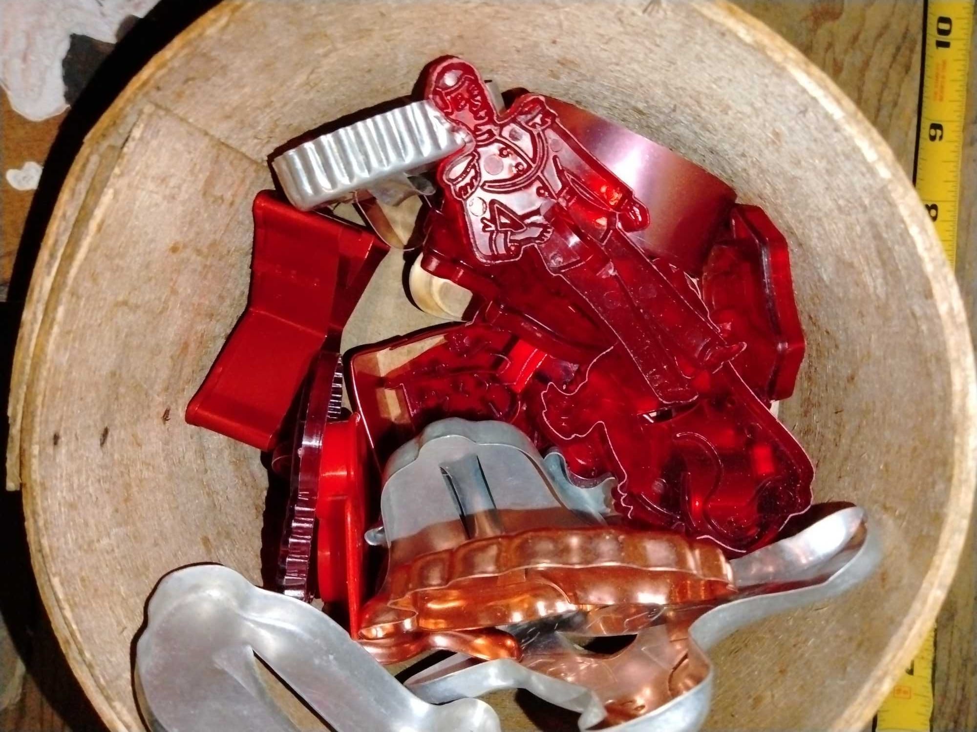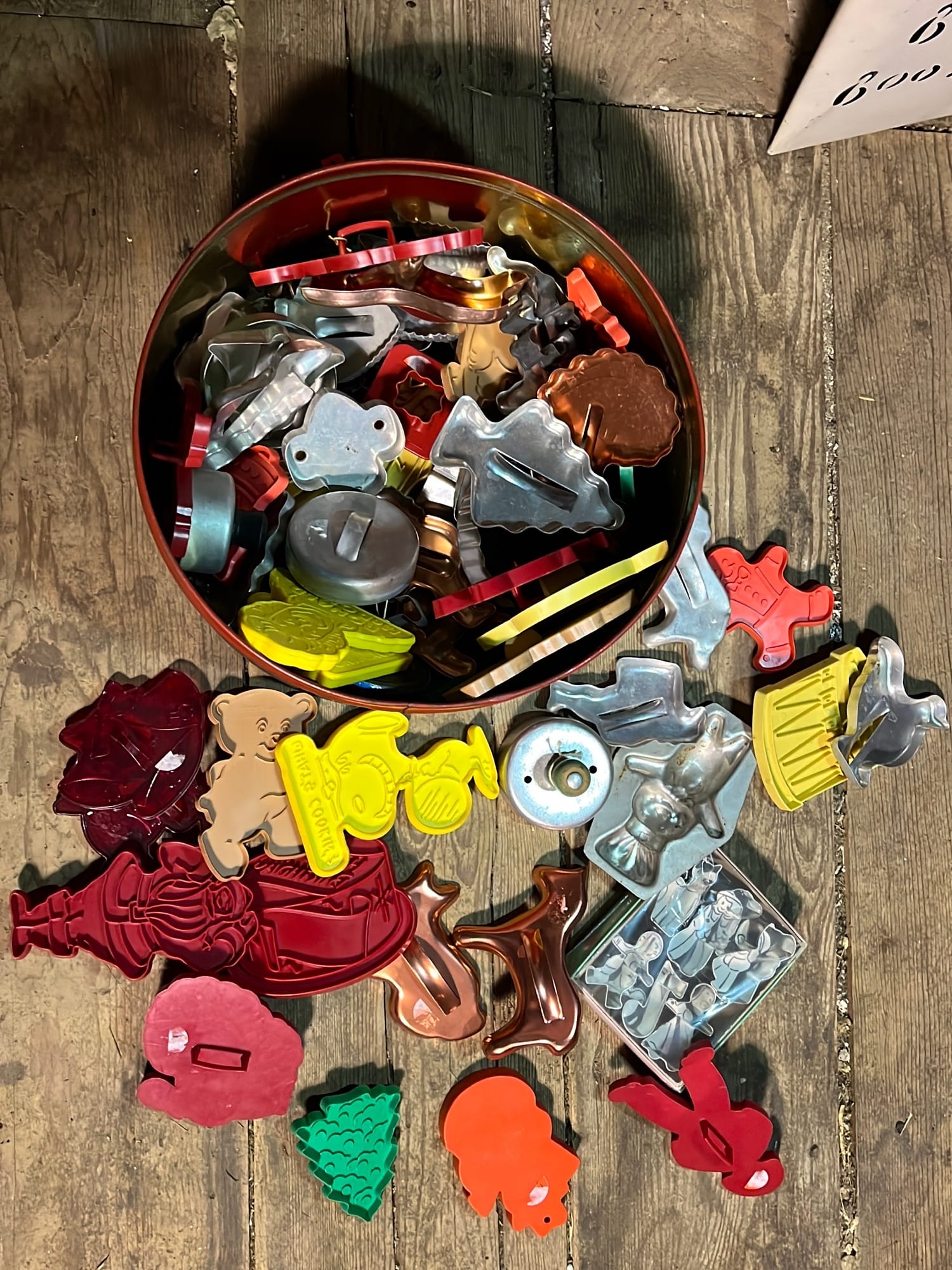 443 Christmas decor, hand saw, cookie stamp, pie pans, tree