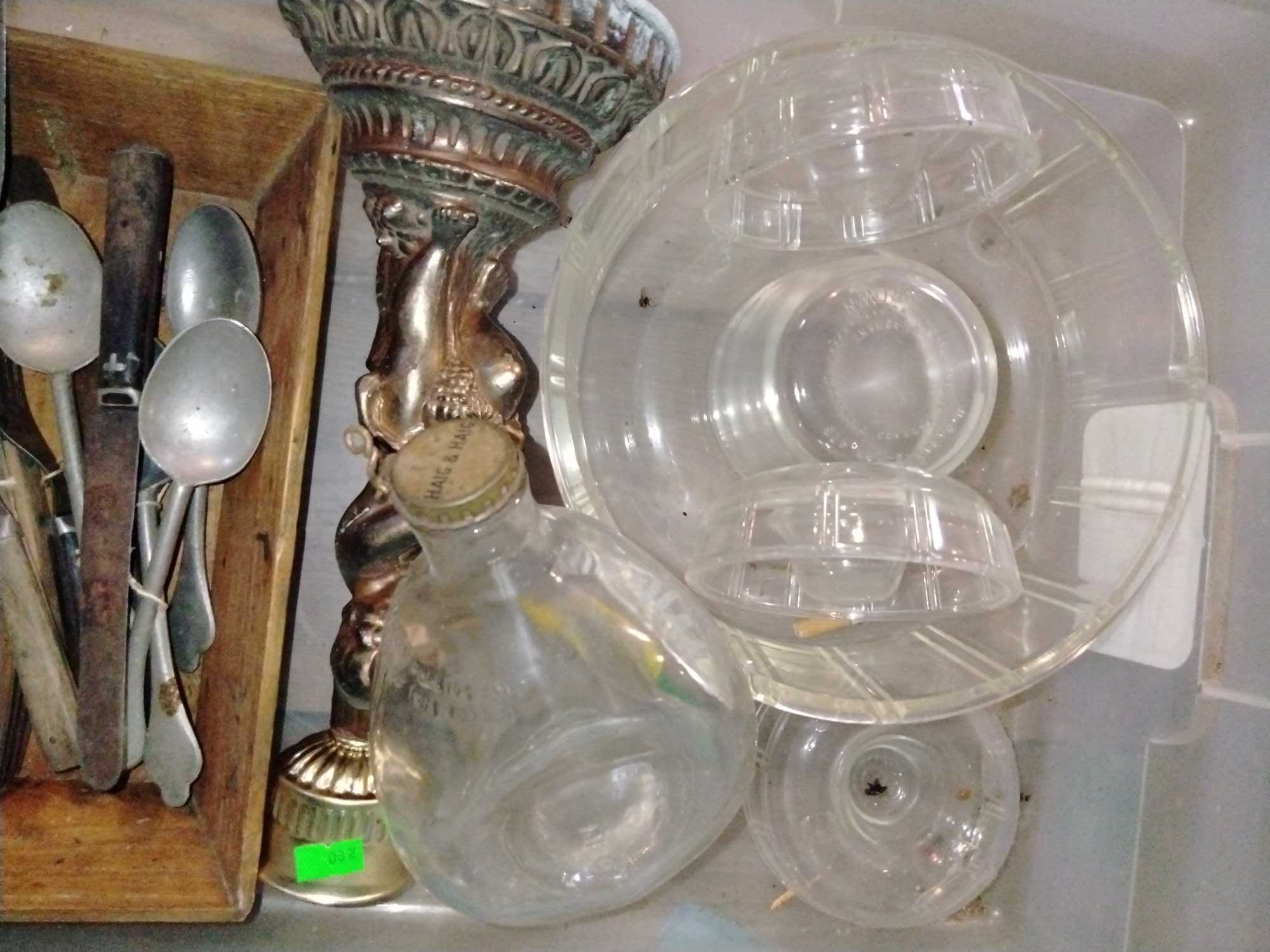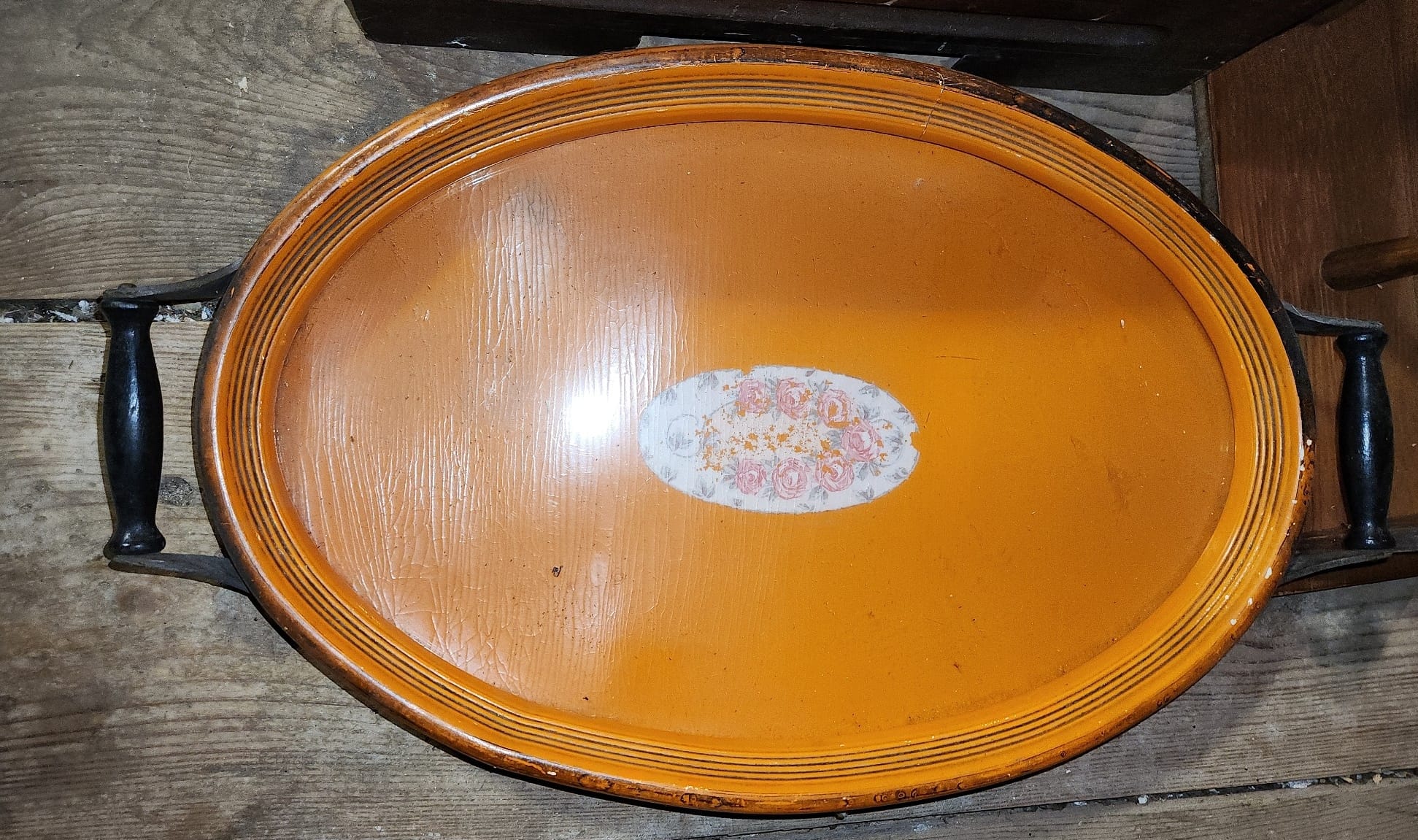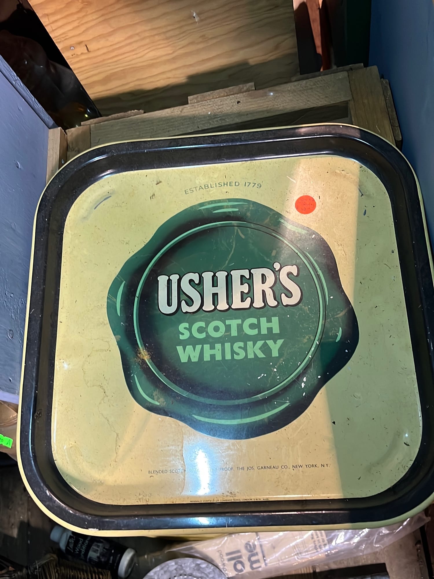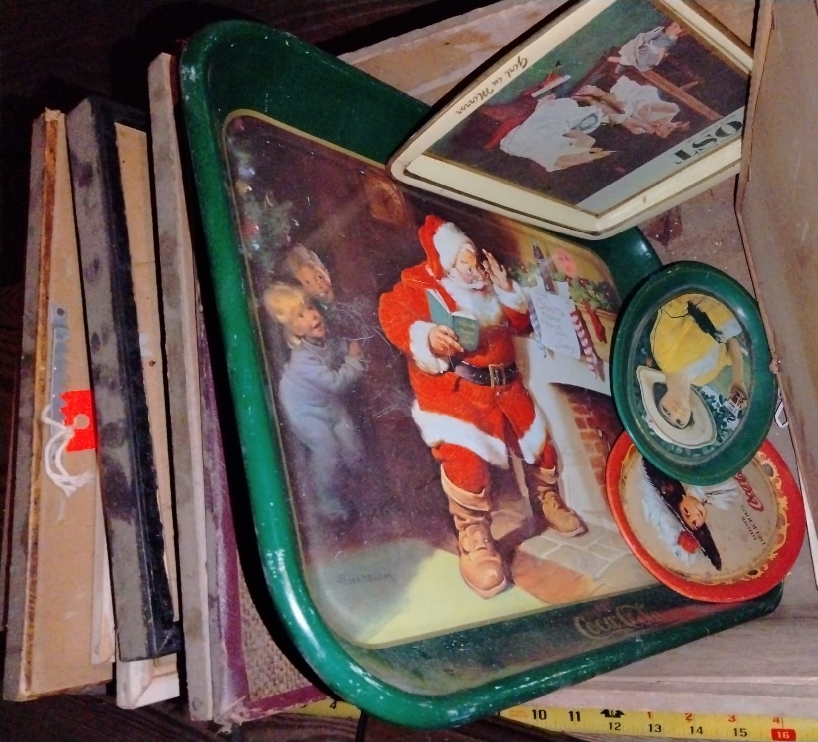 425 Coca-Cola tray, Ushers Whiskey tray, metal ladle and sieve, basket, scroll frame, Lamp with red glass shade, wood box and drawer