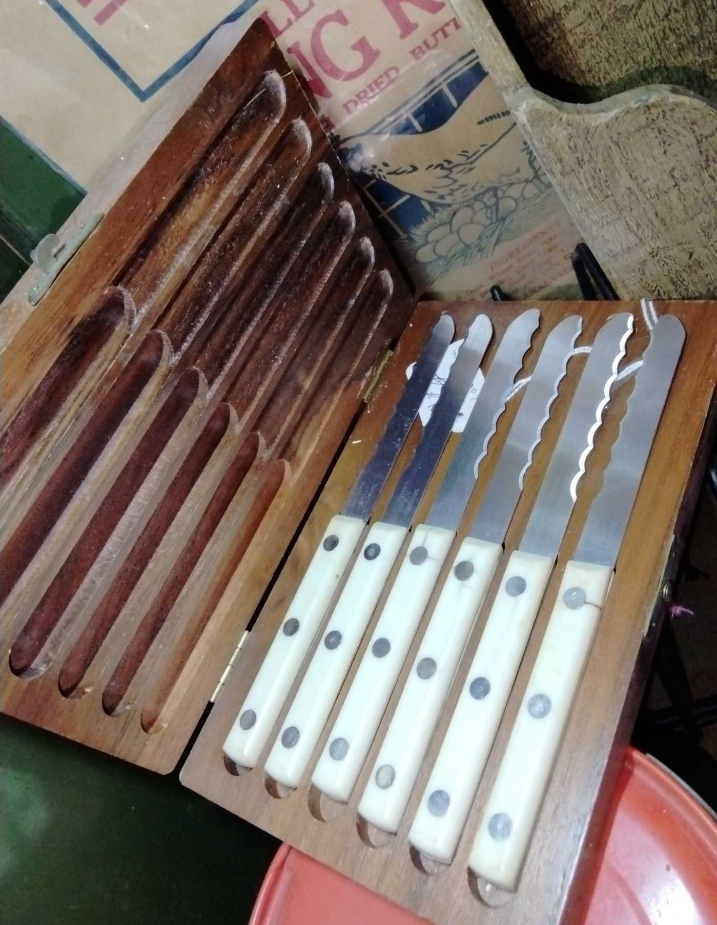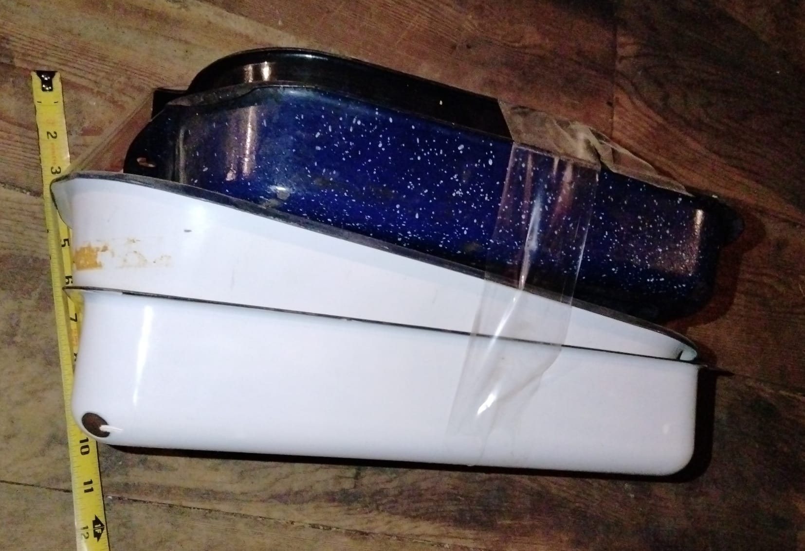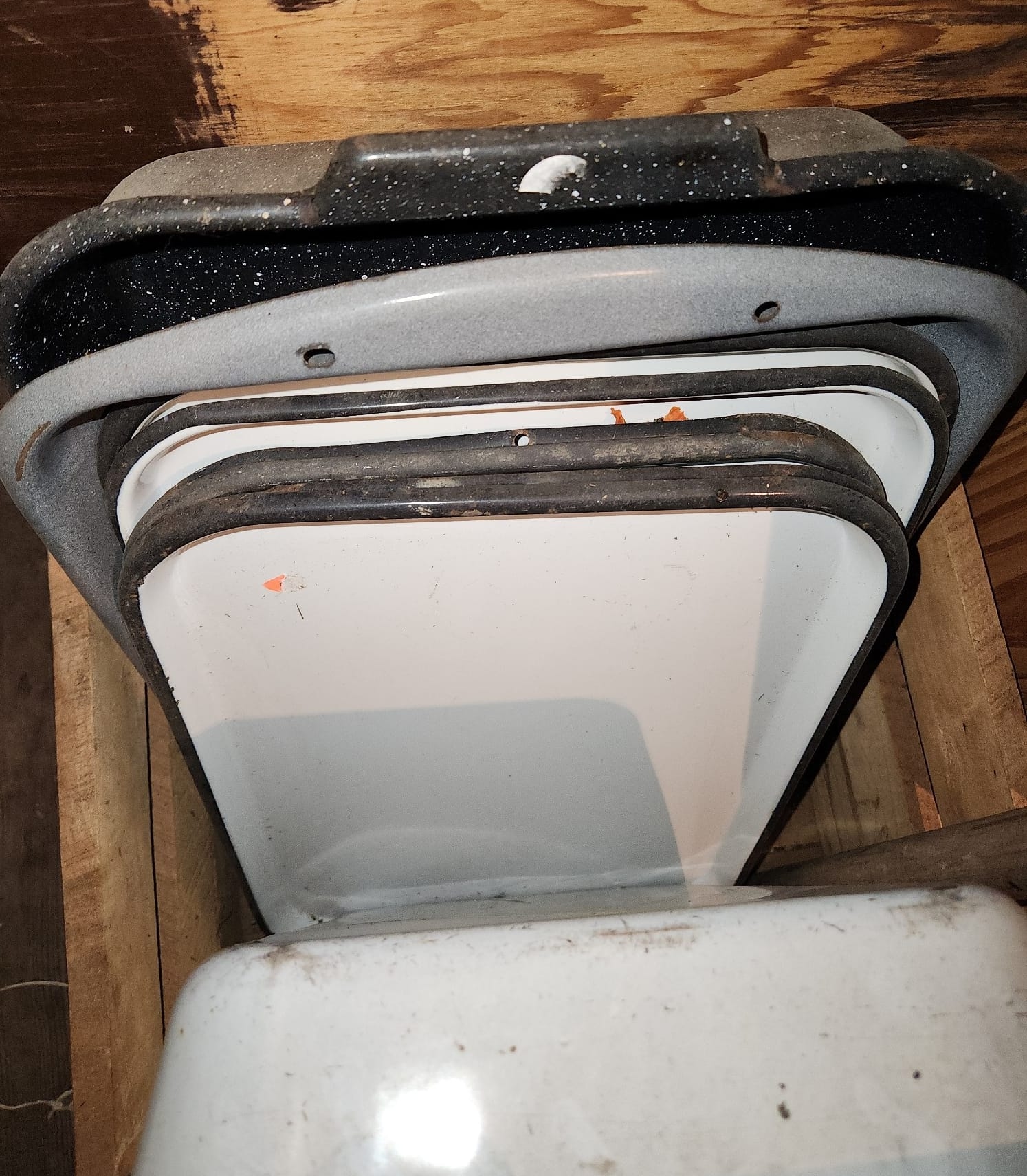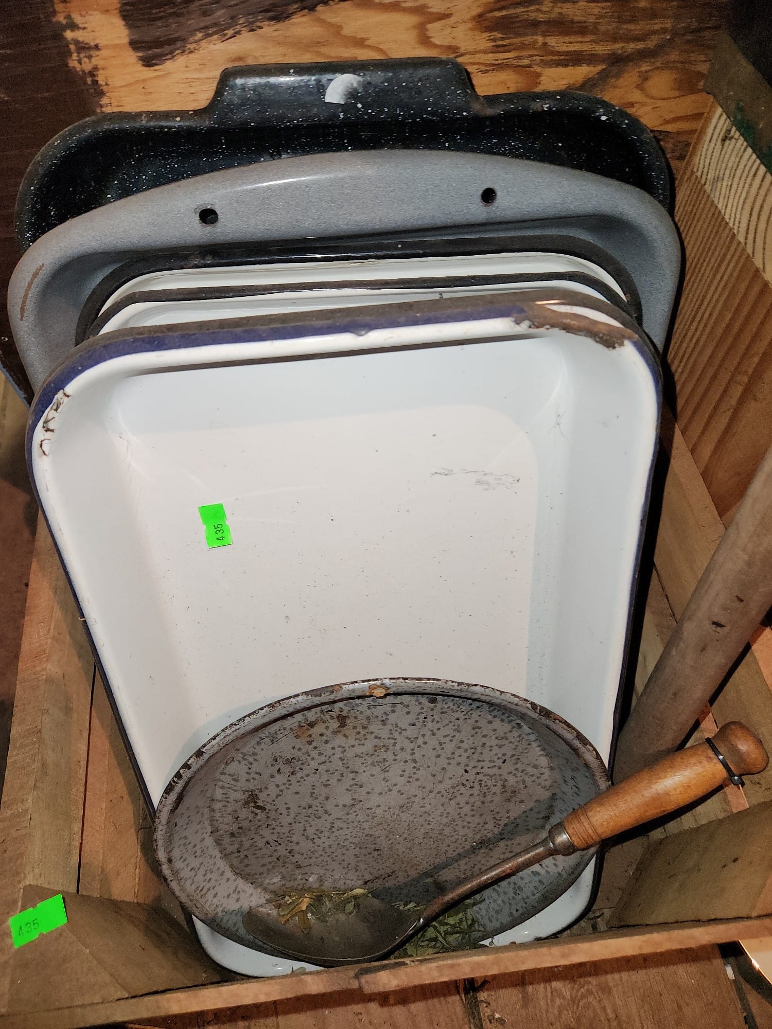 435 Enamel baking pan assortment, spoon, edger, wood crate