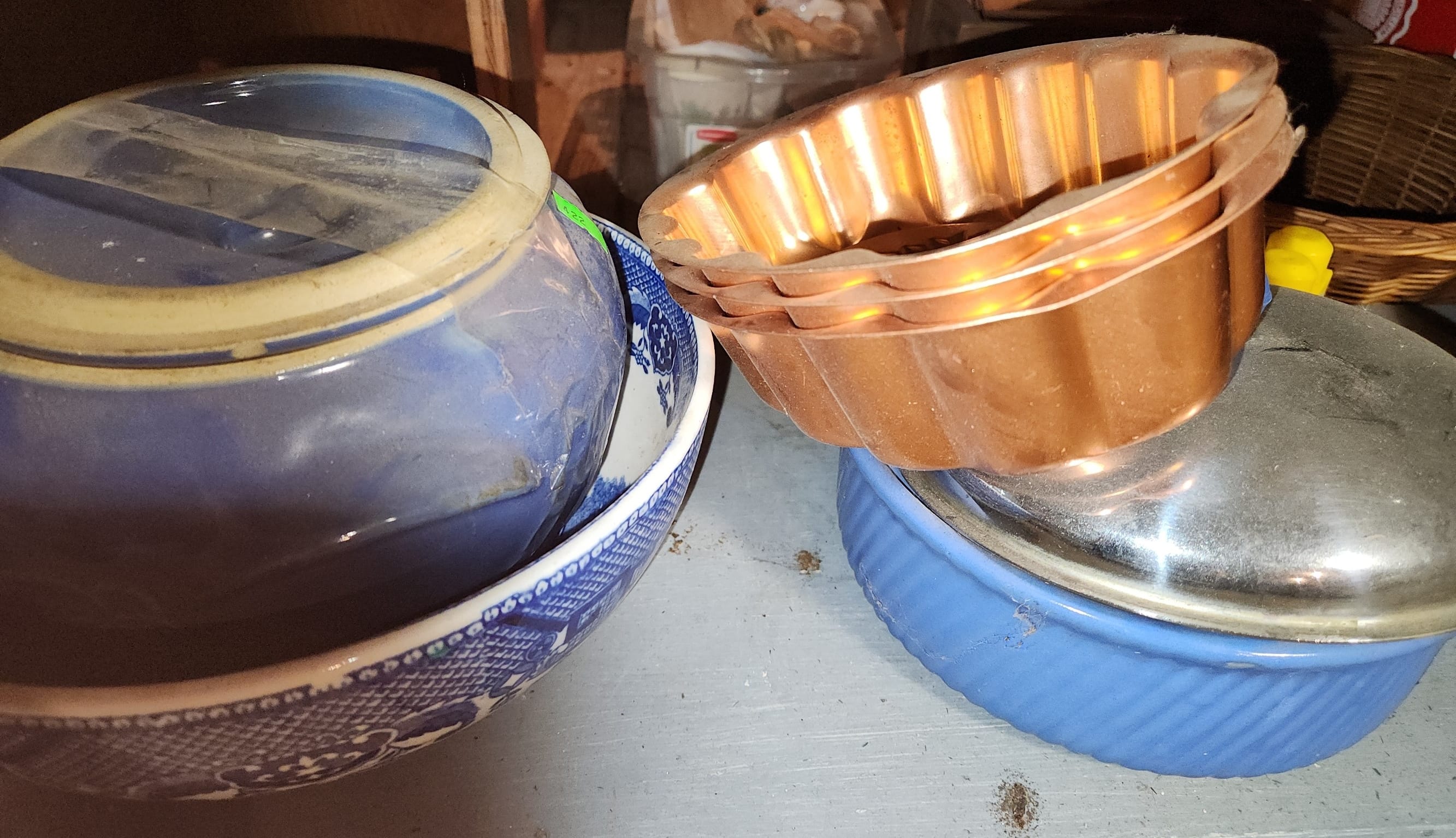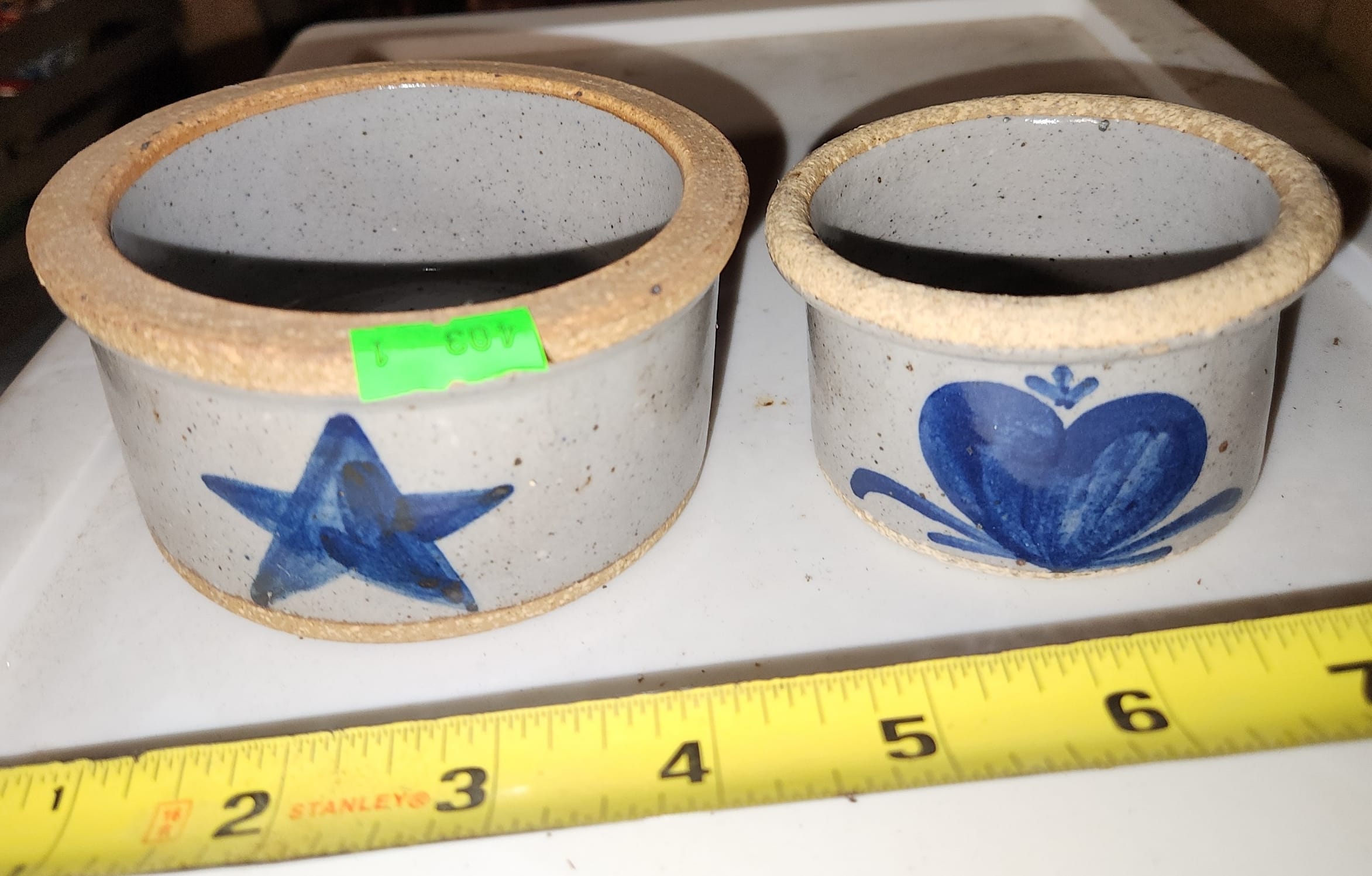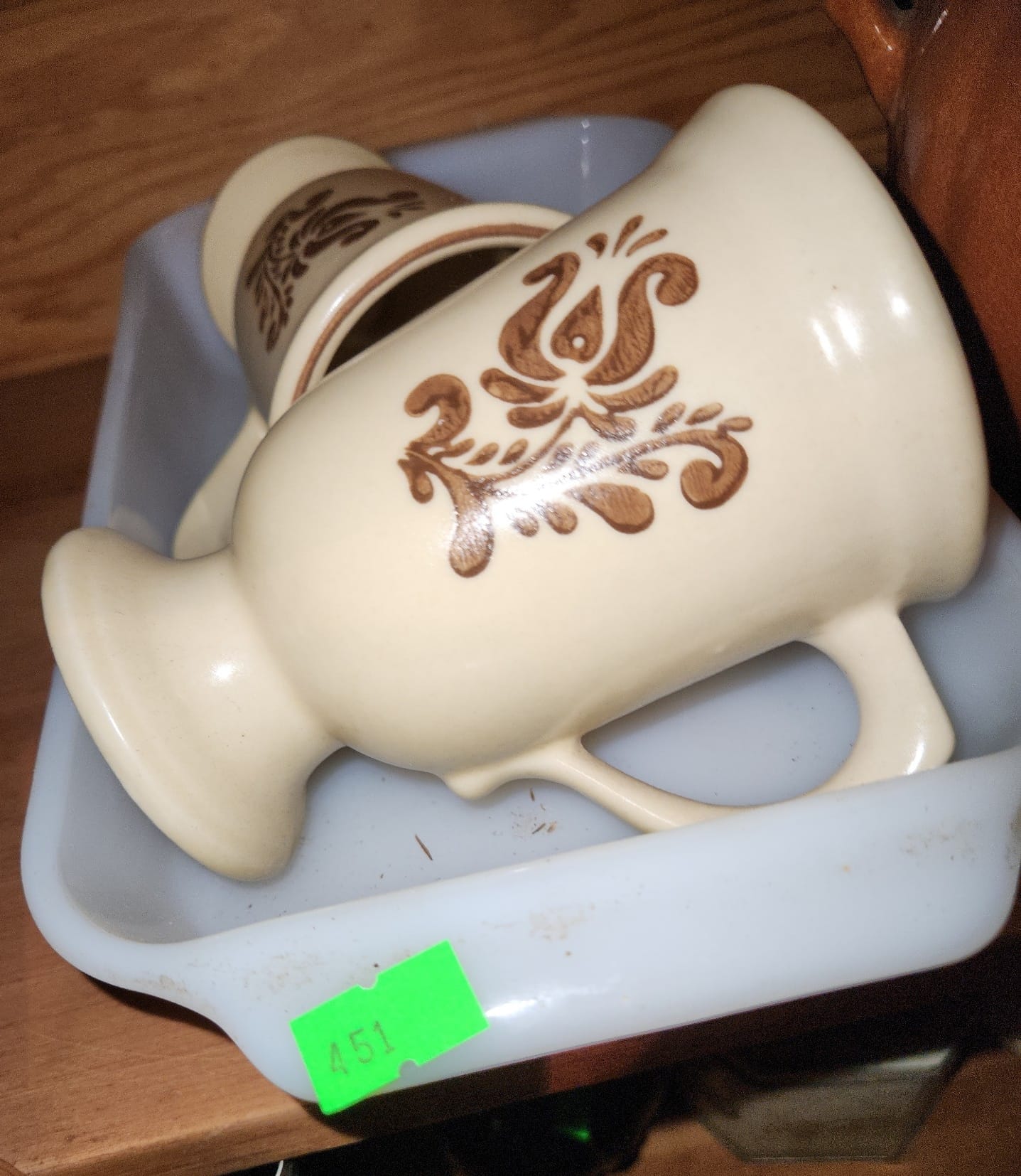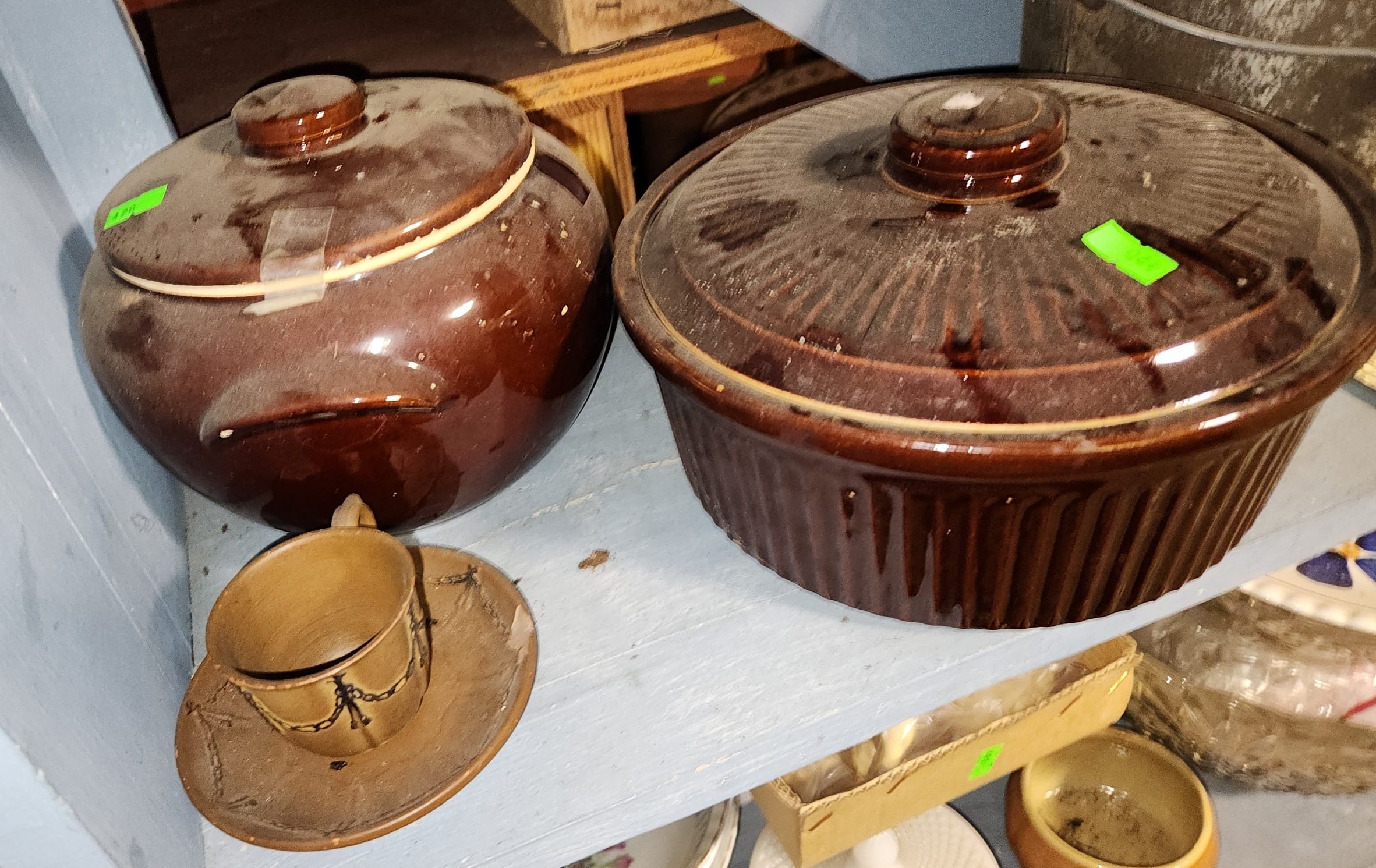 422 Crock covered dish, serving bowl, Roseville crock, porcelain creamer, jello molds, crock dish