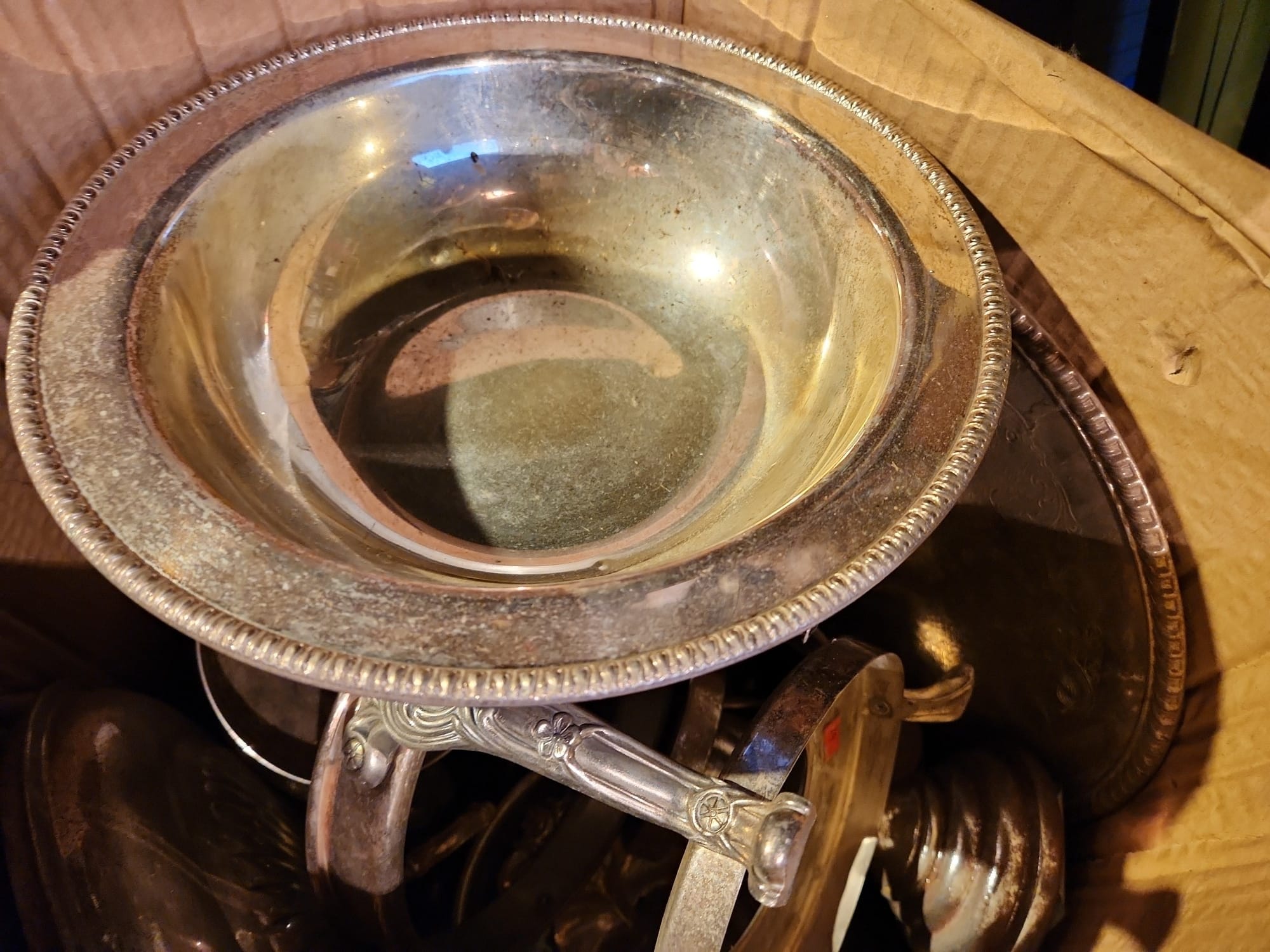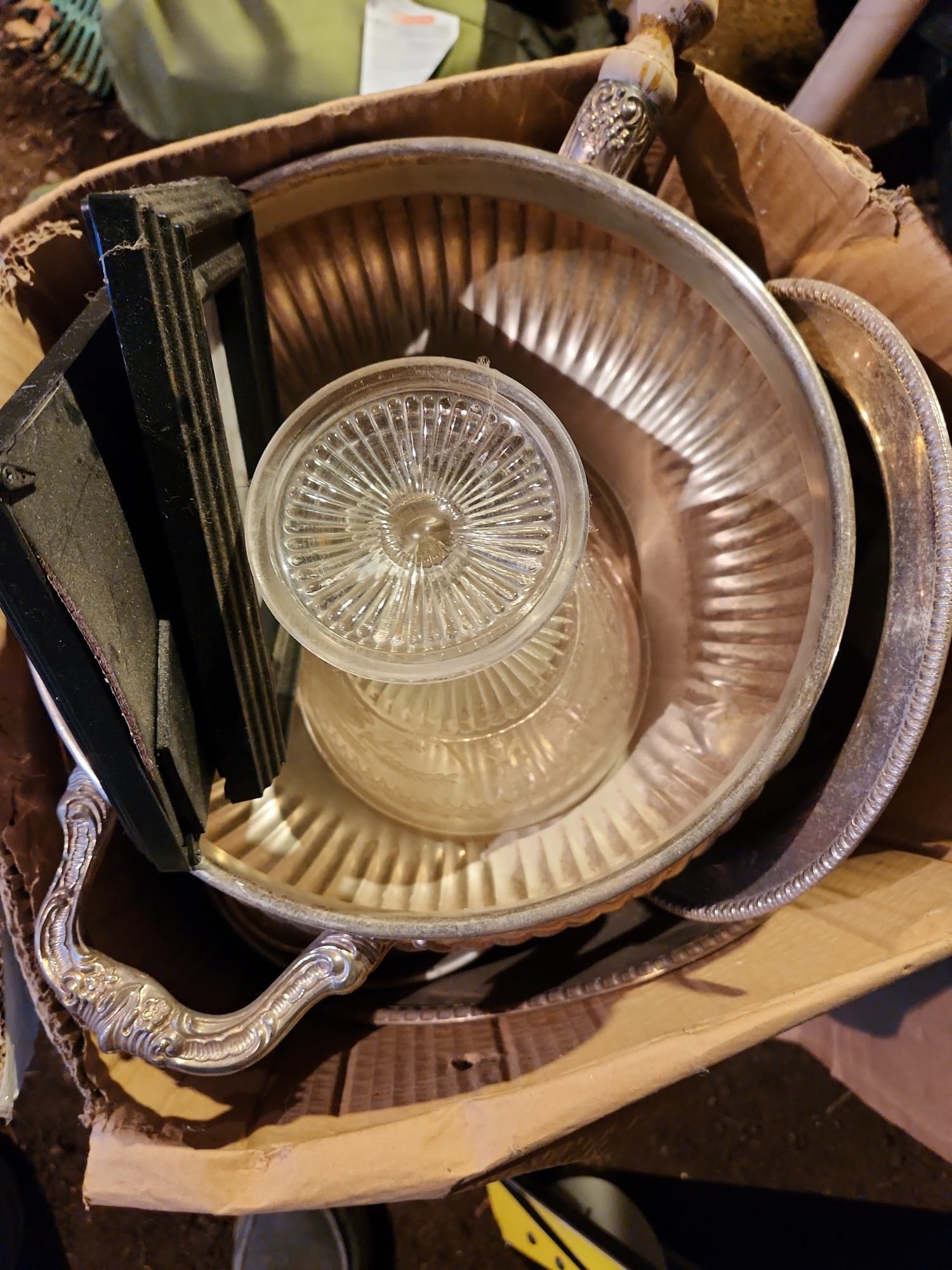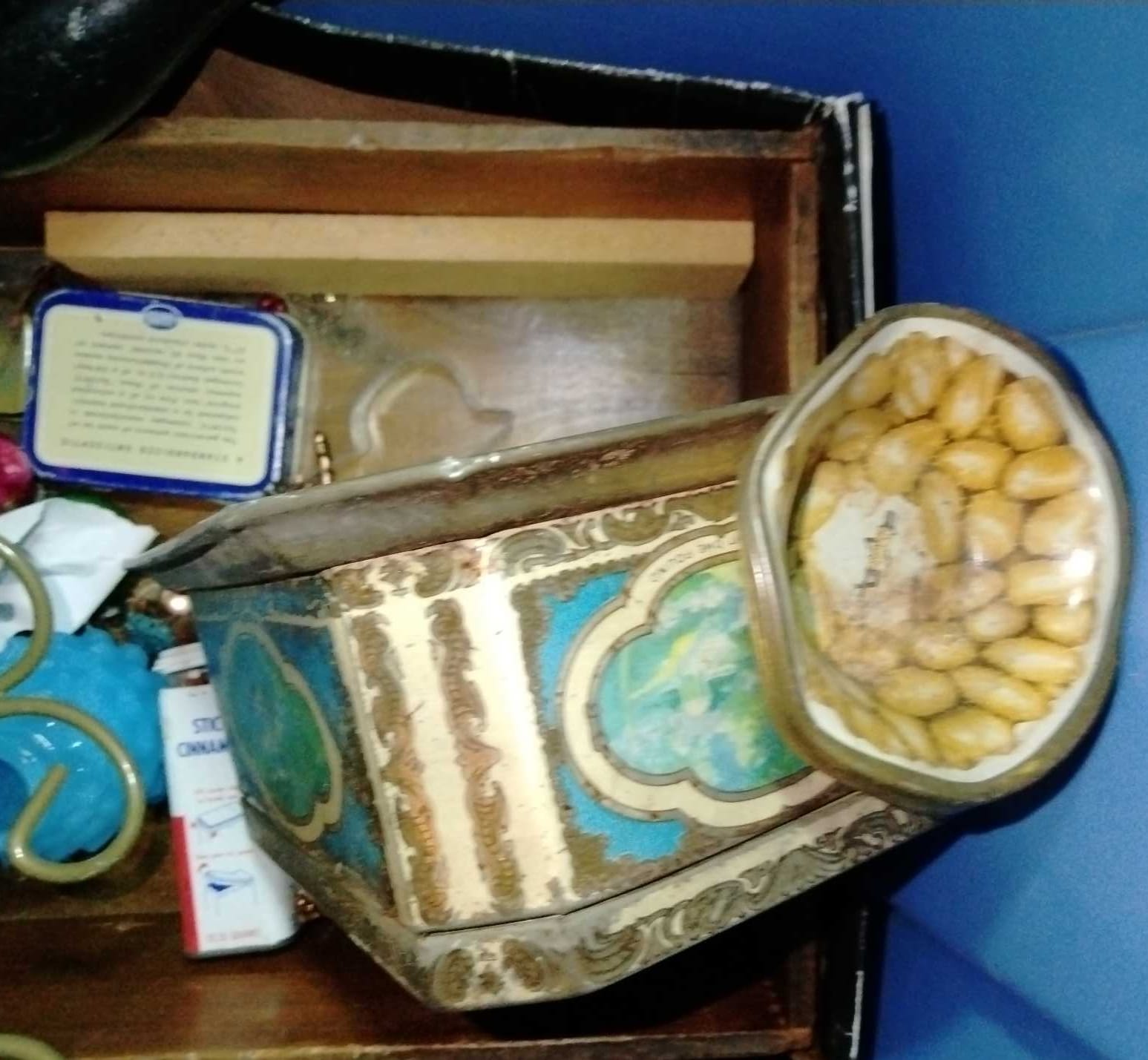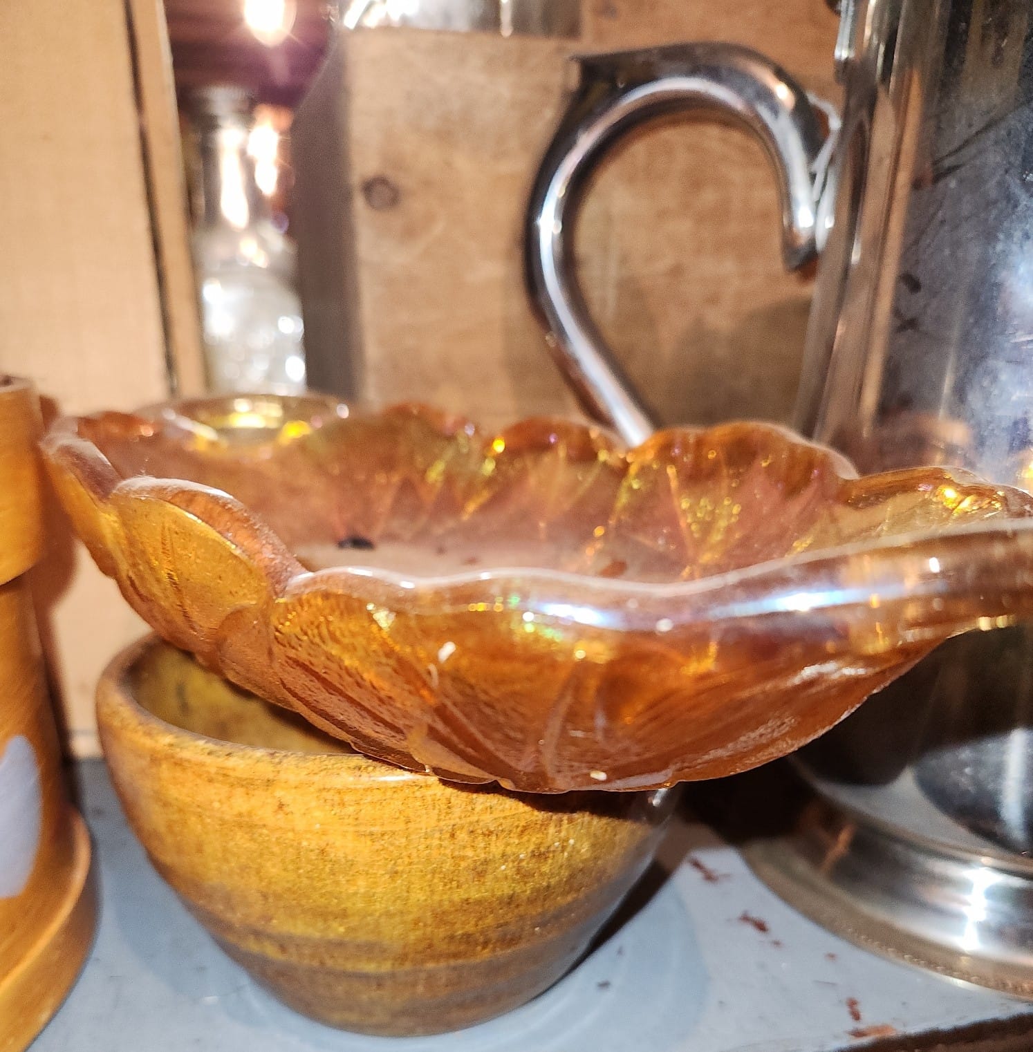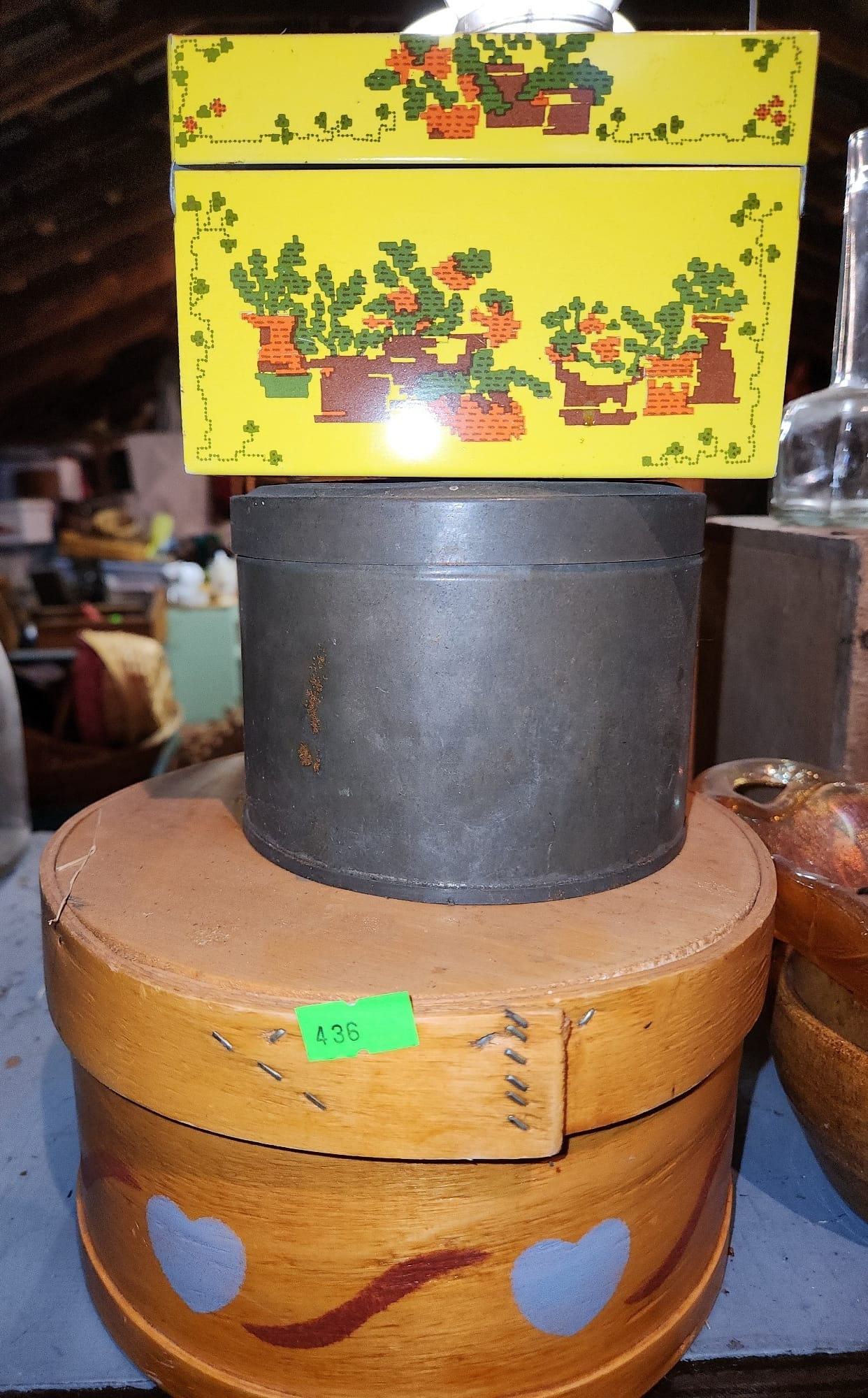 436 Cheese box, tin, metal recipe box, carnival glass dish, pottery bowl, stainless steel coffee pot, cigar box and cedar box
