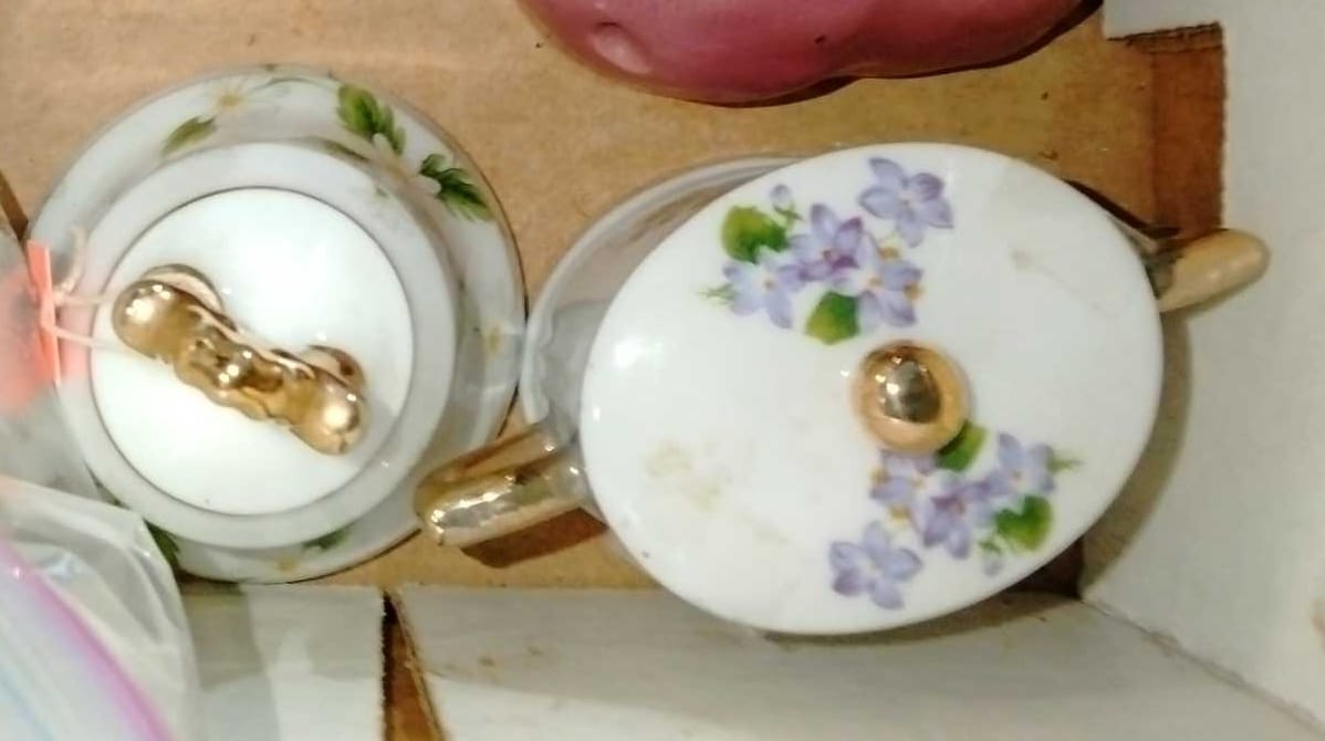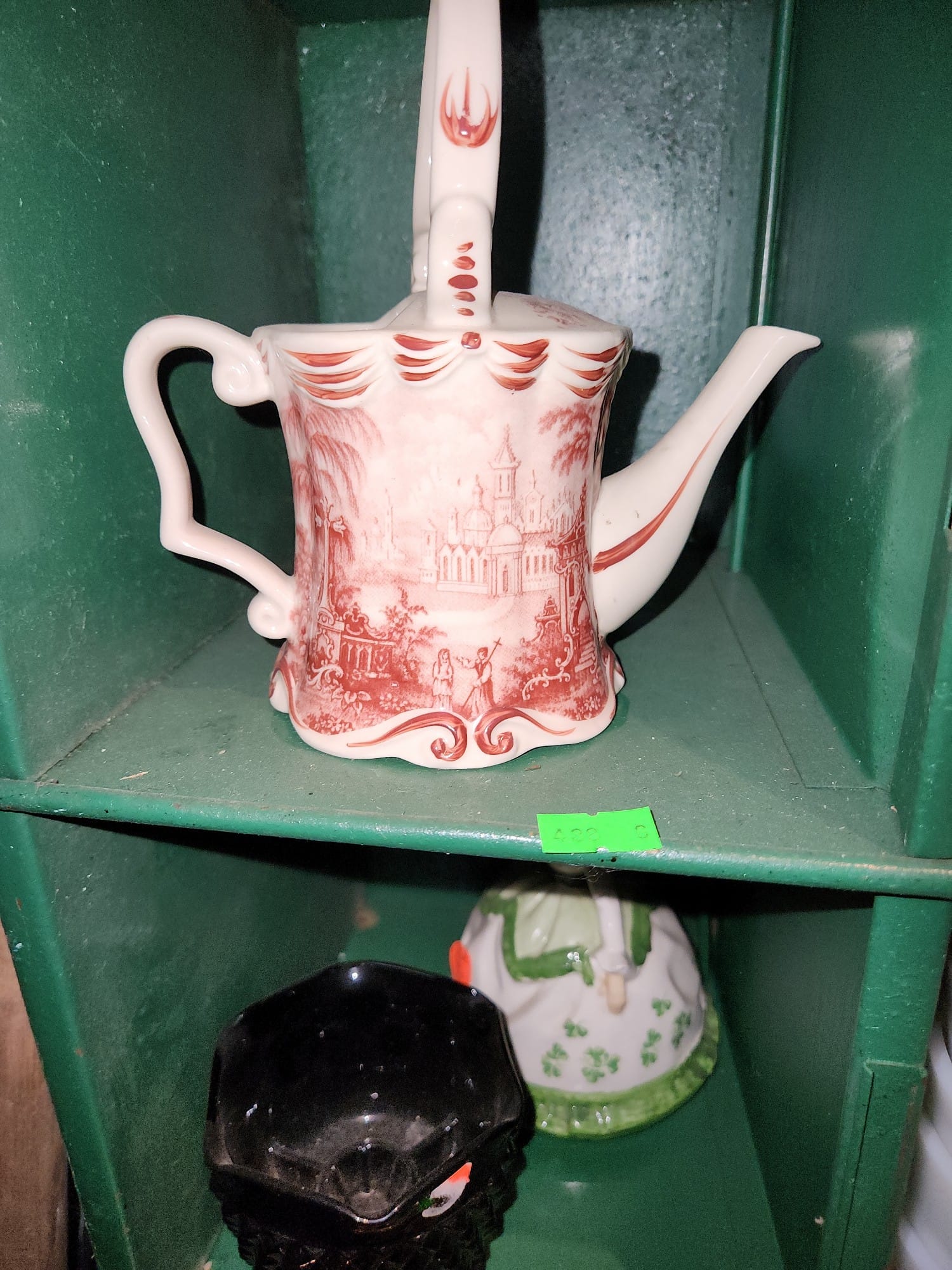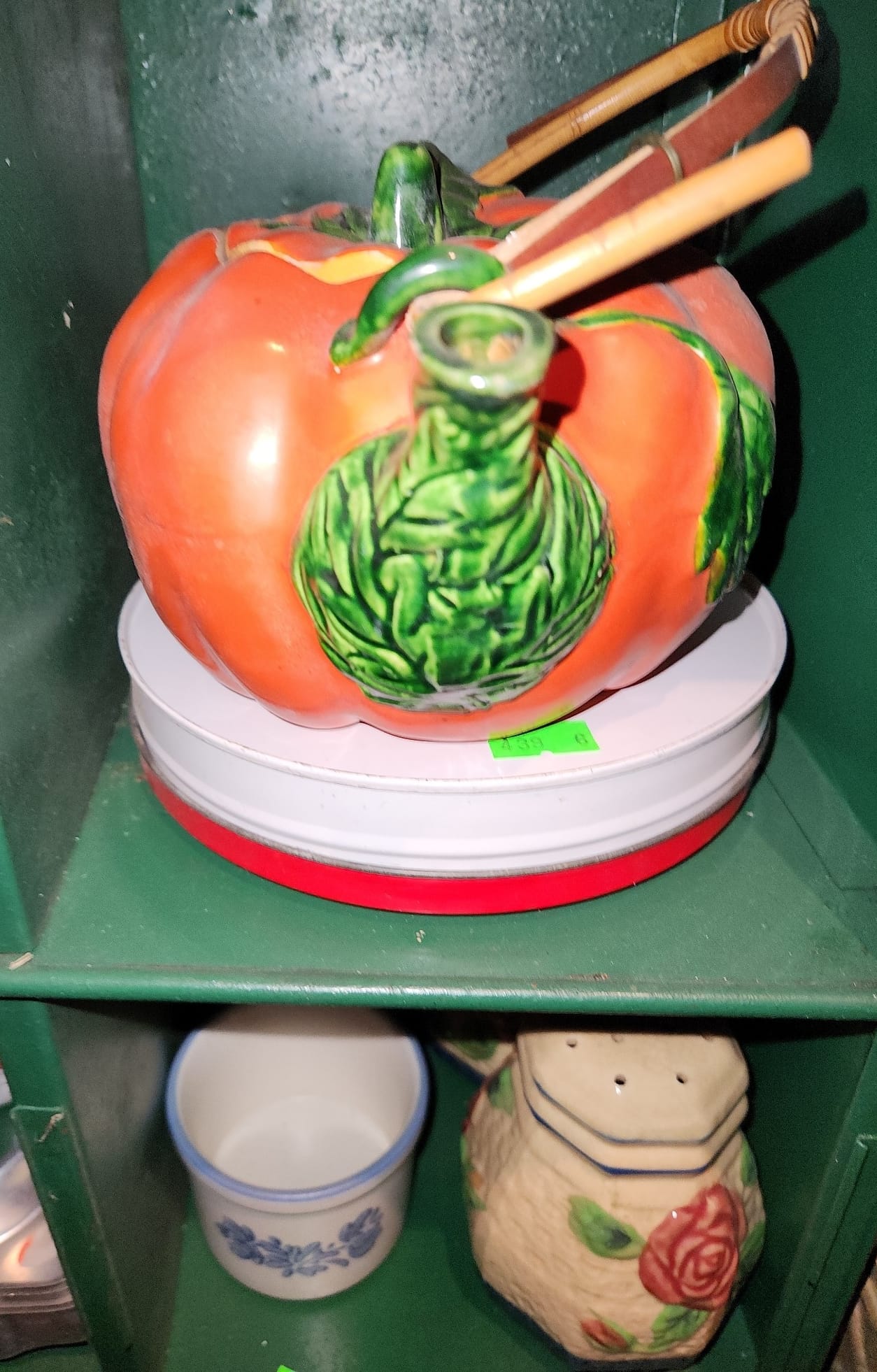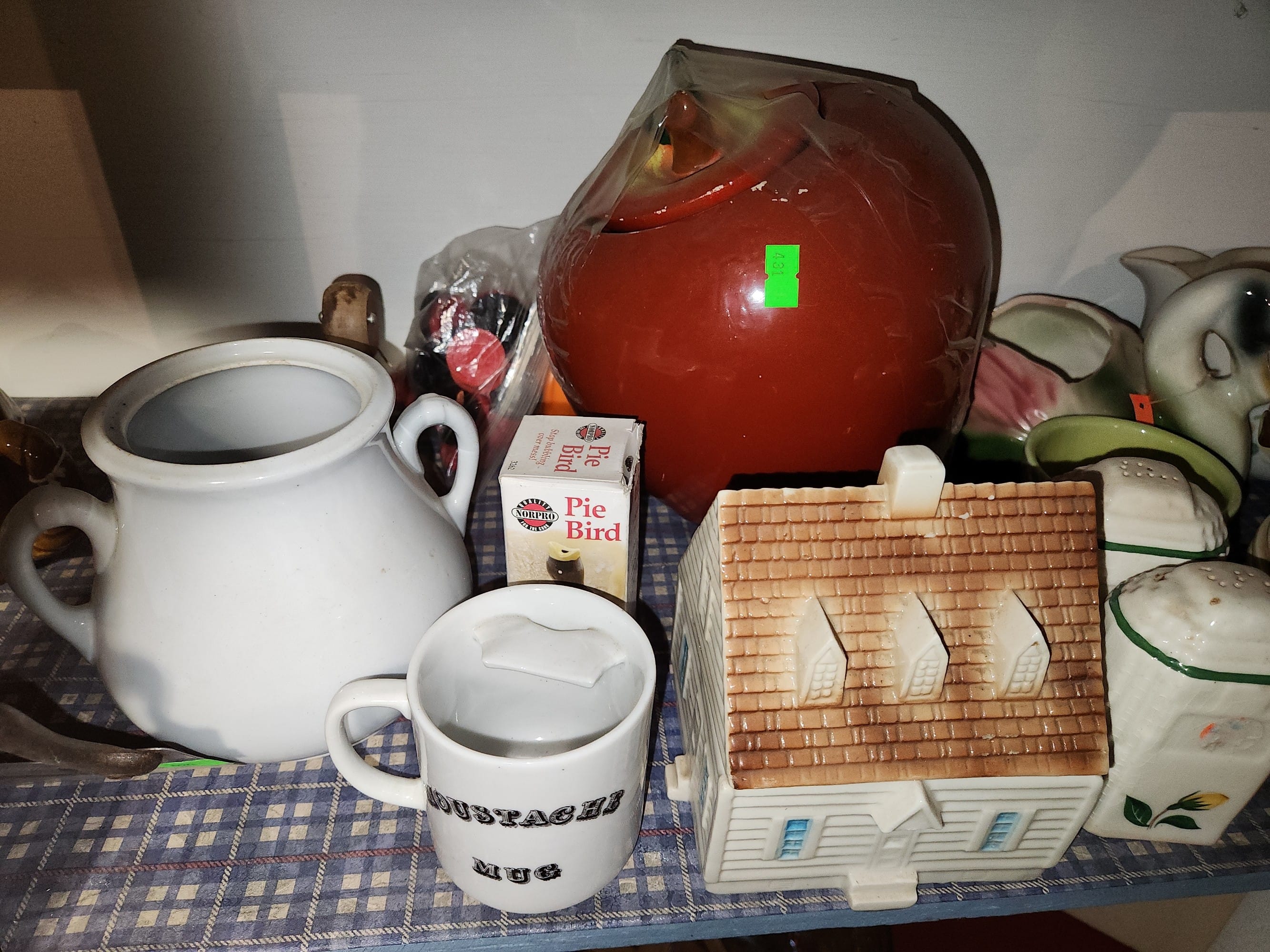 439 Maruhon teapot, toothpick holders, Lefton Creamer, Pfaltzgraff ramekin, salt and pepper shakers, planter, recipe box, sifter