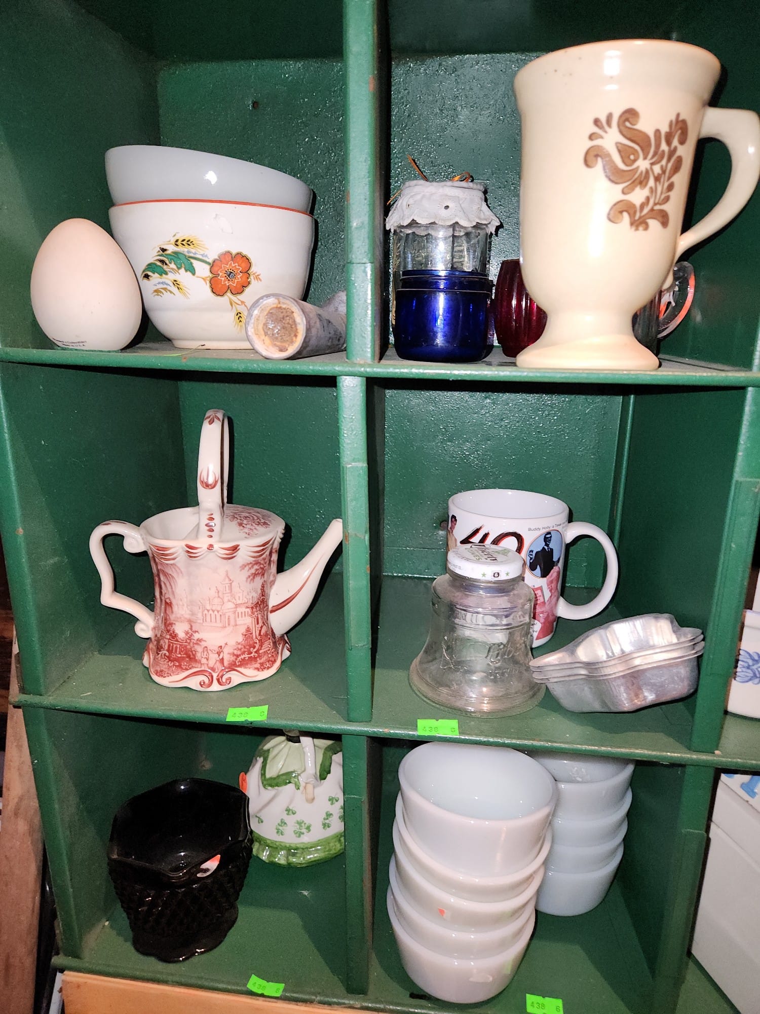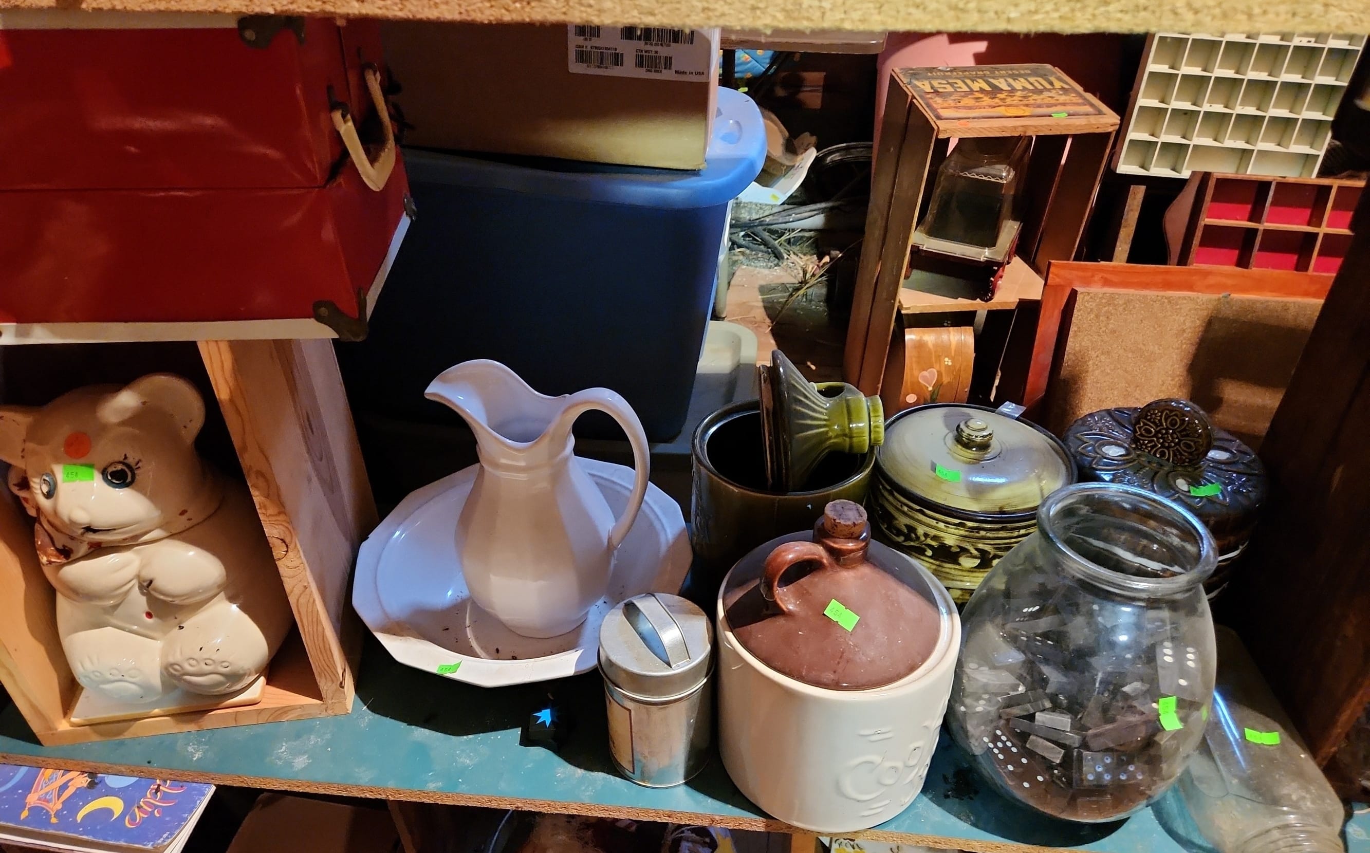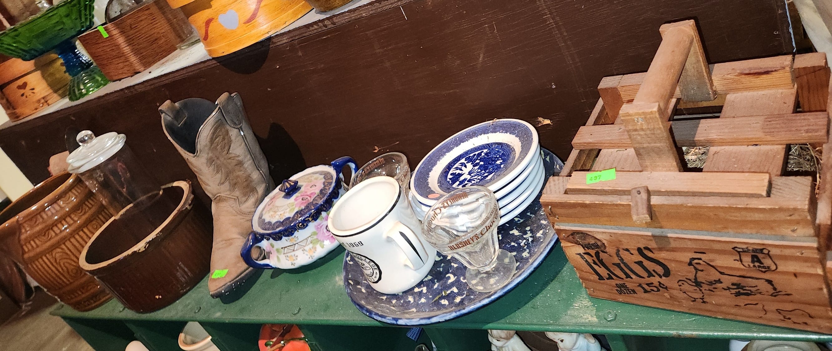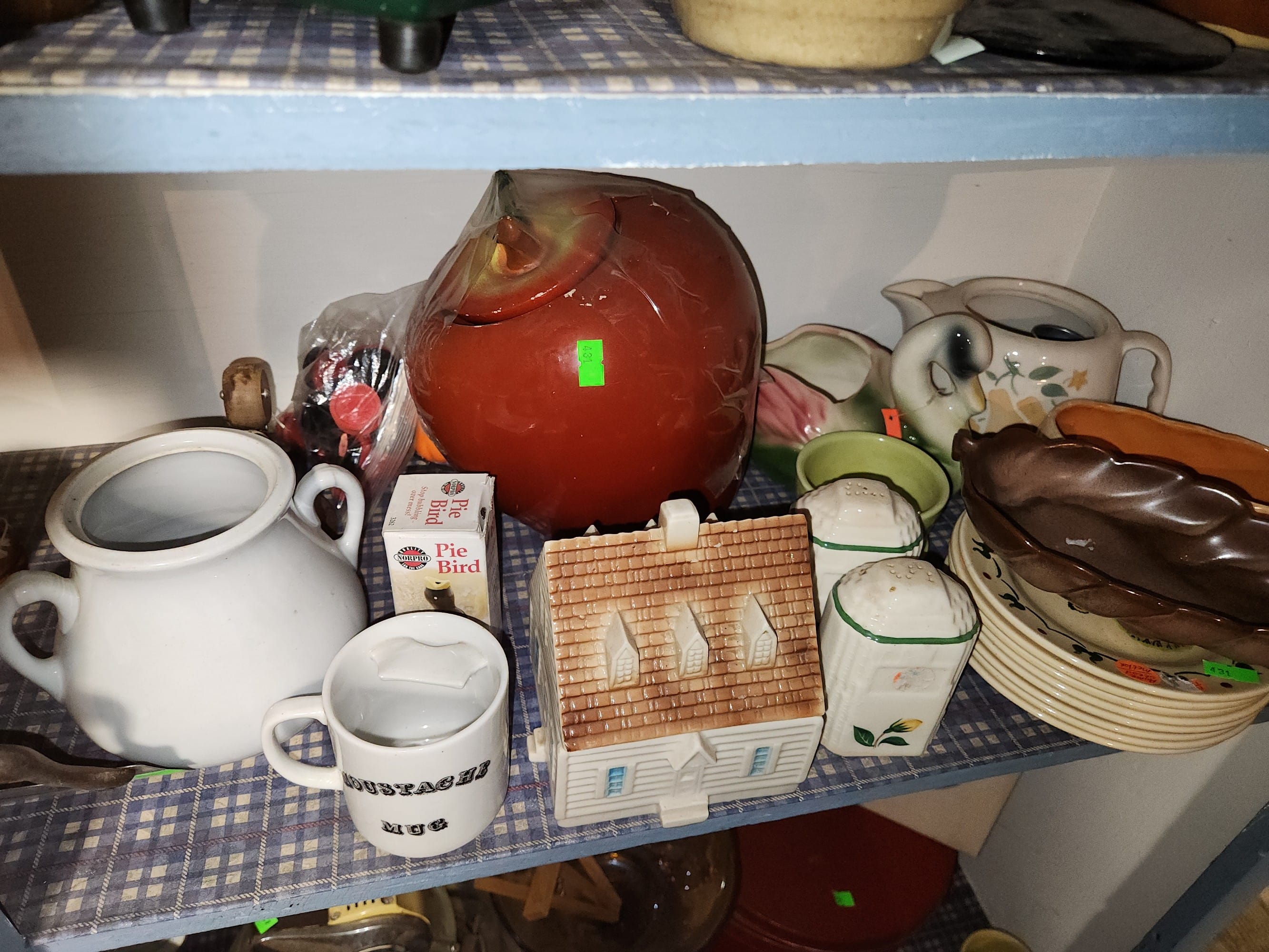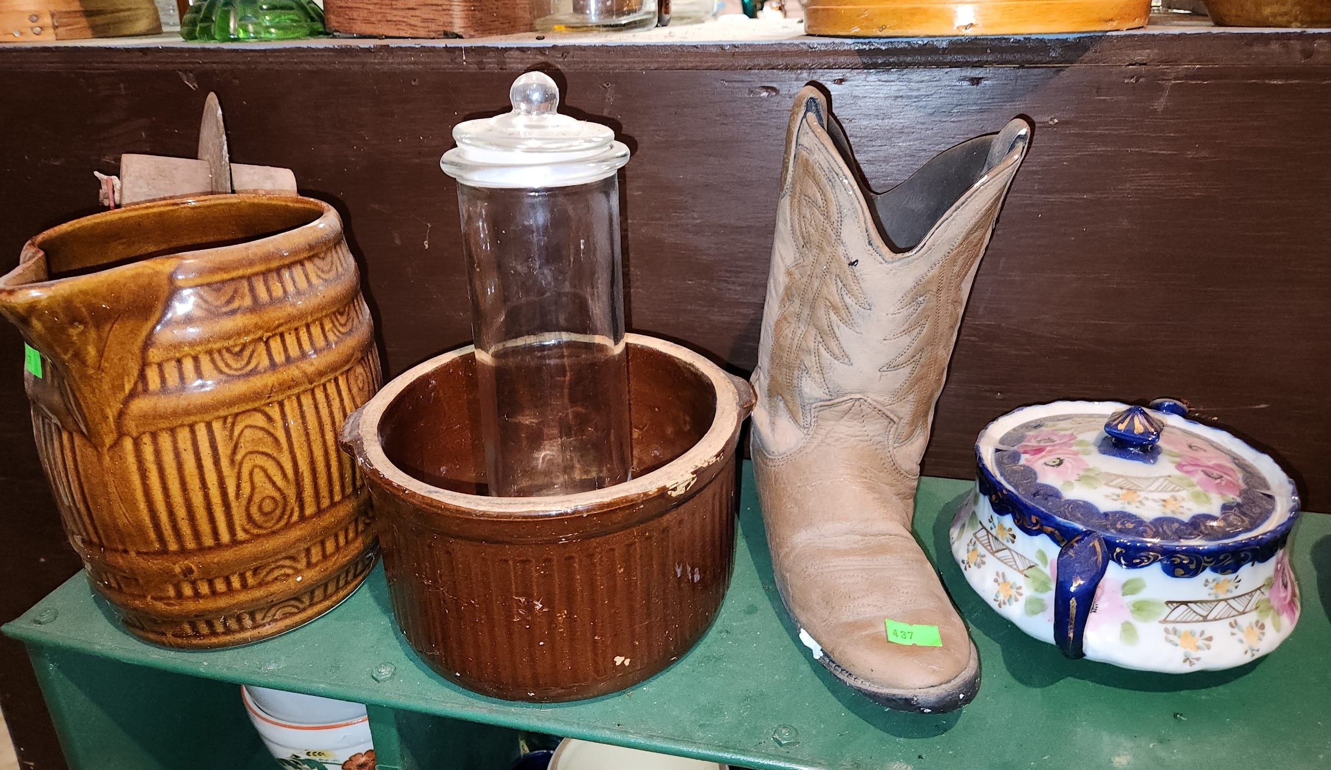 437 Porcelain pitcher, crock bowl, nut jar, ceramic boot, porcelain sugar bowl, Buffalo china dessert plates, Spacleware platter, Hershey’s cups, egg box