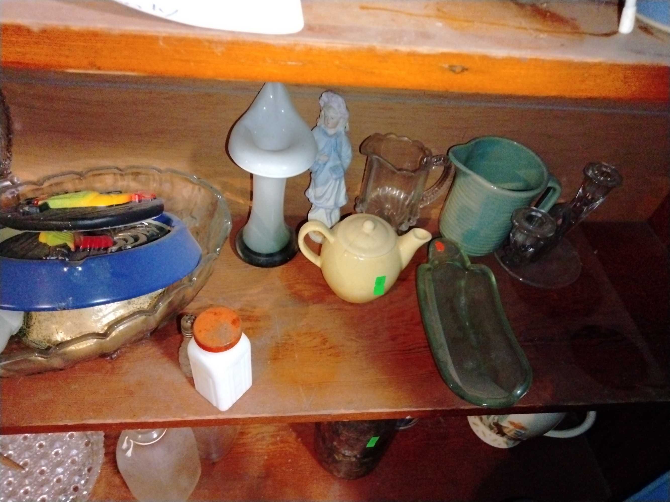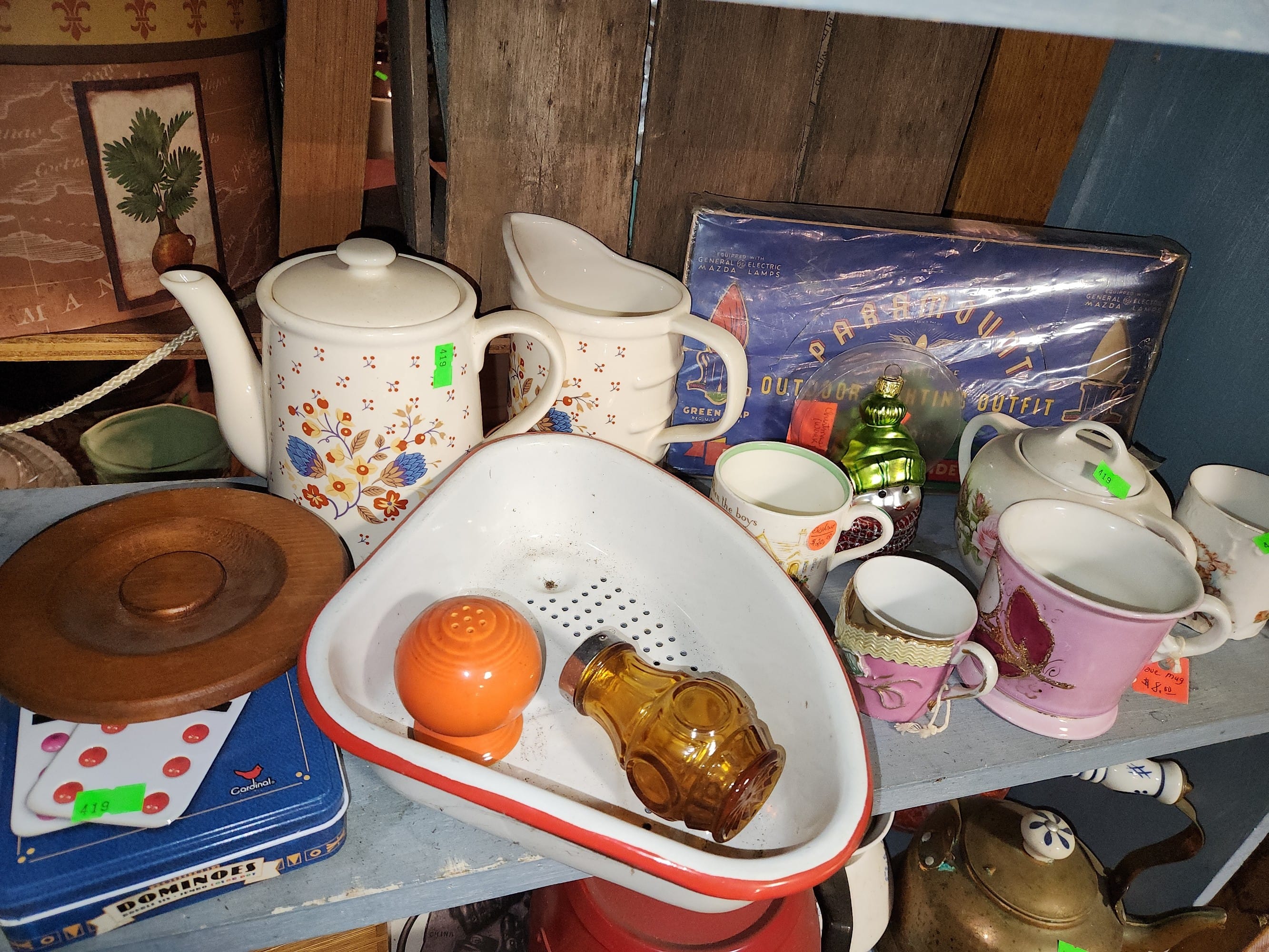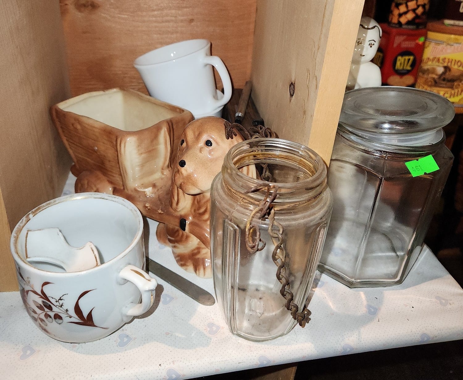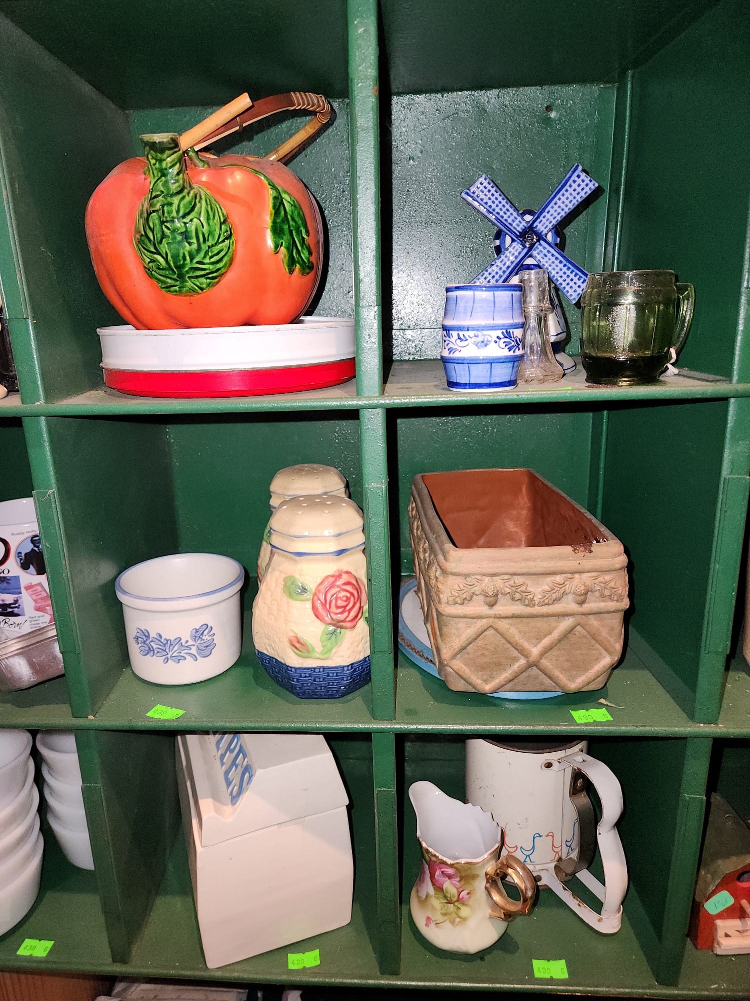 437 Porcelain pitcher, crock bowl, nut jar, ceramic boot, porcelain sugar bowl, Buffalo china dessert plates, Spacleware platter, Hershey’s cups, egg box
