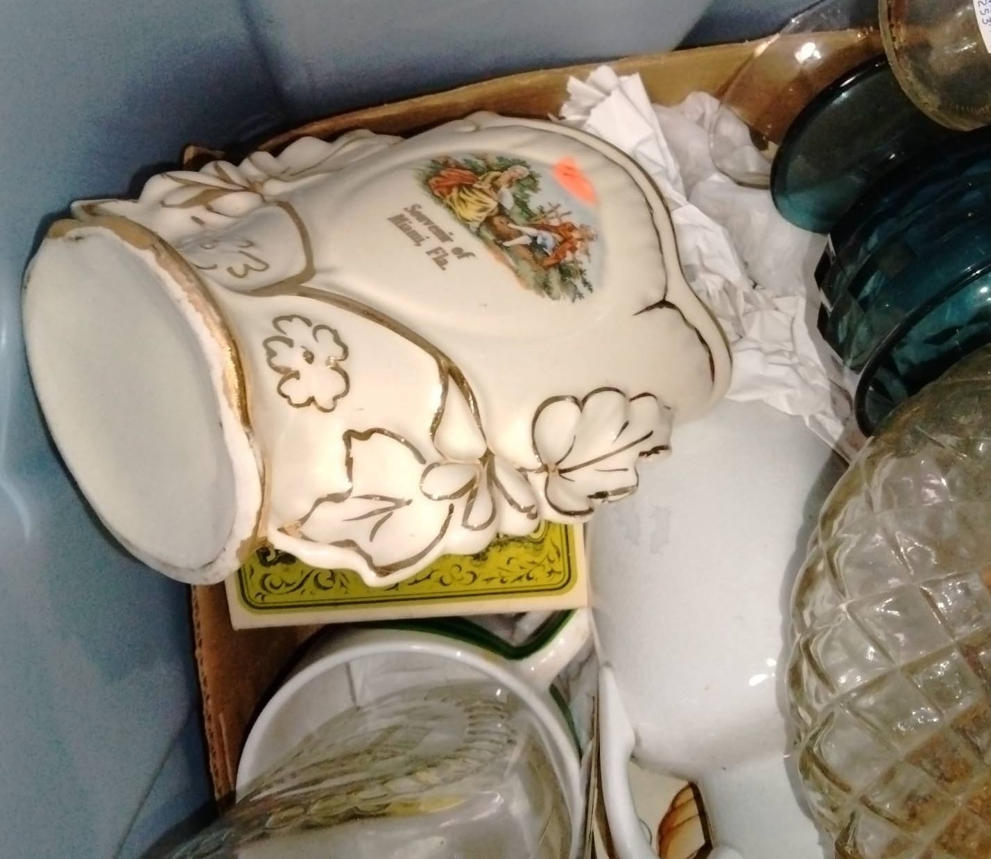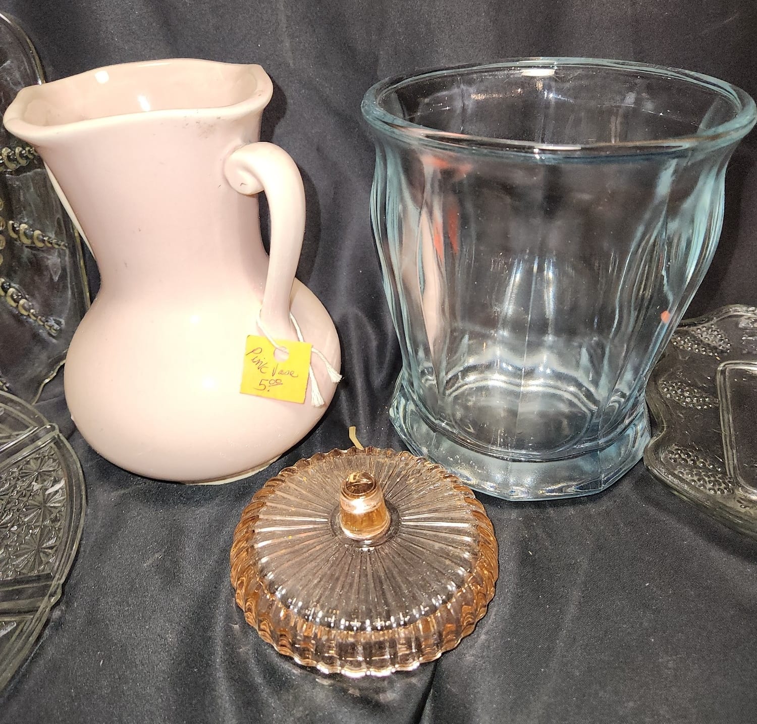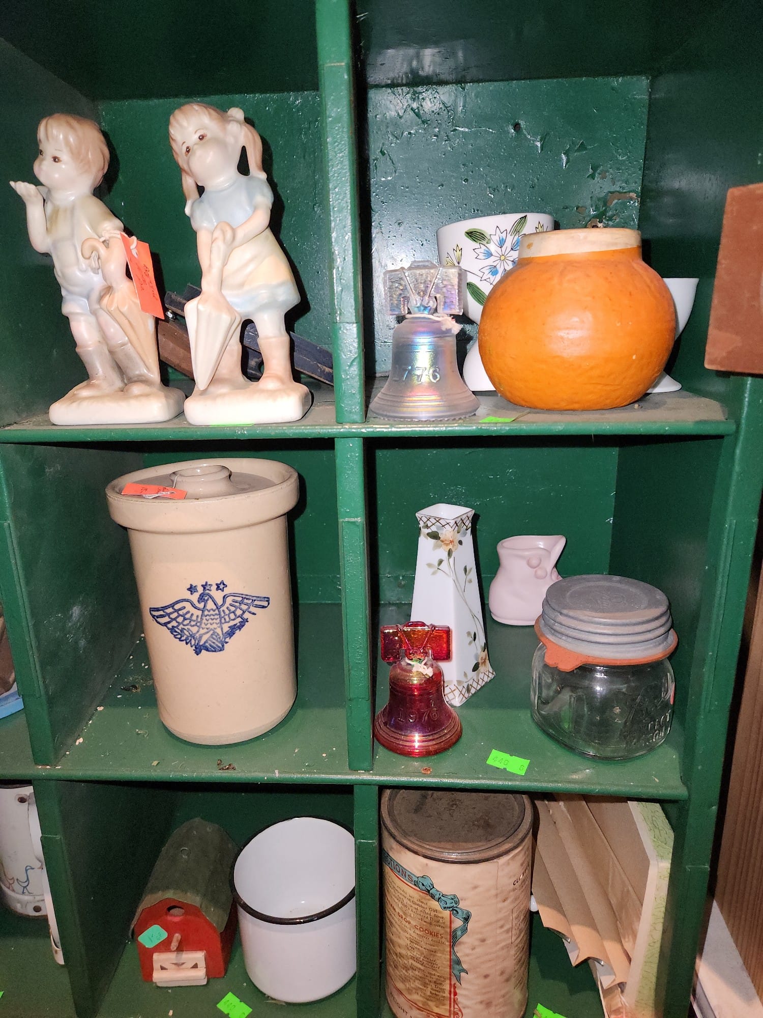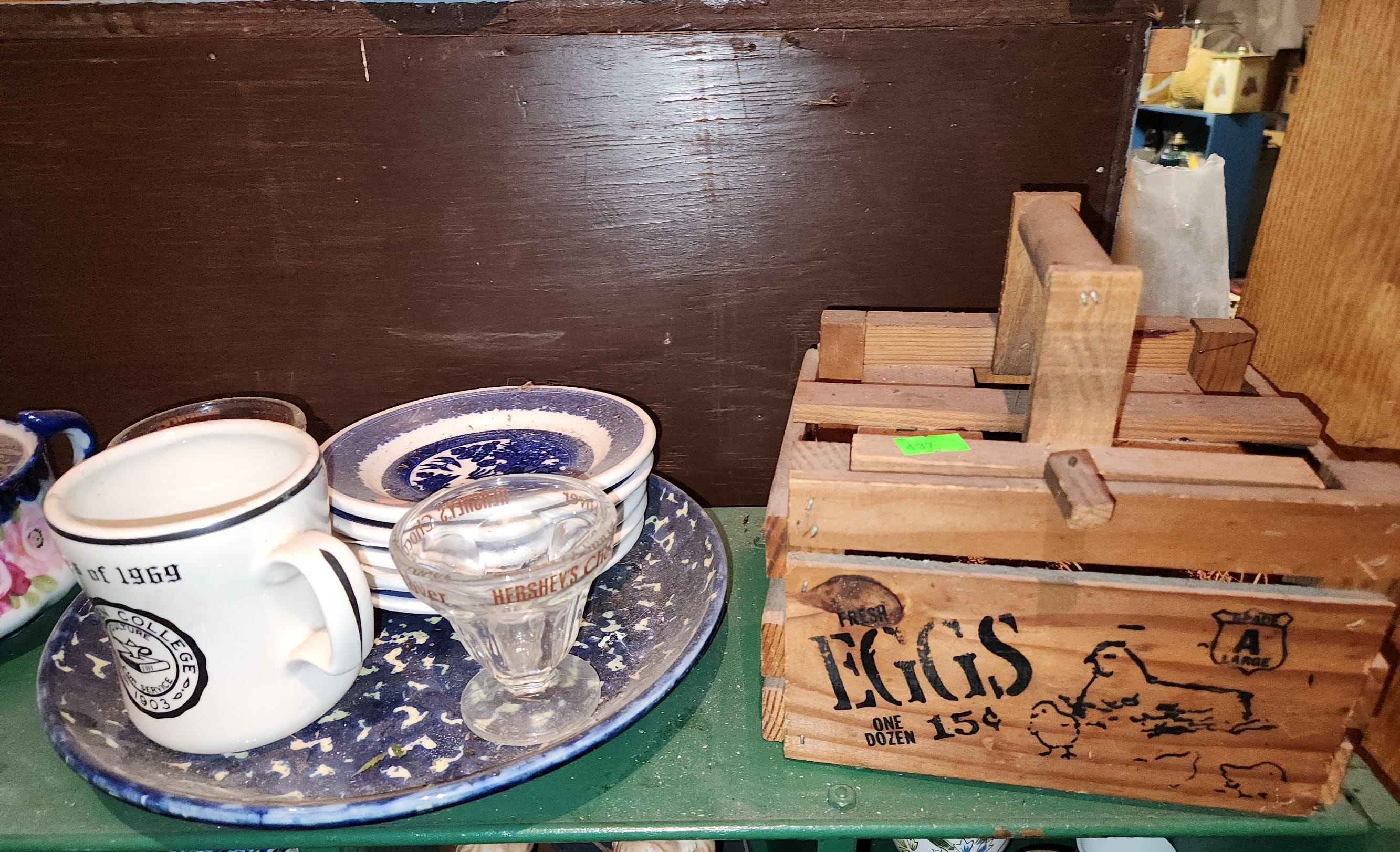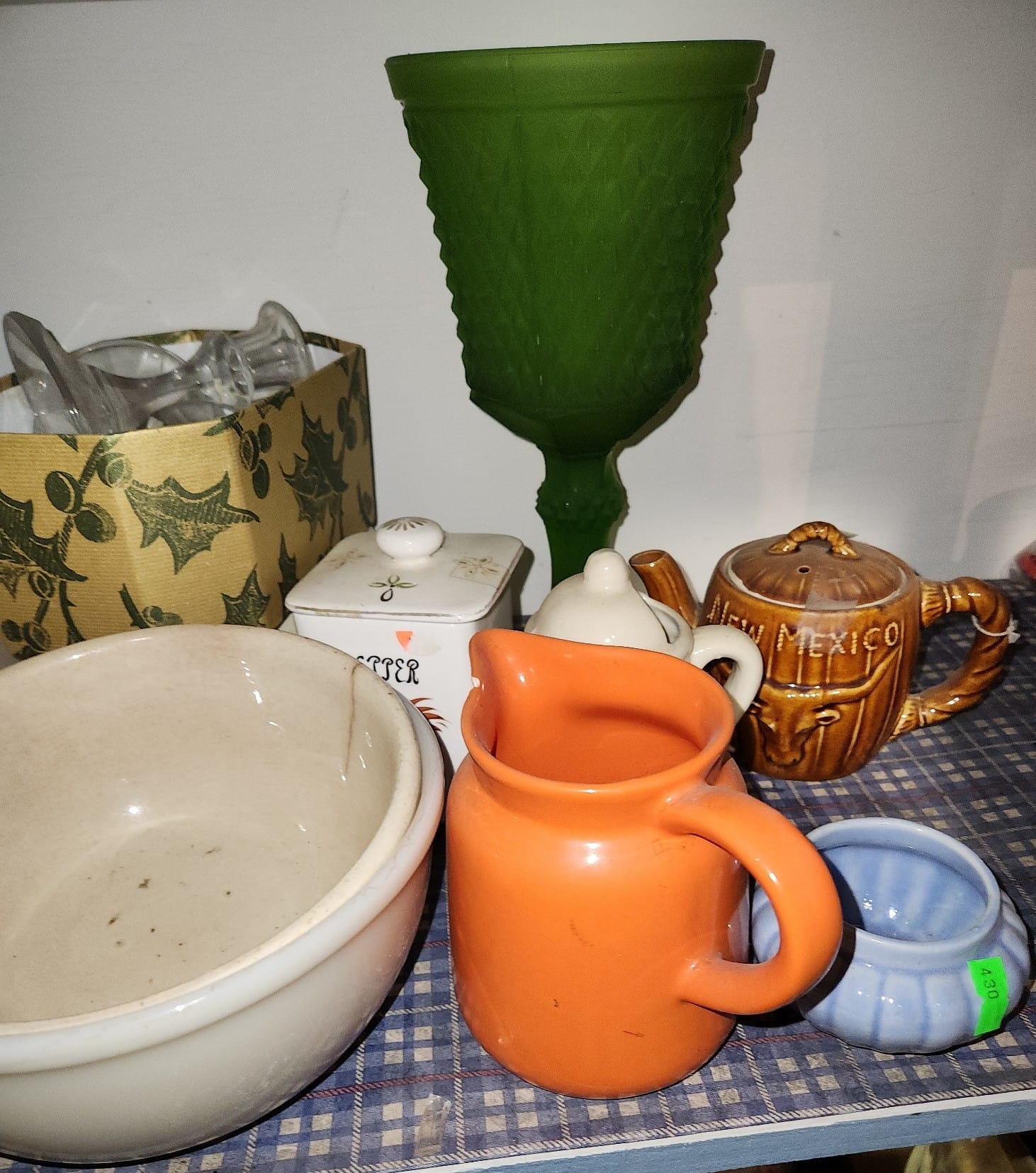437 Porcelain pitcher, crock bowl, nut jar, ceramic boot, porcelain sugar bowl, Buffalo china dessert plates, Spacleware platter, Hershey’s cups, egg box