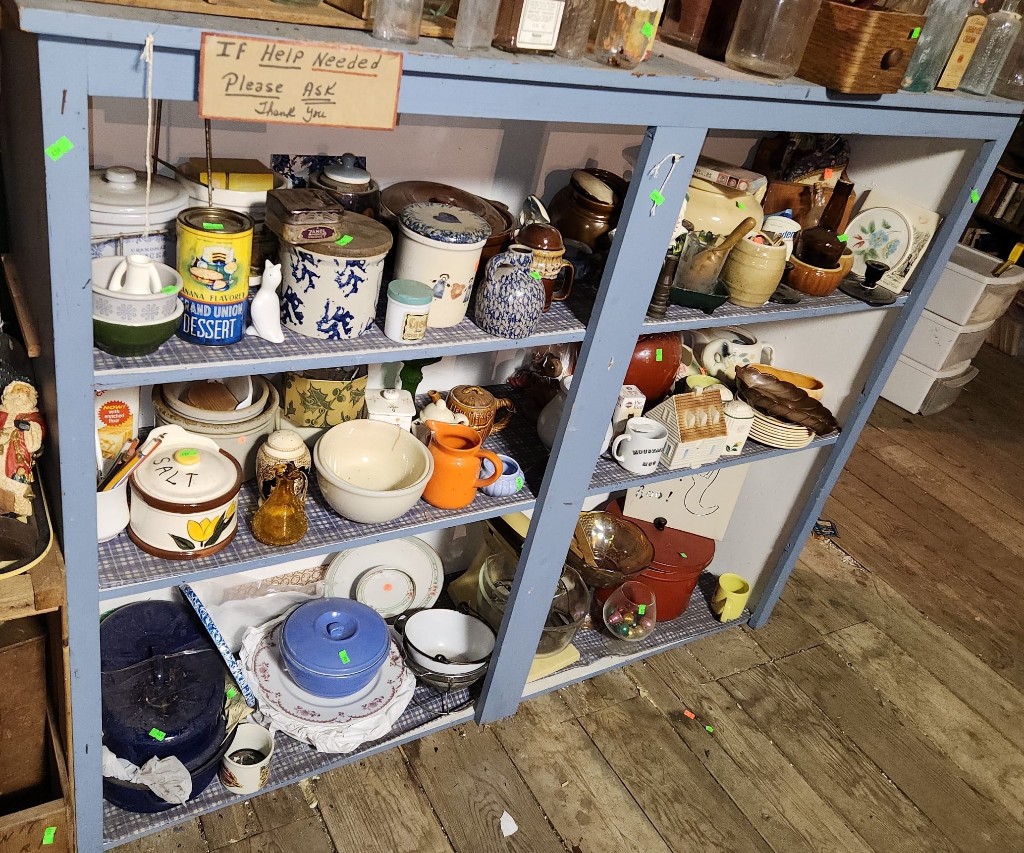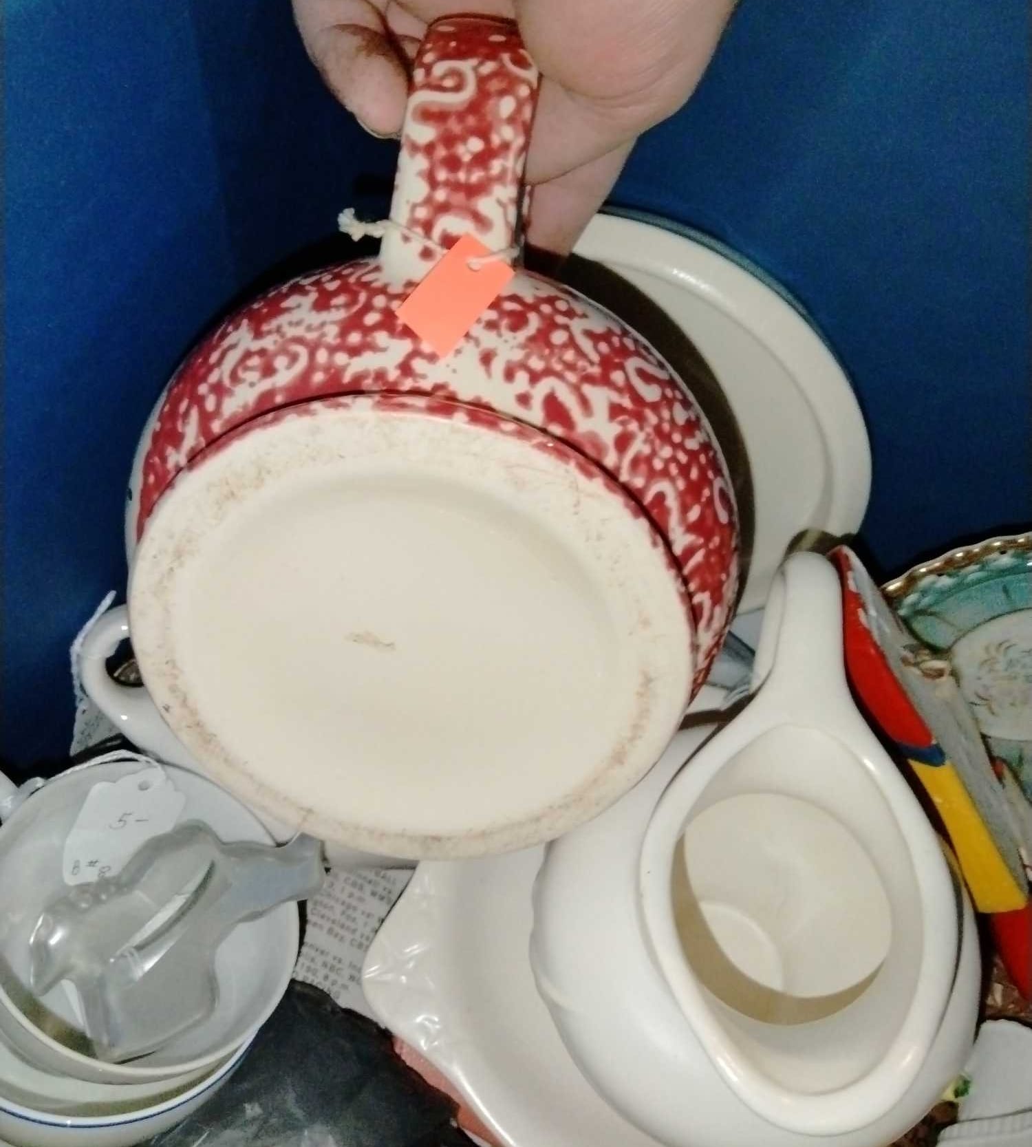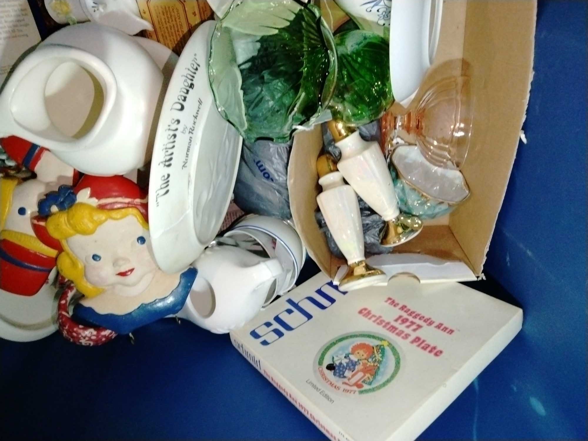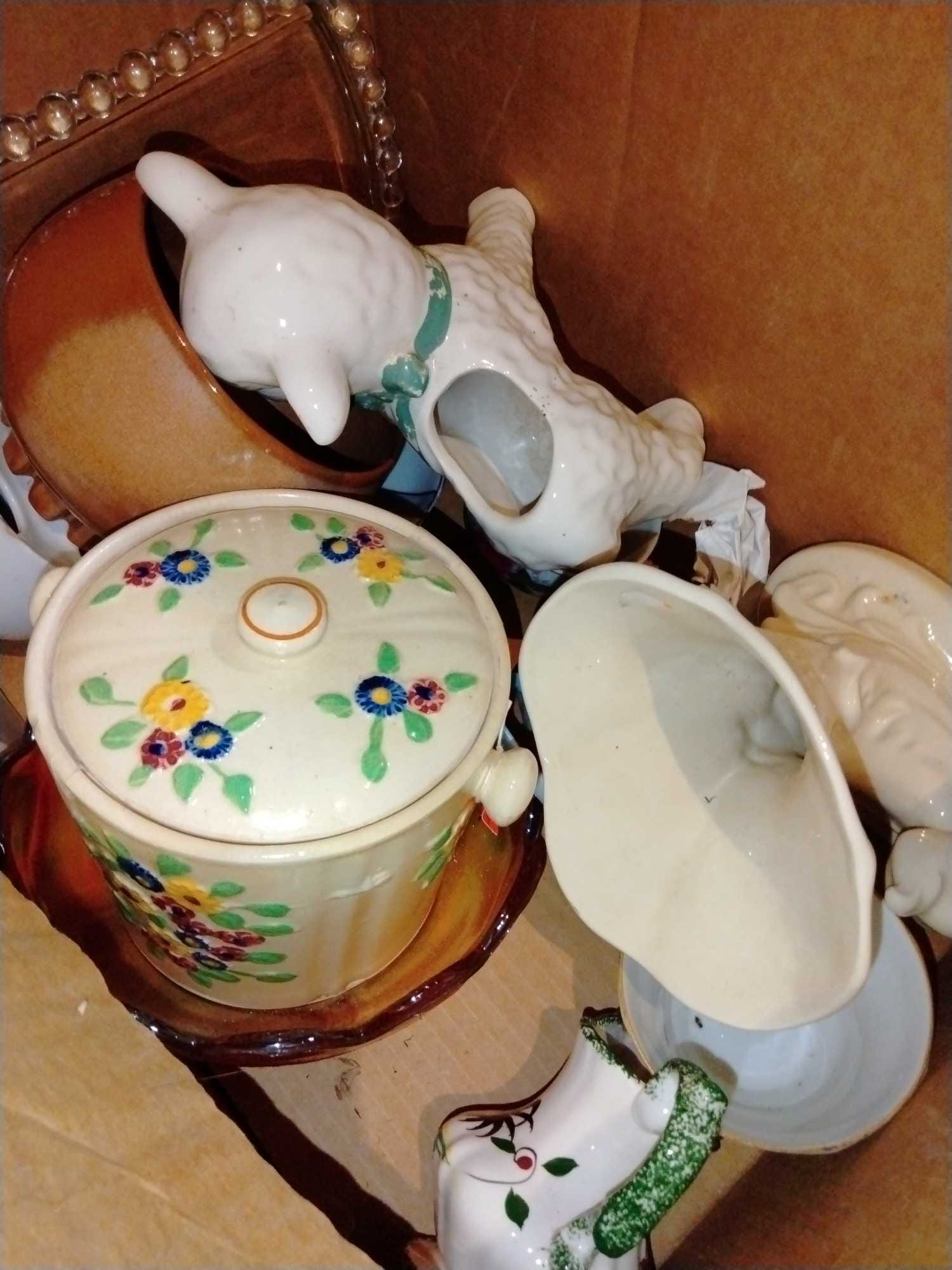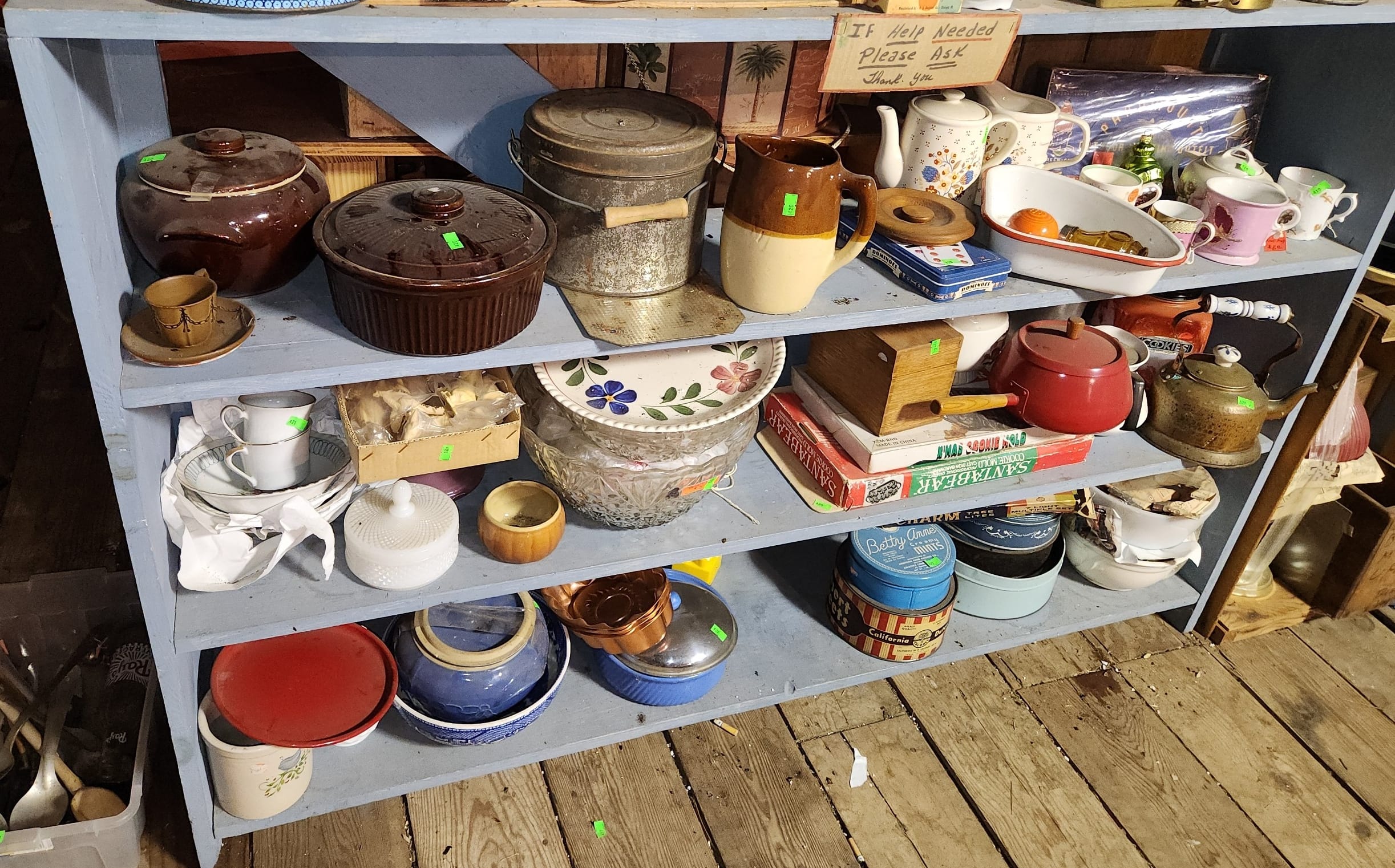 437 Porcelain pitcher, crock bowl, nut jar, ceramic boot, porcelain sugar bowl, Buffalo china dessert plates, Spacleware platter, Hershey’s cups, egg box