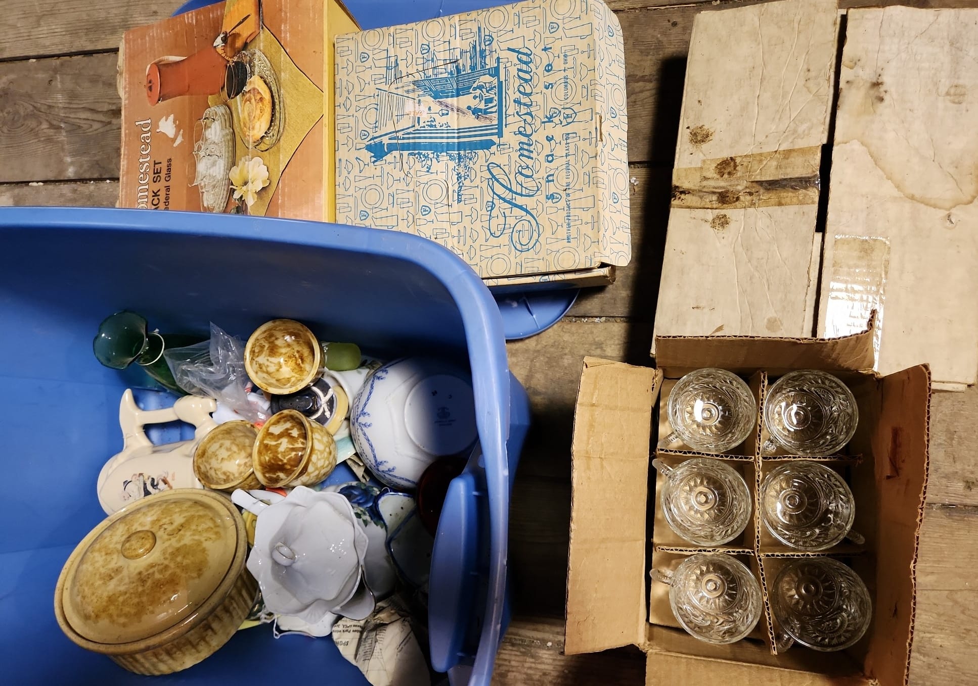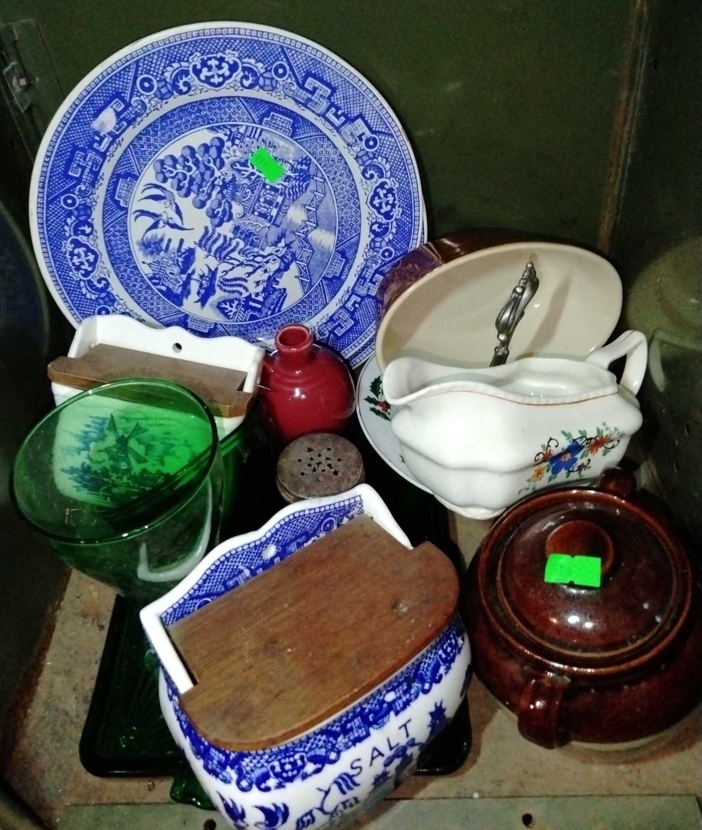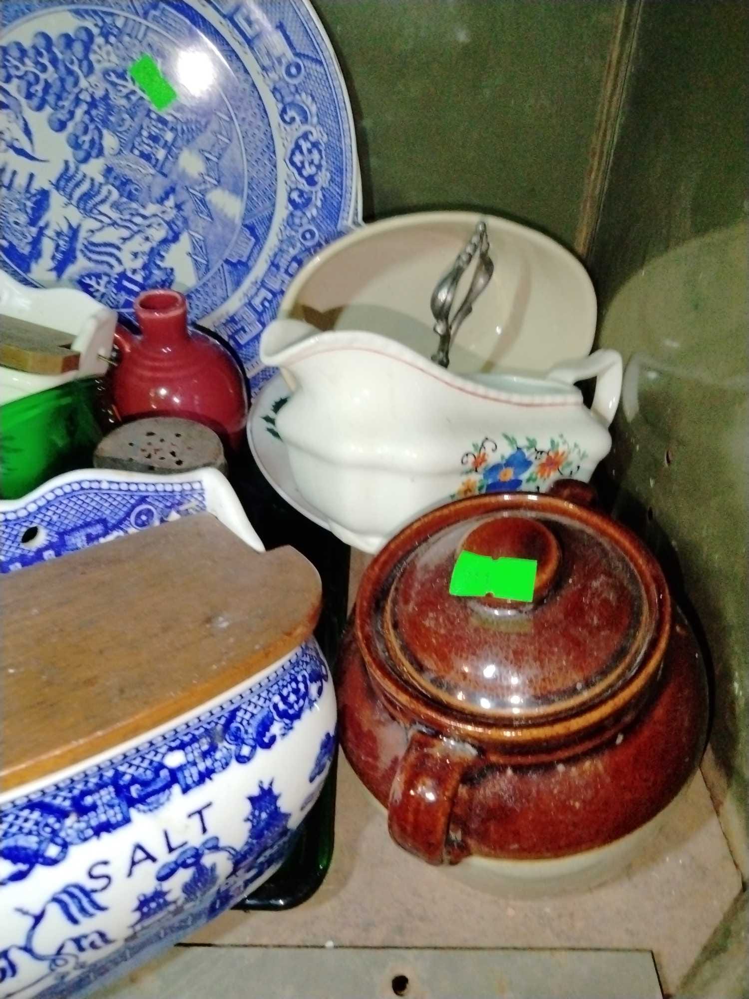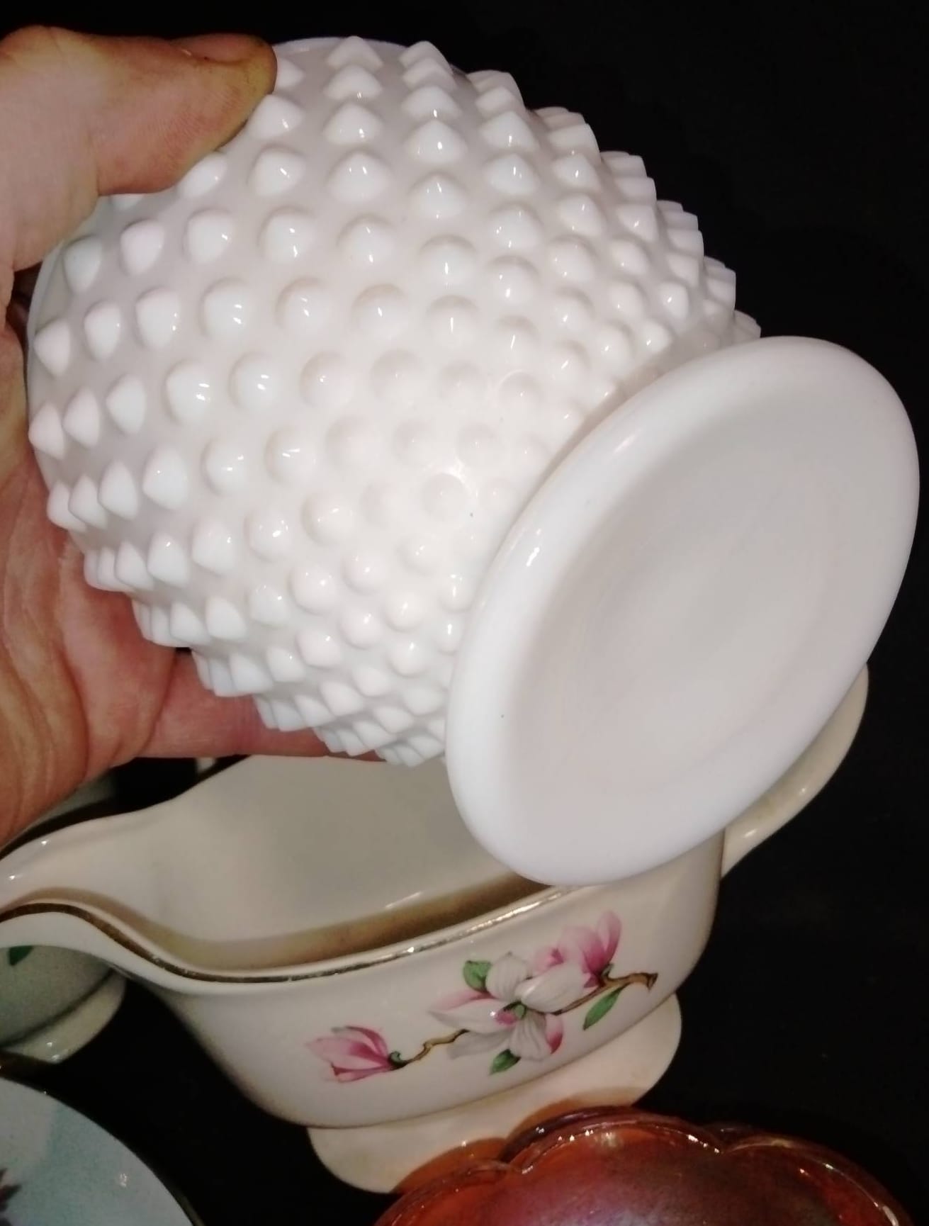 437 Porcelain pitcher, crock bowl, nut jar, ceramic boot, porcelain sugar bowl, Buffalo china dessert plates, Spacleware platter, Hershey’s cups, egg box