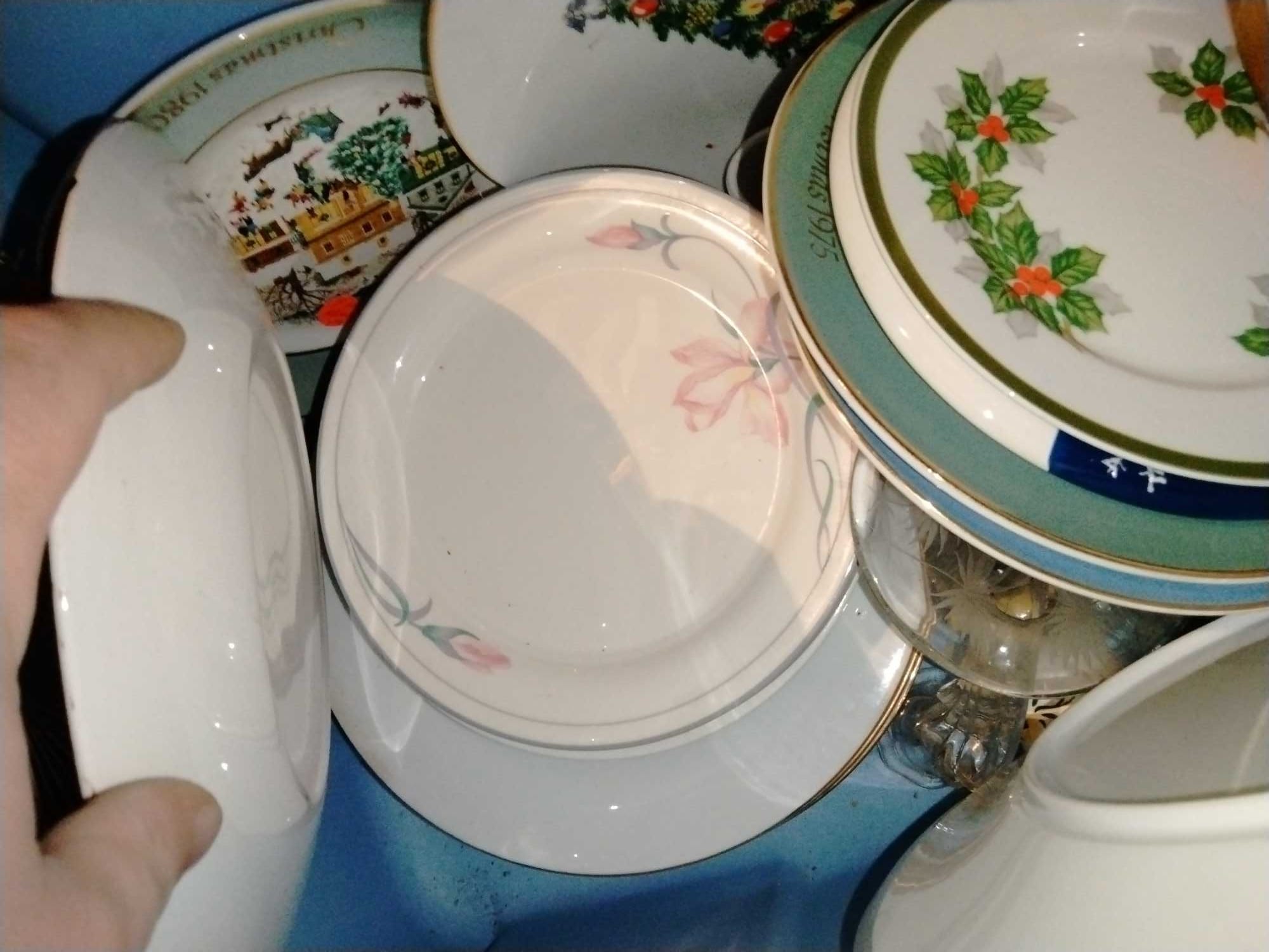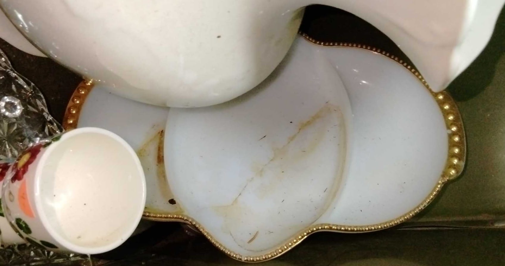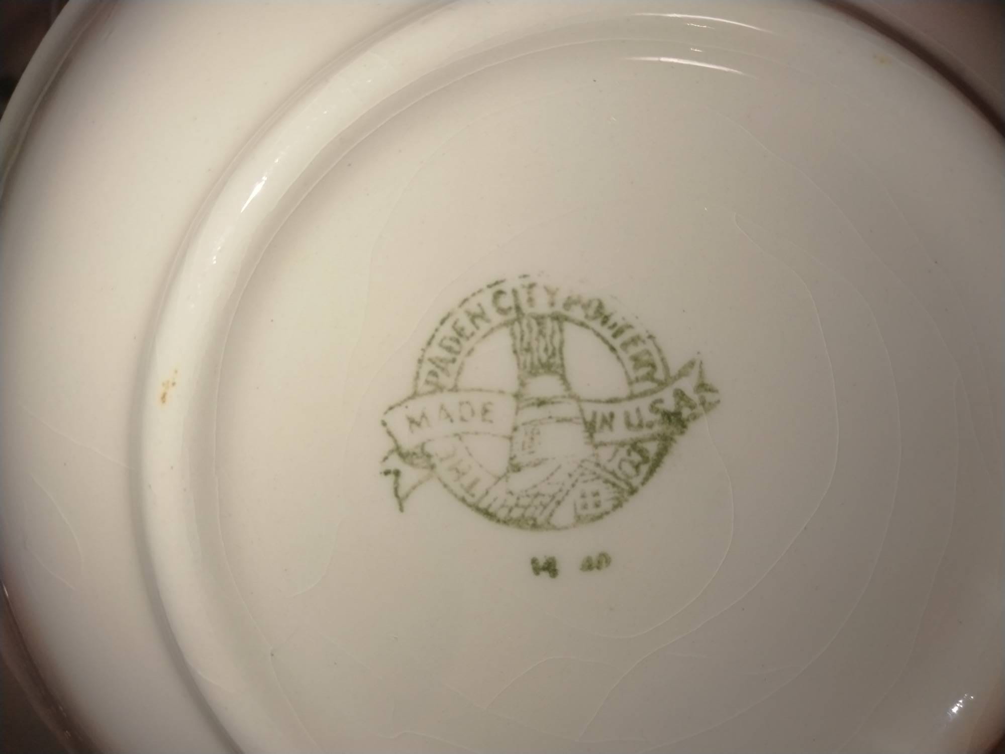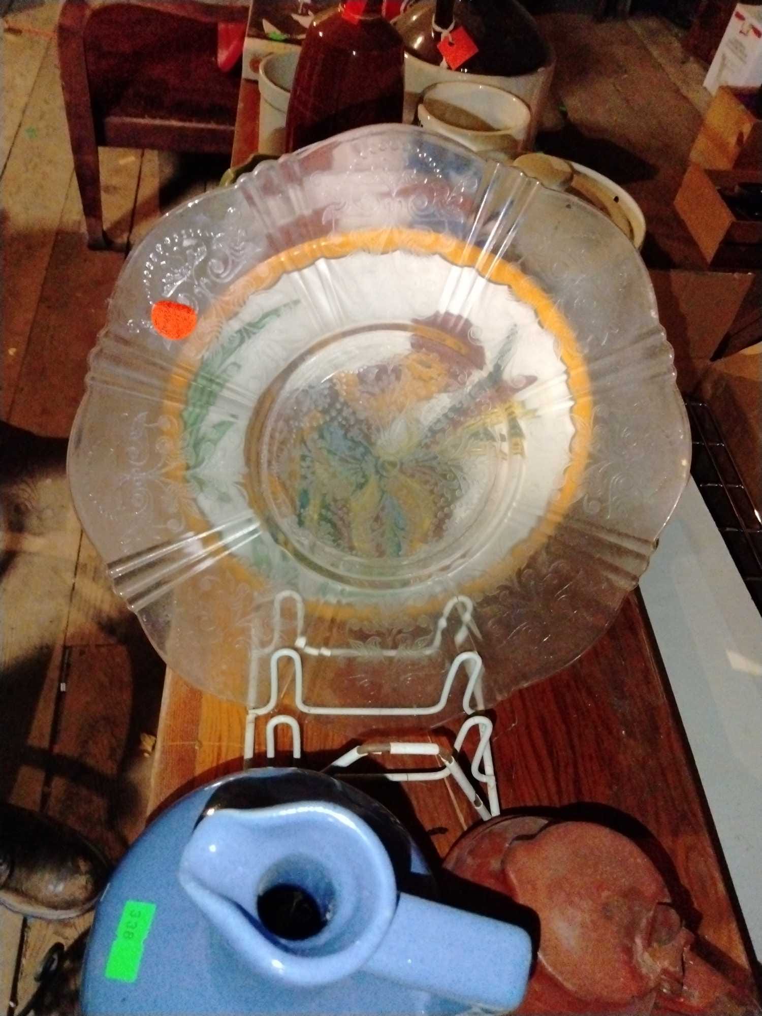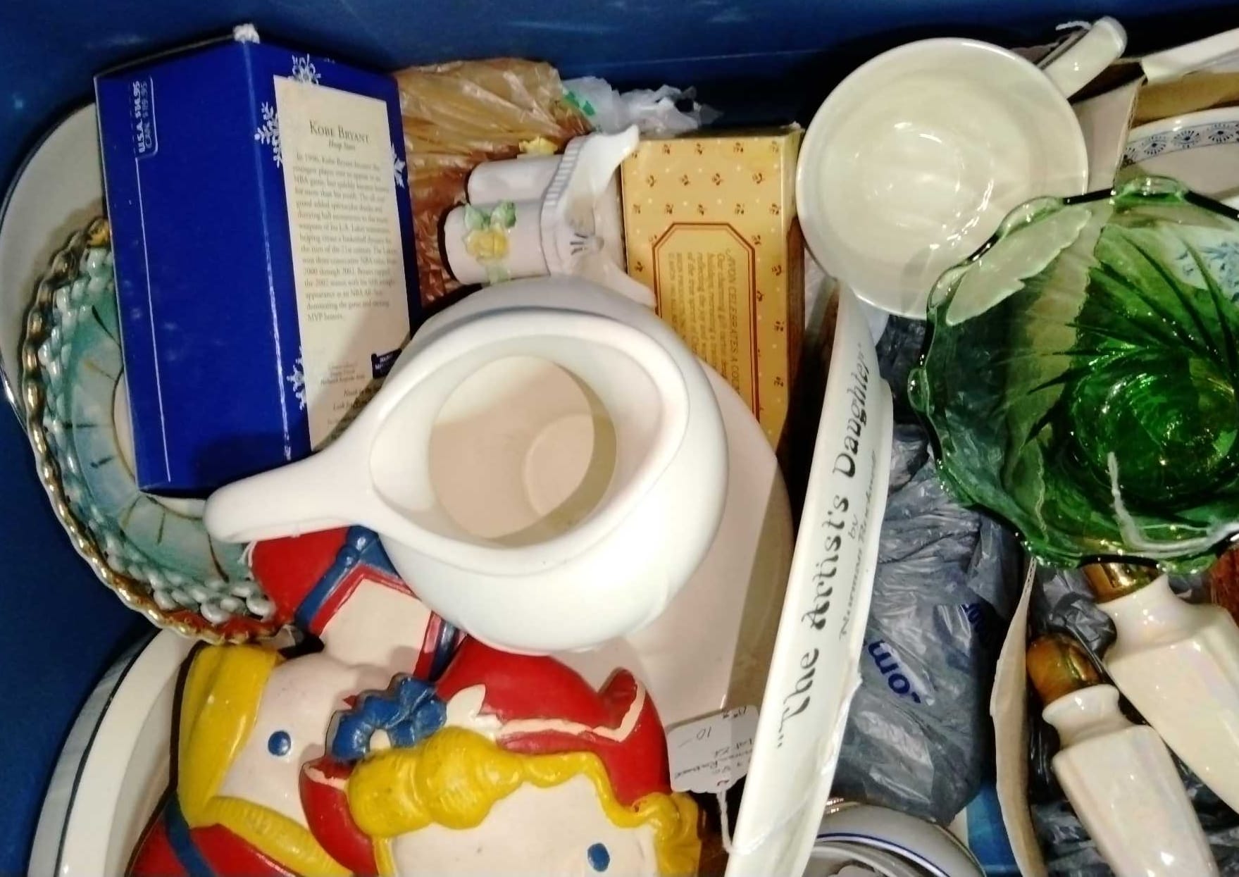 437 Porcelain pitcher, crock bowl, nut jar, ceramic boot, porcelain sugar bowl, Buffalo china dessert plates, Spacleware platter, Hershey’s cups, egg box