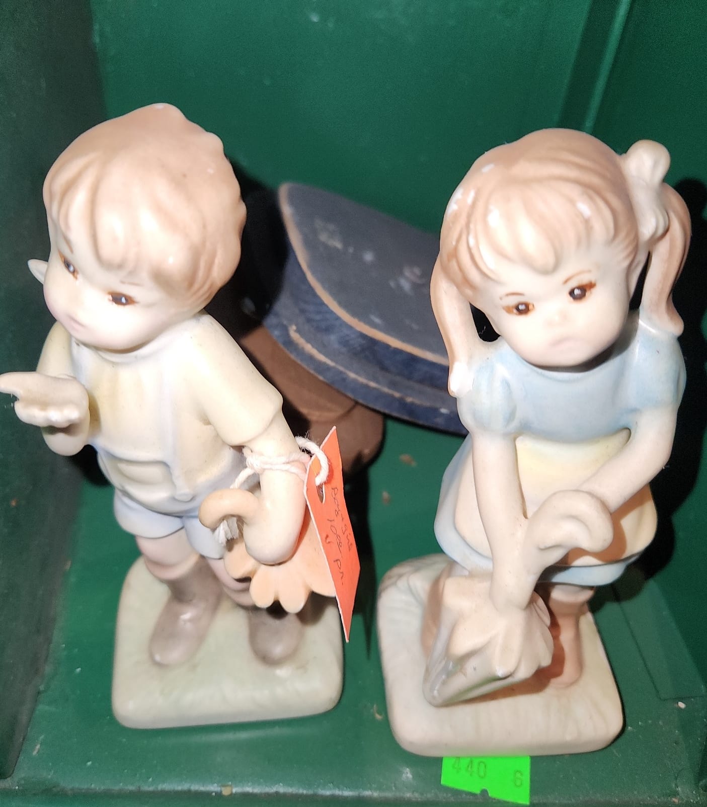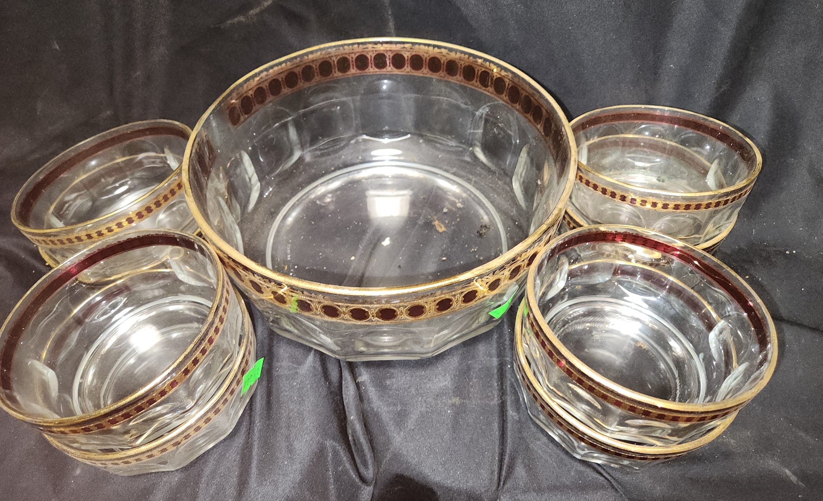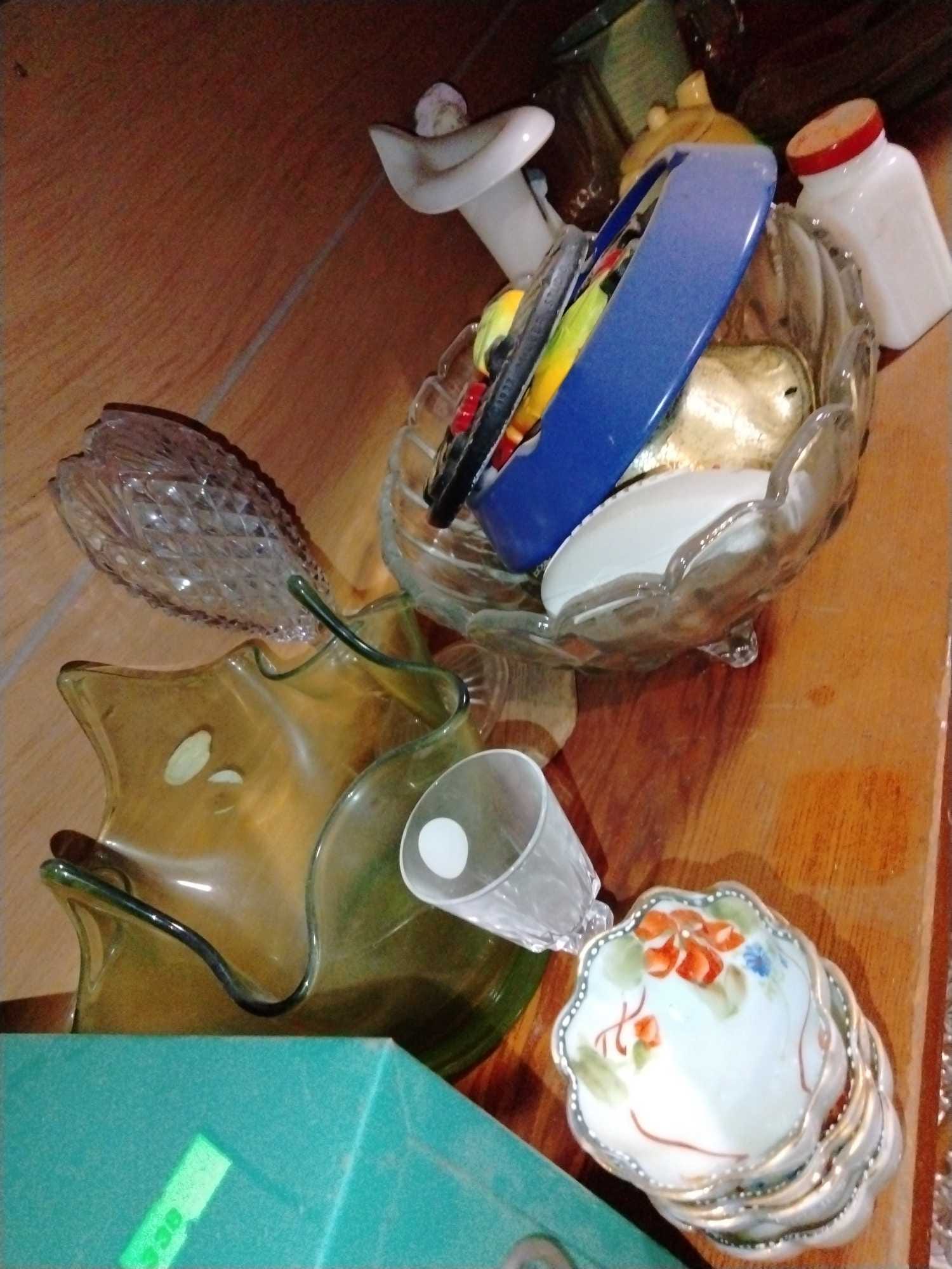 421 Punch bowl and cups, pedestal cake plate, china dishes, Nativity figures, powder dish