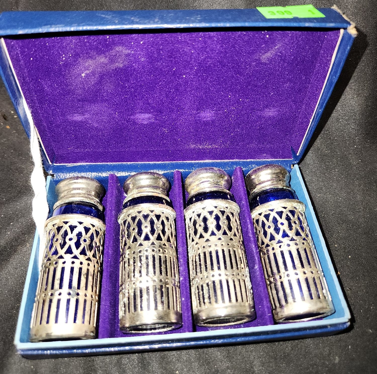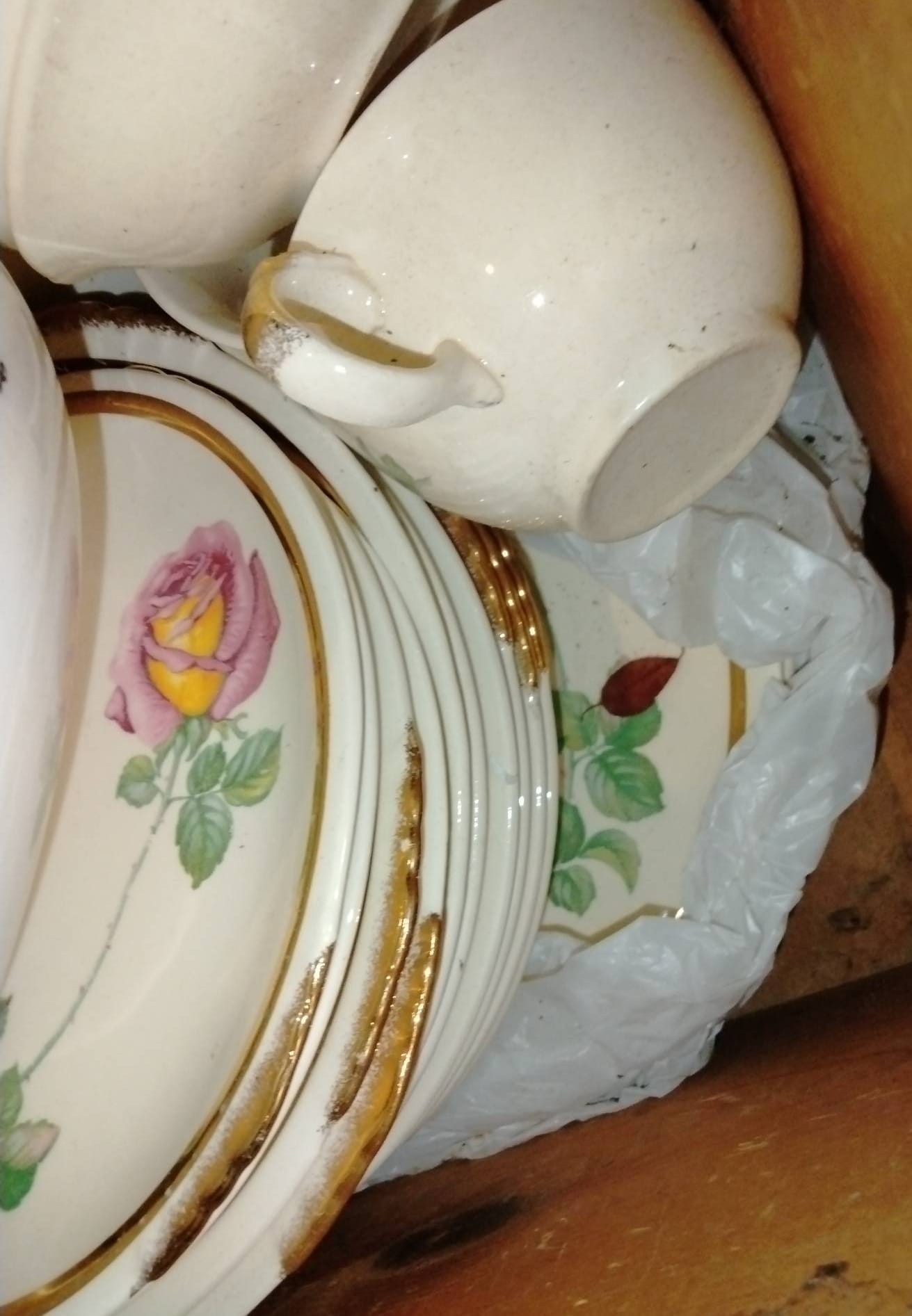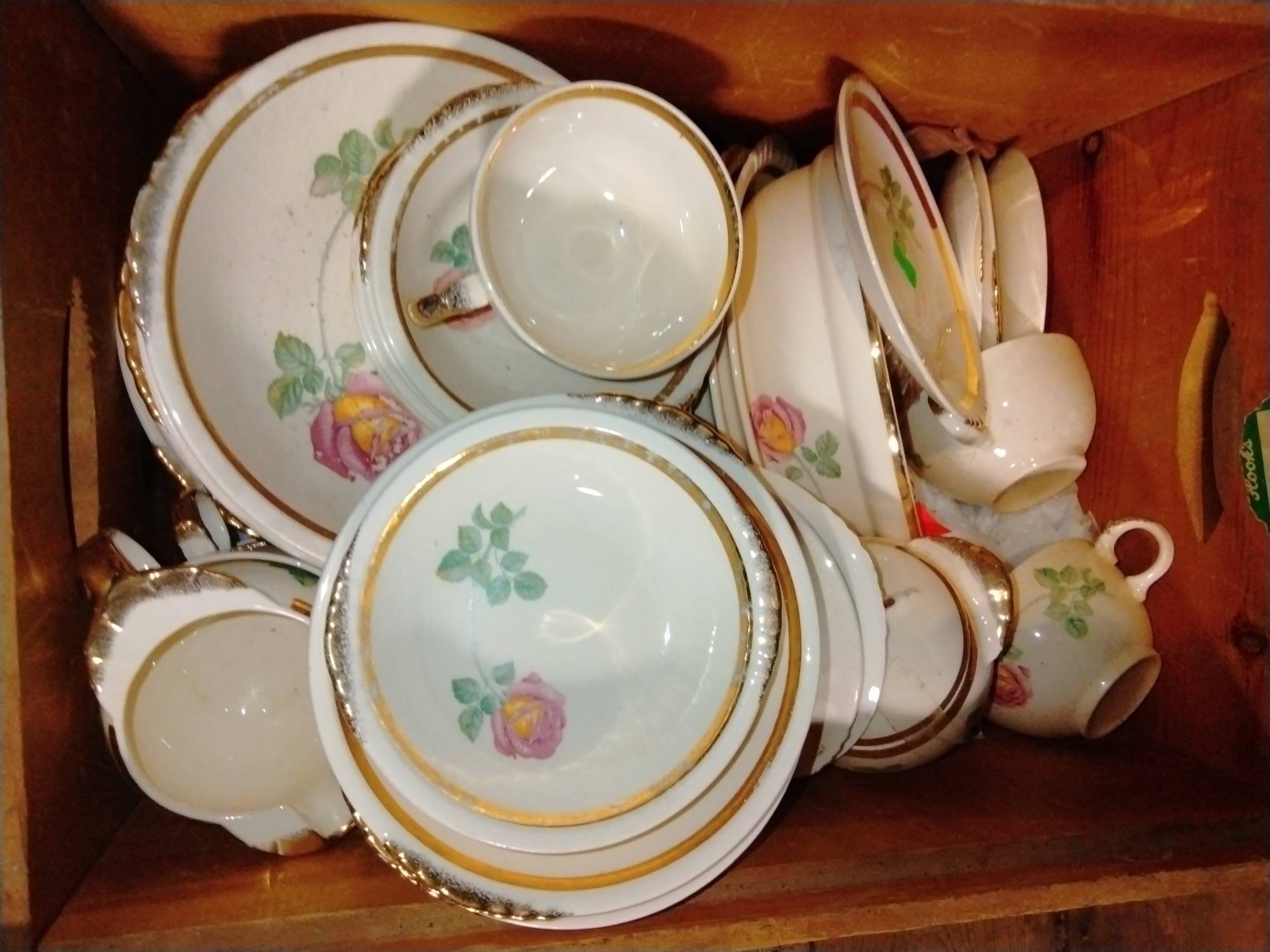 421 Punch bowl and cups, pedestal cake plate, china dishes, Nativity figures, powder dish