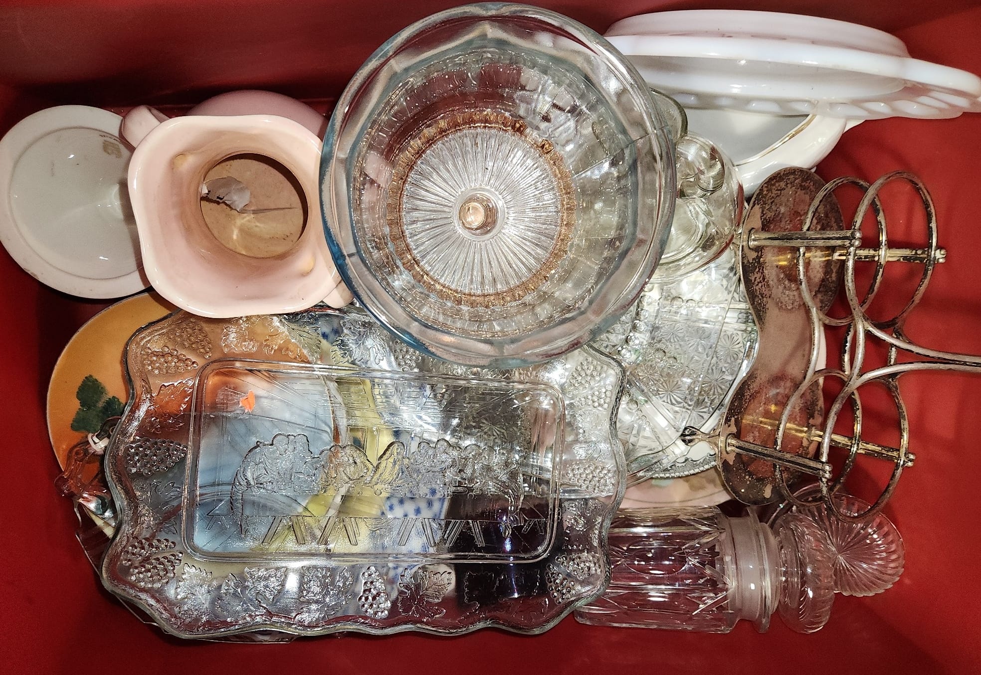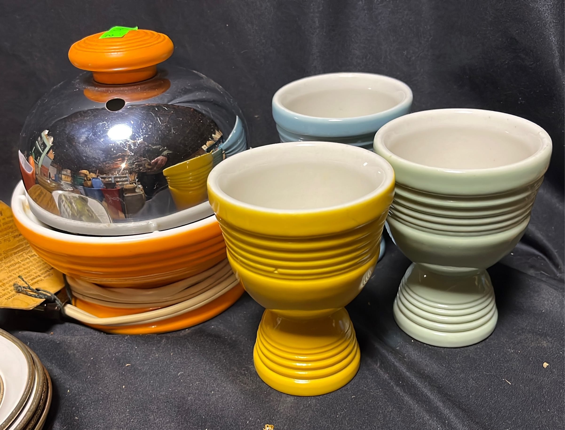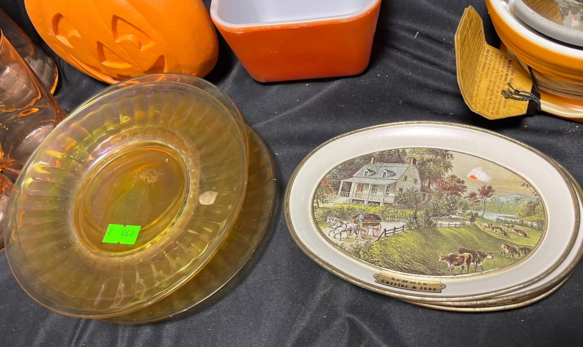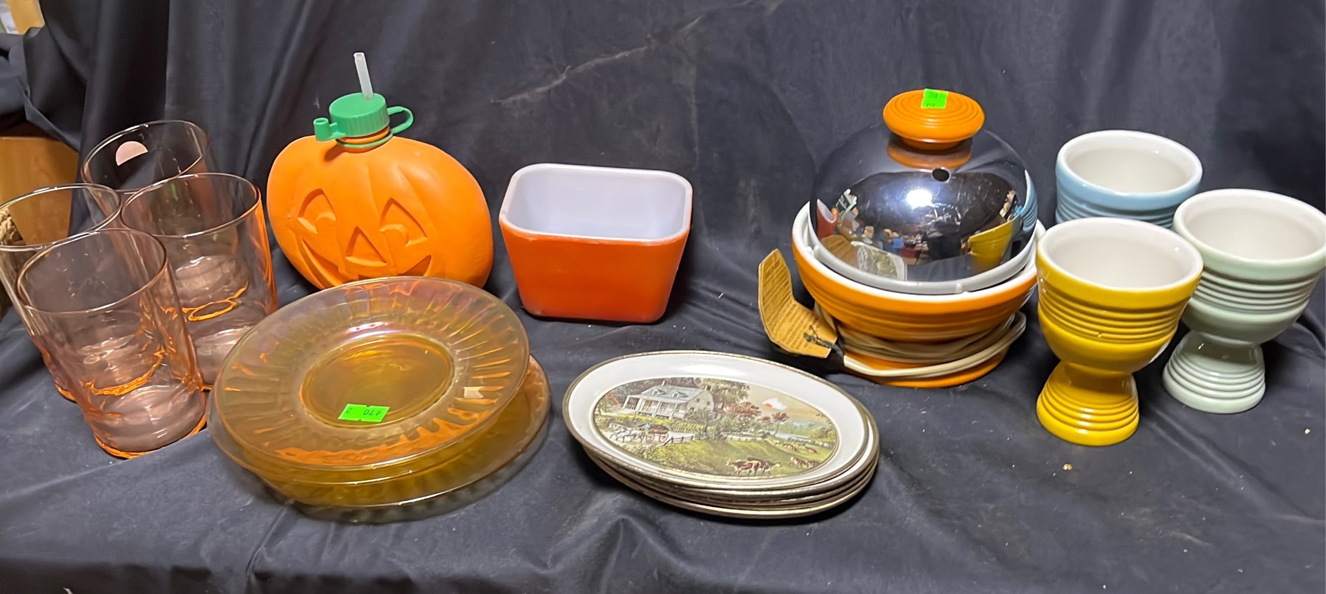 470 Pyrex refrigerator dish, egg cooker, egg cups, carnival glass plates and glasses, metal trays
