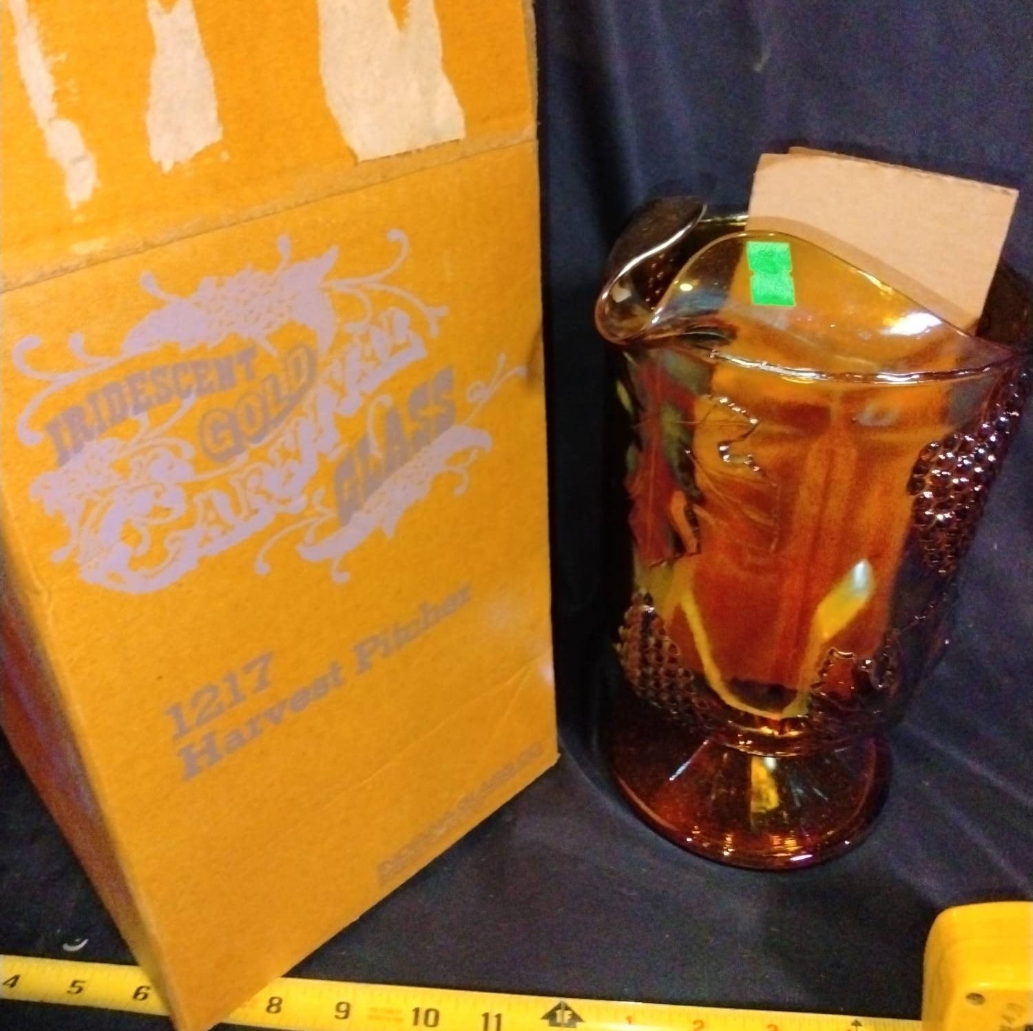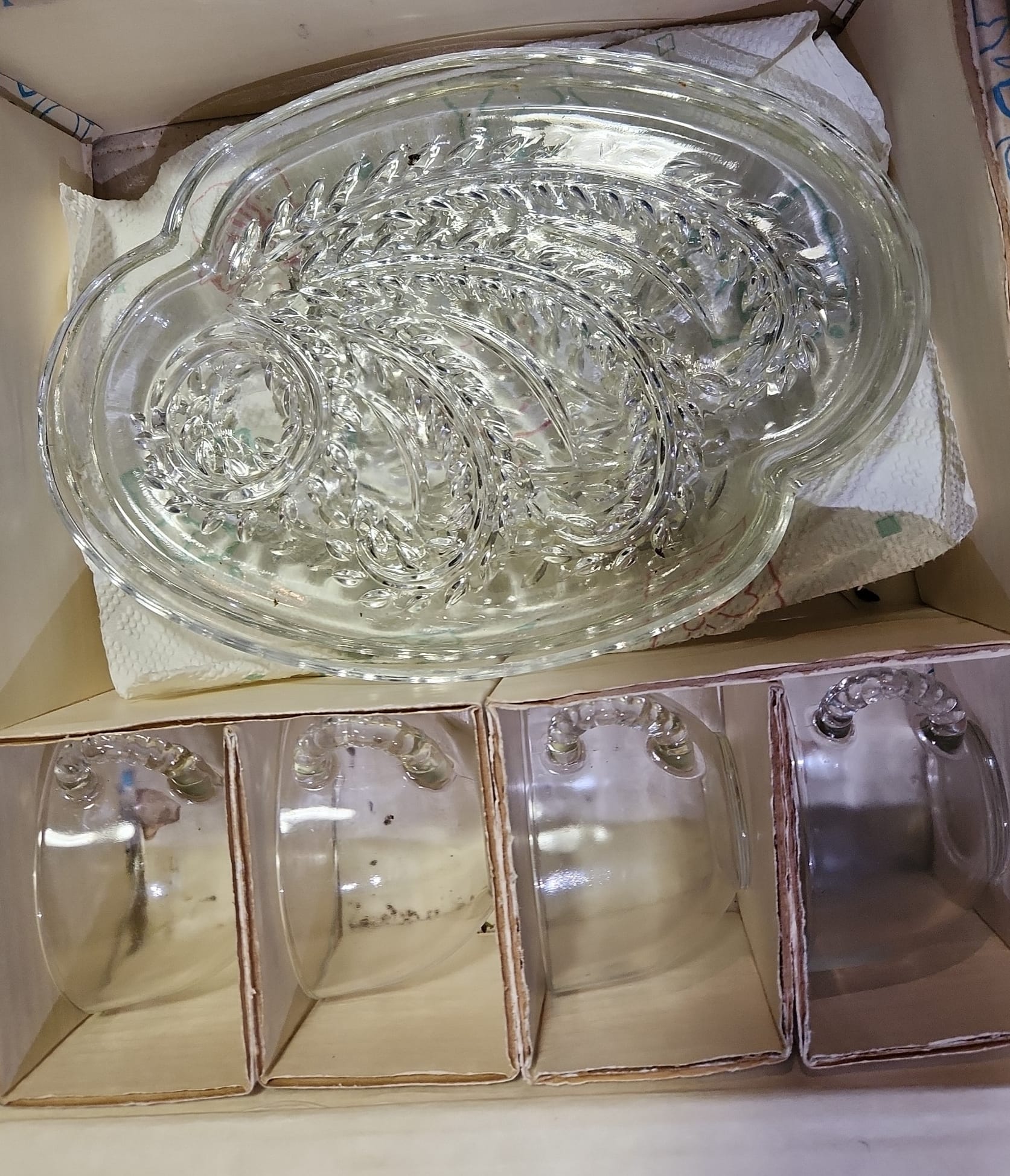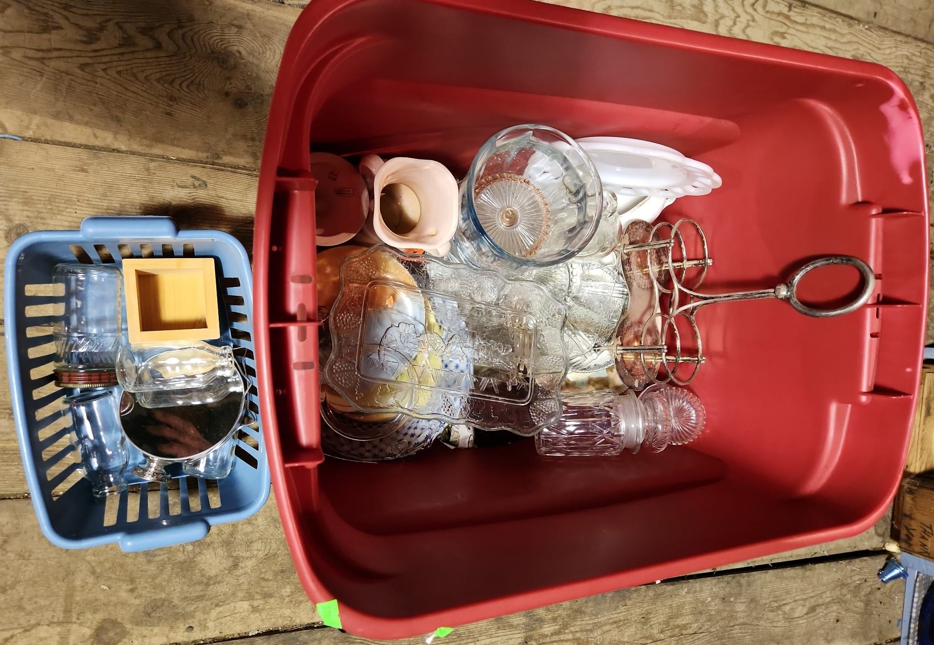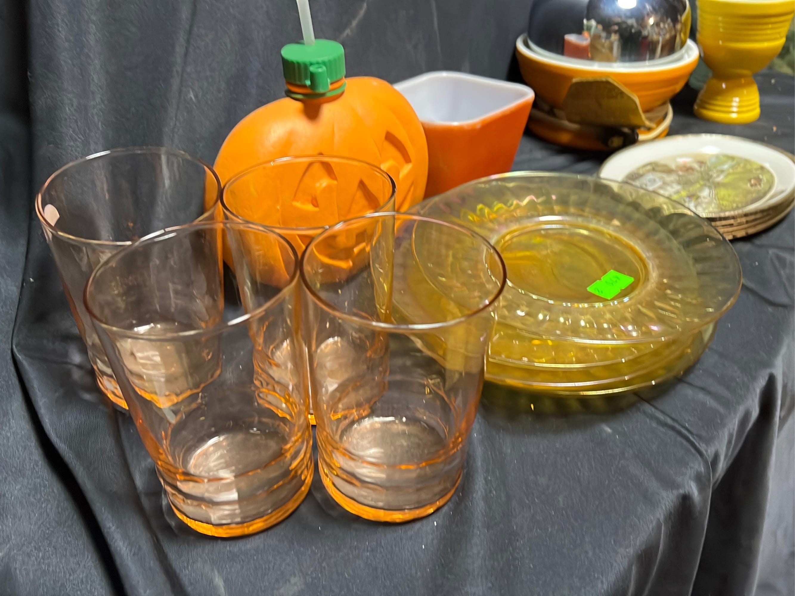470 Pyrex refrigerator dish, egg cooker, egg cups, carnival glass plates and glasses, metal trays