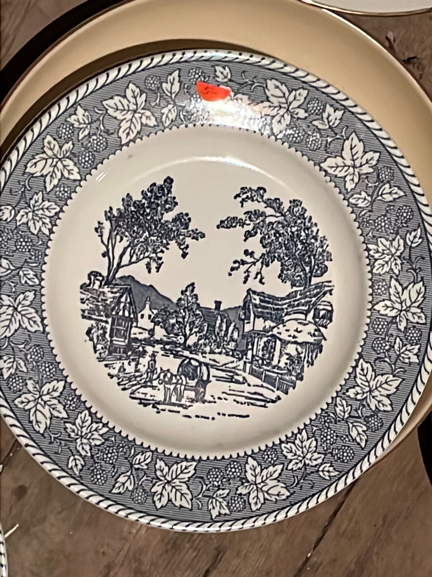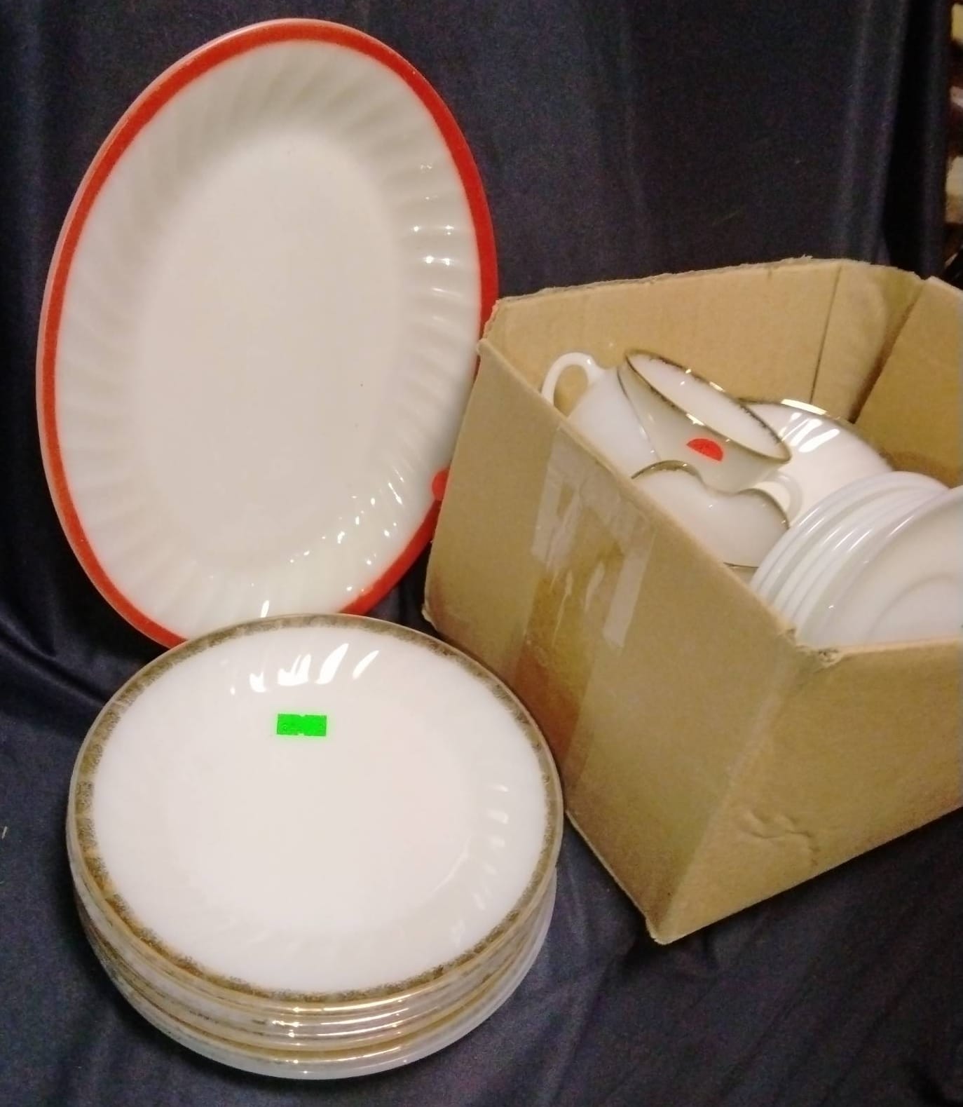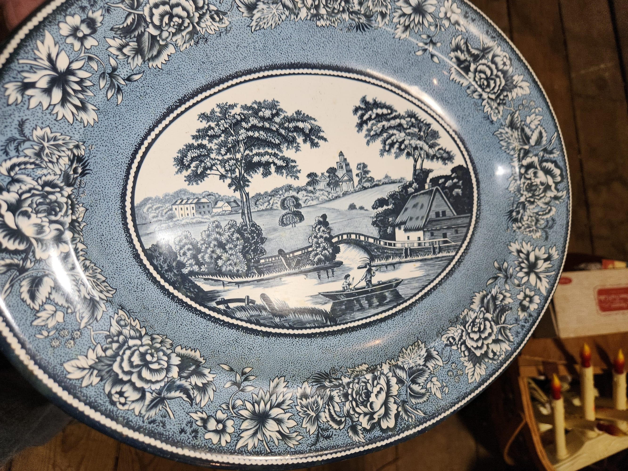 433 Shenango plates 5, Nippon server, roasting pan, pottery covered dish, strainer, enamel pot