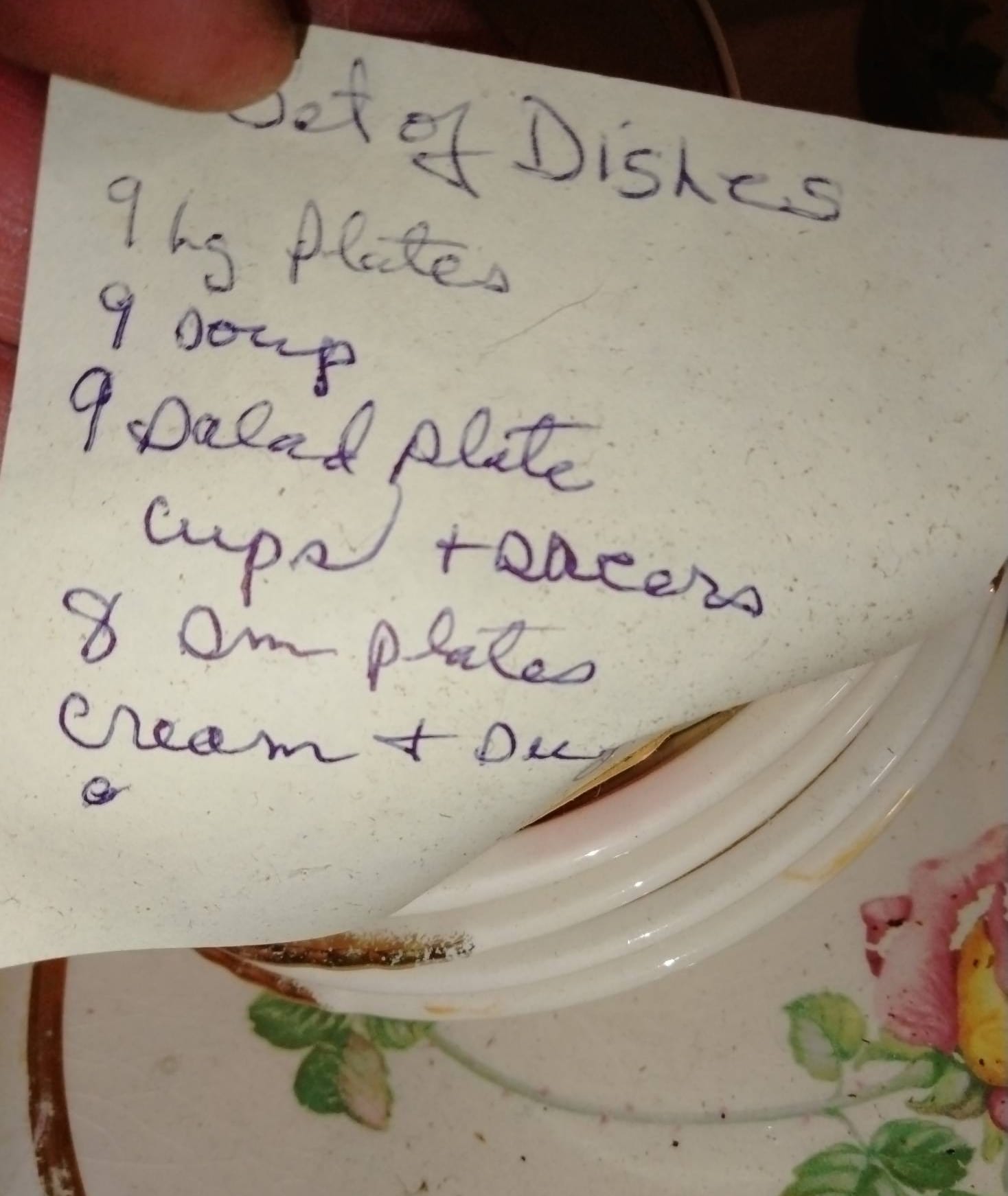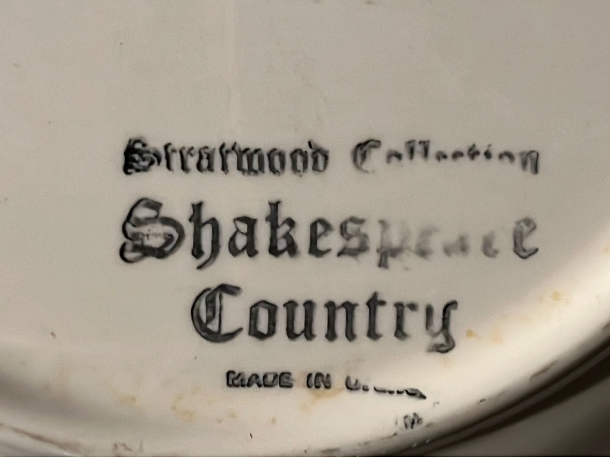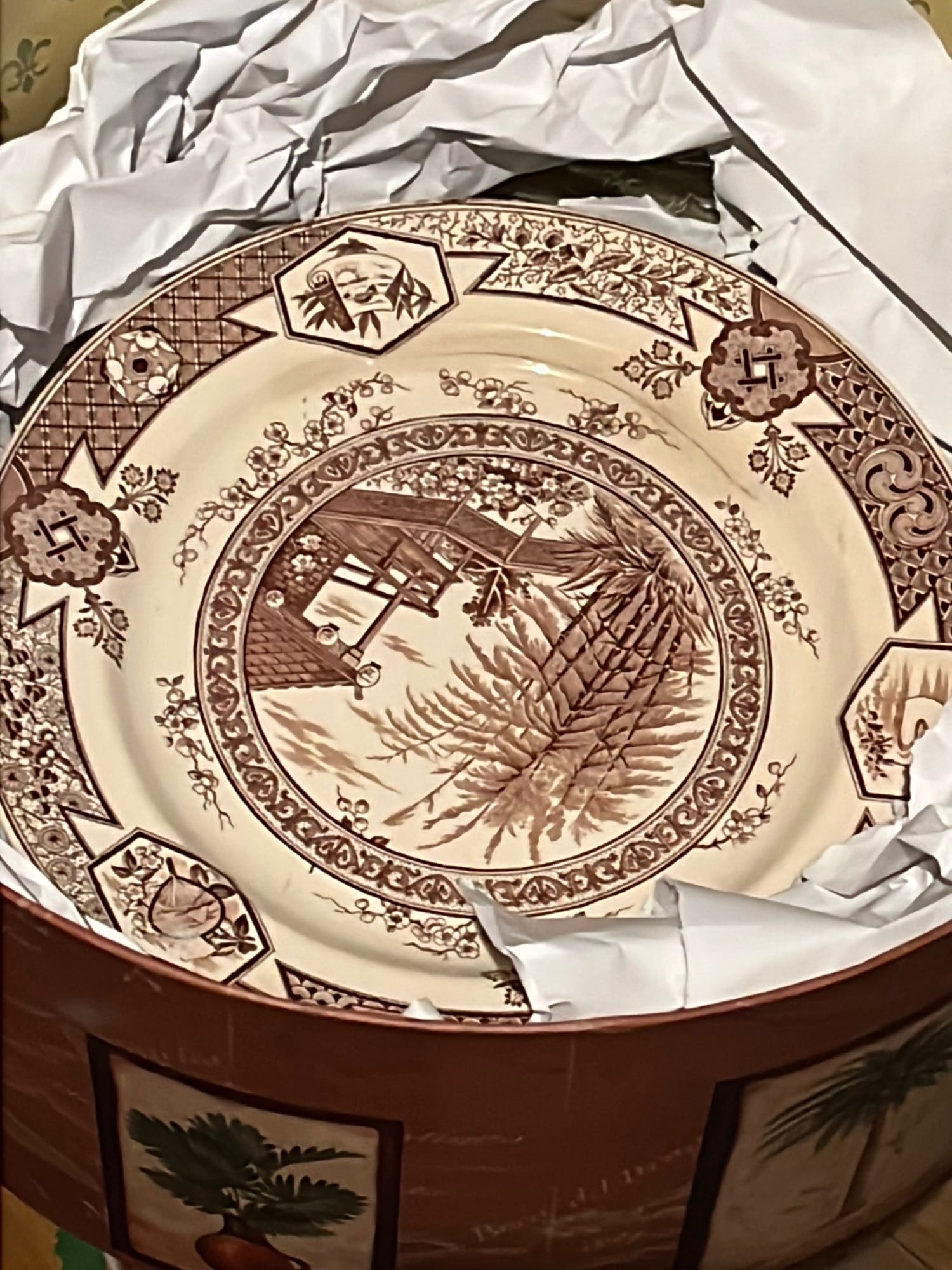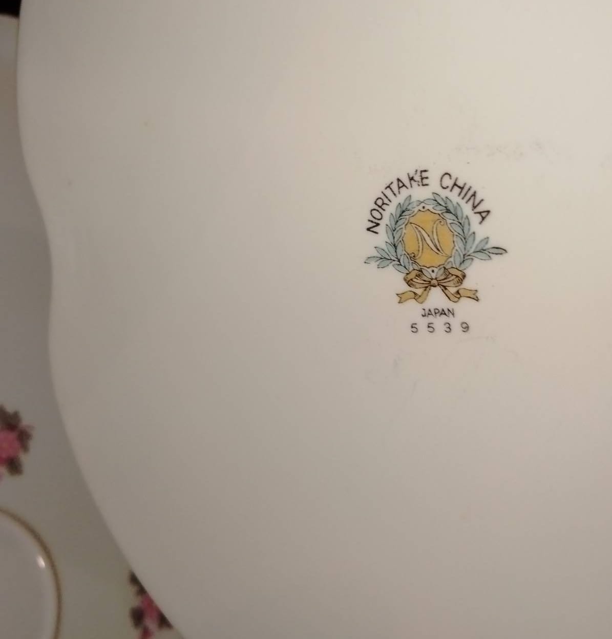 433 Shenango plates 5, Nippon server, roasting pan, pottery covered dish, strainer, enamel pot