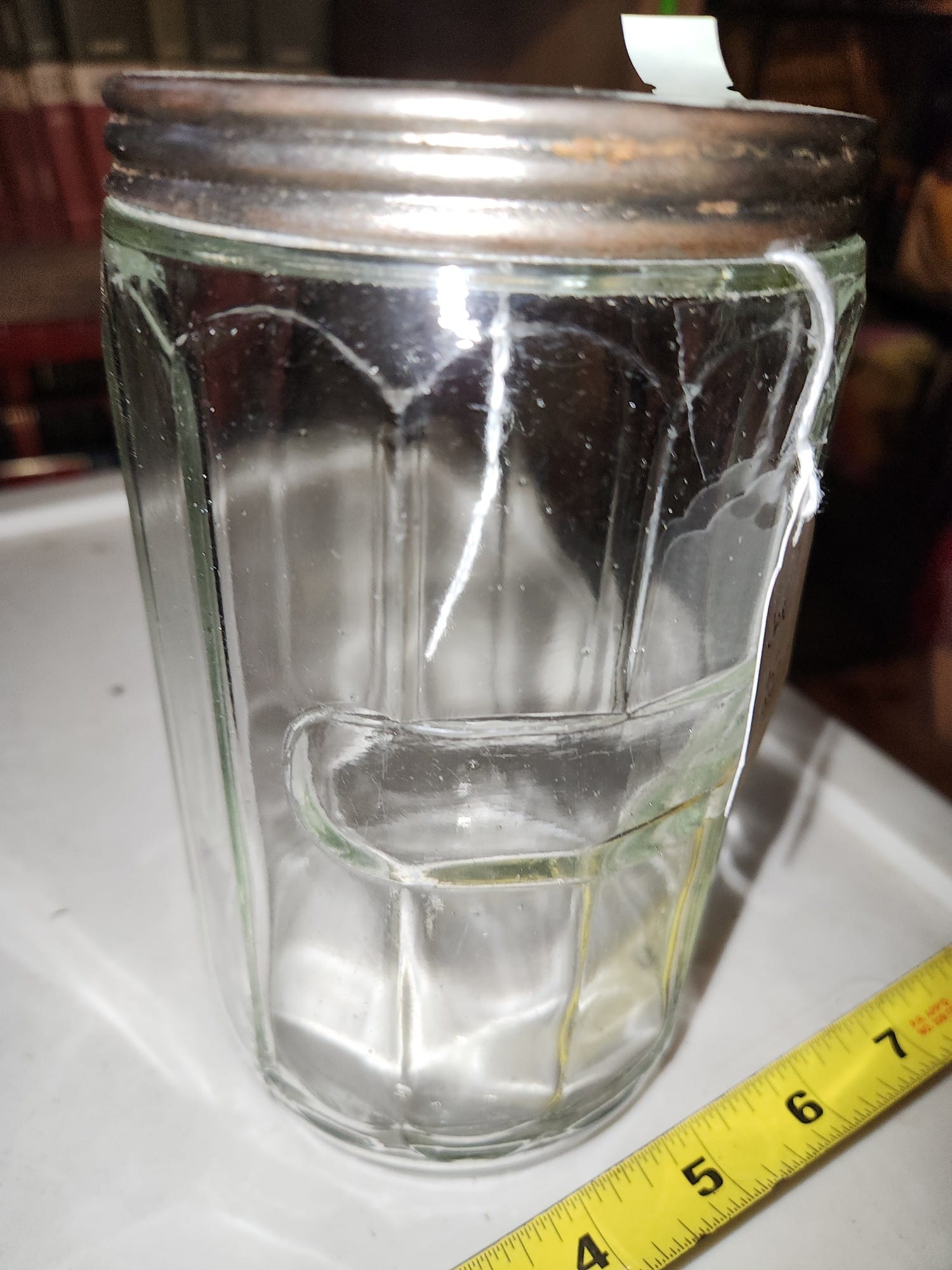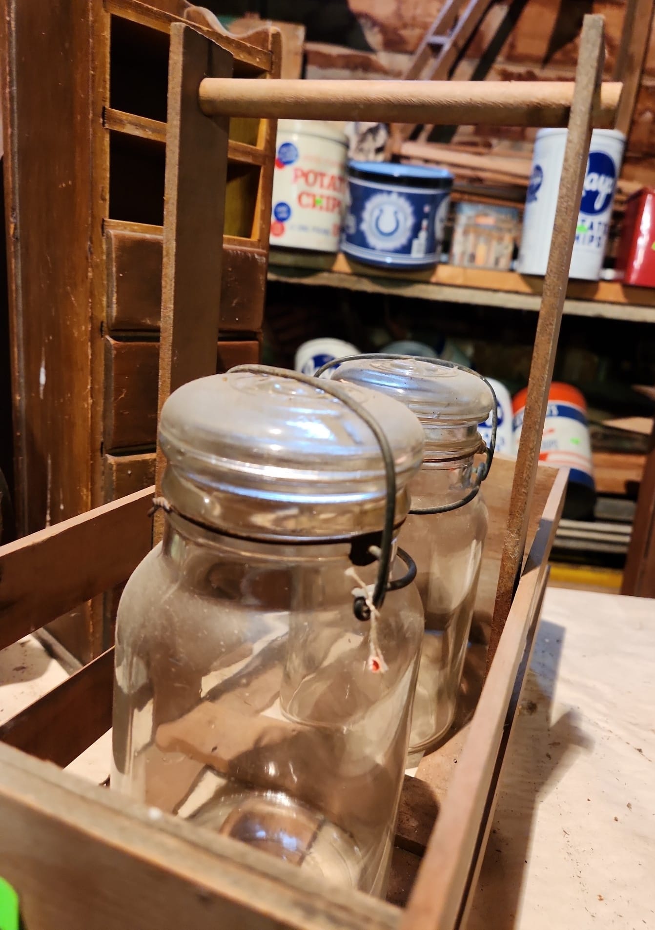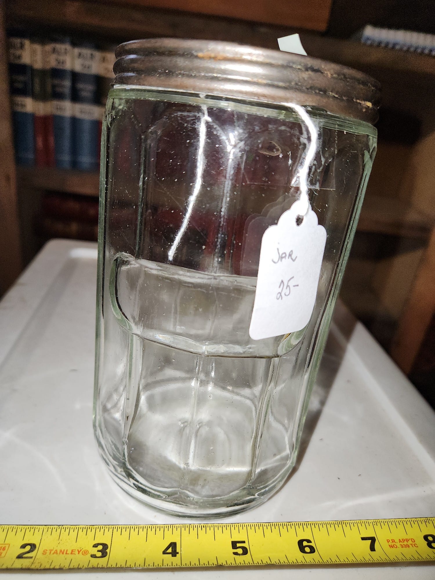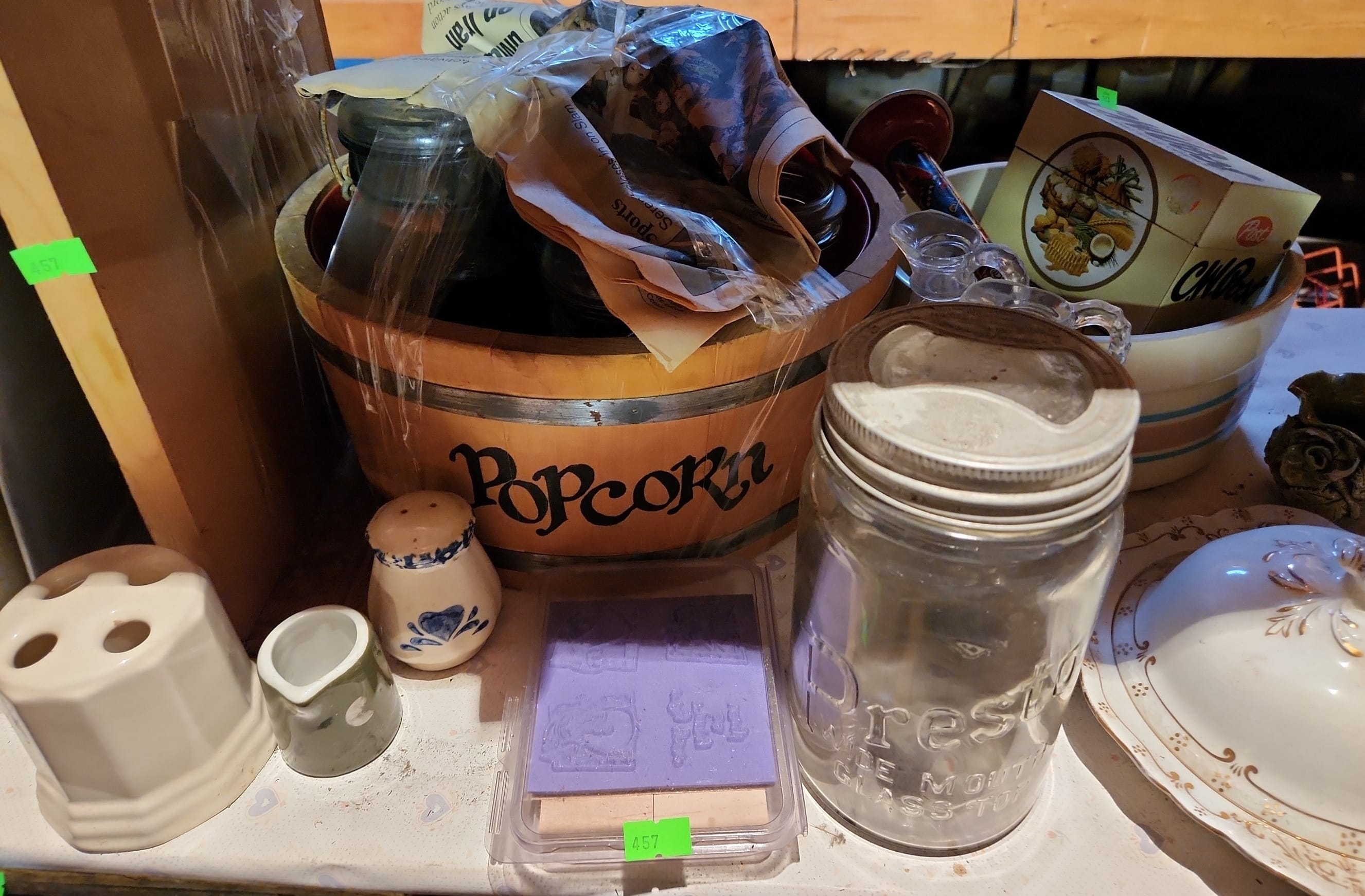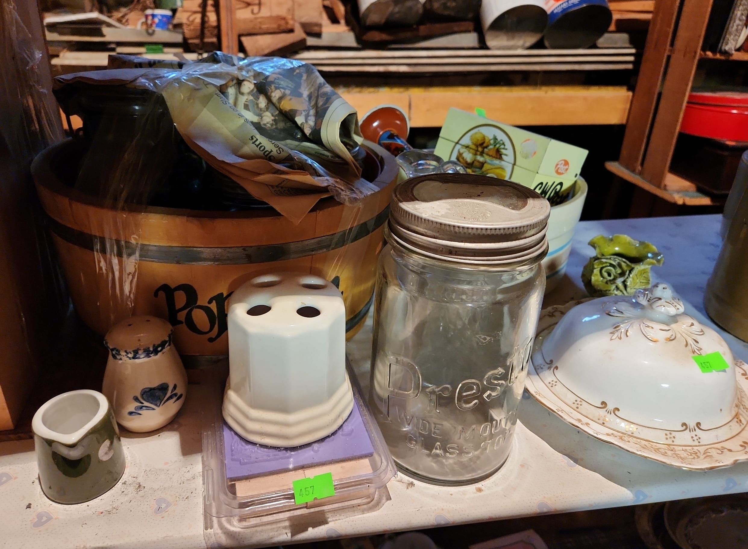457 Roseville crock, canning jars, butter dish, toothpick holder, miscellaneous