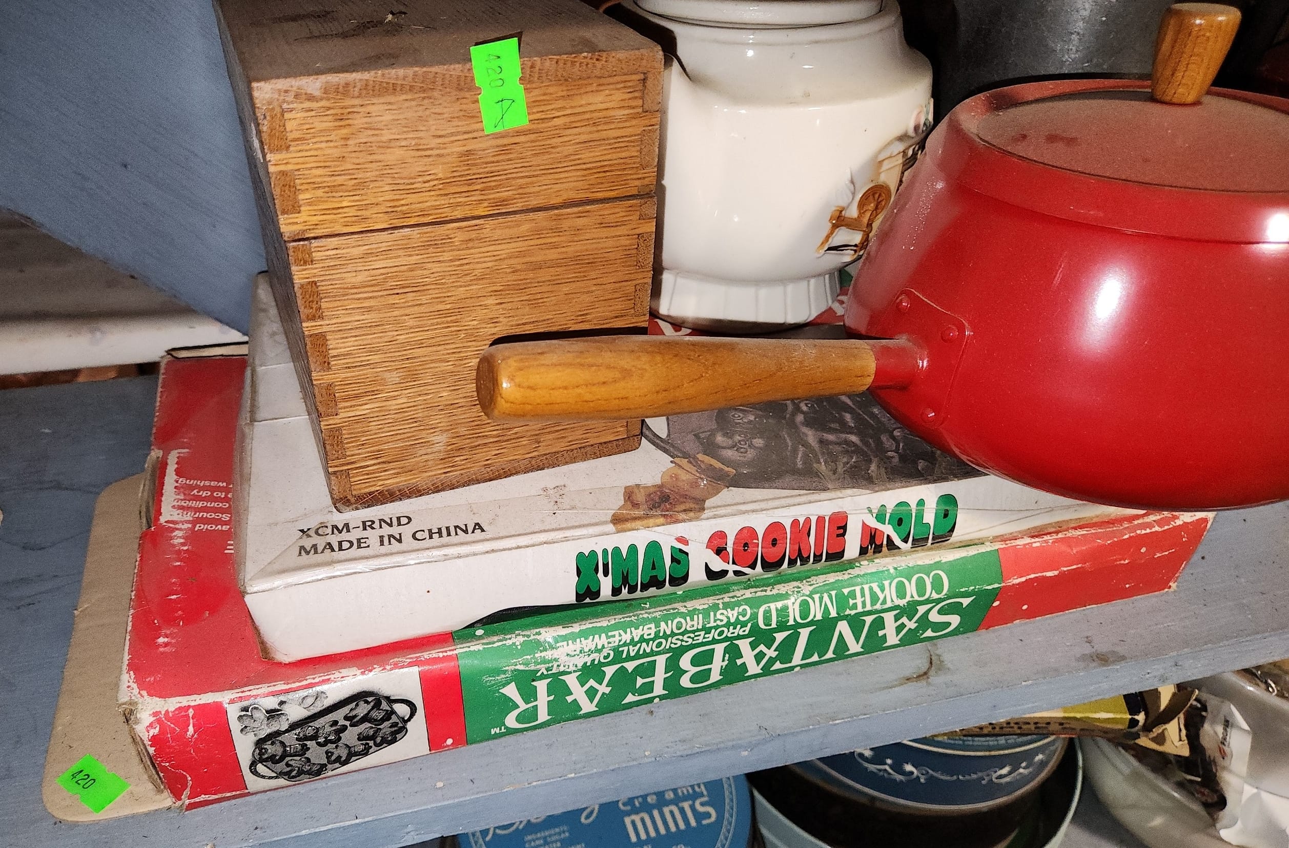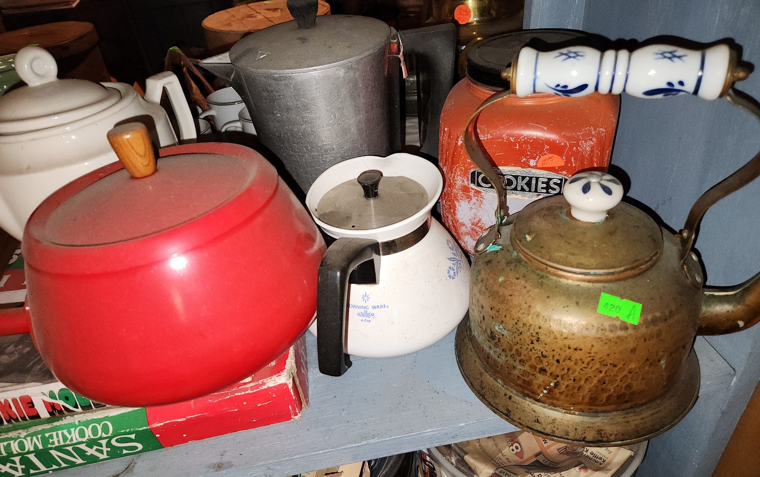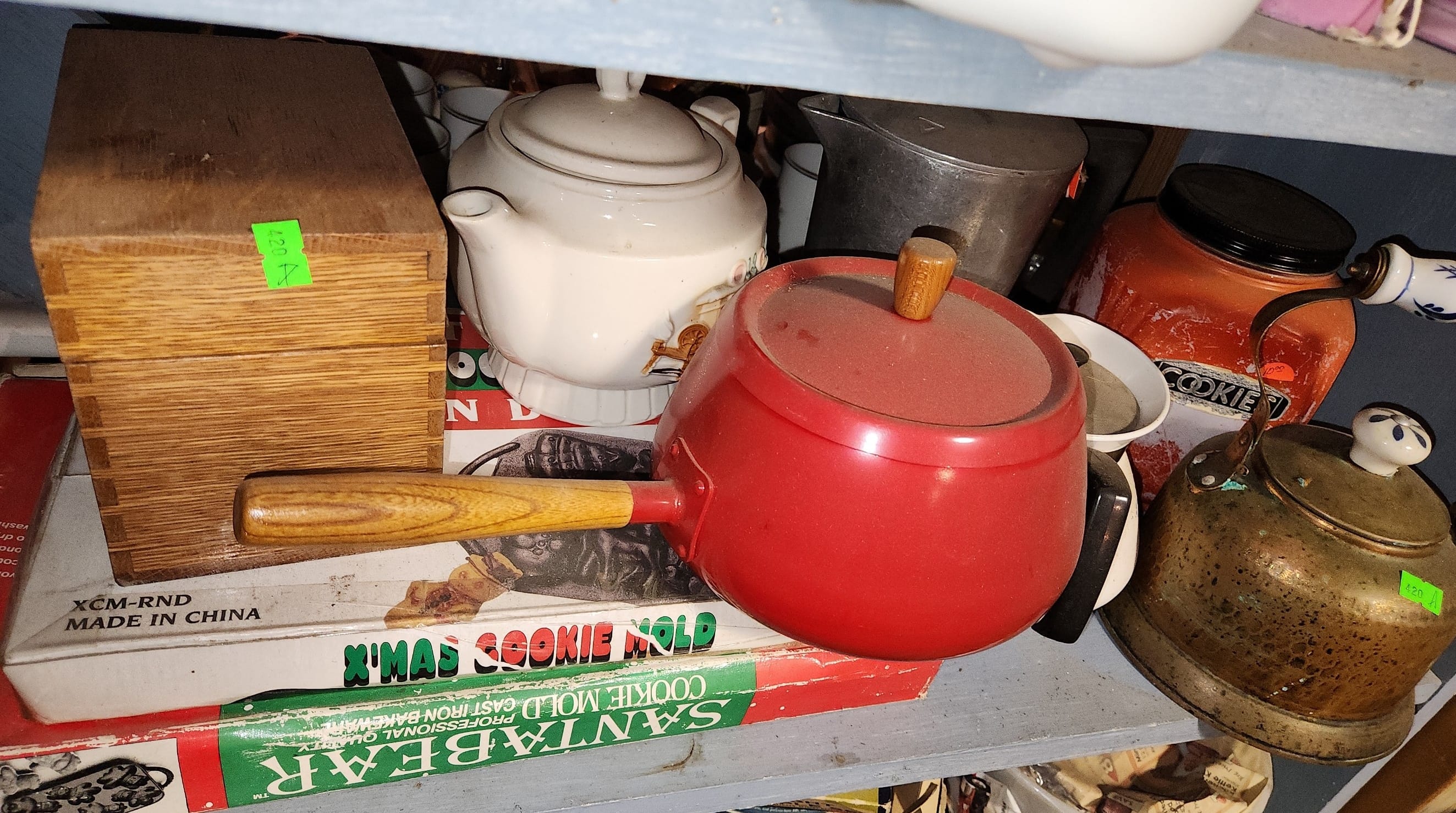 420a Corning ware 6-cup teapot, cookie jar, copper teapot, cookie molds, recipe box, porcelain teapot, fondue pot, aluminum coffee pot