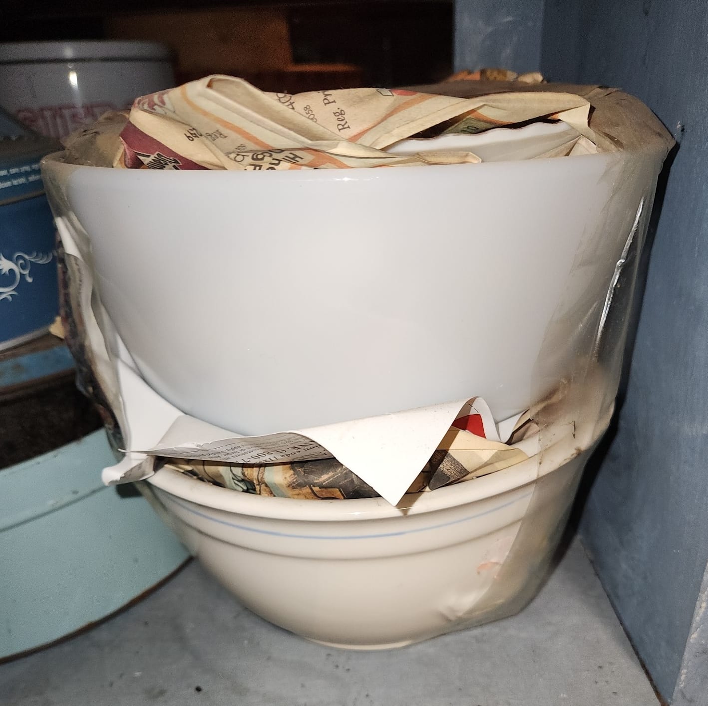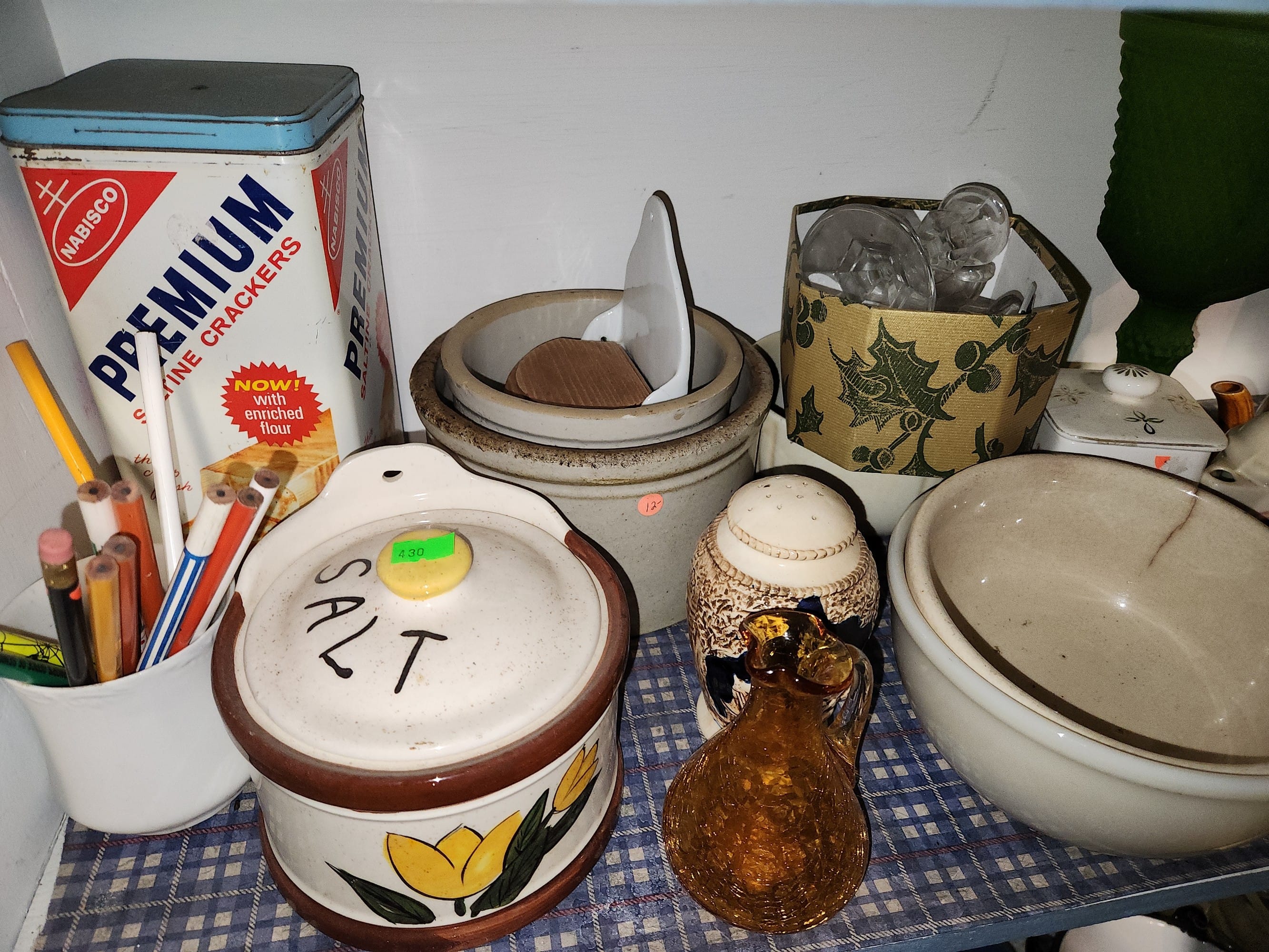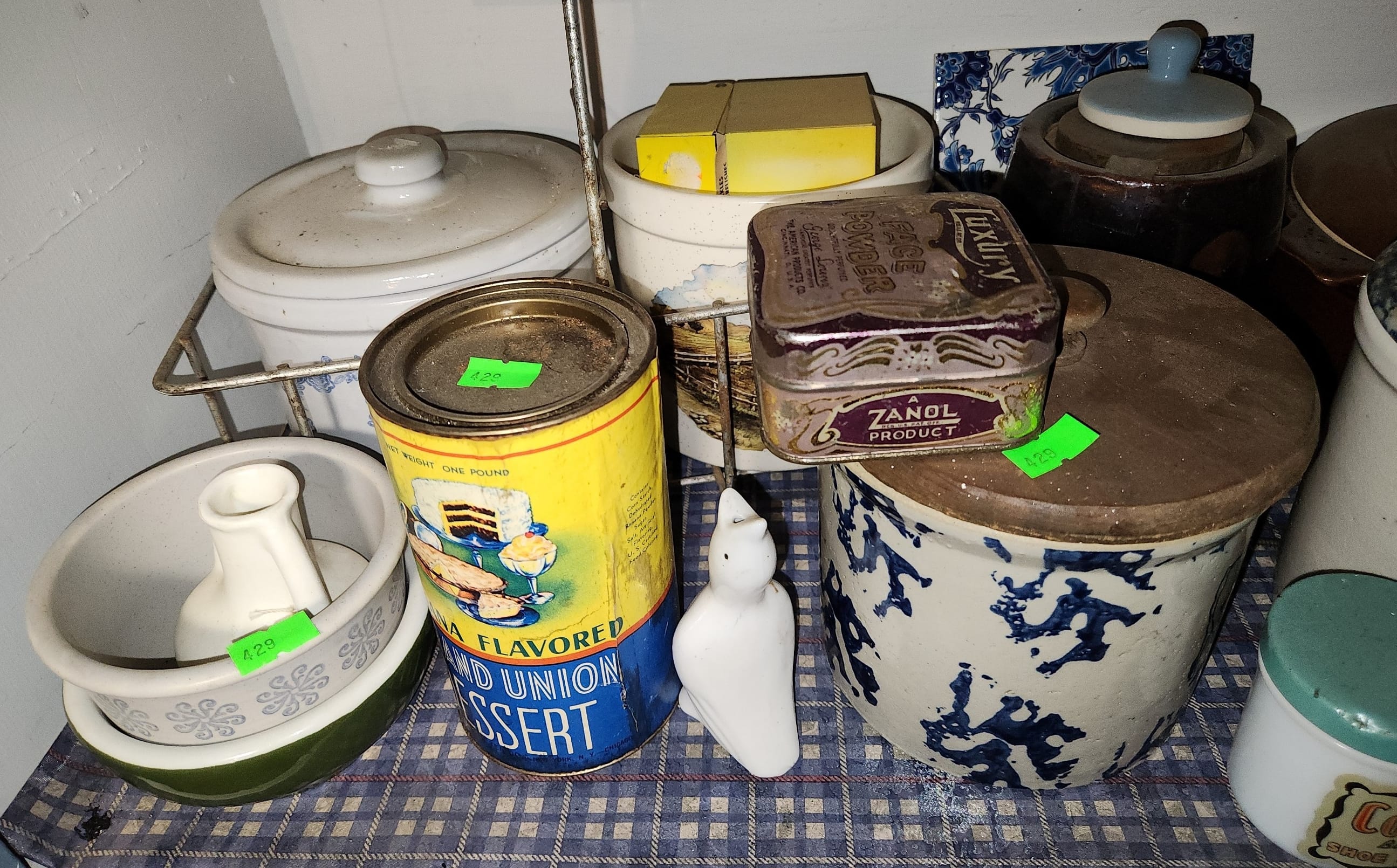 430 Salt jars, crocks, mixing bowls - 1 with crack, Premium cracker tin, pepper jar, creamers, miscellaneous