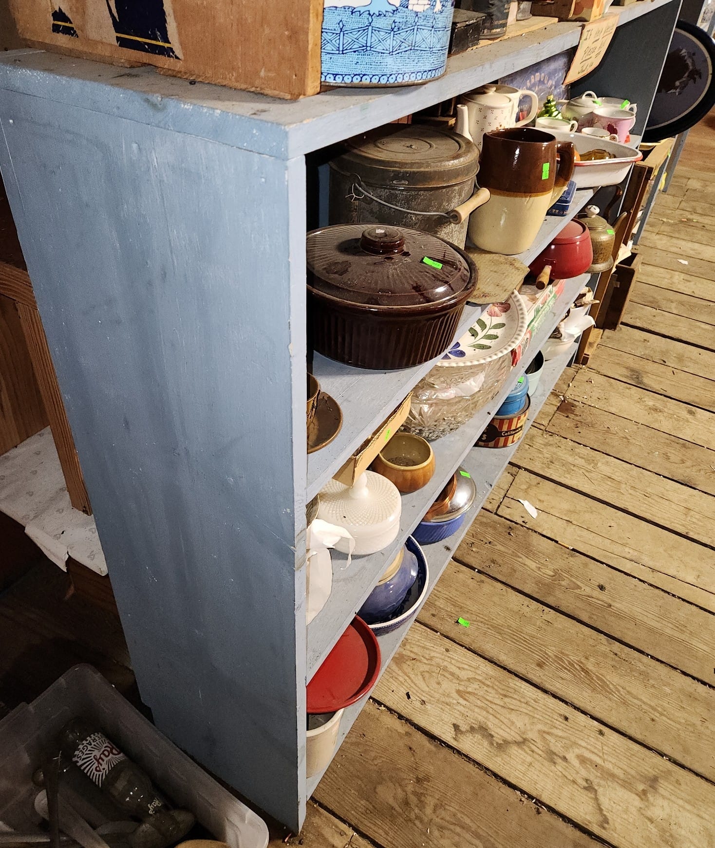 451 Pfaltzgraff mugs, Anchor Hocking baking dish, tins, serving platters, miscellaneous