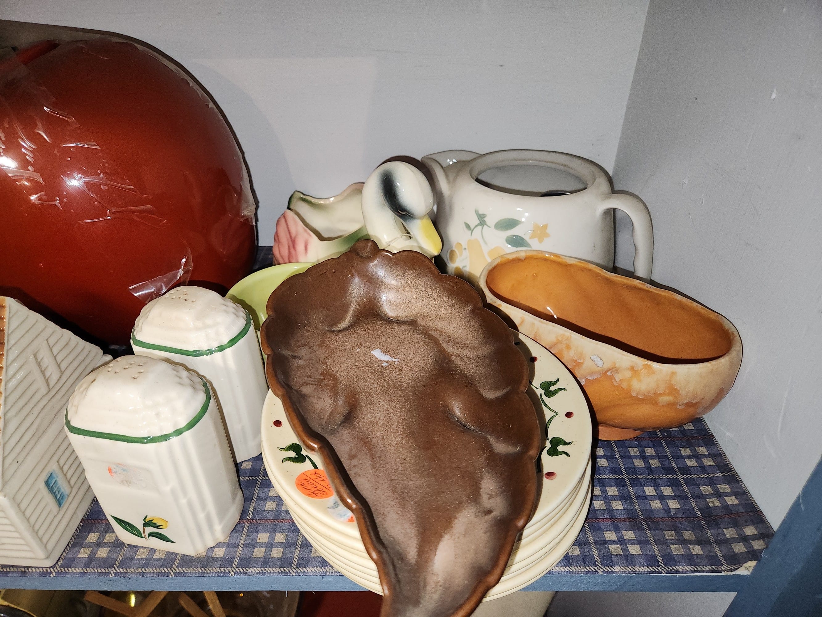 431 Frankoma leaf dish, apple cookie jar, planters, salt & pepper shakers, pie bird, dessert plates, miscellaneous