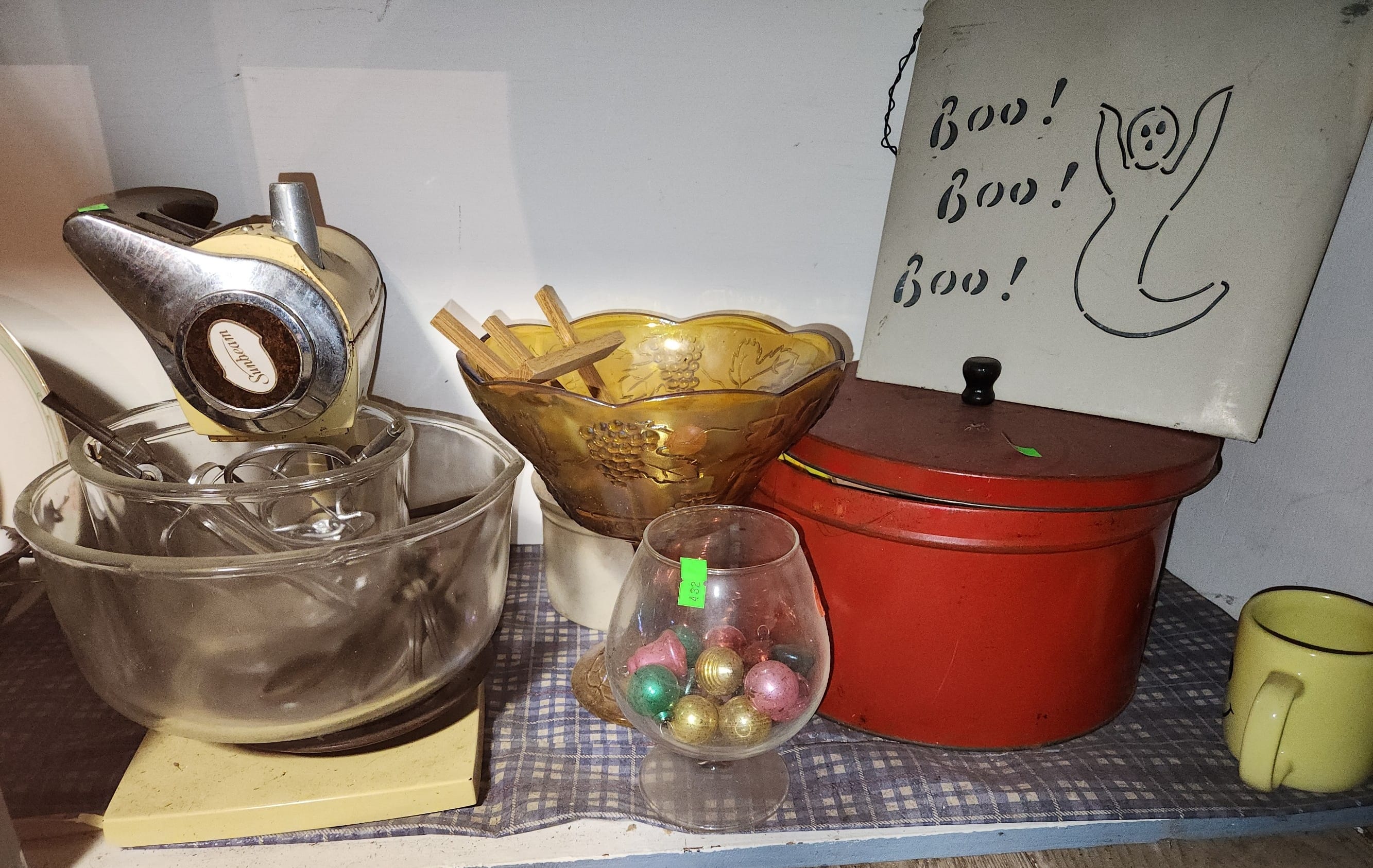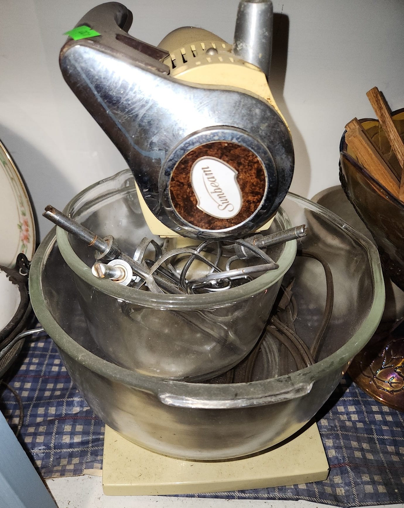 432 Sunbeam stand mixer - unknown condition, tin with cookie cutters, amber pedestal bowl, brandy snifter with small ornaments, mug