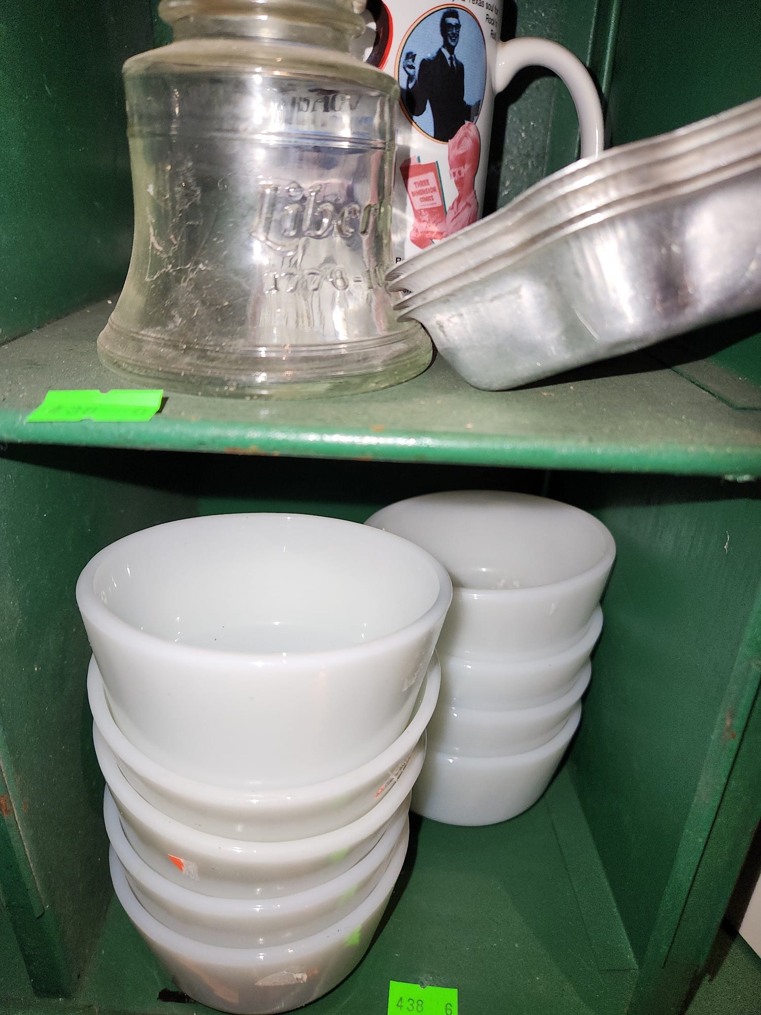 438 Fire King Bowls, Burton & Burton pitcher, Anchor Hocking ramekins, mugs, toothpick holders, miscellaneous