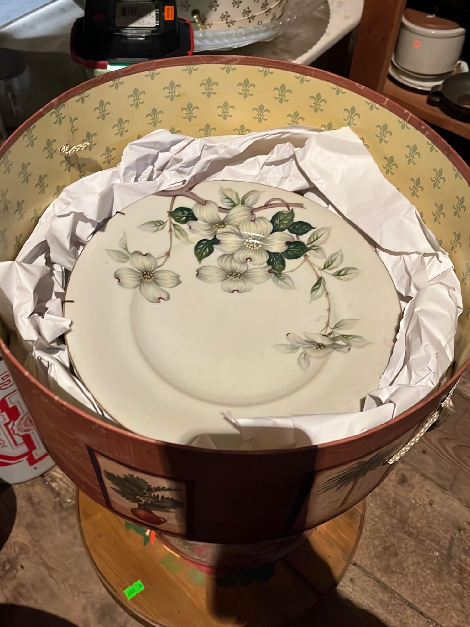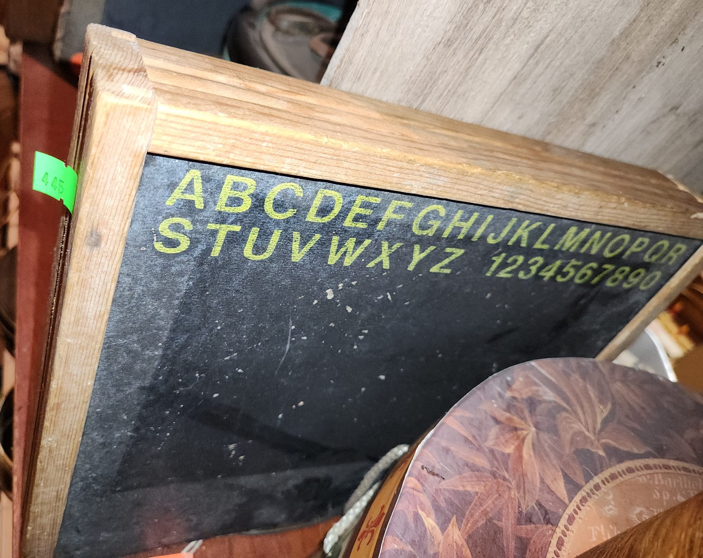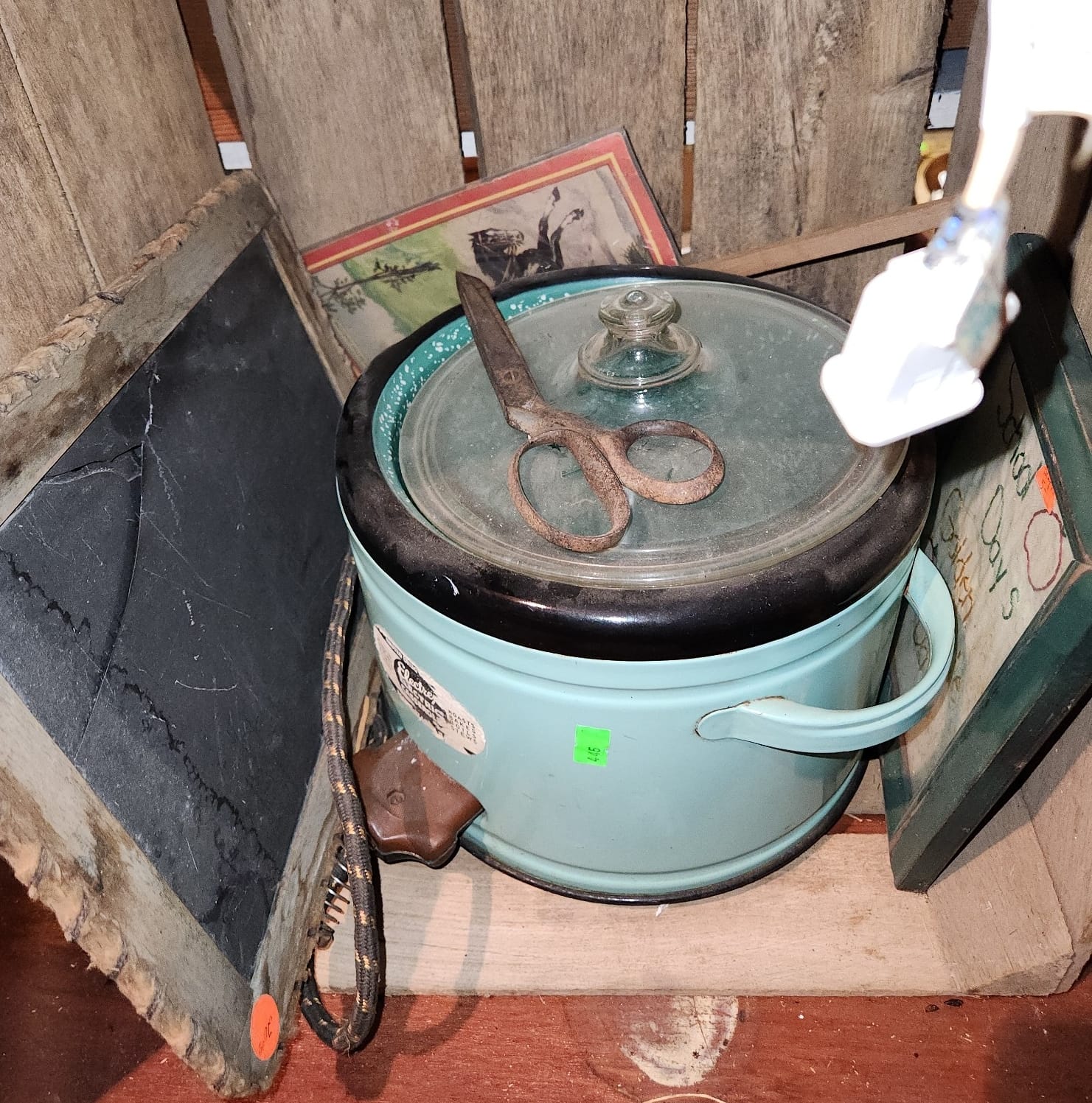 445 Electrc casserole, chalkboards 13x9, hat box with plates