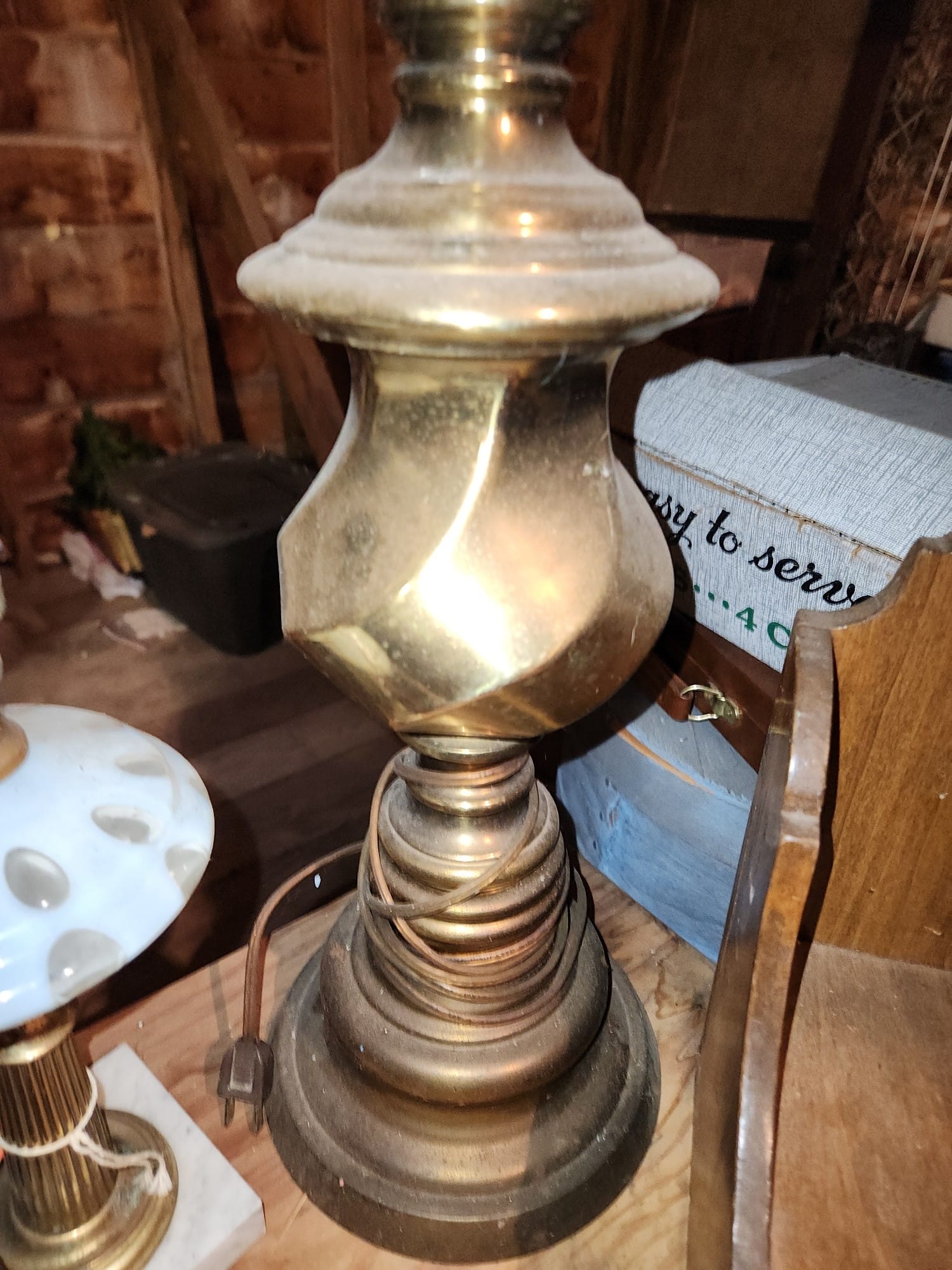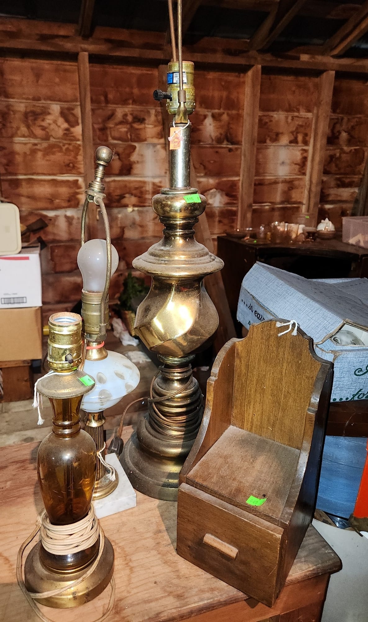 449 Brass Lamp 30”, lamps 12” & 19” - no shades, wood shelf with drawer