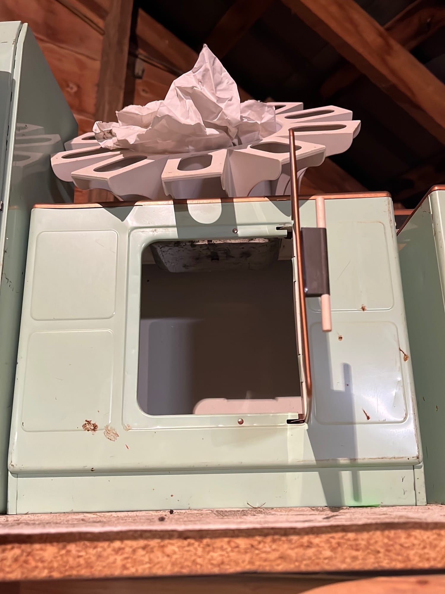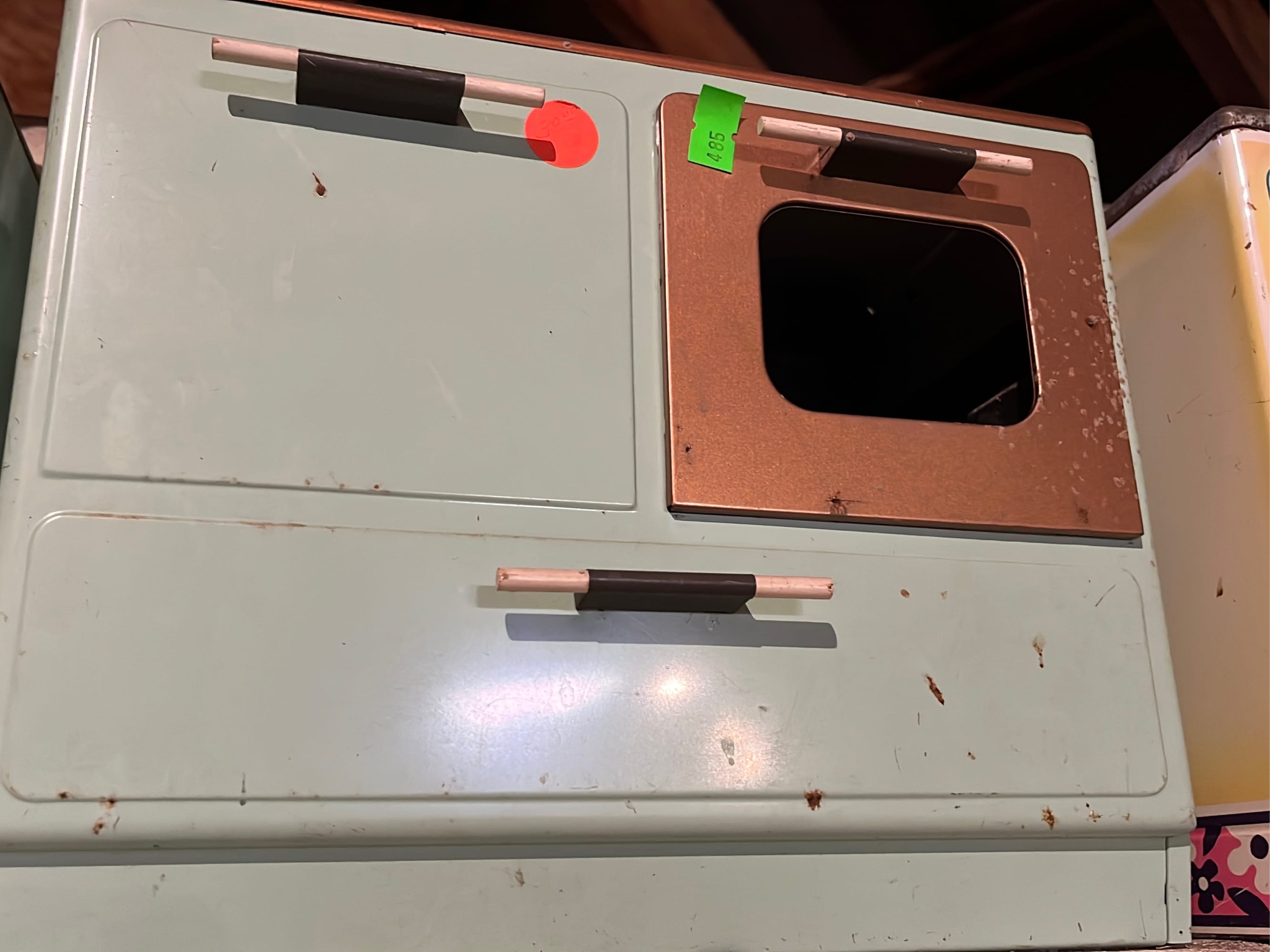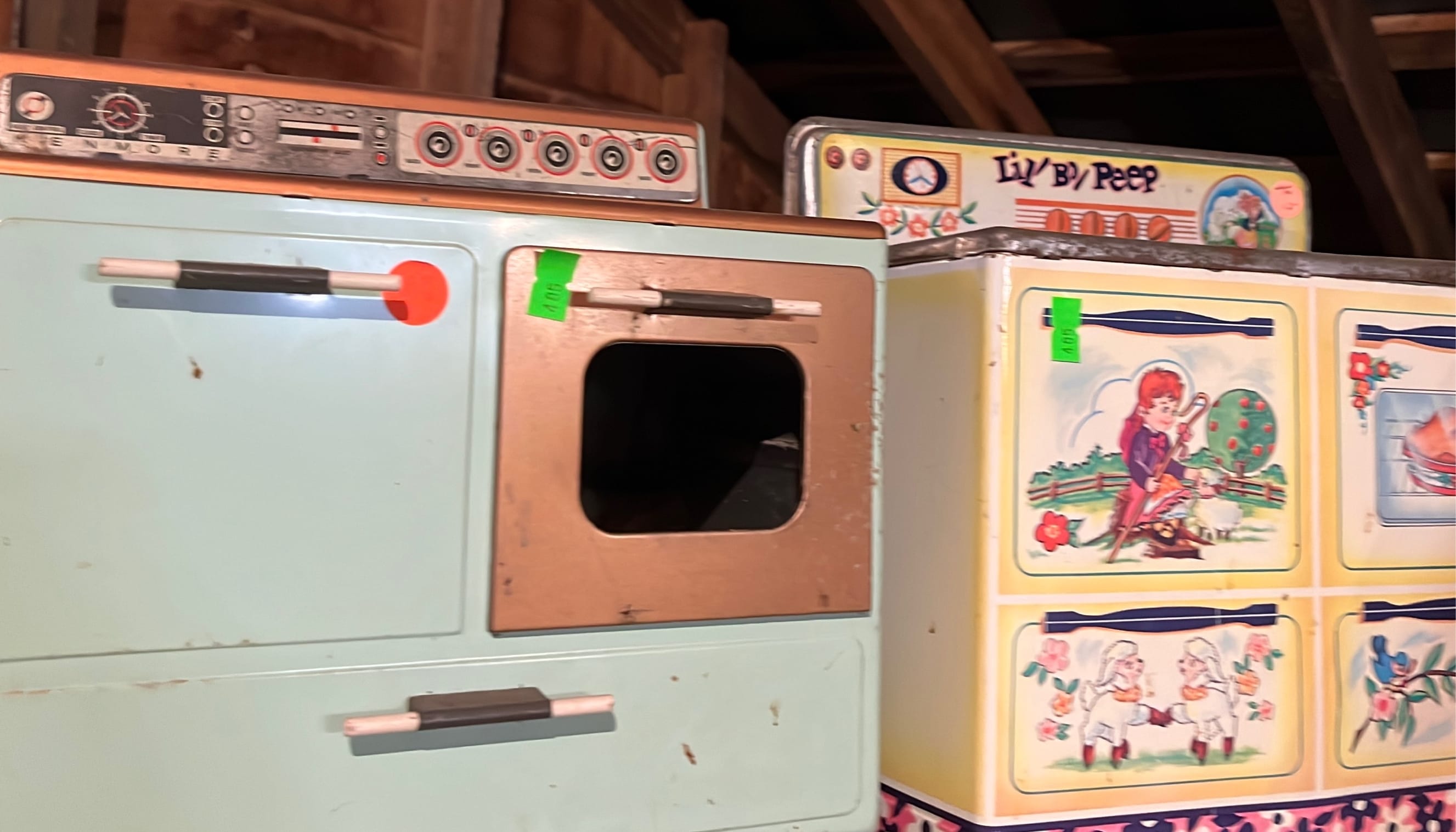 485 Child’s metal kitchen set refrigerator 8x7x15, sink 11x10x7, Kenmore stove 7x11x10, Little Bo Beep 7x11x10