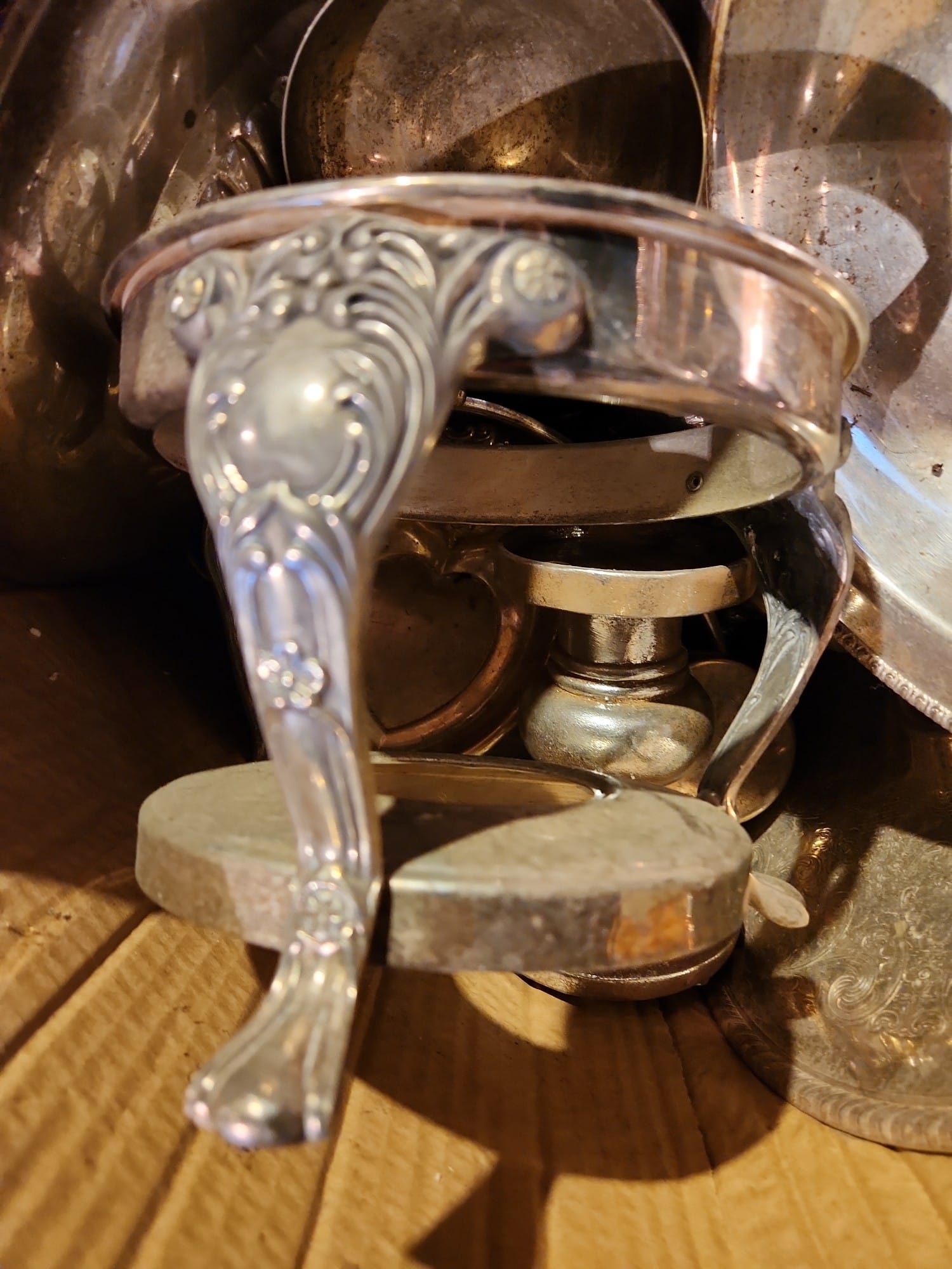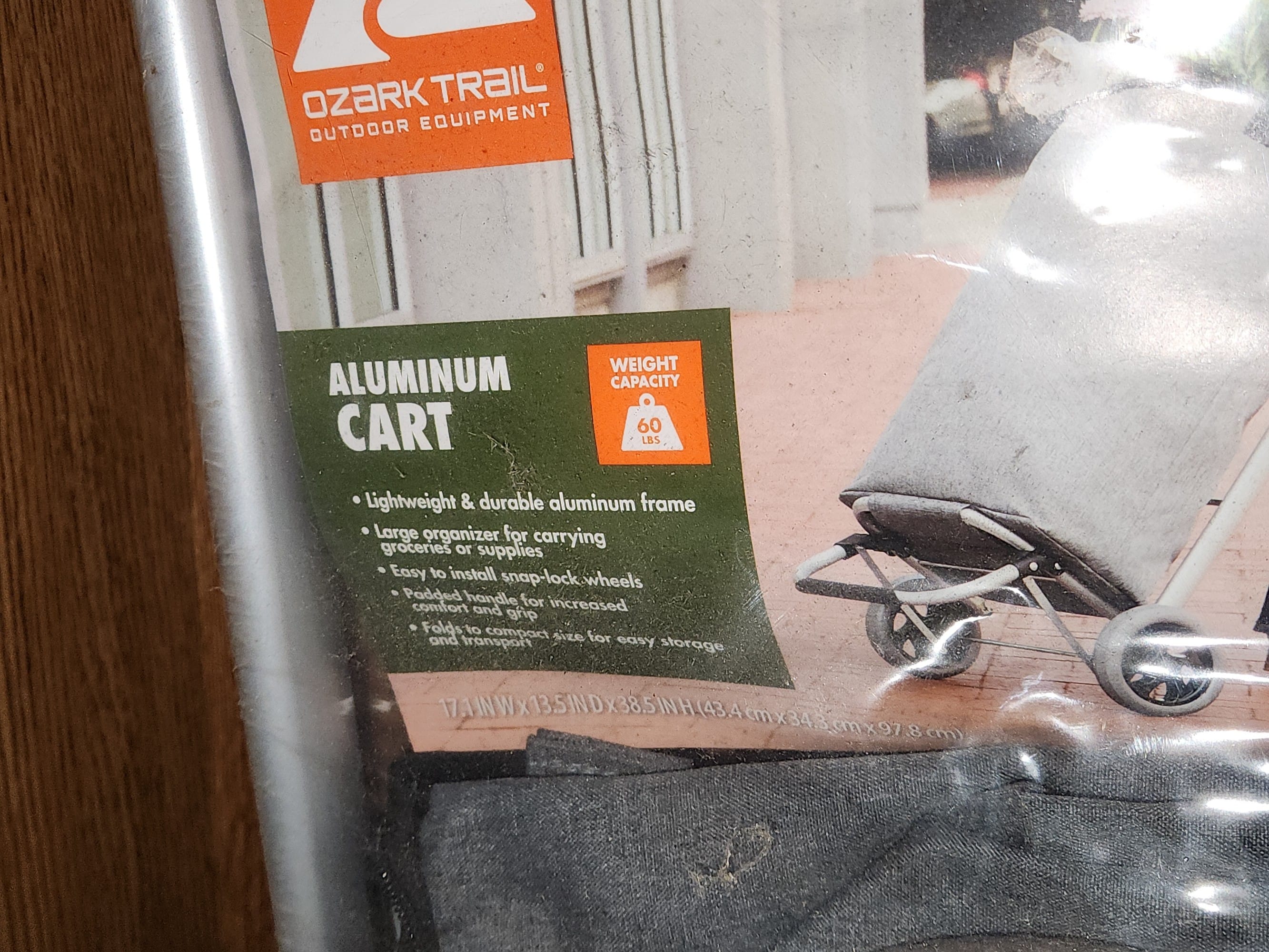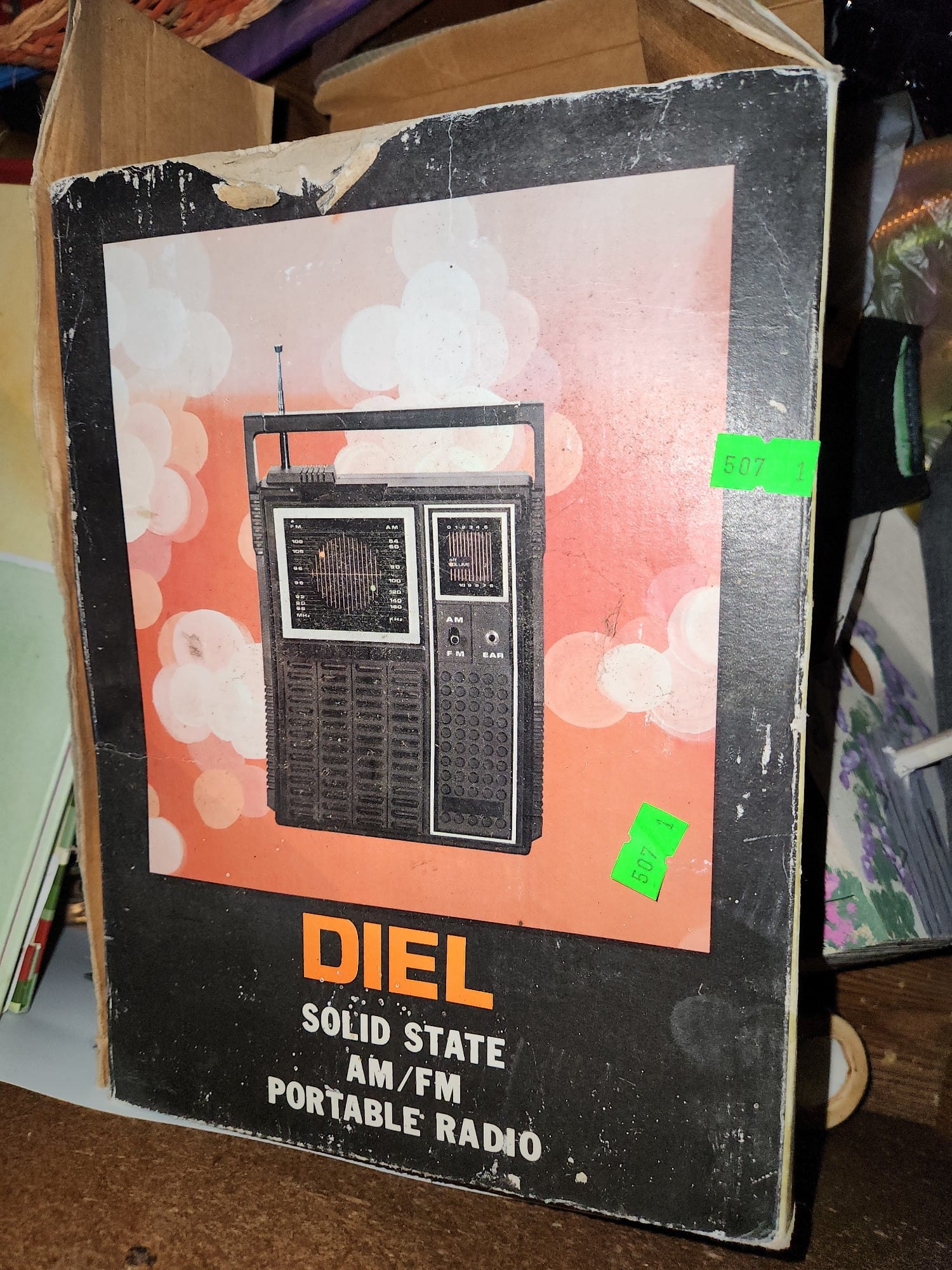 507 Portable radio, brass candlestick holders, aluminum cart, assortment