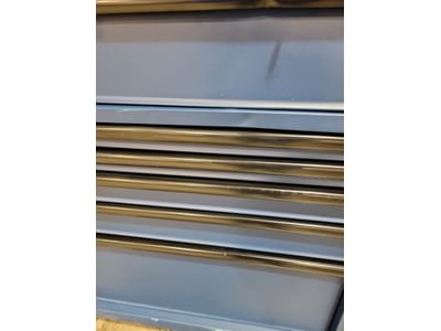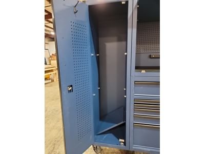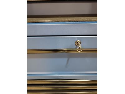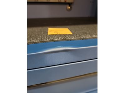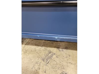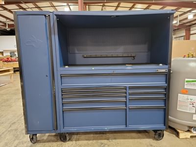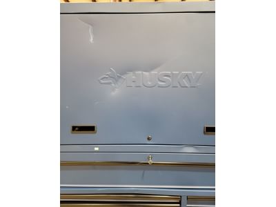 10039 "Husky 72 in. W x 24 in. D Heavy Duty 18-Drawer Mobile Workbench Cabinet with Adjustable-Height Hardwood Top in Matte Black Bottom and back is dented"